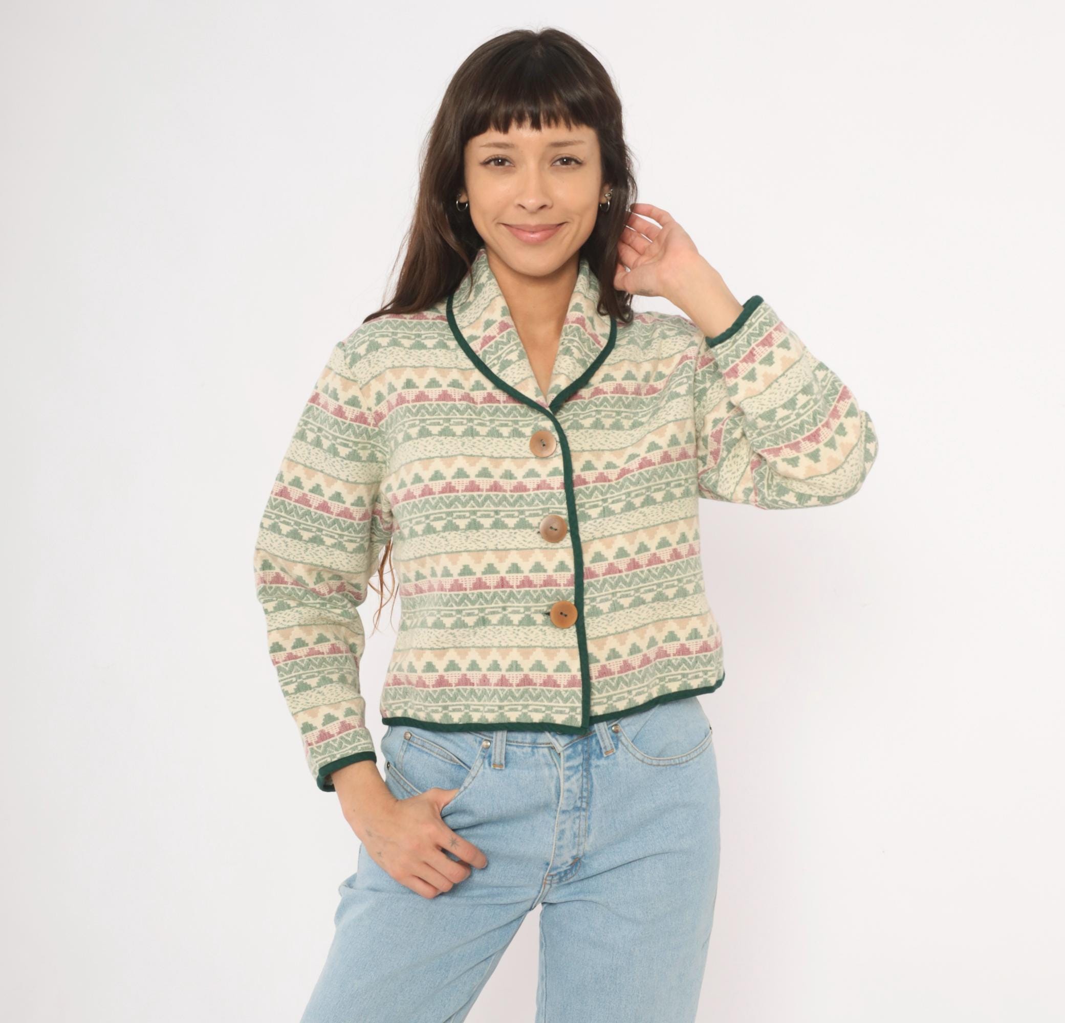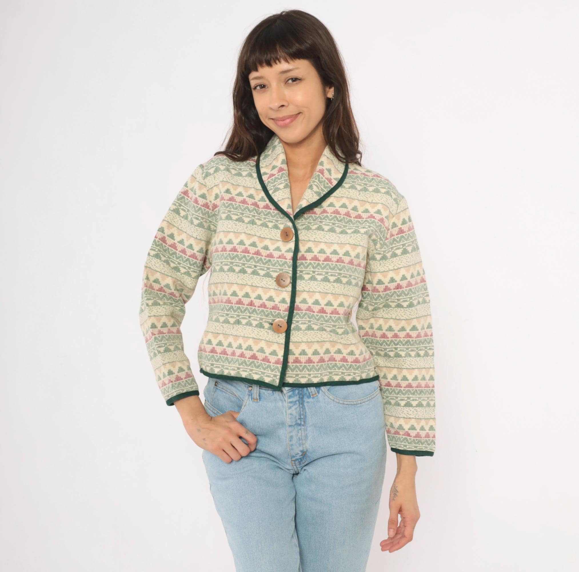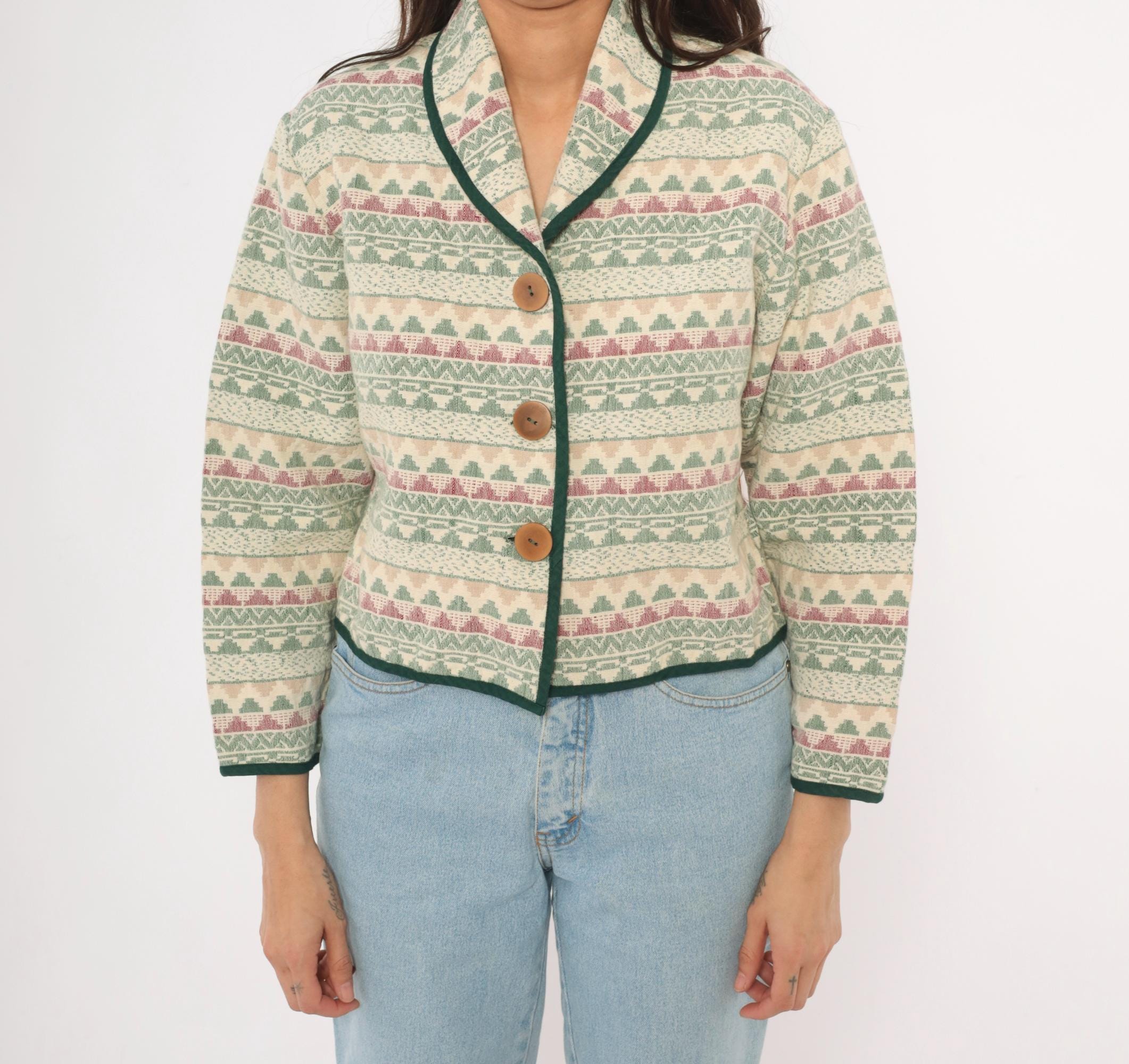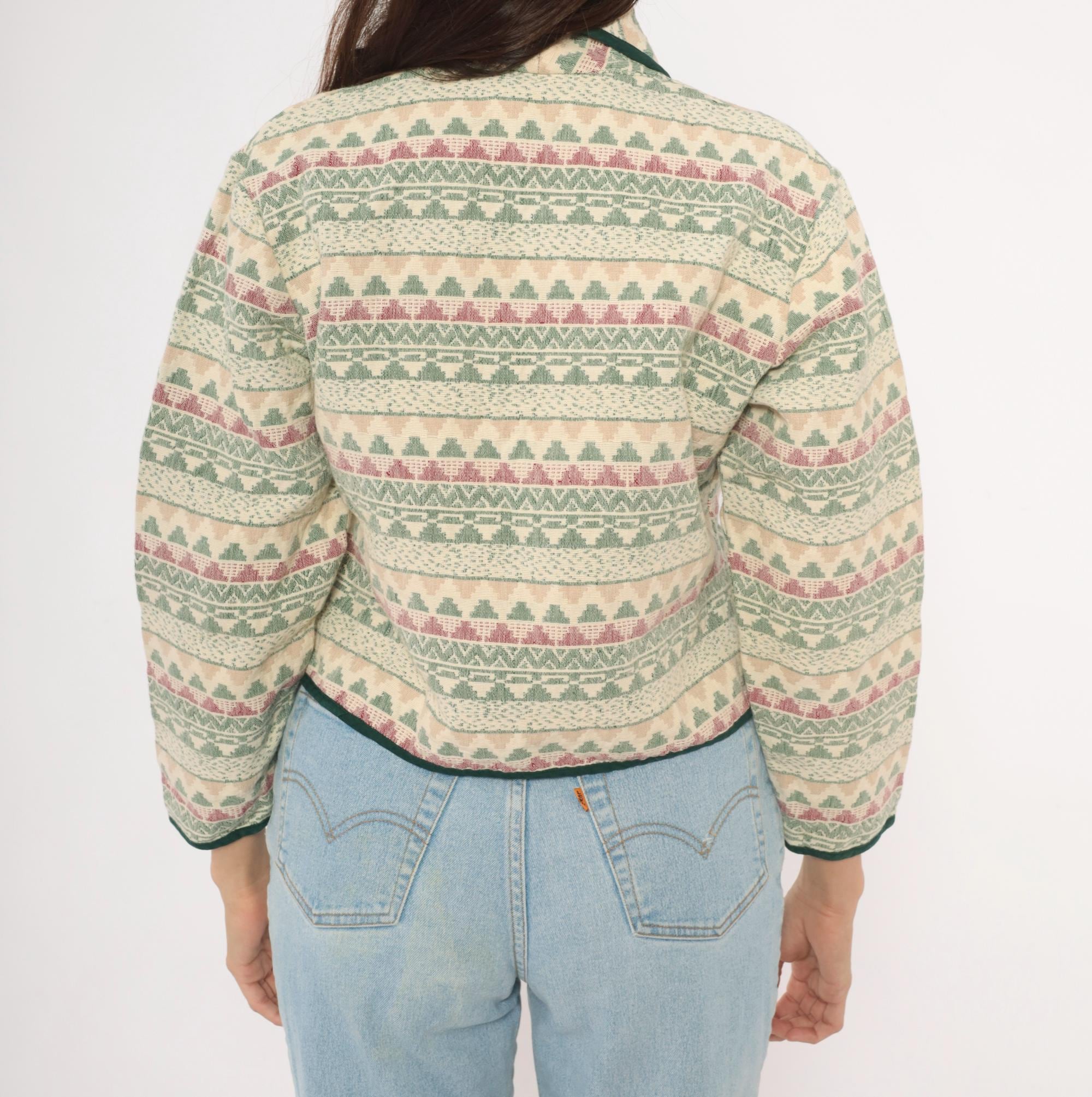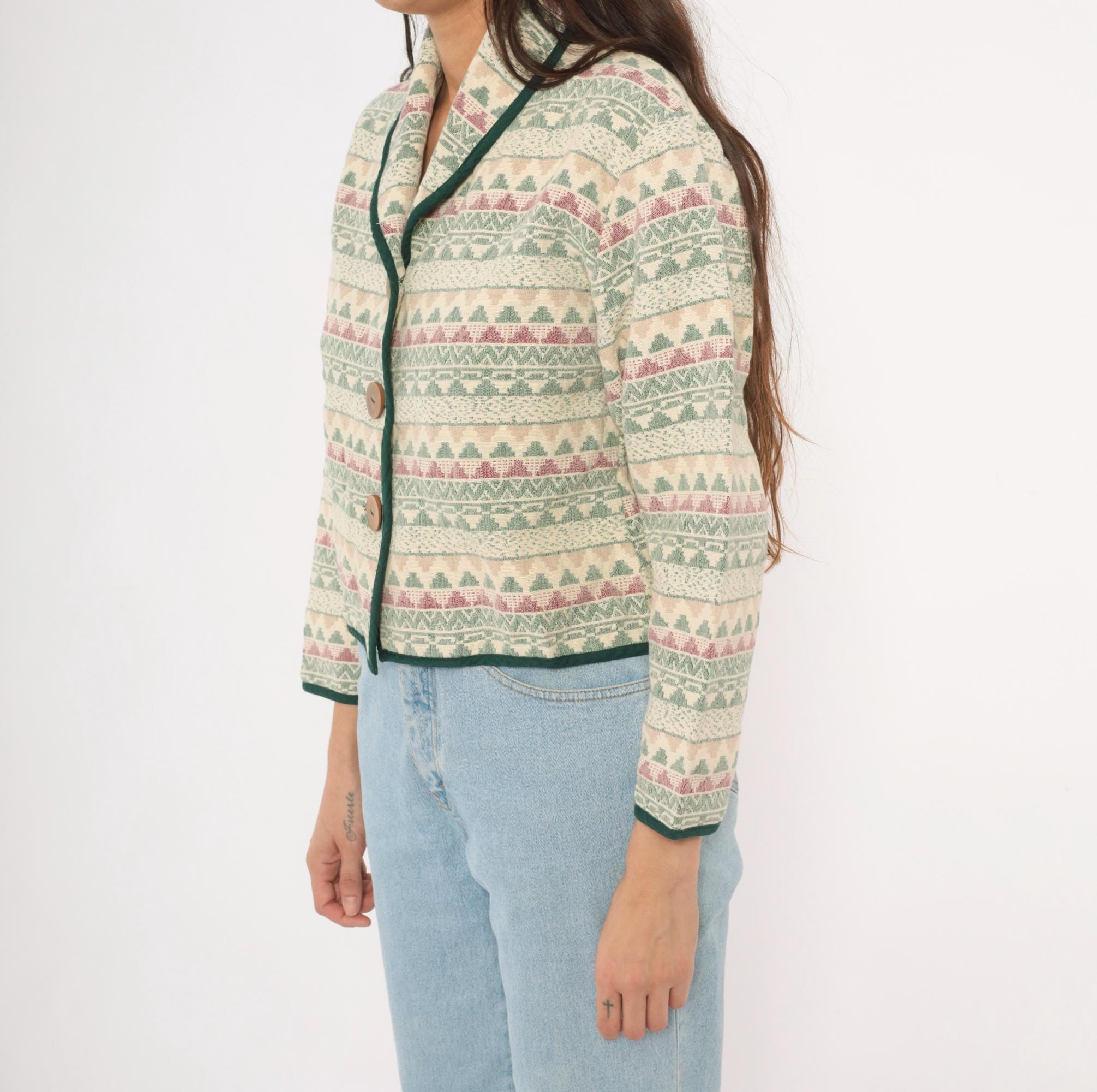 90s Southwestern-style jacket from Southwest Canyon with an allover tapestry weave in cream, sage green, and mauve geometric stripe pattern. Shawl collar with dark green contrast piping along the front placket, hem, and cuffs. Three large wooden button closures down the front, cropped hip length with long sleeves.