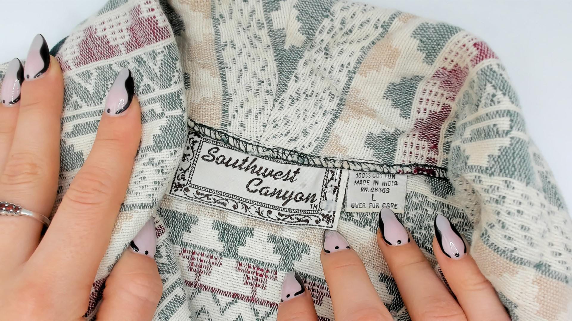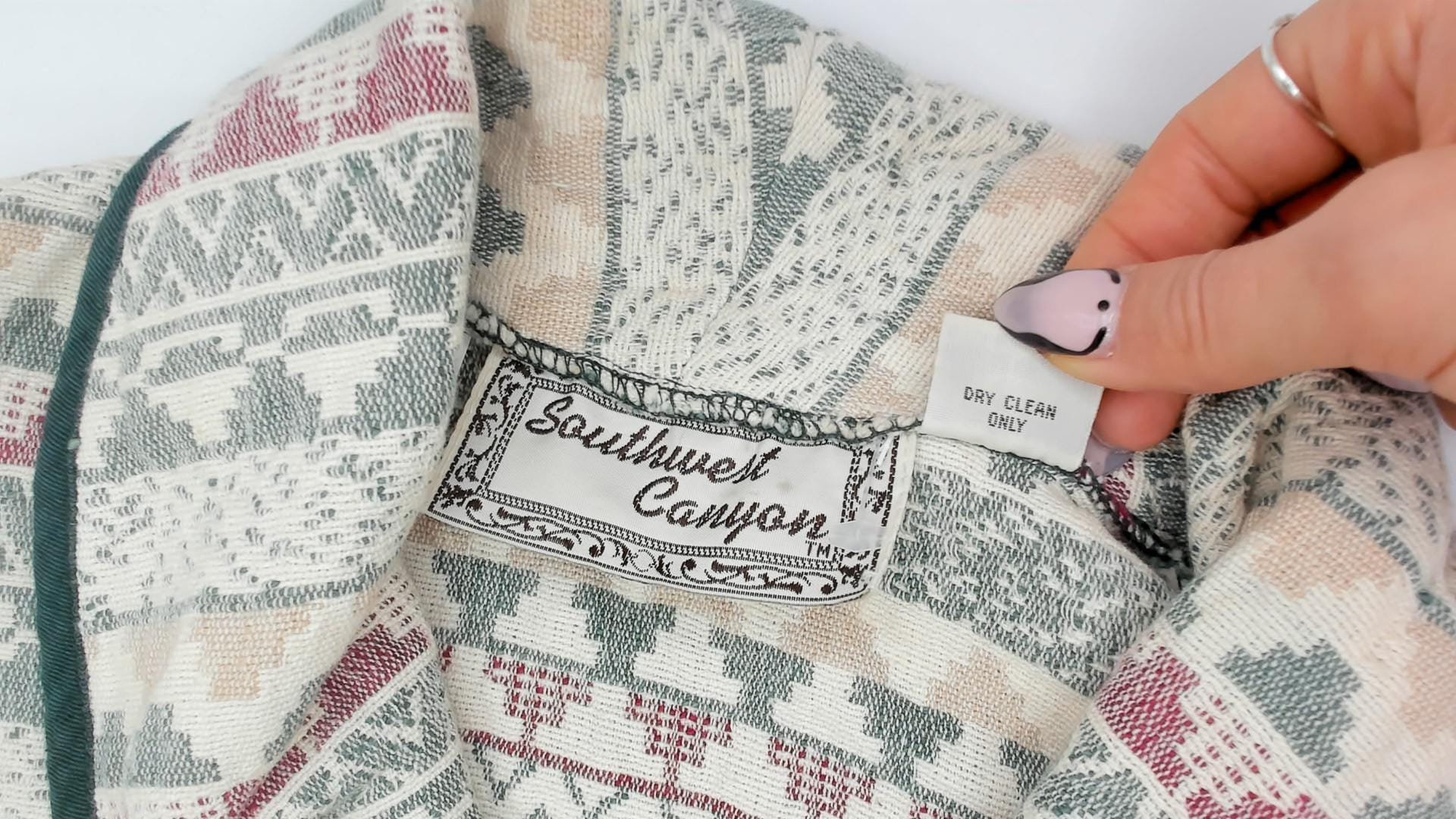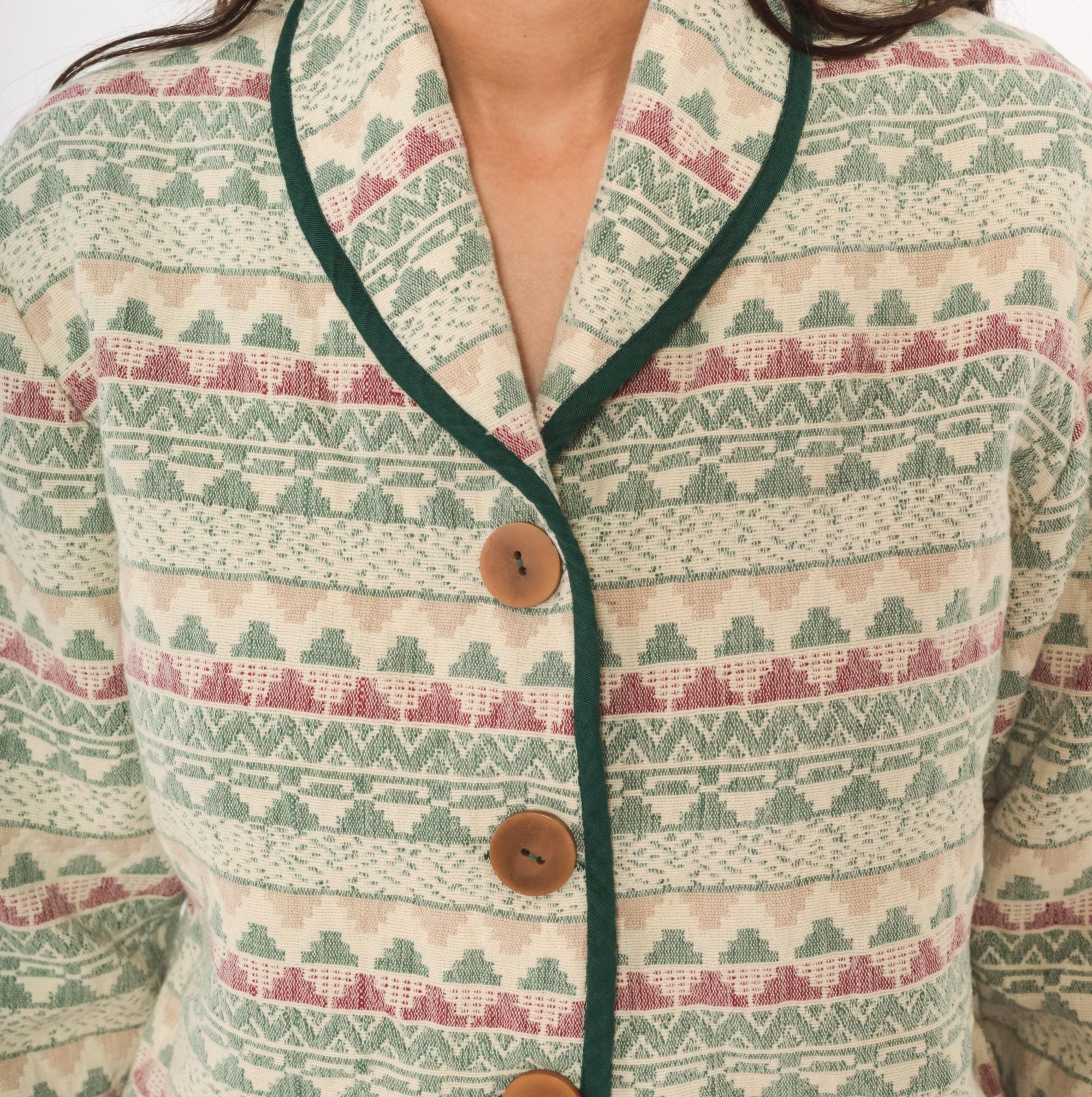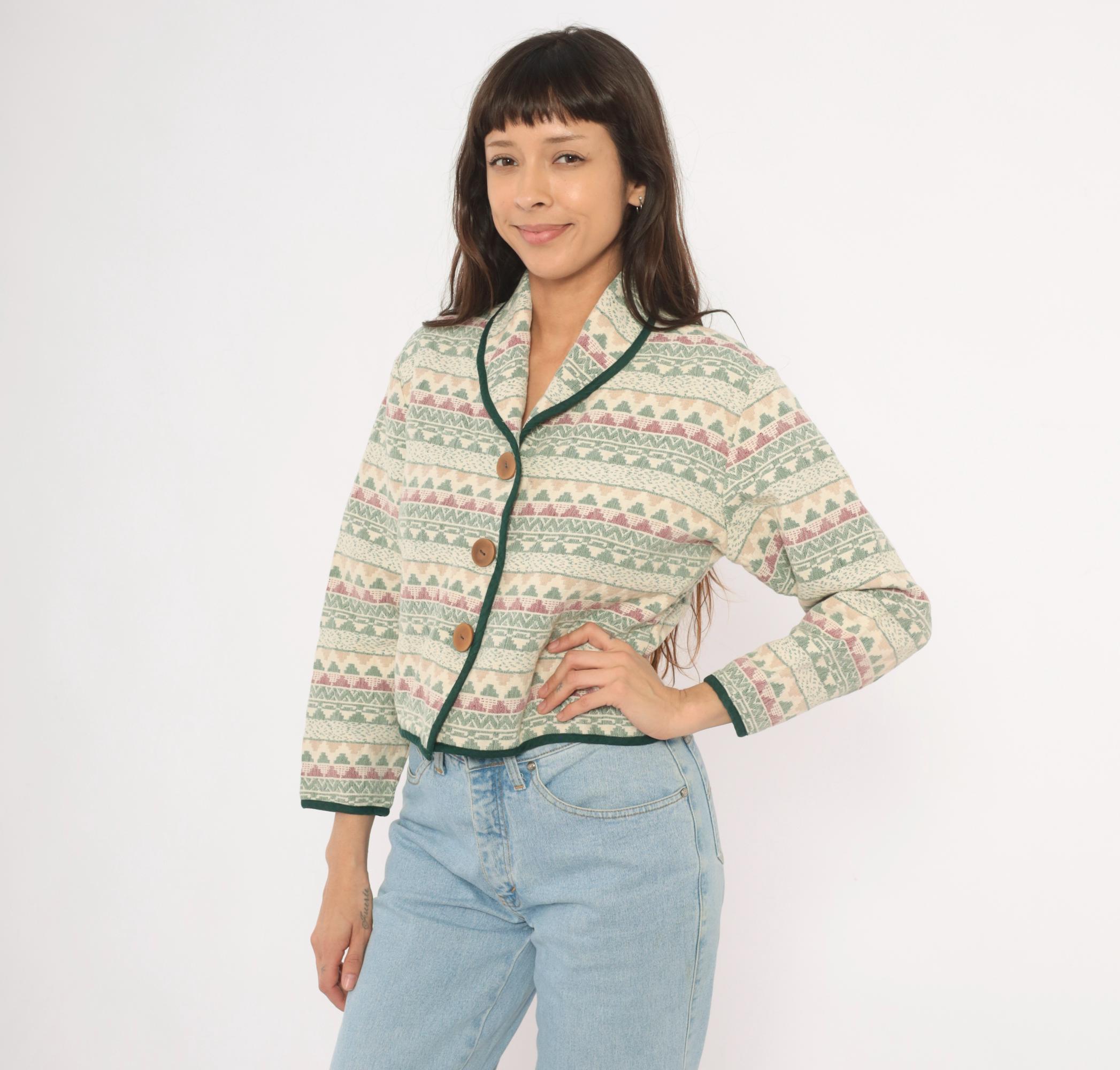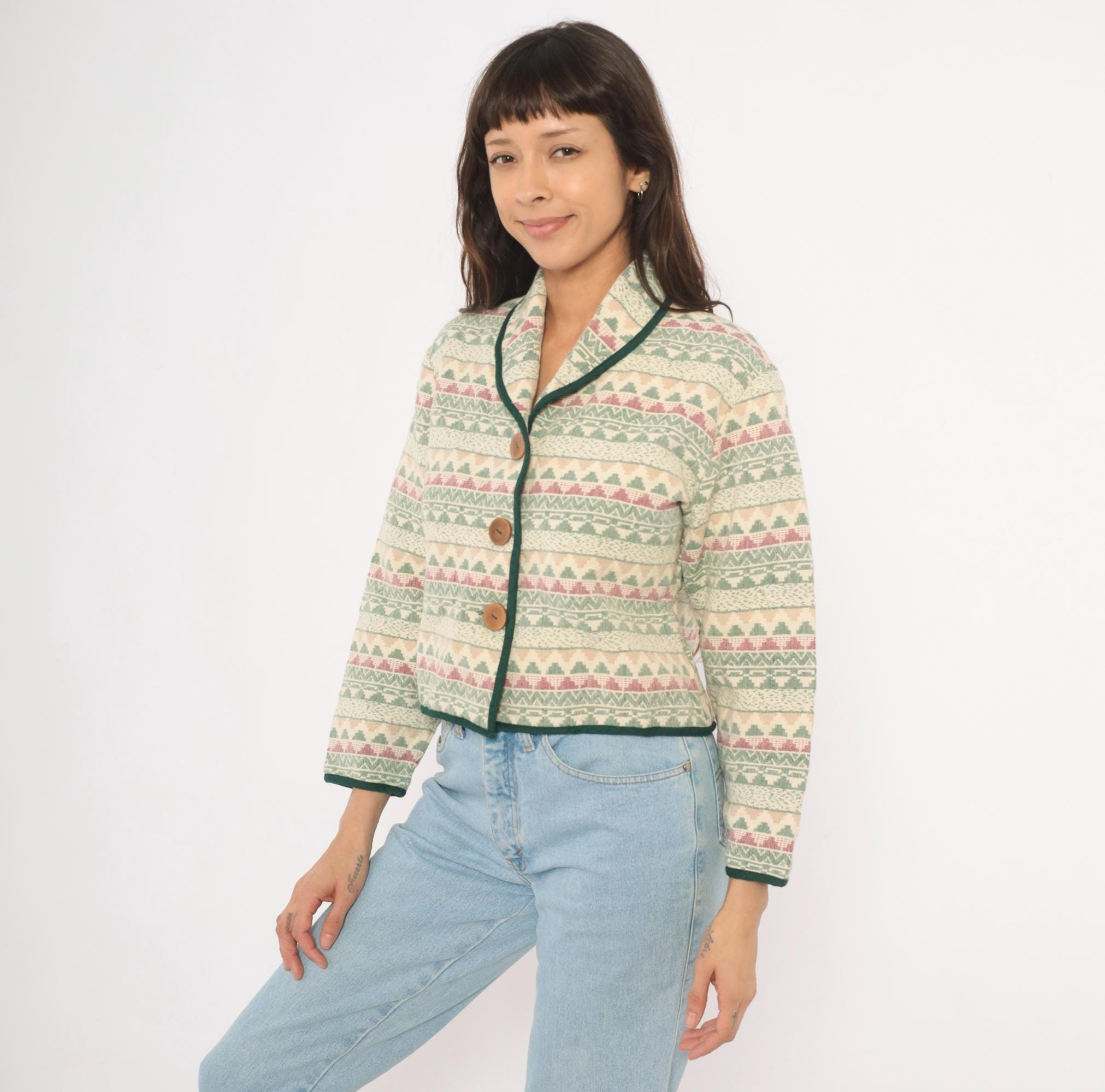 90s Southwestern-style jacket from Southwest Canyon with an allover tapestry weave in cream, sage green, and mauve geometric stripe pattern. Shawl collar with dark green contrast piping along the front placket, hem, and cuffs. Three large wooden button closures down the front, cropped hip length with long sleeves.