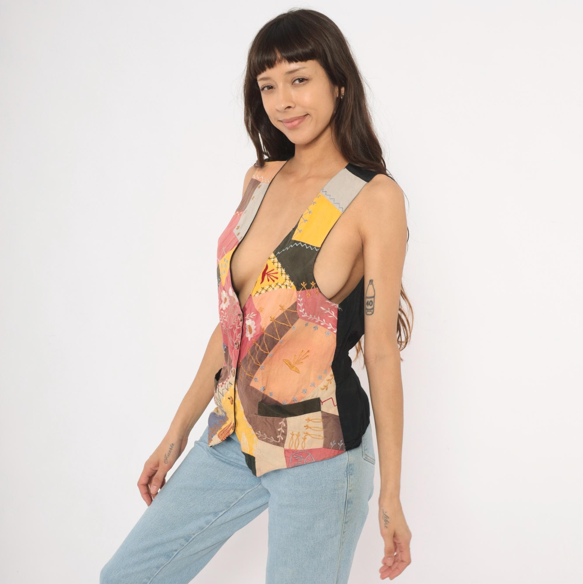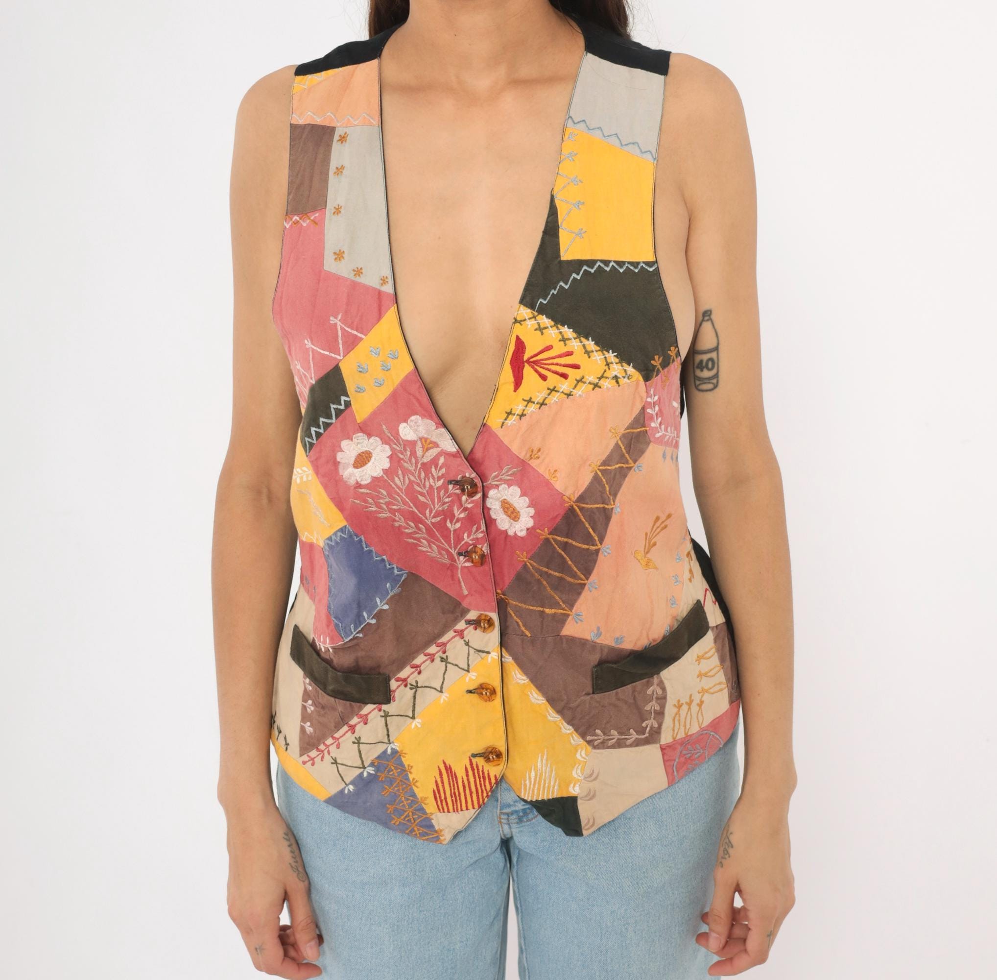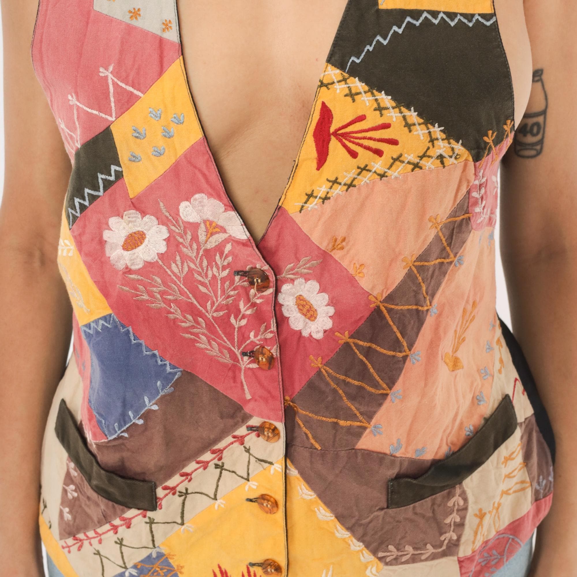 90s patchwork crazy quilt vest from Exposed Clothing with hand-embroidered floral motifs, decorative cross-stitching, and zigzag stitch details across irregular fabric patches in rose, mustard, peach, brown, and black. Deep V neckline, button front closure with amber-toned buttons, and two front patch pockets with dark trim. Solid black back panel with tie closure at the waist.