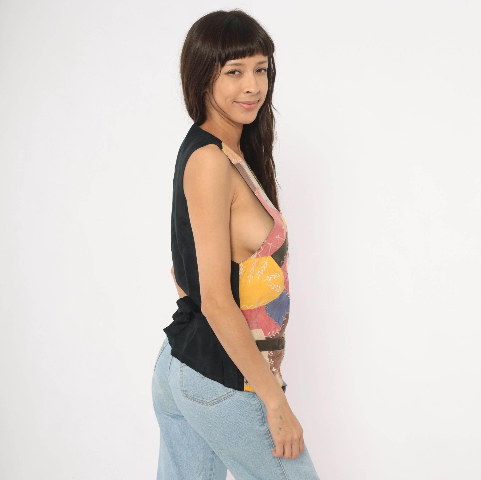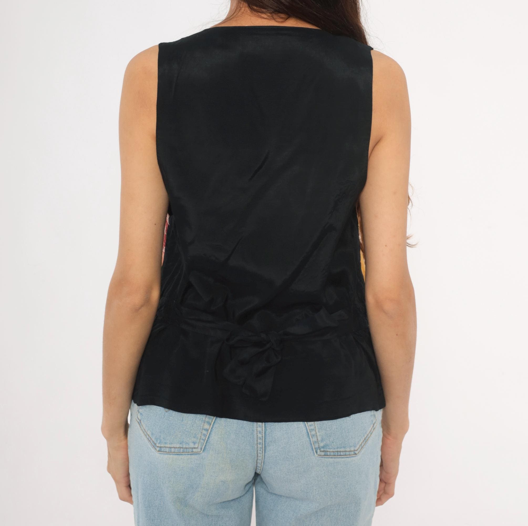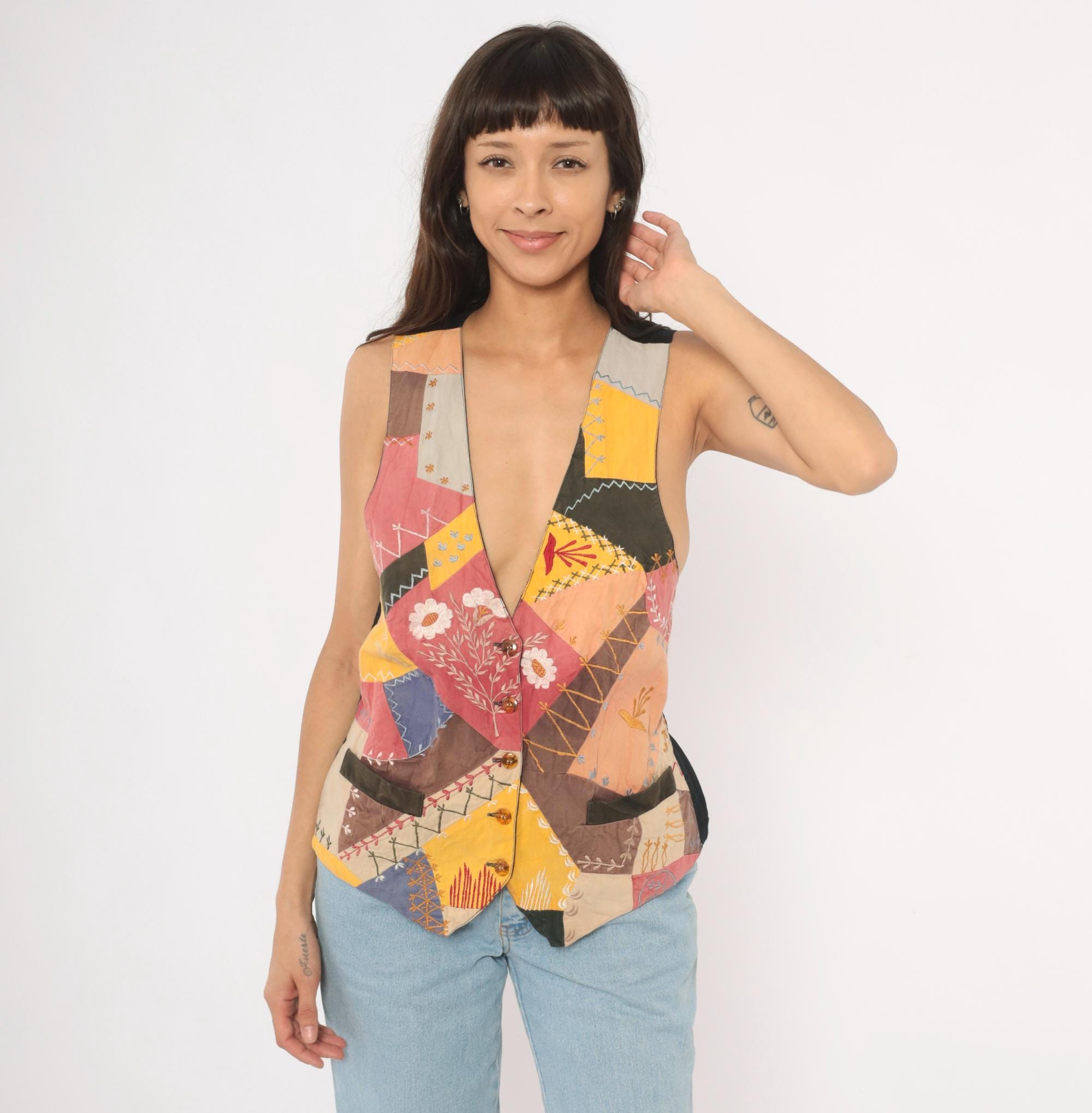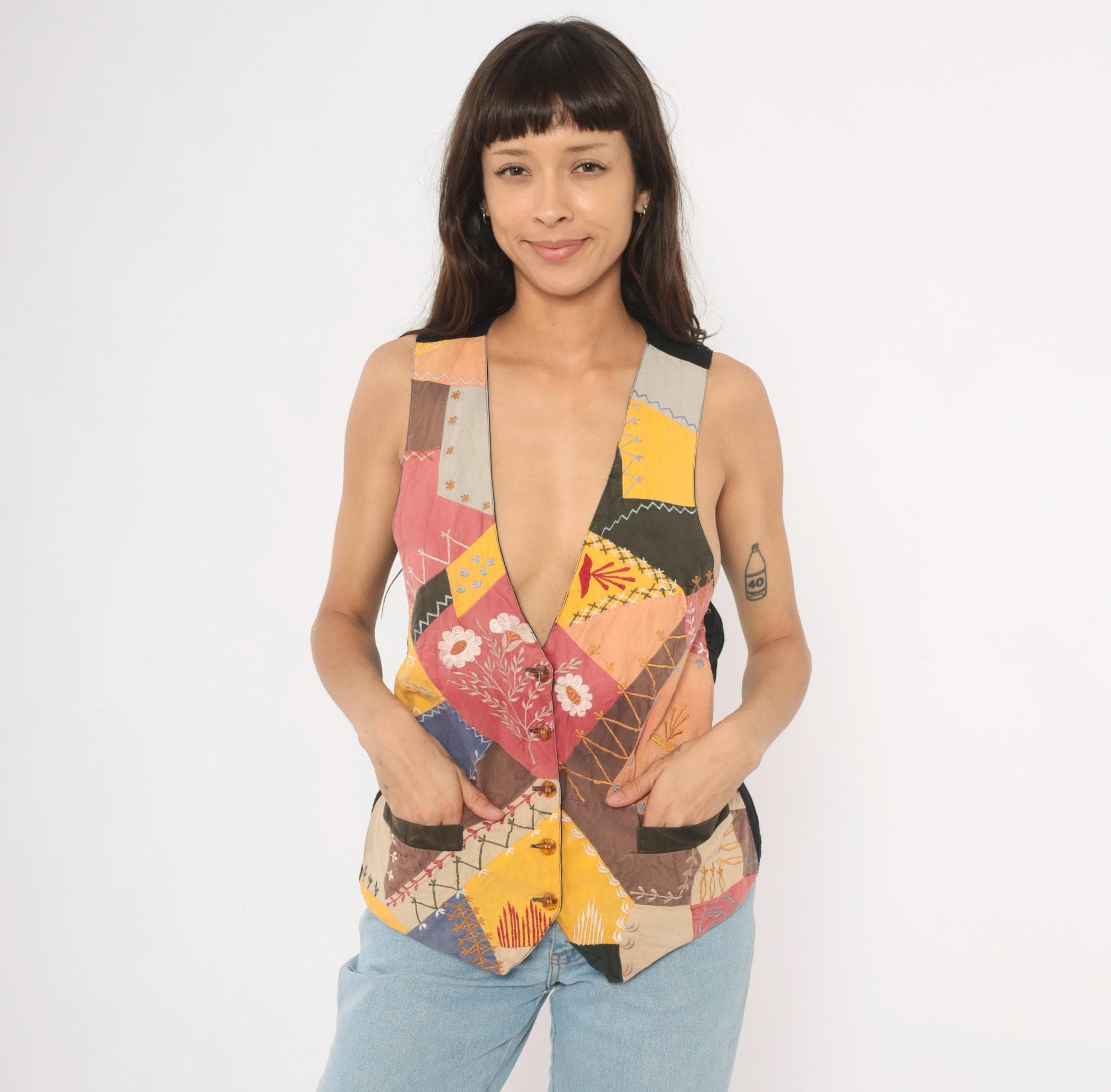 90s patchwork crazy quilt vest from Exposed Clothing with hand-embroidered floral motifs, decorative cross-stitching, and zigzag stitch details across irregular fabric patches in rose, mustard, peach, brown, and black. Deep V neckline, button front closure with amber-toned buttons, and two front patch pockets with dark trim. Solid black back panel with tie closure at the waist.