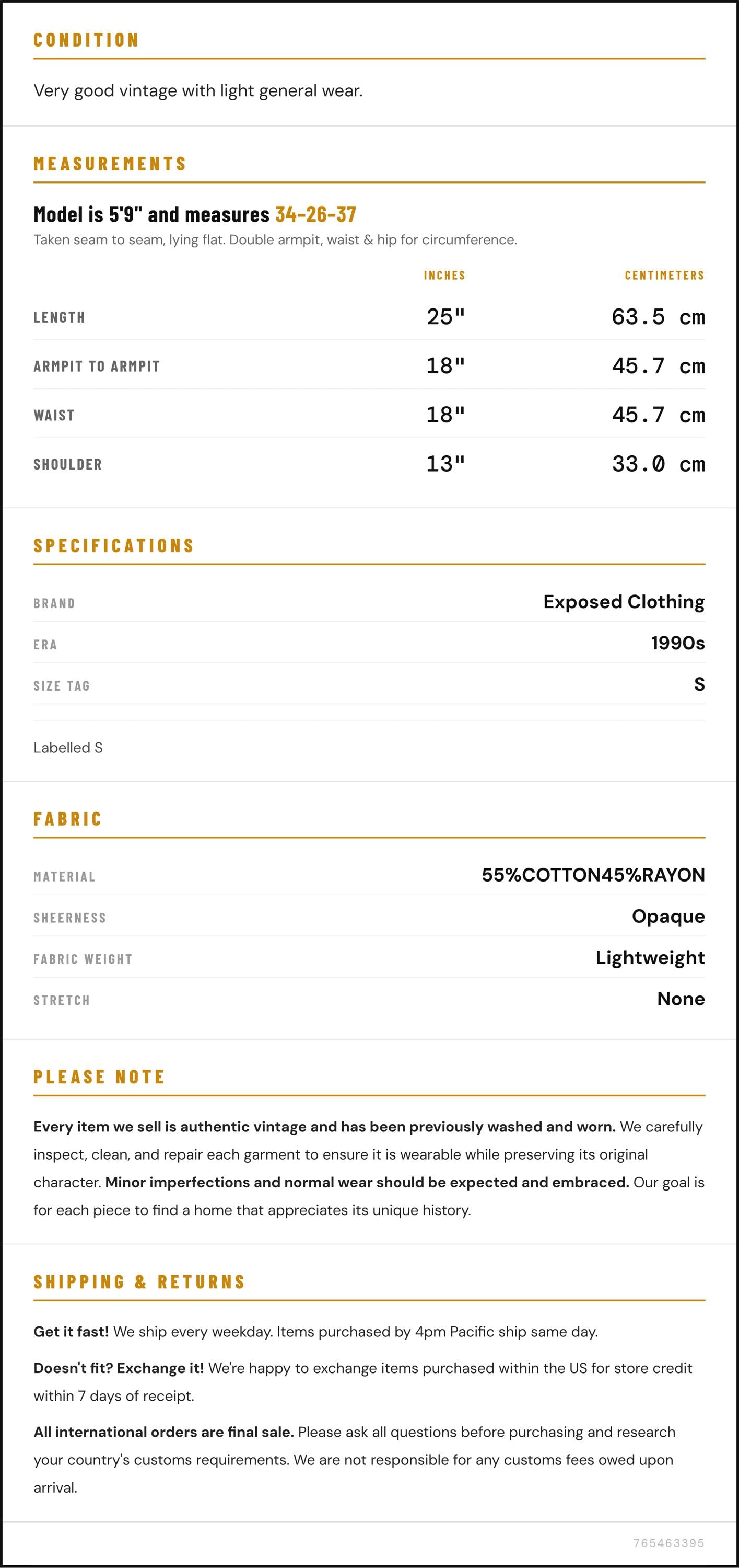 Vintage denim was usually made without any stretch, unlike modern jeans. Check the measurements to ensure proper fit, and remember to give yourself a little wiggle room in the waist and hips, depending on your preferred fit.