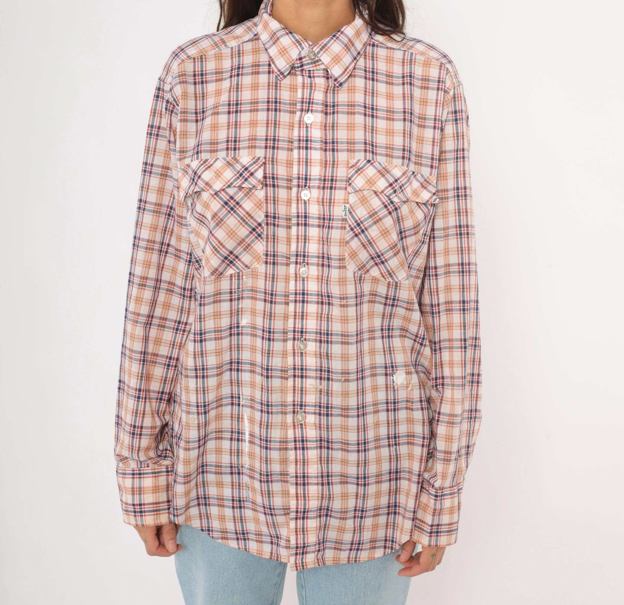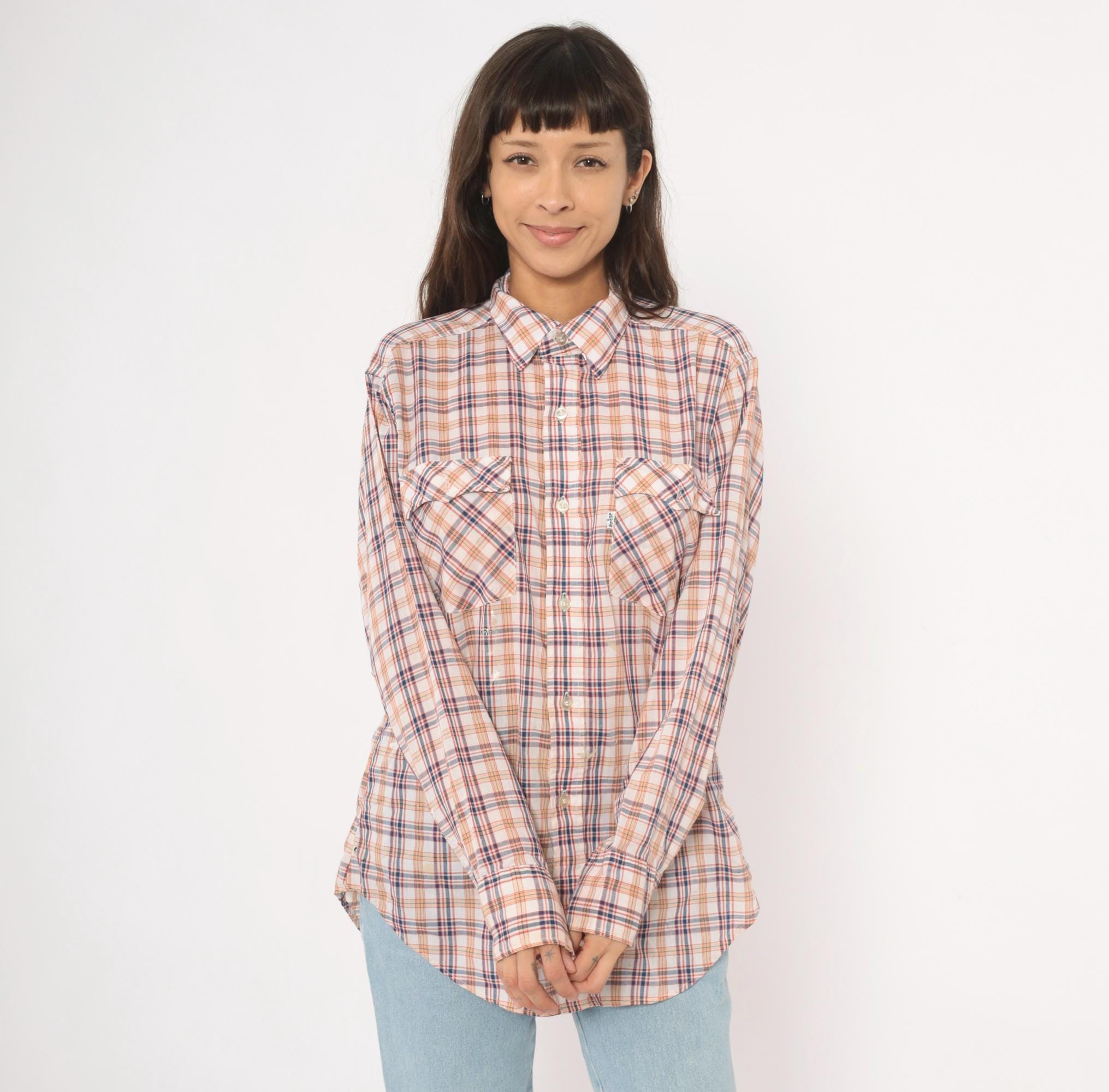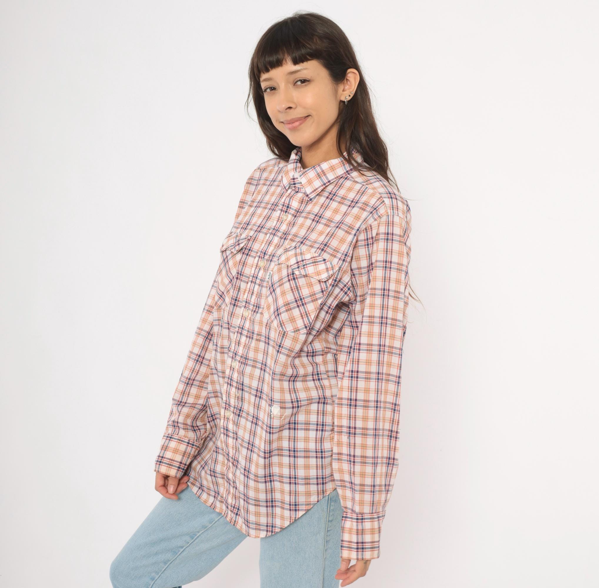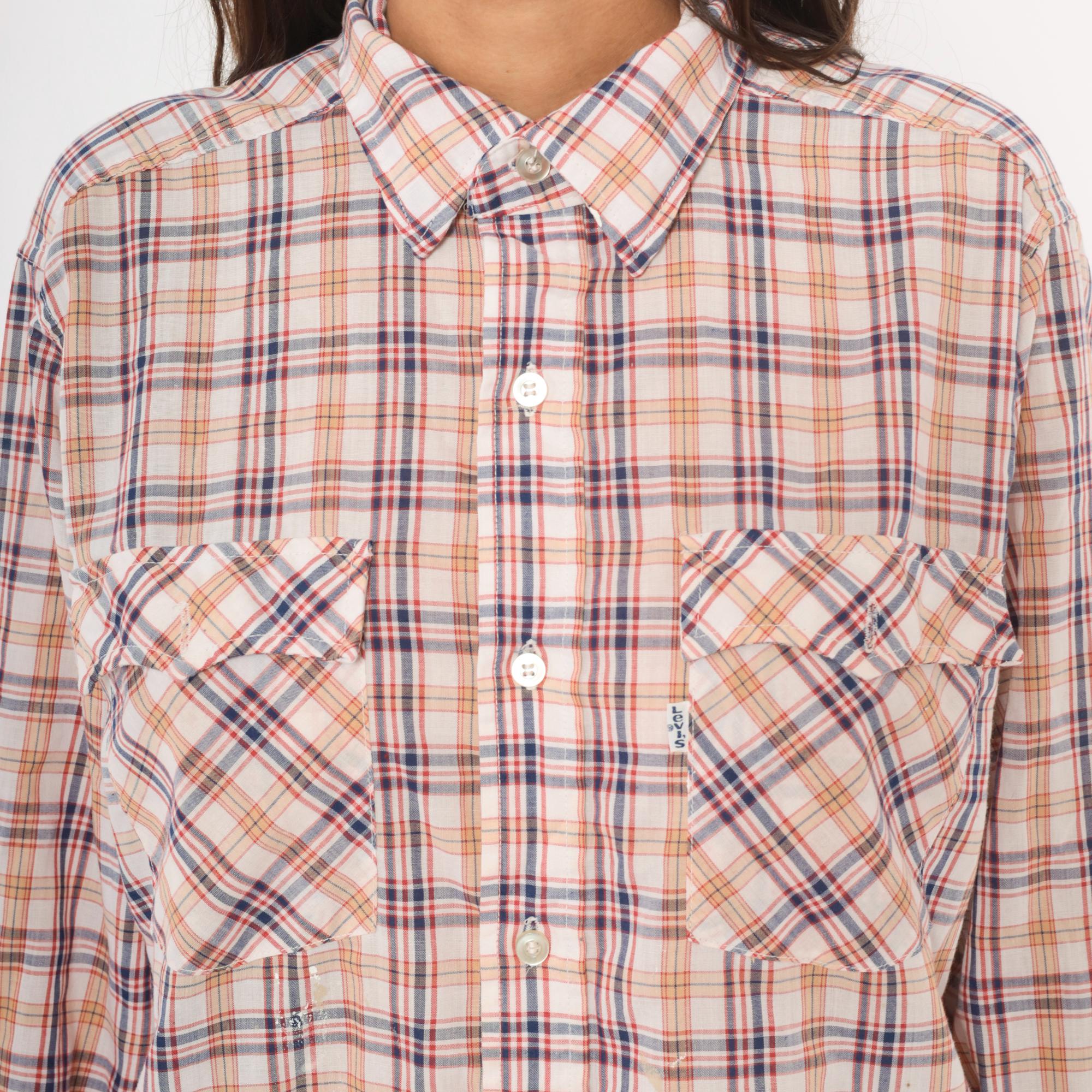 80s plaid button front shirt from Levi Strauss & Co in white with navy, red, and tan check pattern. Pointed collar, full button closure with white buttons, and two chest pockets with flap closures. Long sleeves, straight hem with side vents, and a relaxed fit through the body.