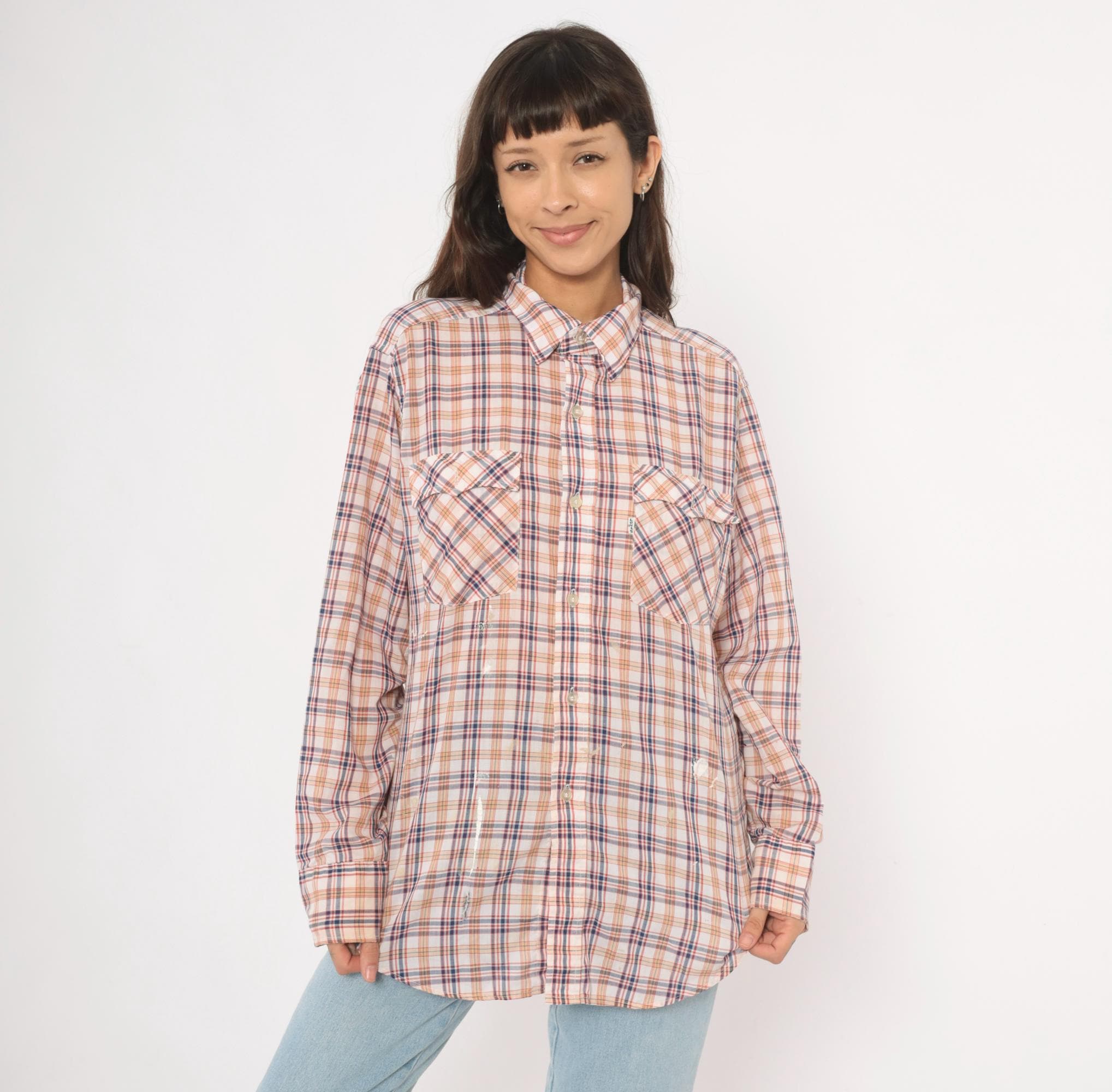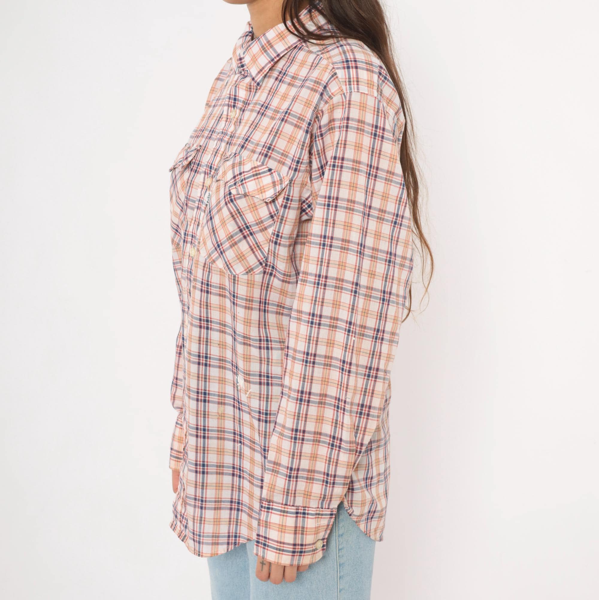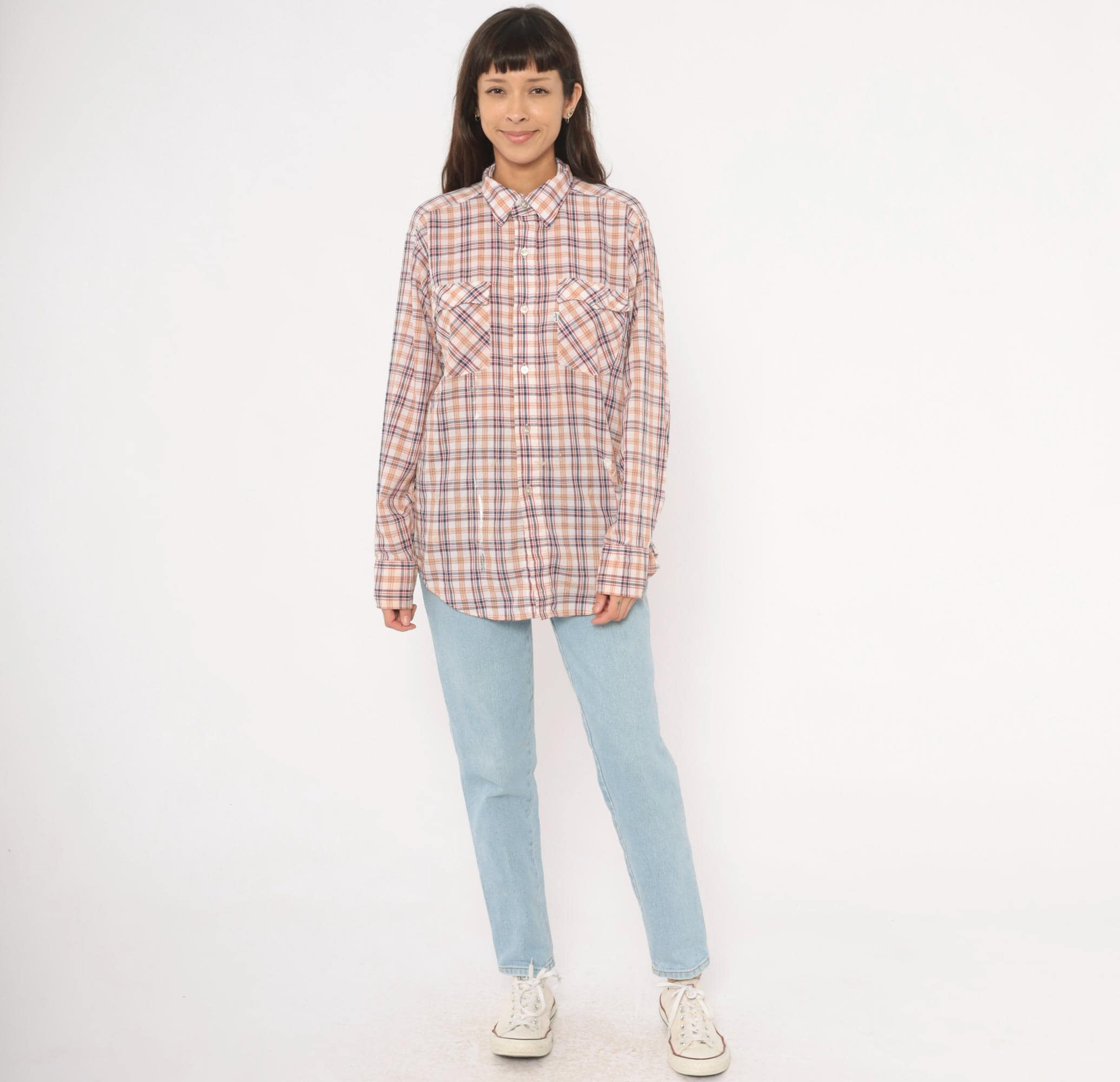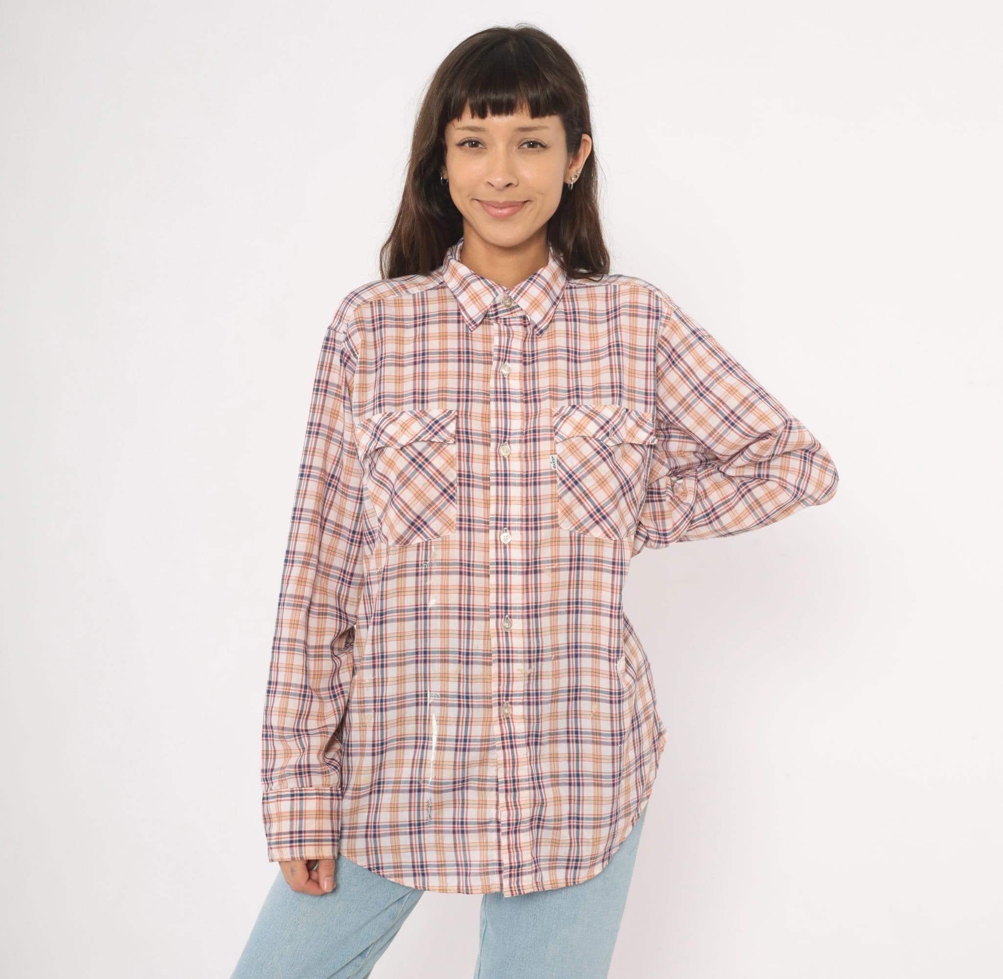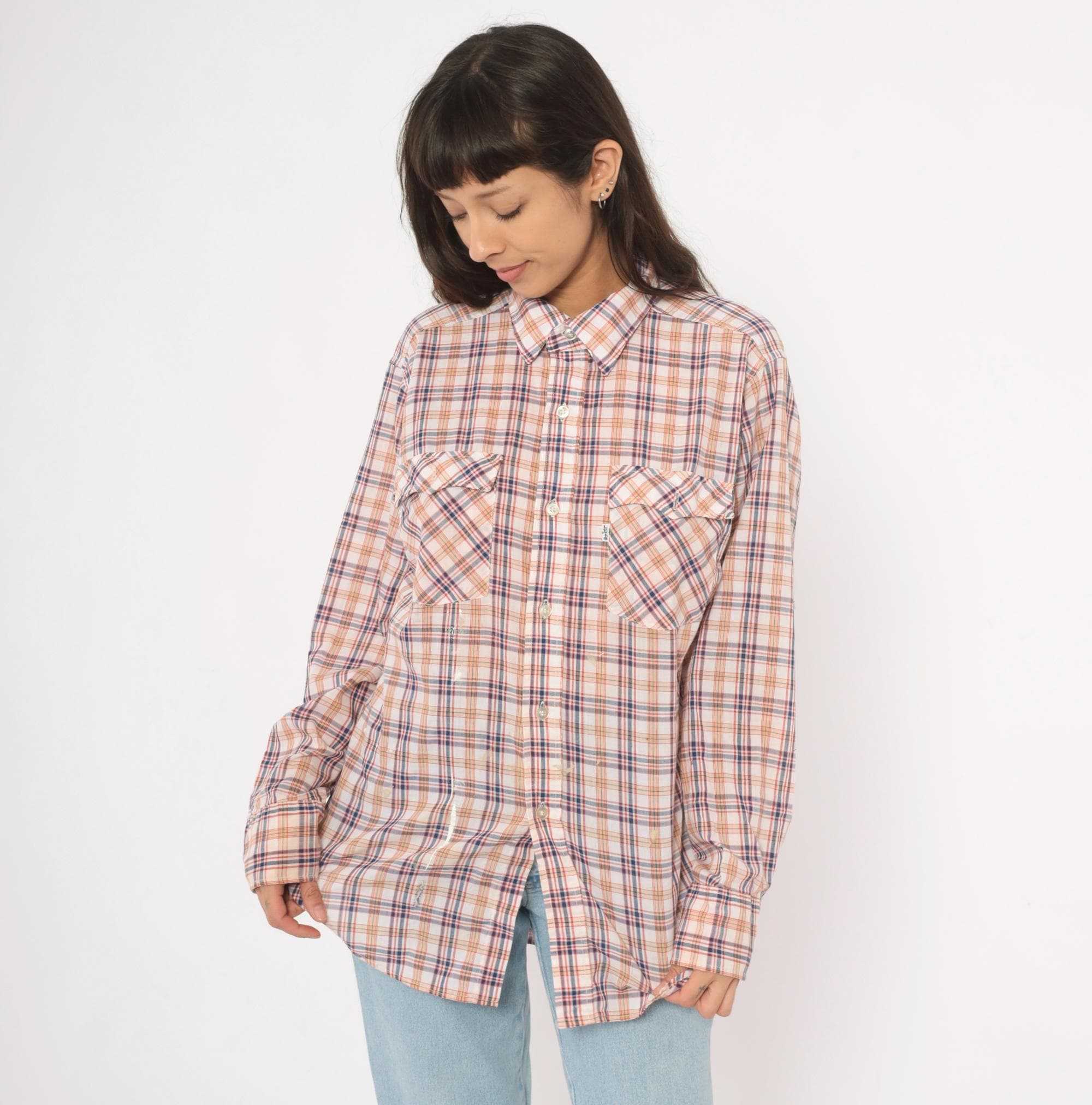 80s plaid button front shirt from Levi Strauss & Co in white with navy, red, and tan check pattern. Pointed collar, full button closure with white buttons, and two chest pockets with flap closures. Long sleeves, straight hem with side vents, and a relaxed fit through the body.