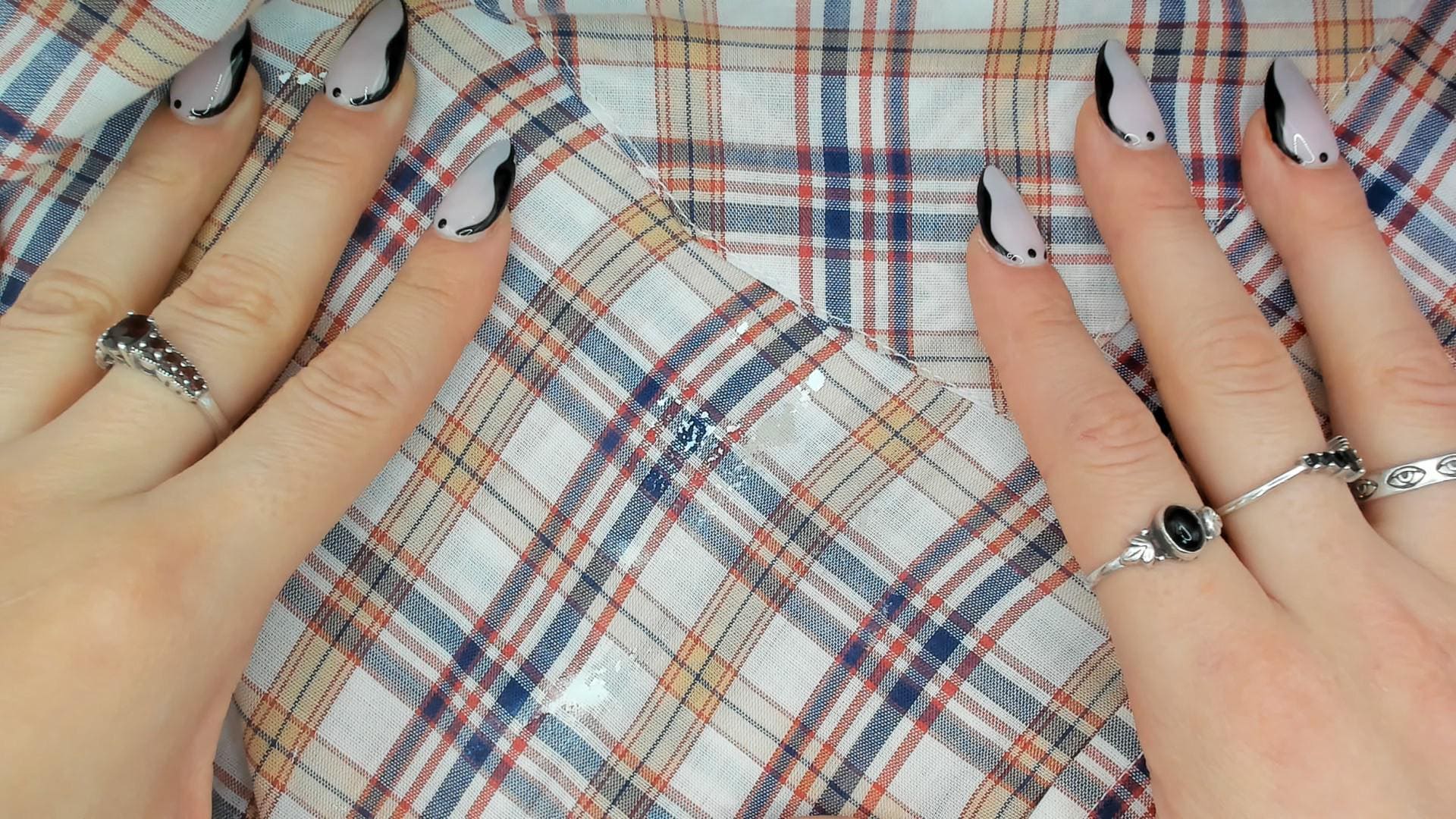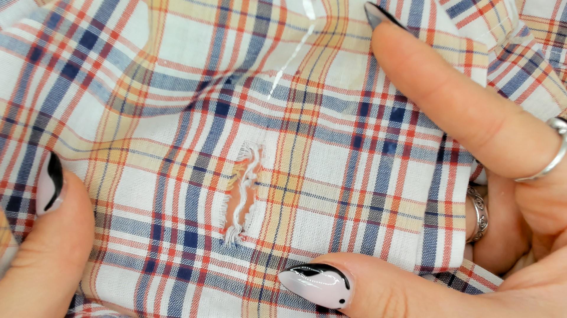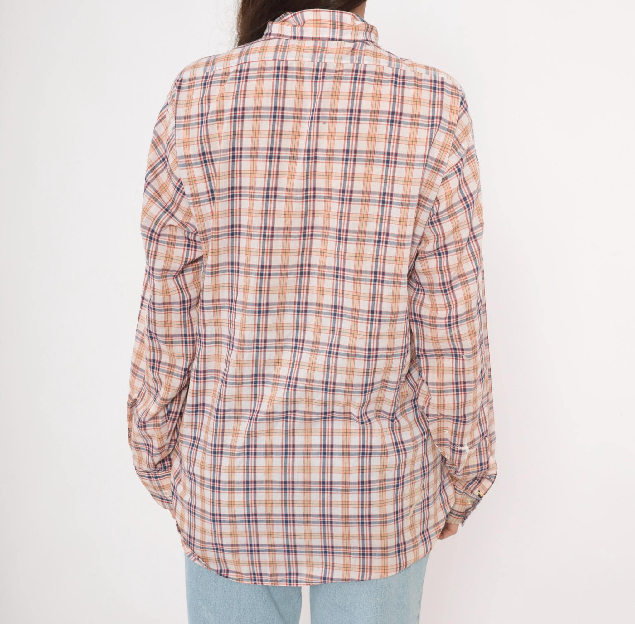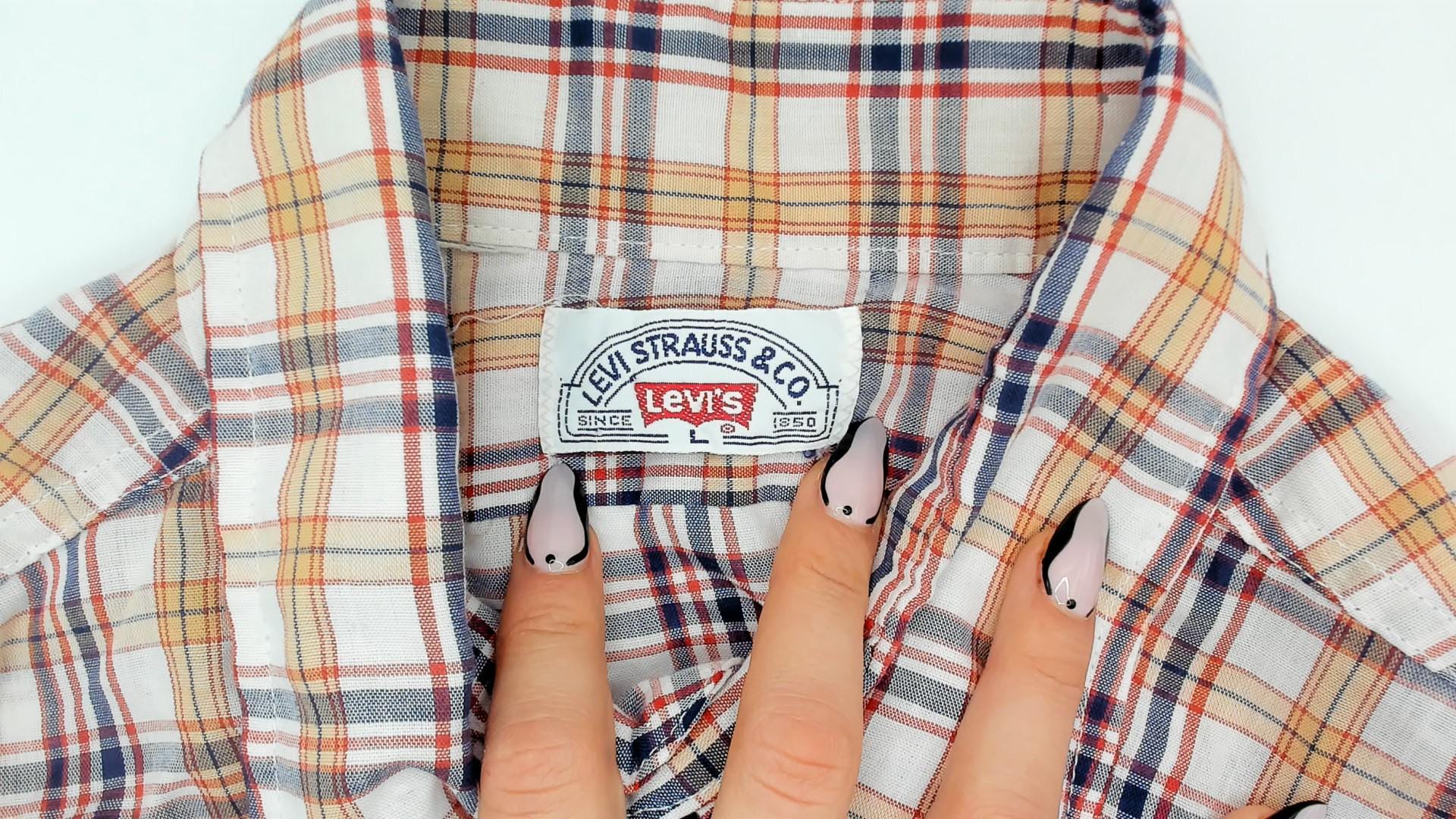 80s plaid button front shirt from Levi Strauss & Co in white with navy, red, and tan check pattern. Pointed collar, full button closure with white buttons, and two chest pockets with flap closures. Long sleeves, straight hem with side vents, and a relaxed fit through the body.