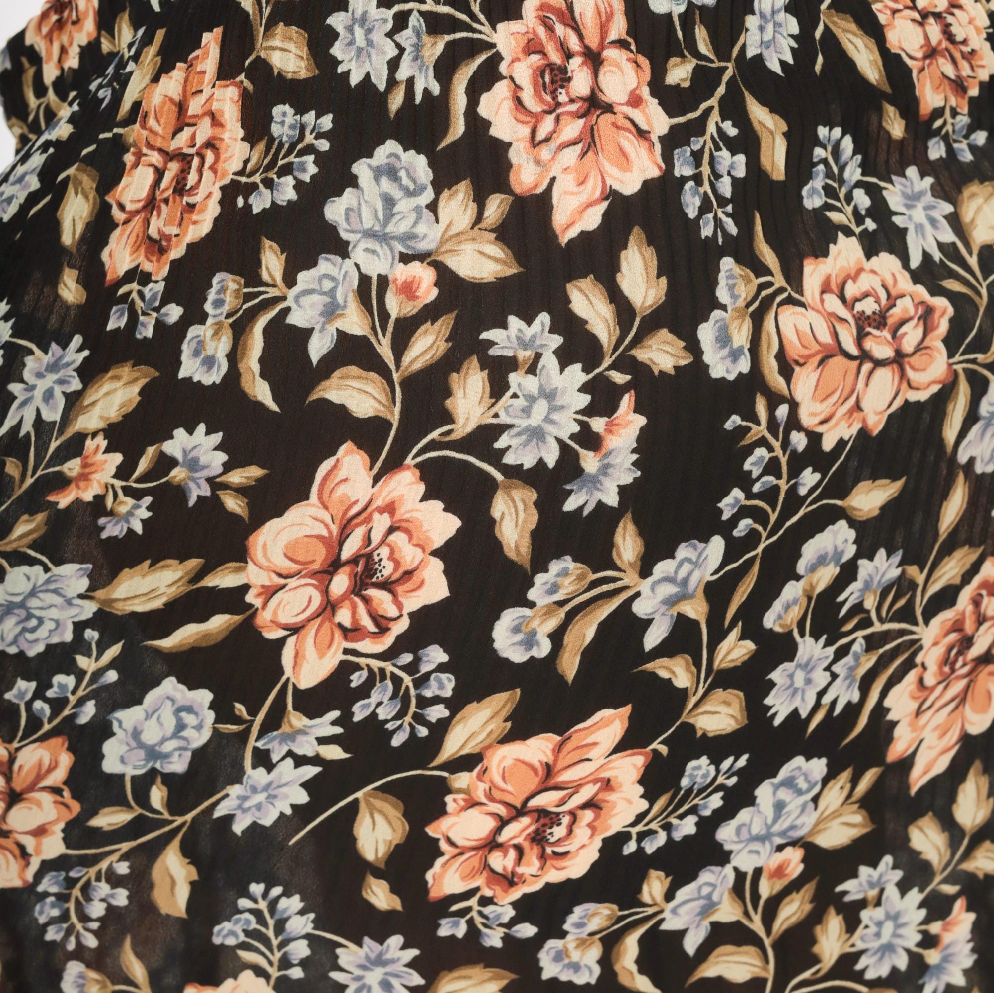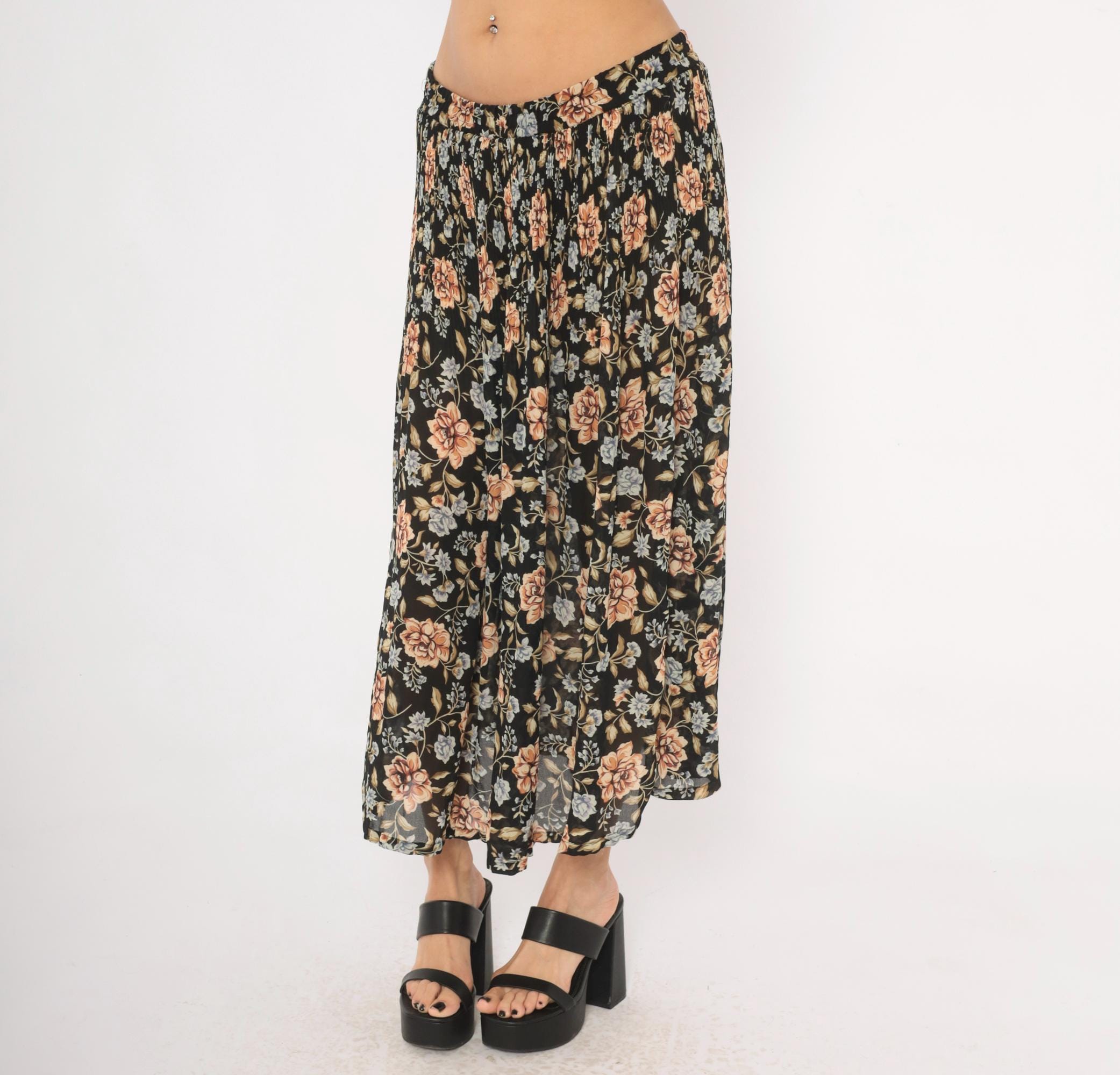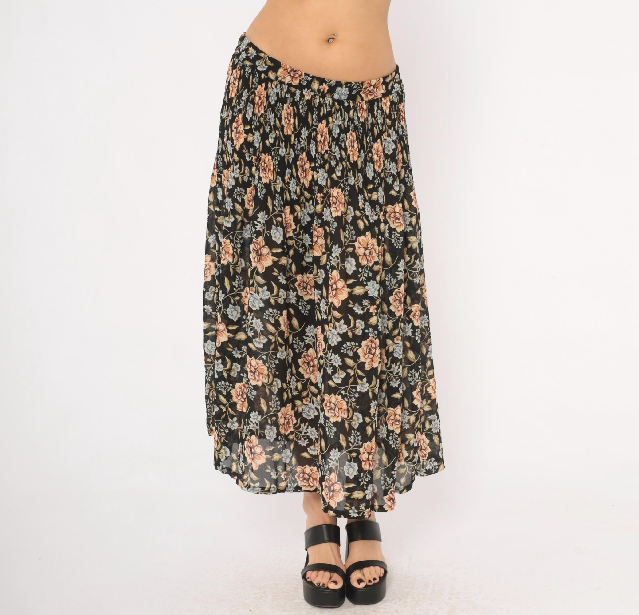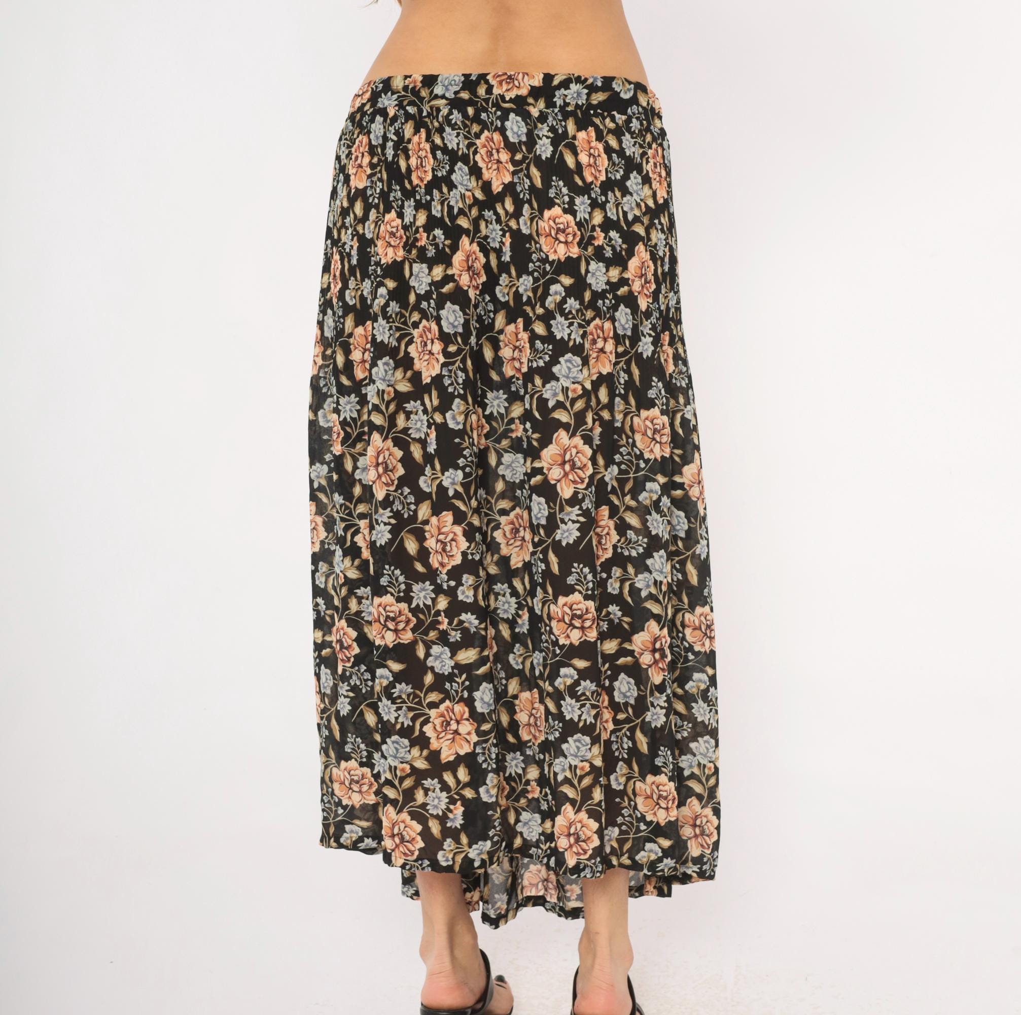 90s black floral maxi skirt from Sag Harbor with large peach roses and periwinkle blue flower clusters against a dark ground. Elastic gathered waistband, full sweep through the body, and ankle-length hem. Allover trailing vine and leaf pattern in olive, tan, and muted blue tones.