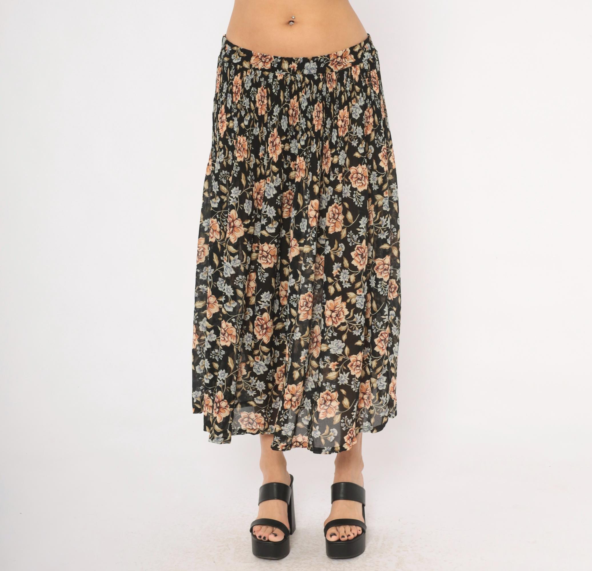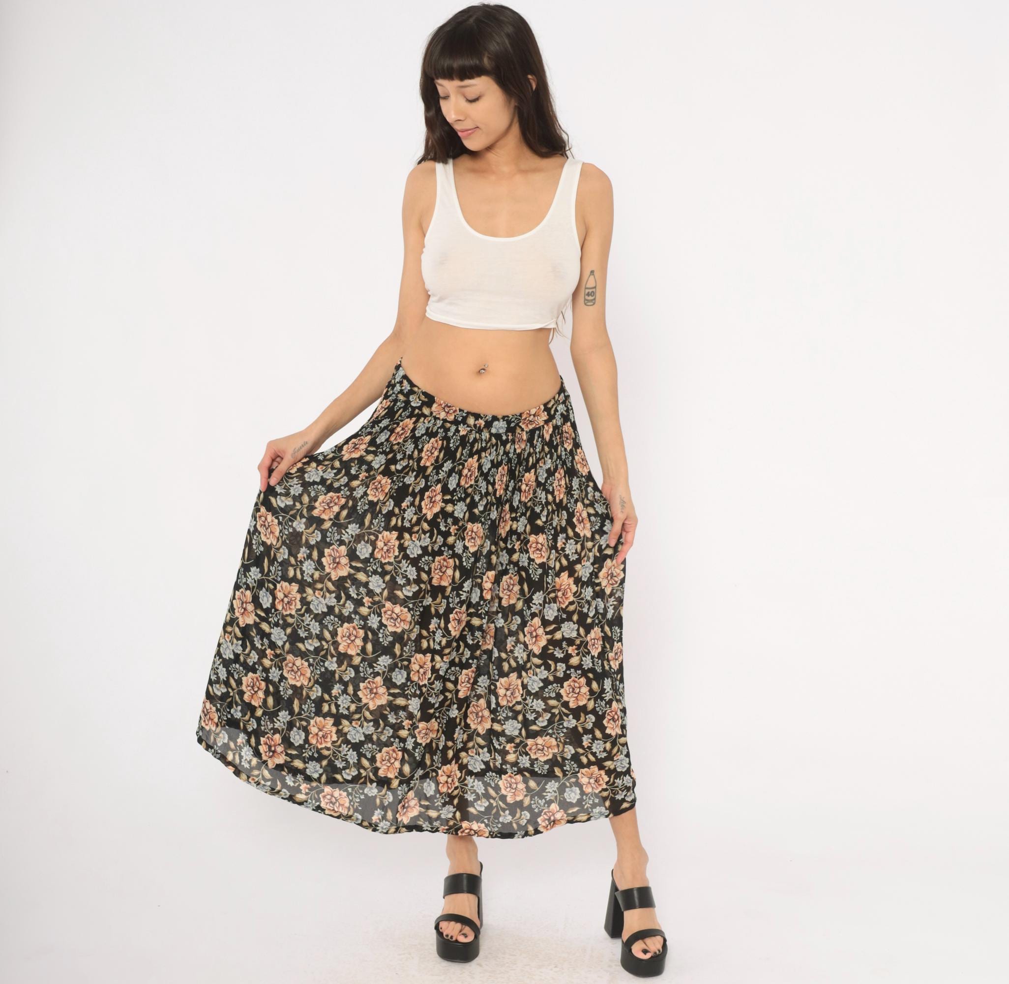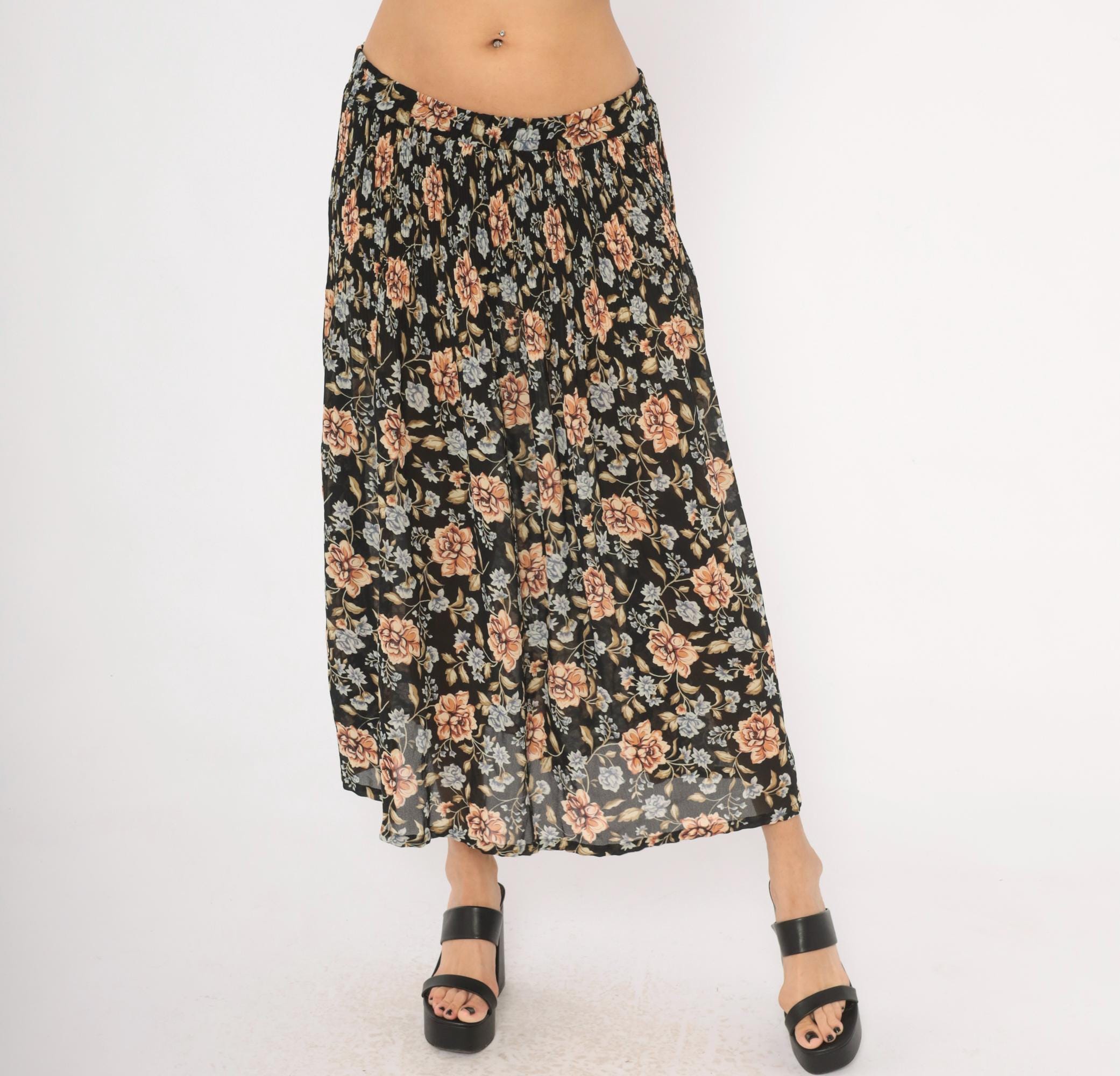90s black floral maxi skirt from Sag Harbor with large peach roses and periwinkle blue flower clusters against a dark ground. Elastic gathered waistband, full sweep through the body, and ankle-length hem. Allover trailing vine and leaf pattern in olive, tan, and muted blue tones.