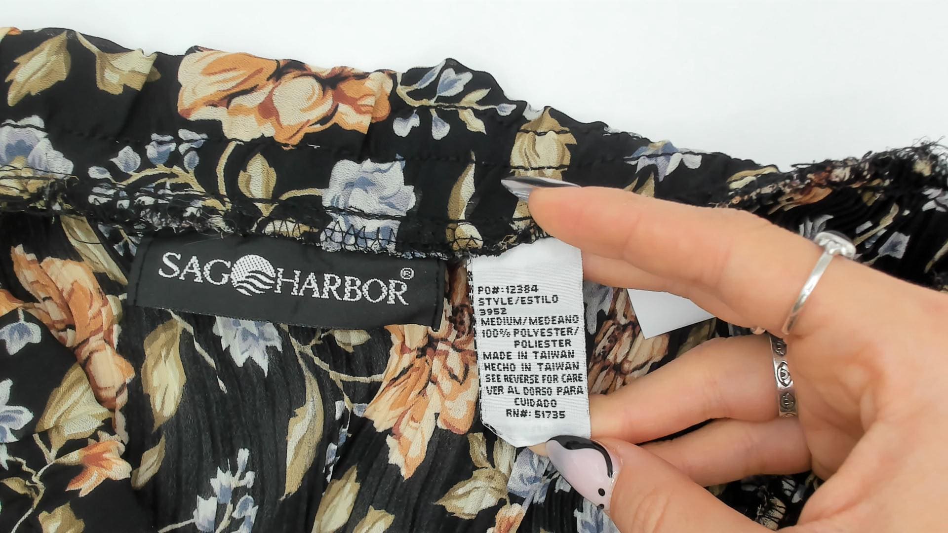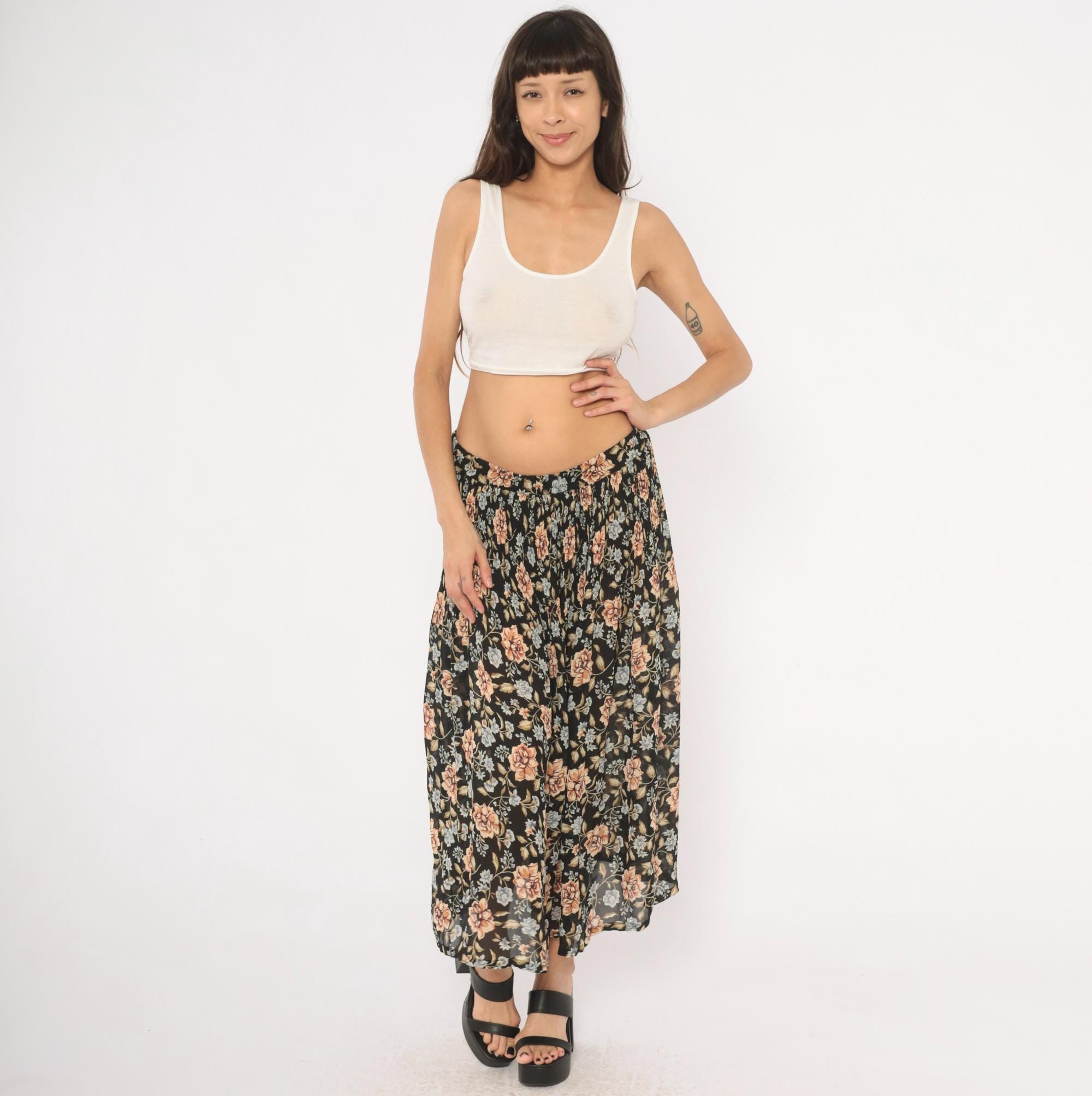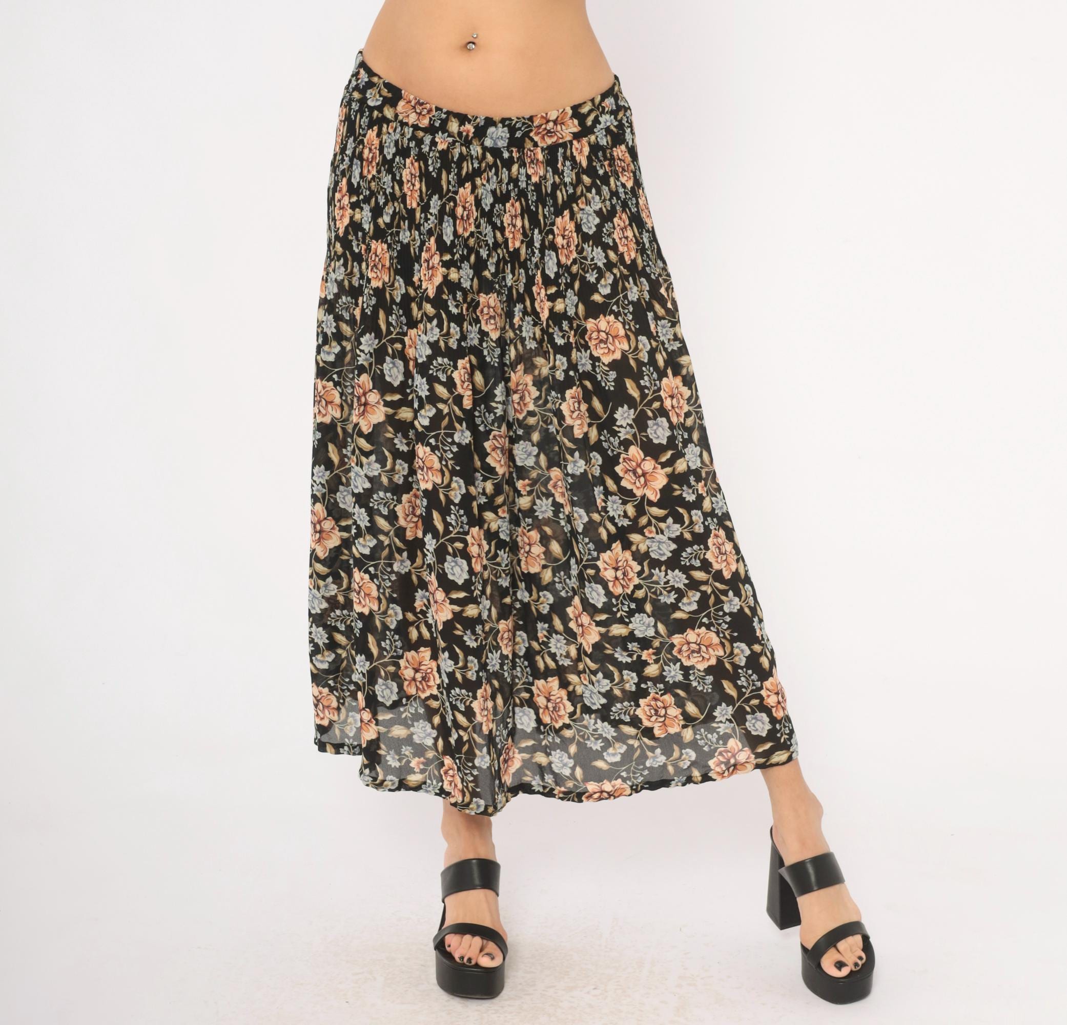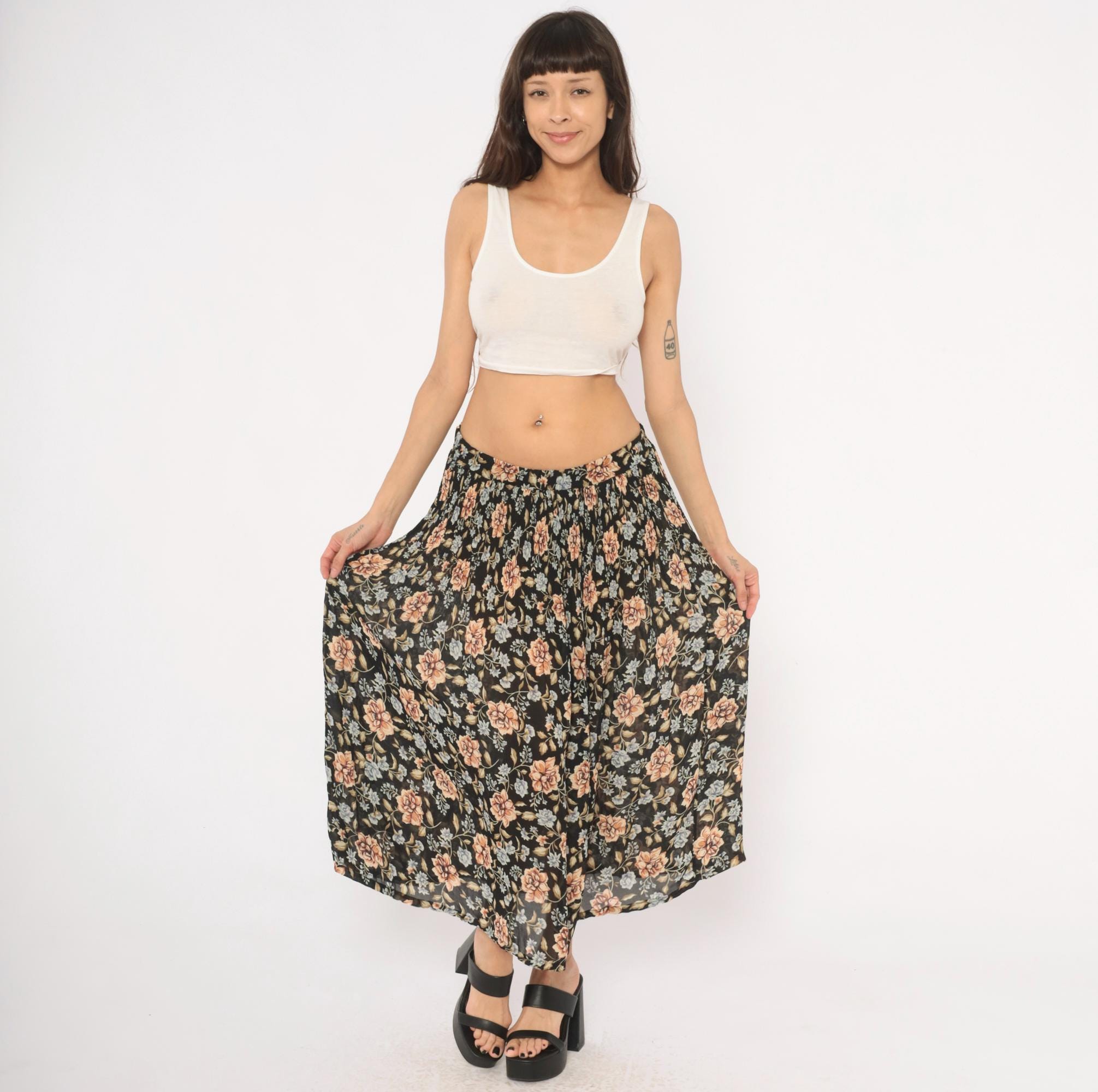 90s black floral maxi skirt from Sag Harbor with large peach roses and periwinkle blue flower clusters against a dark ground. Elastic gathered waistband, full sweep through the body, and ankle-length hem. Allover trailing vine and leaf pattern in olive, tan, and muted blue tones.