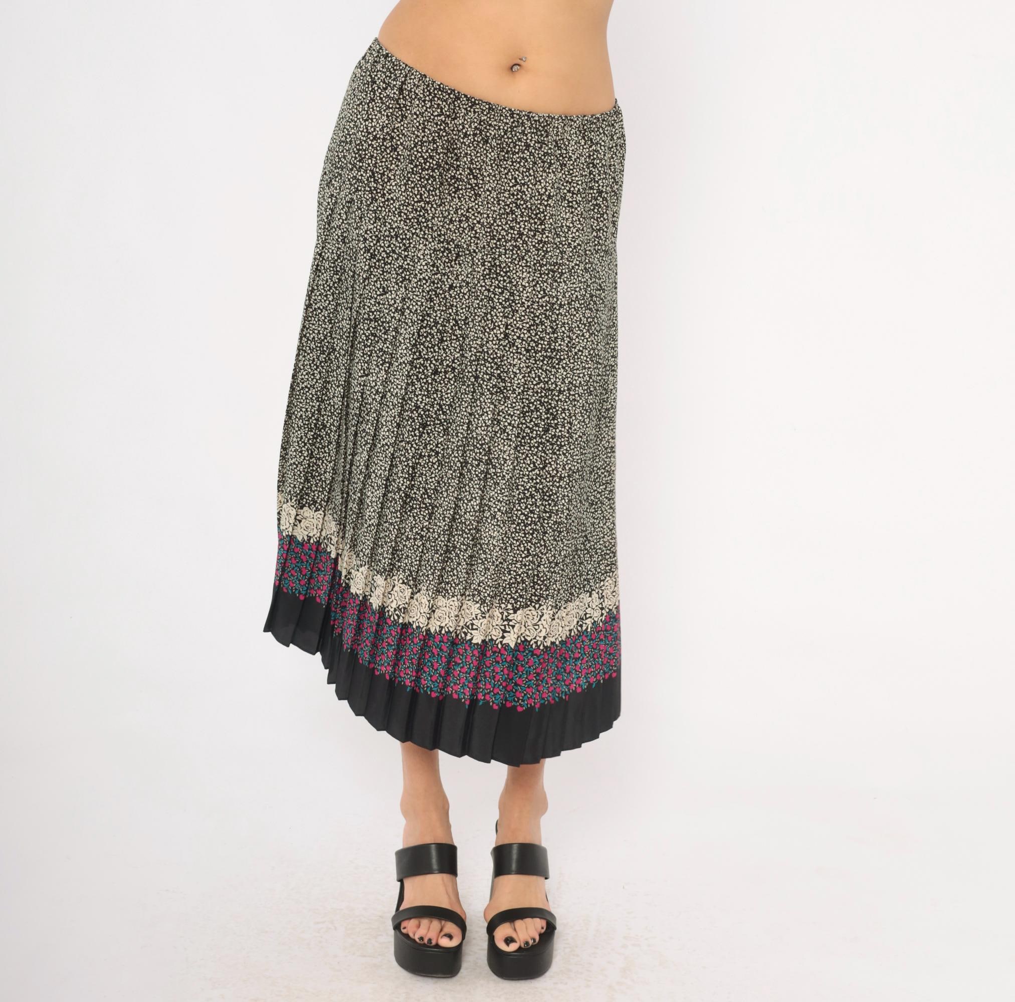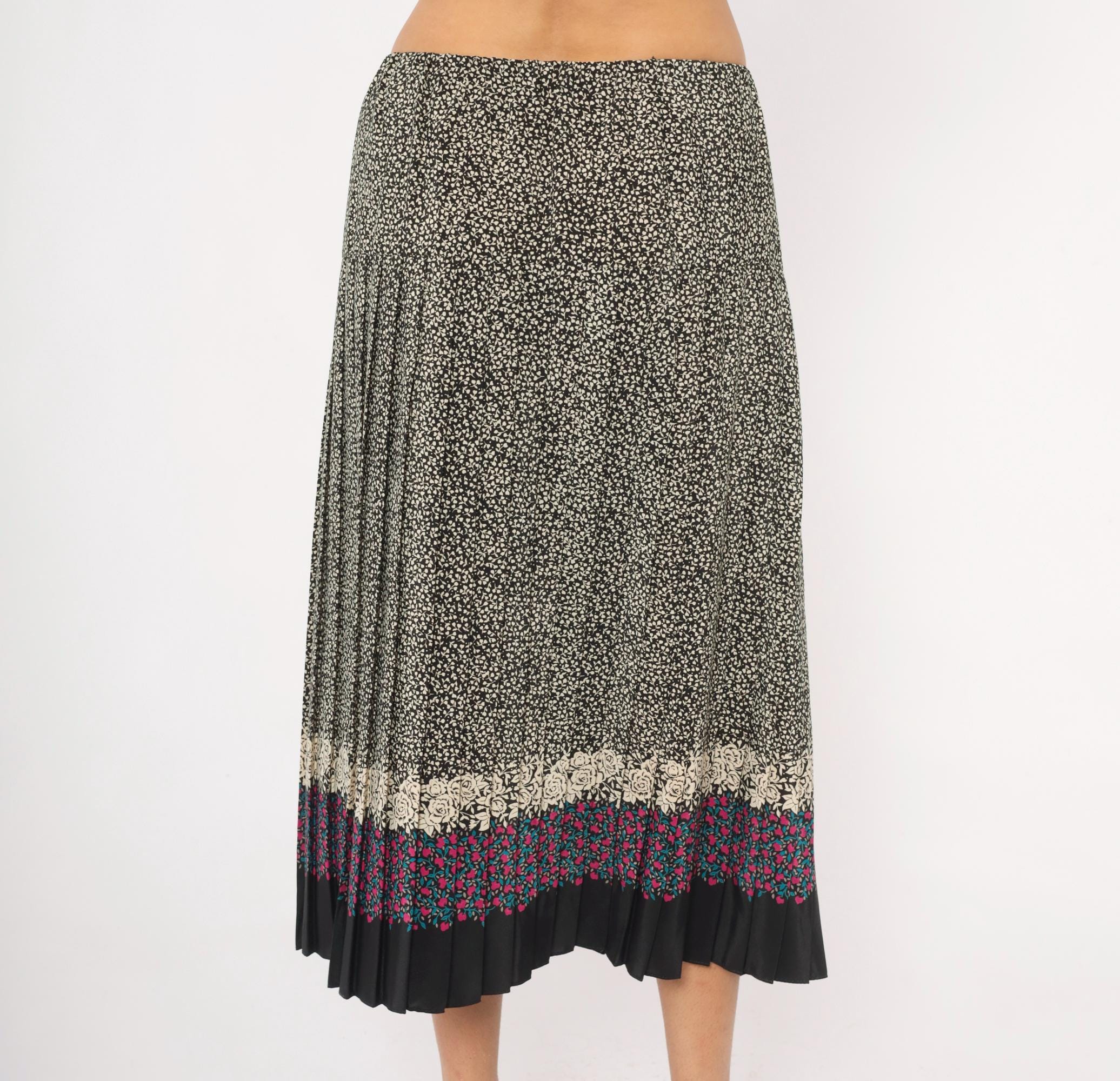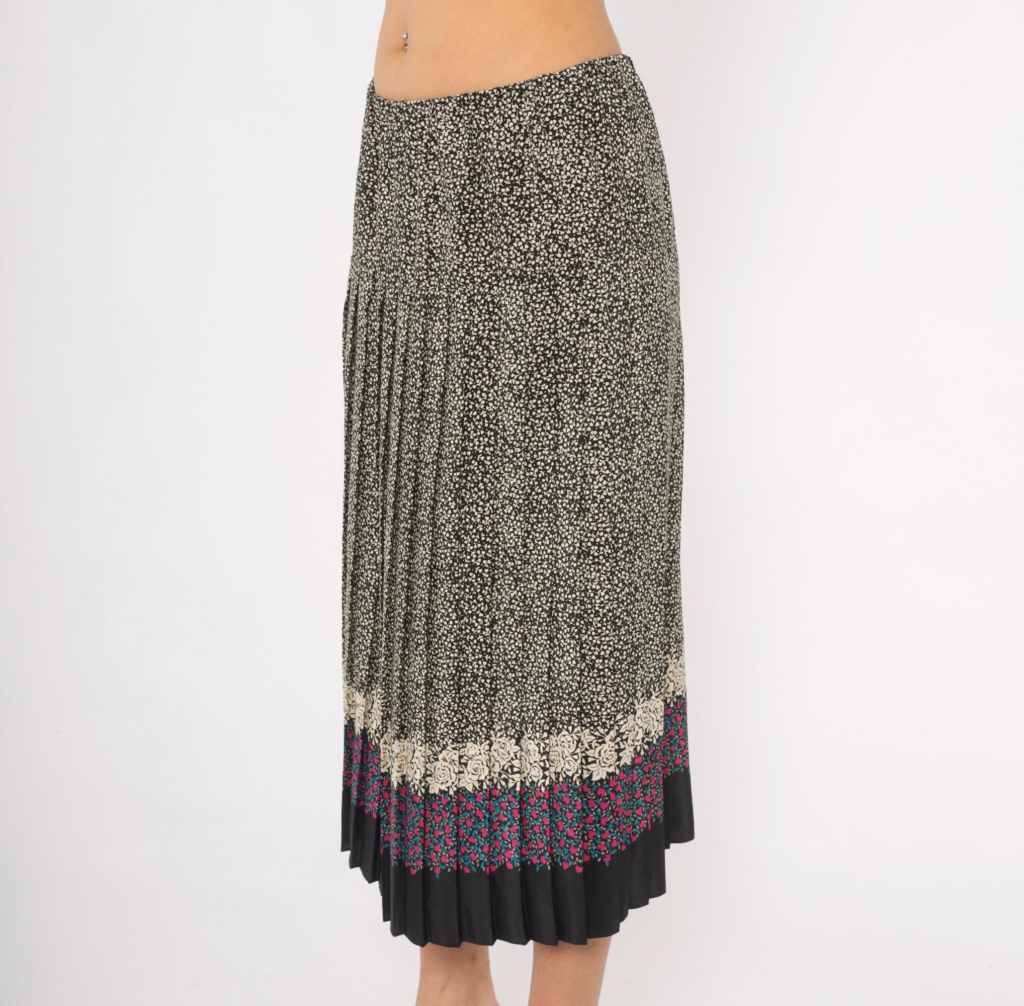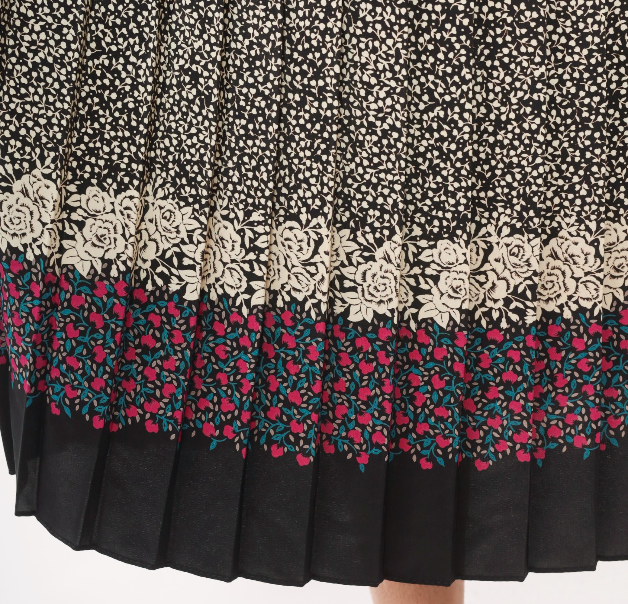 80s black and cream floral border print midi skirt with pleated hem and elastic waistband. Small ditsy print across the body transitions into a larger rose motif border near the hemline, followed by a band of pink and teal flowers against a dark ground. A-line silhouette with accordion-style pleating along the bottom edge and a solid black hem band.