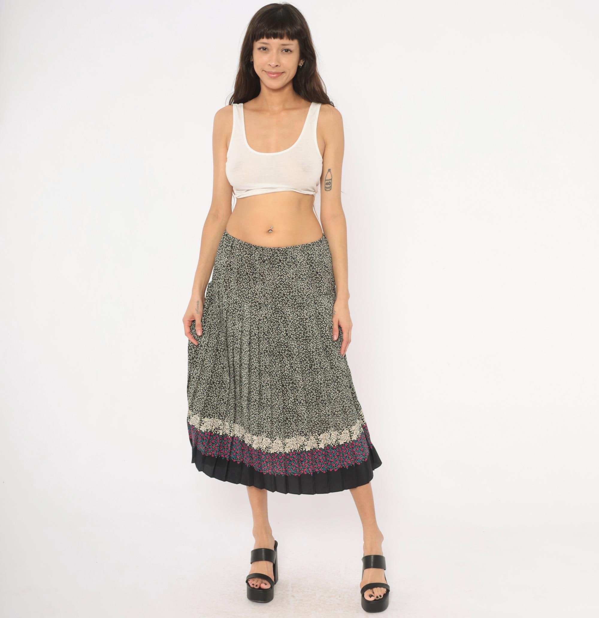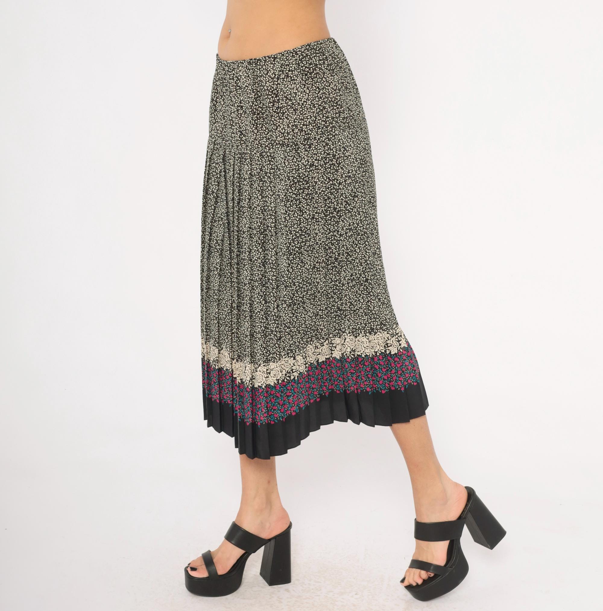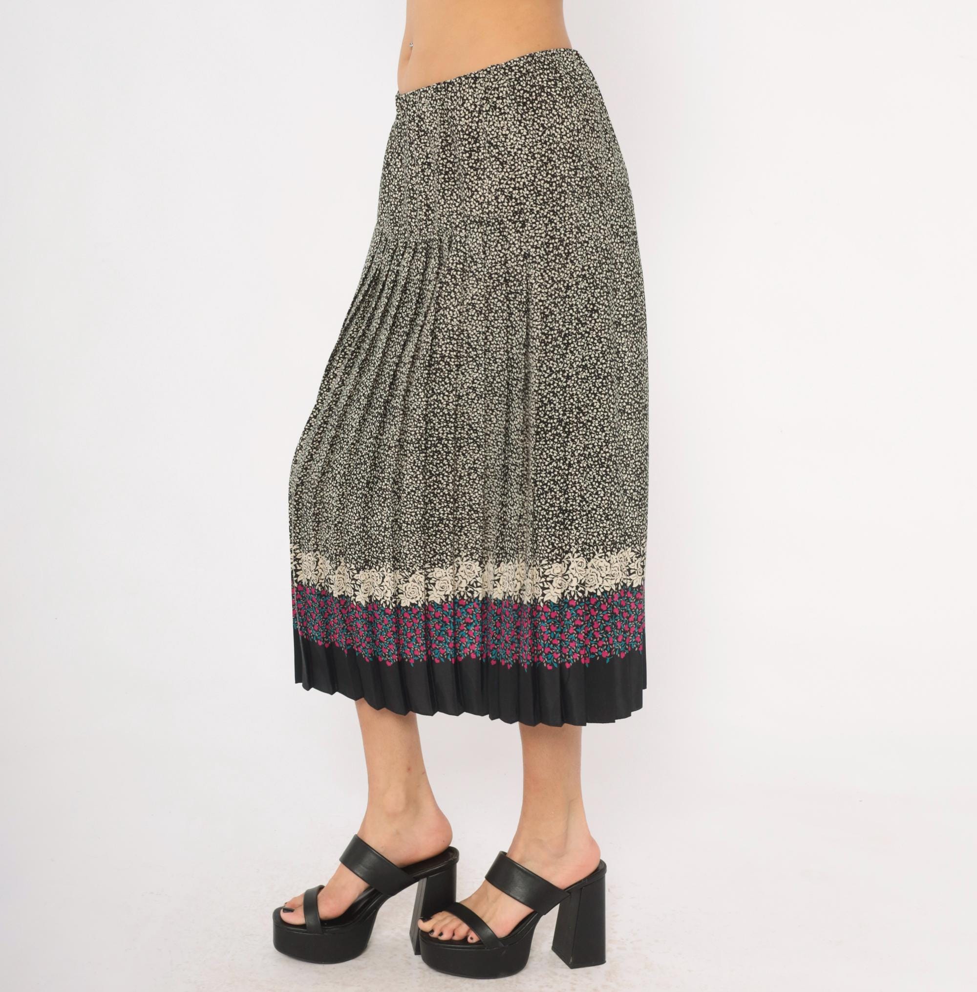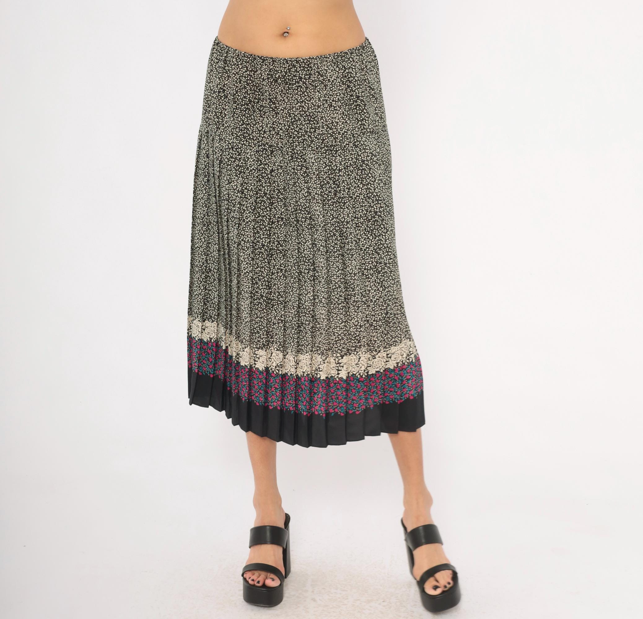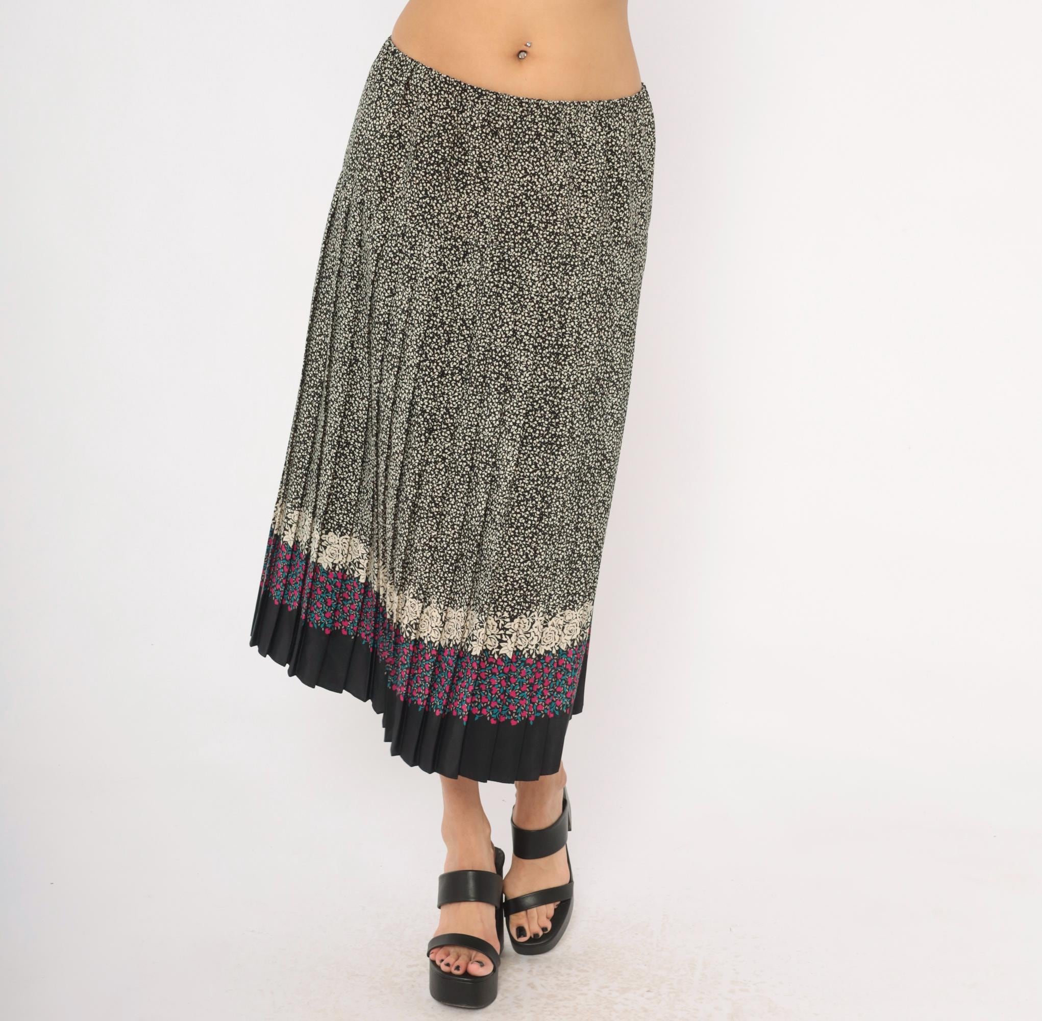 80s black and cream floral border print midi skirt with pleated hem and elastic waistband. Small ditsy print across the body transitions into a larger rose motif border near the hemline, followed by a band of pink and teal flowers against a dark ground. A-line silhouette with accordion-style pleating along the bottom edge and a solid black hem band.