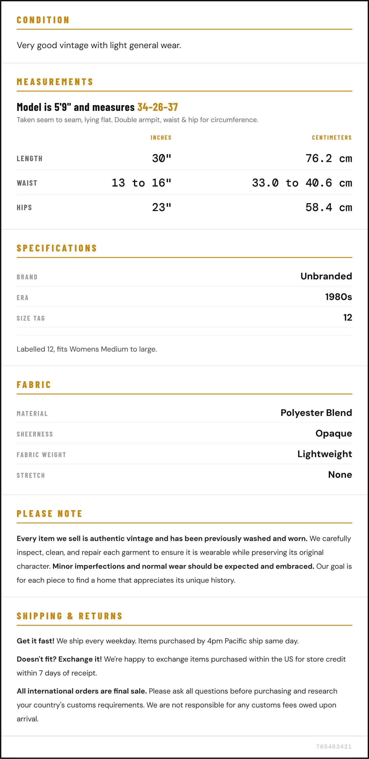 Vintage denim was usually made without any stretch, unlike modern jeans. Check the measurements to ensure proper fit, and remember to give yourself a little wiggle room in the waist and hips, depending on your preferred fit.