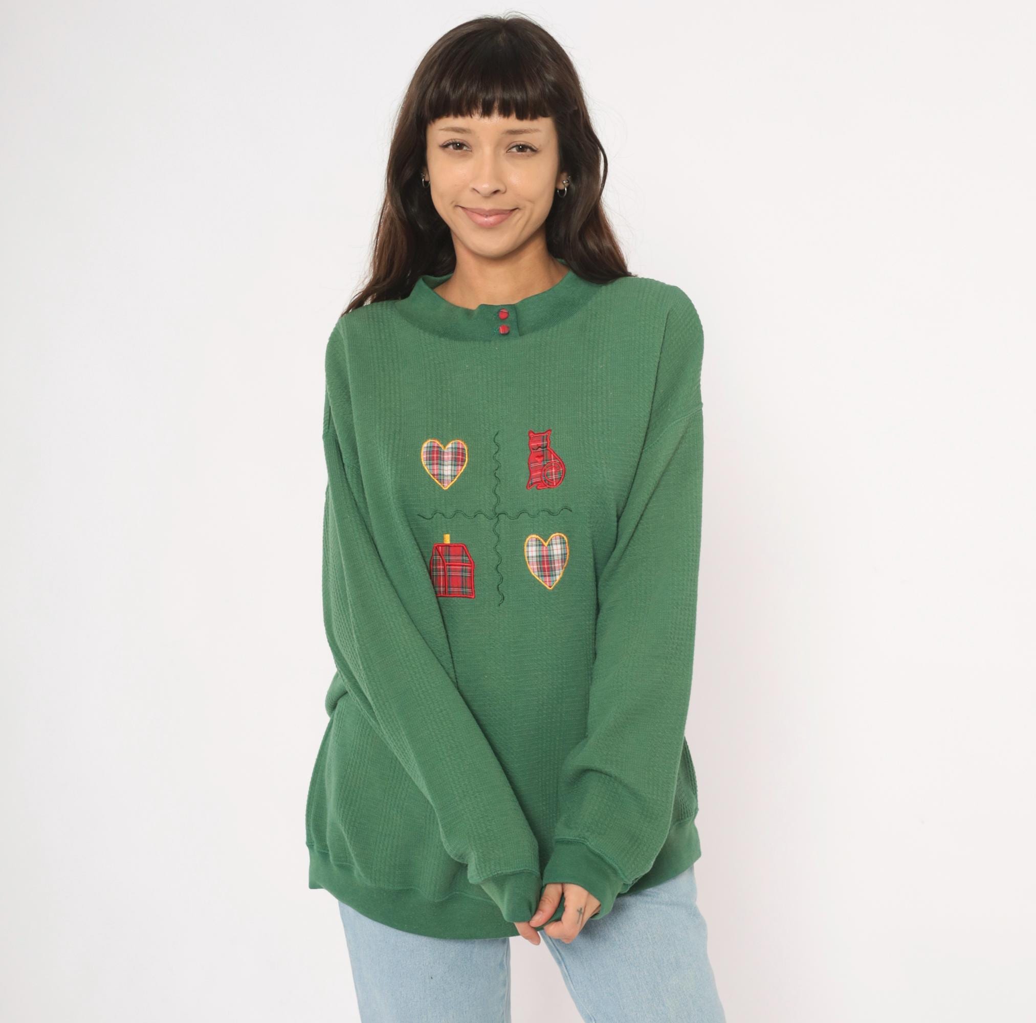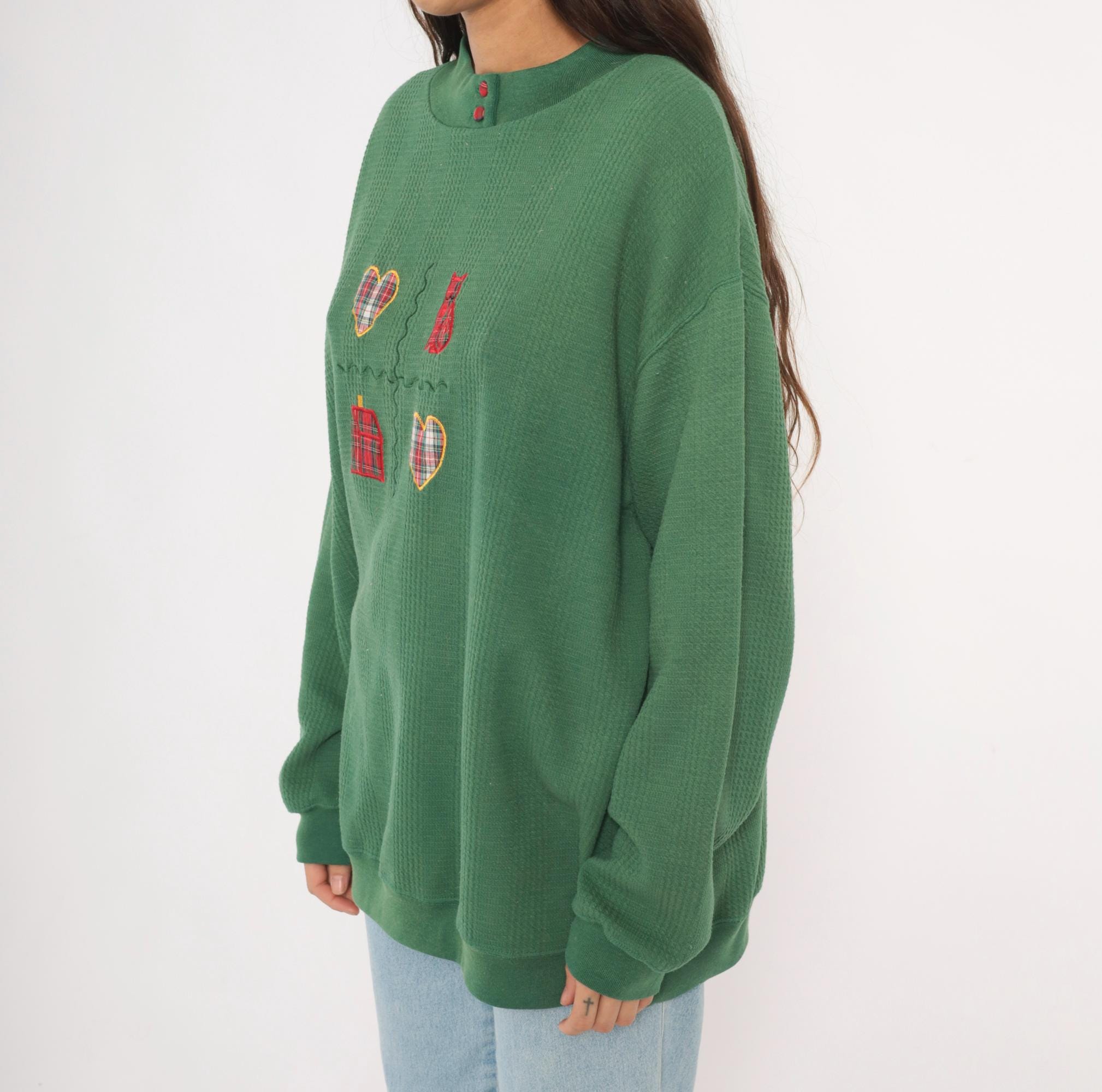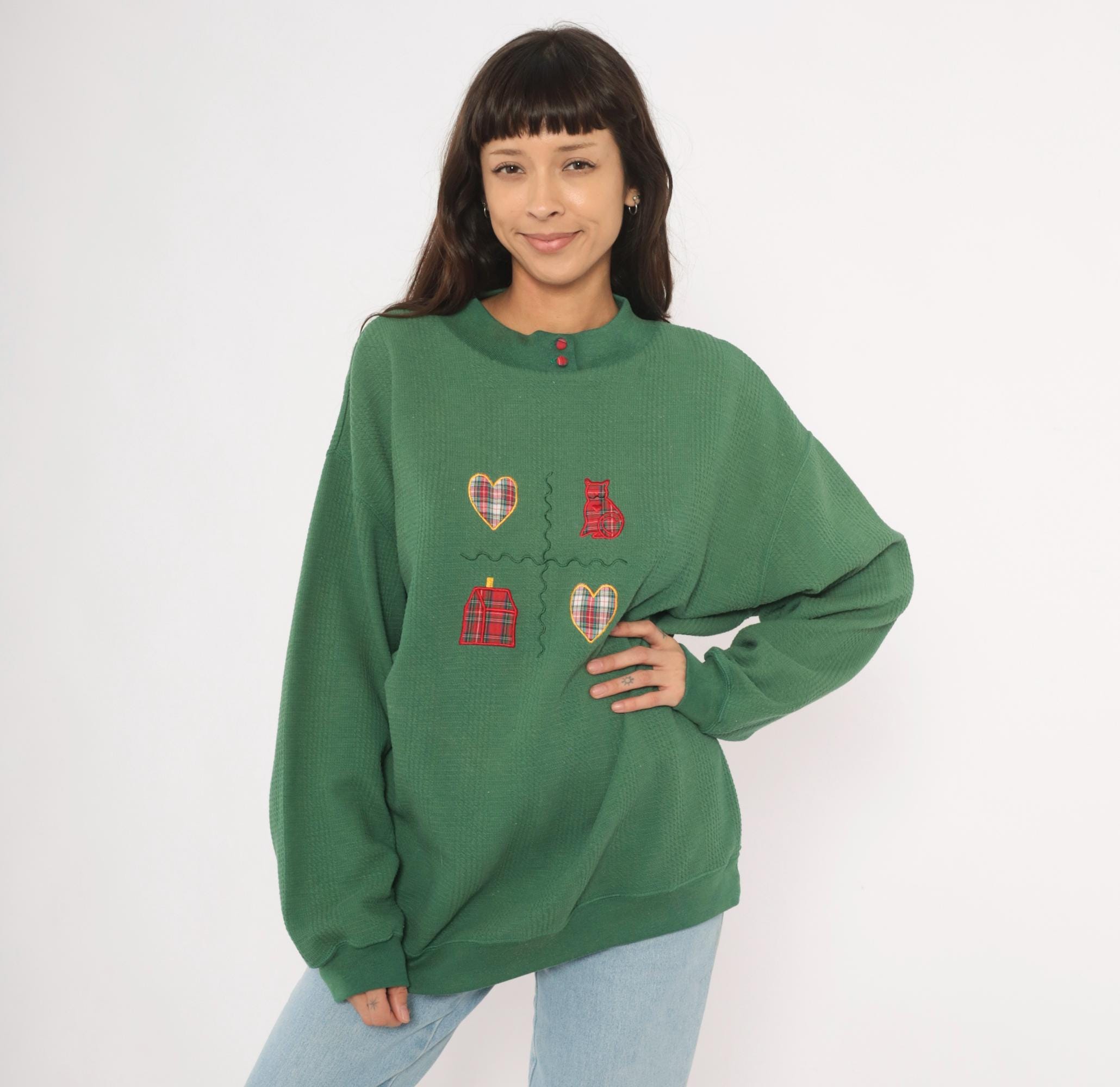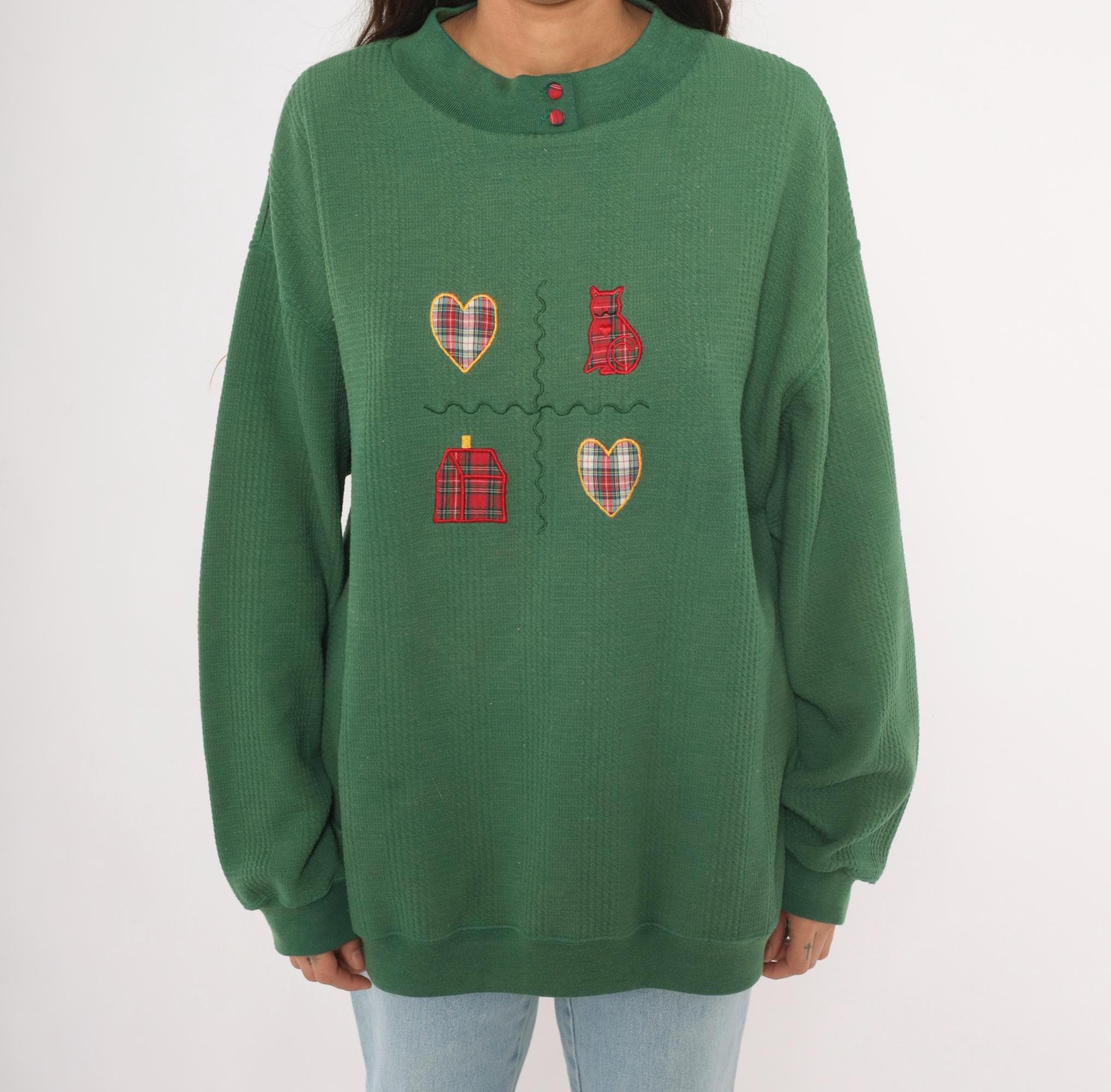 90s green waffle knit pullover from Sports Accent with plaid tartan appliqué patches arranged in a four-square grid on the front chest, separated by wavy embroidered stitching. The appliqué motifs include two hearts with gold embroidered outlines, a sitting cat, and a barn, all cut from red and navy tartan fabric. Mock neck collar with two small red buttons at the left side, ribbed cuffs and hem, and a relaxed boxy silhouette with dropped shoulders.
