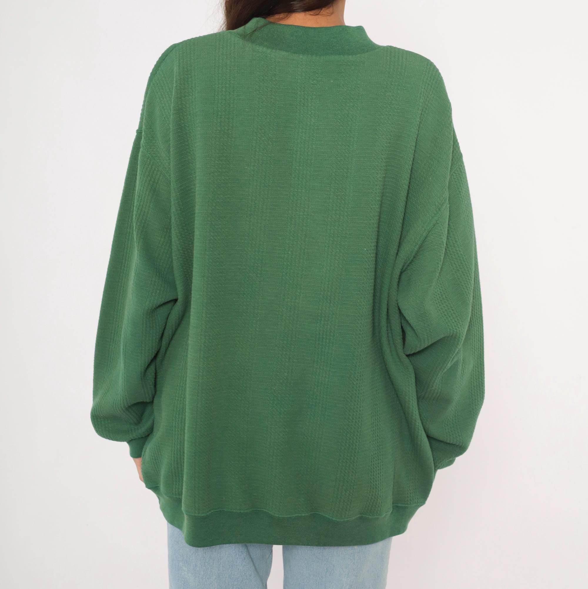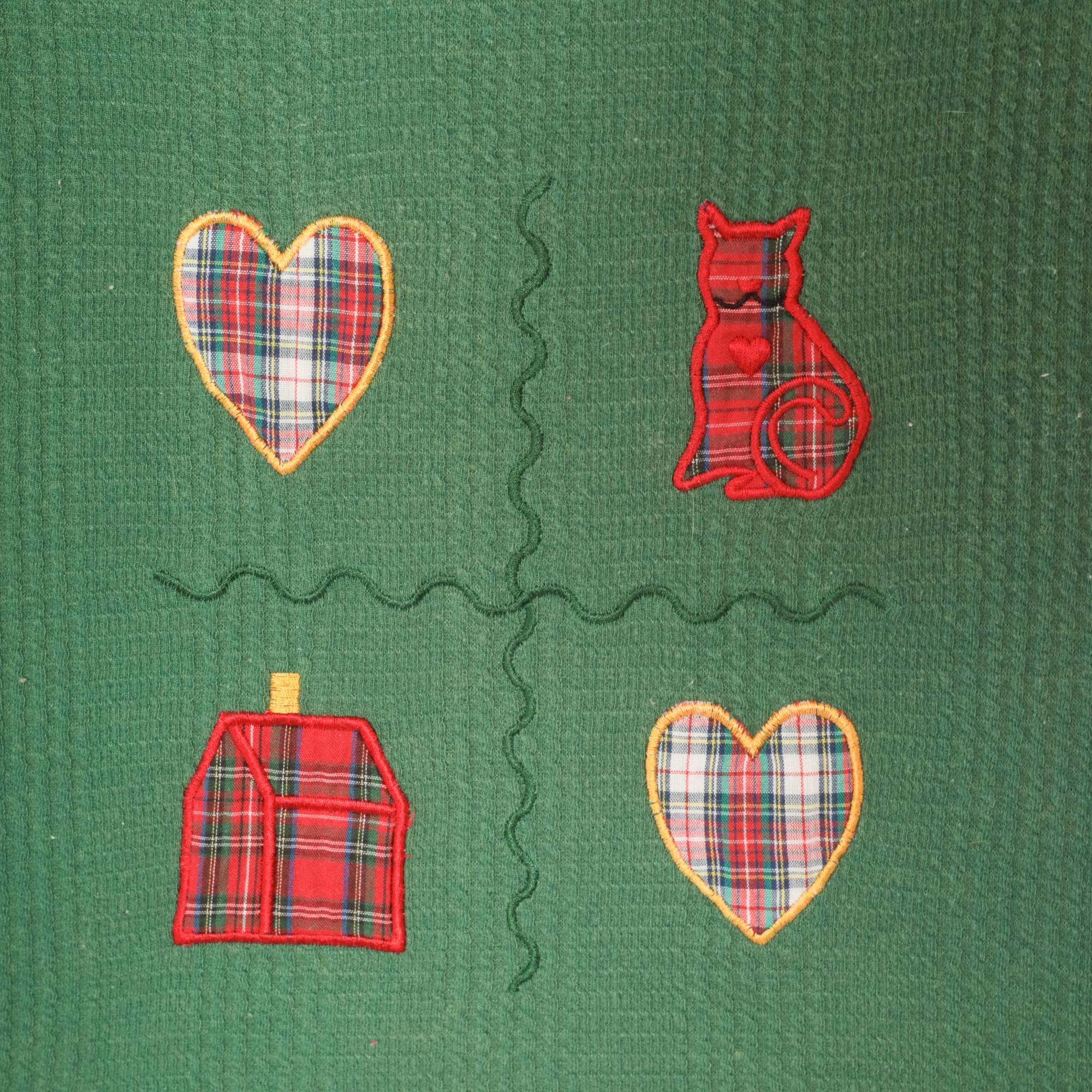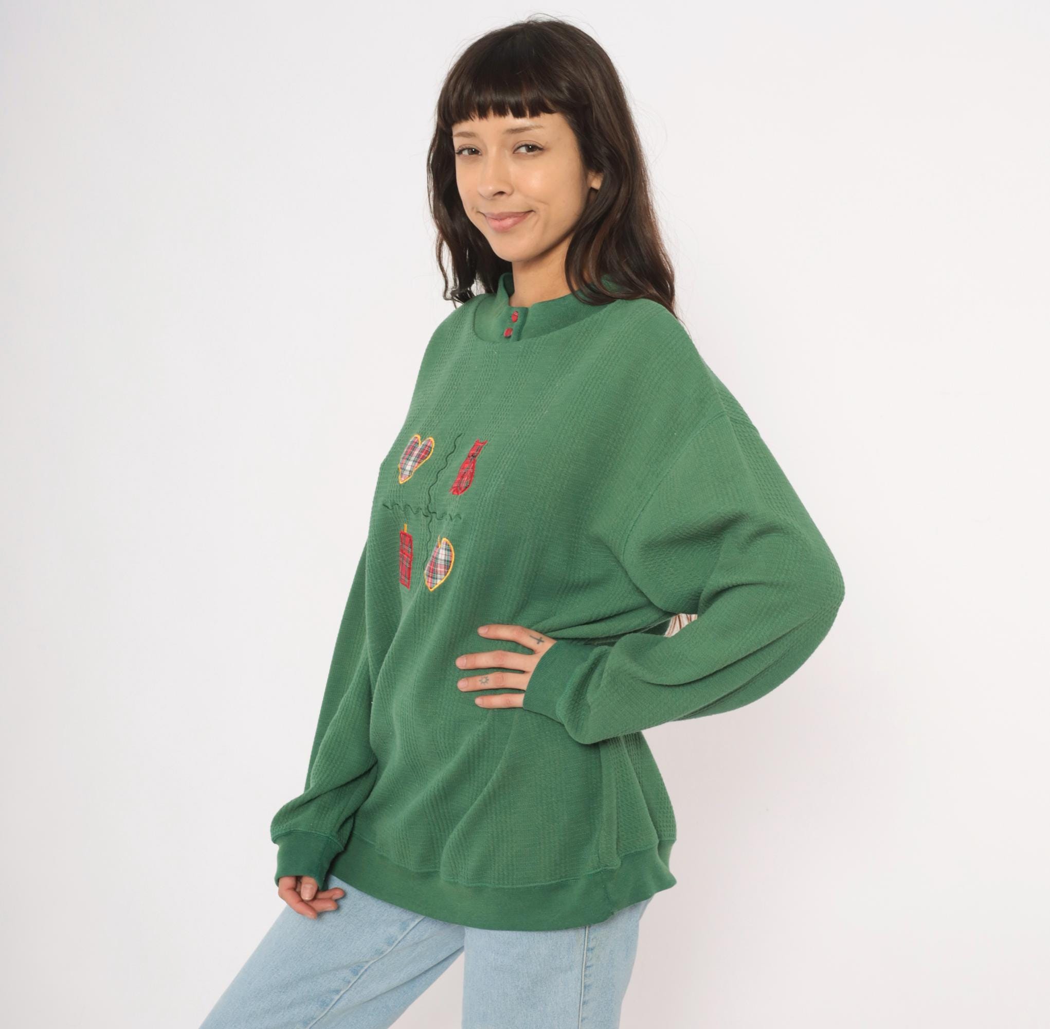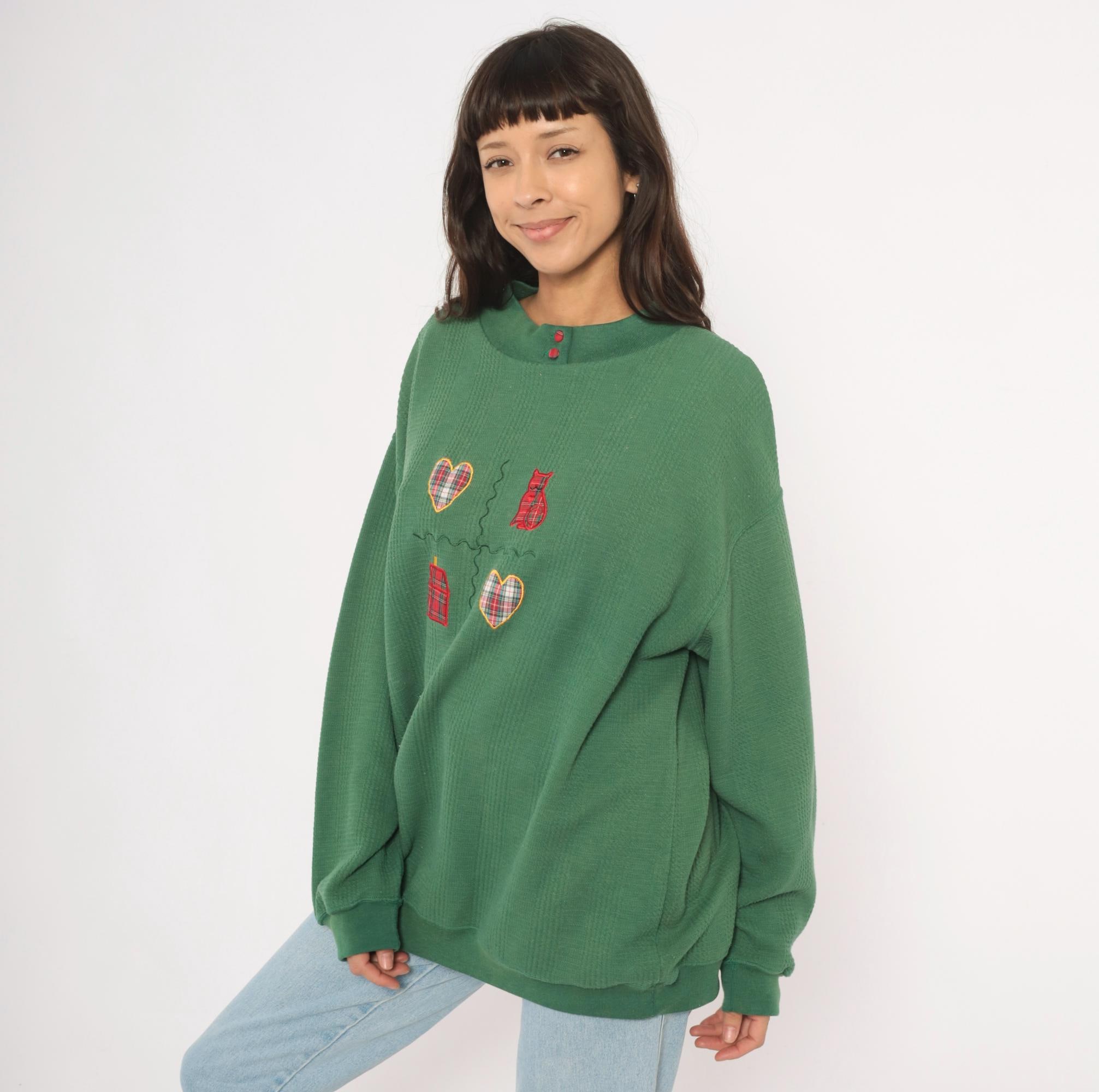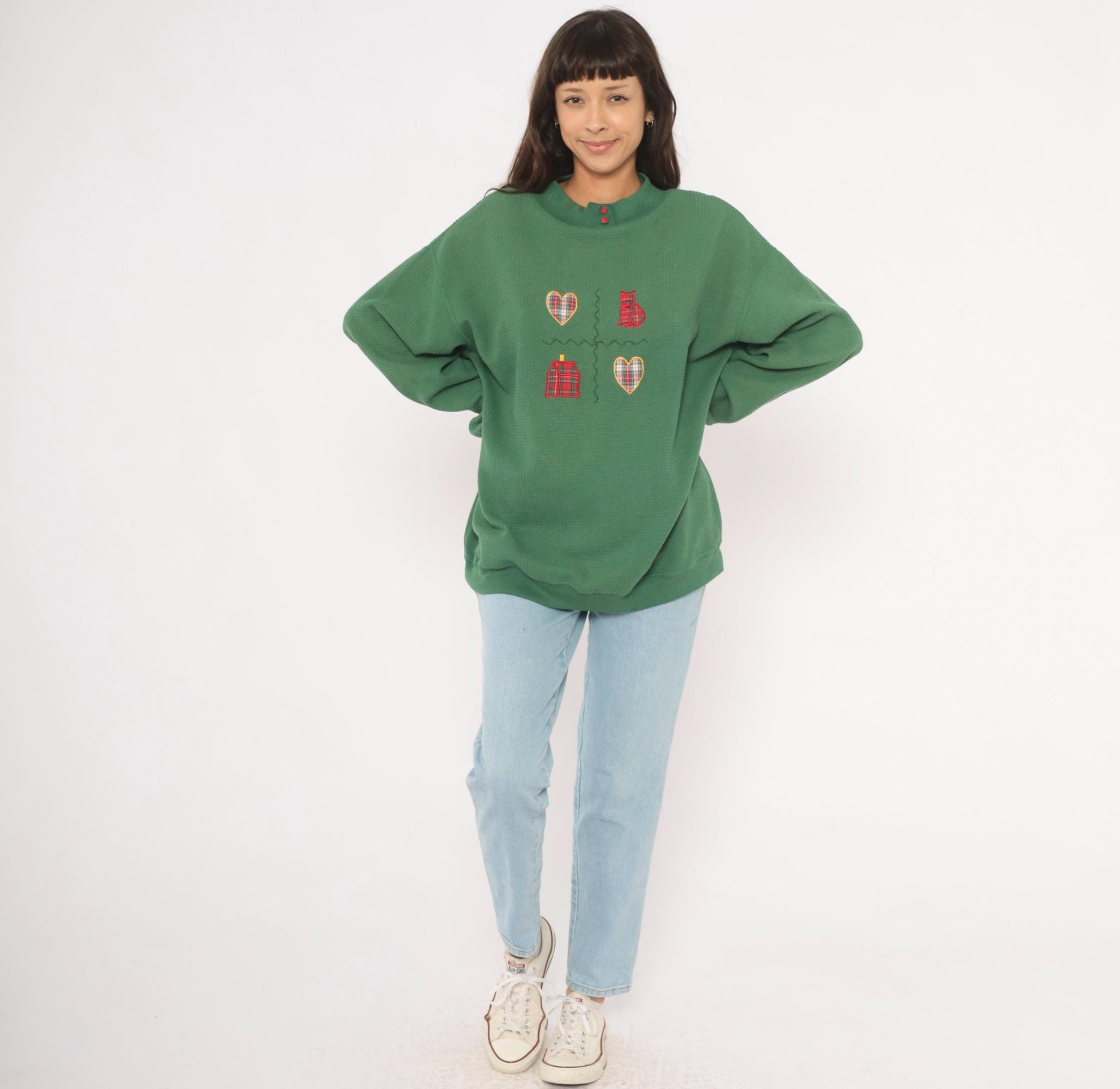90s green waffle knit pullover from Sports Accent with plaid tartan appliqué patches arranged in a four-square grid on the front chest, separated by wavy embroidered stitching. The appliqué motifs include two hearts with gold embroidered outlines, a sitting cat, and a barn, all cut from red and navy tartan fabric. Mock neck collar with two small red buttons at the left side, ribbed cuffs and hem, and a relaxed boxy silhouette with dropped shoulders.