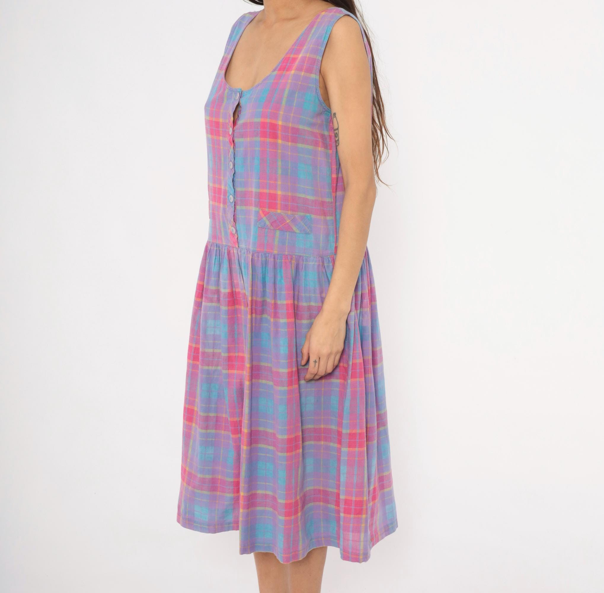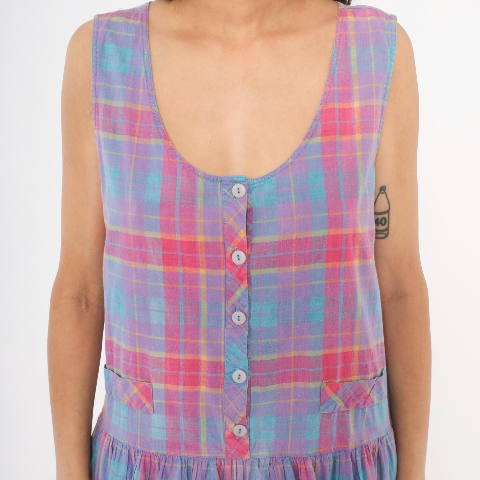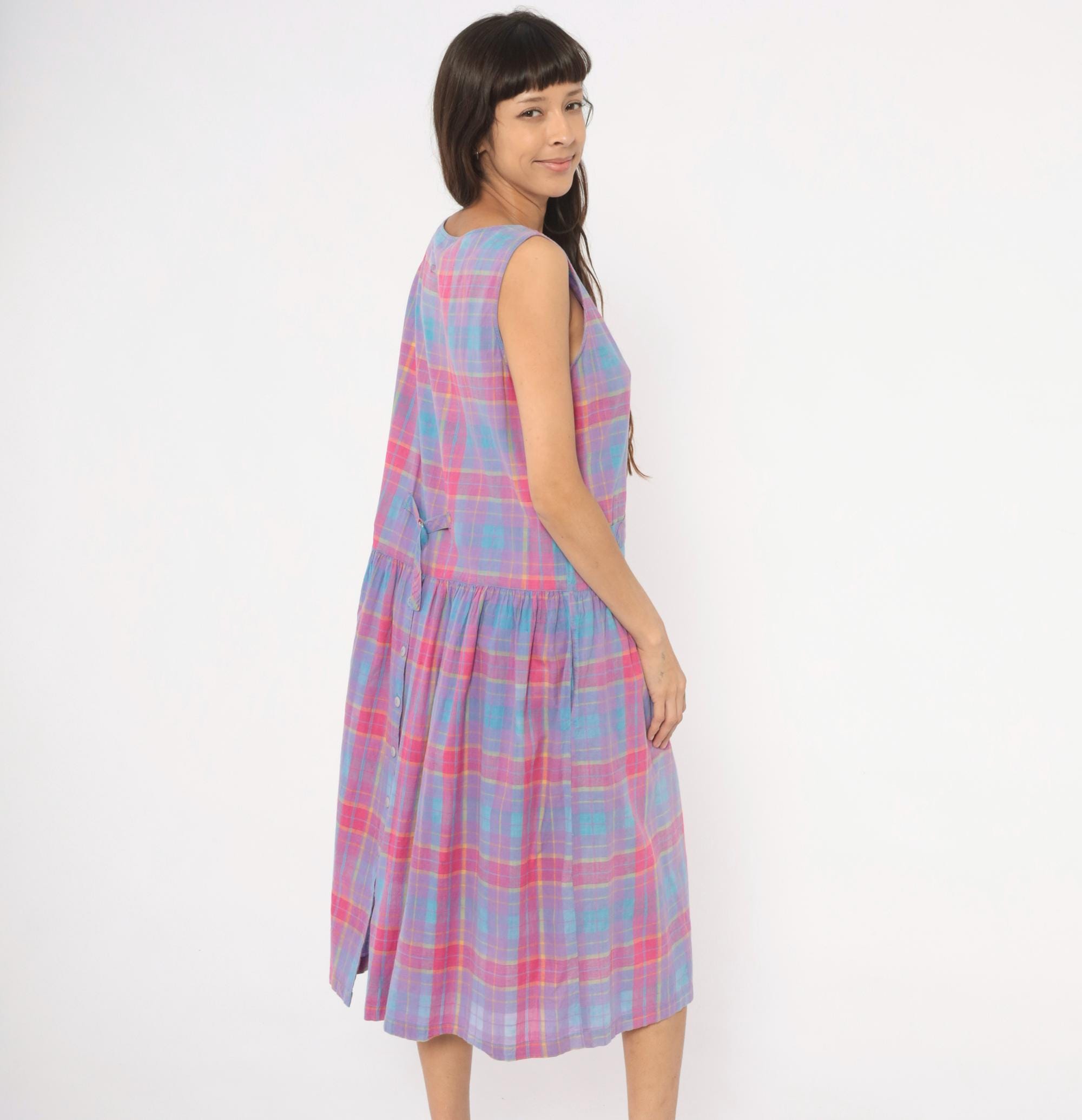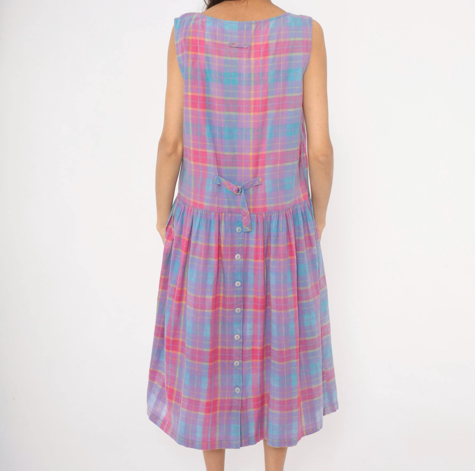 90s plaid sundress from Victoria in purple, pink, blue, and yellow madras check. Scoop neckline with button front closure on the bodice and button back closure along the gathered skirt, with a small cinch-back belt detail at the waist. Drop waist with two small patch pockets at the front, sleeveless construction, and a full gathered midi-length skirt.