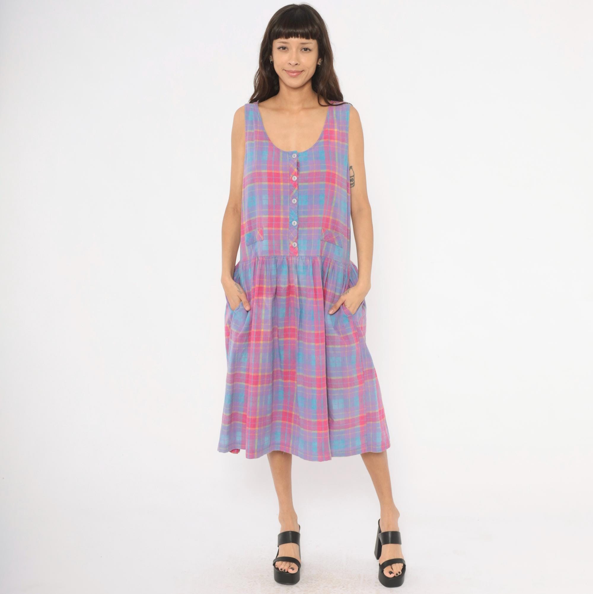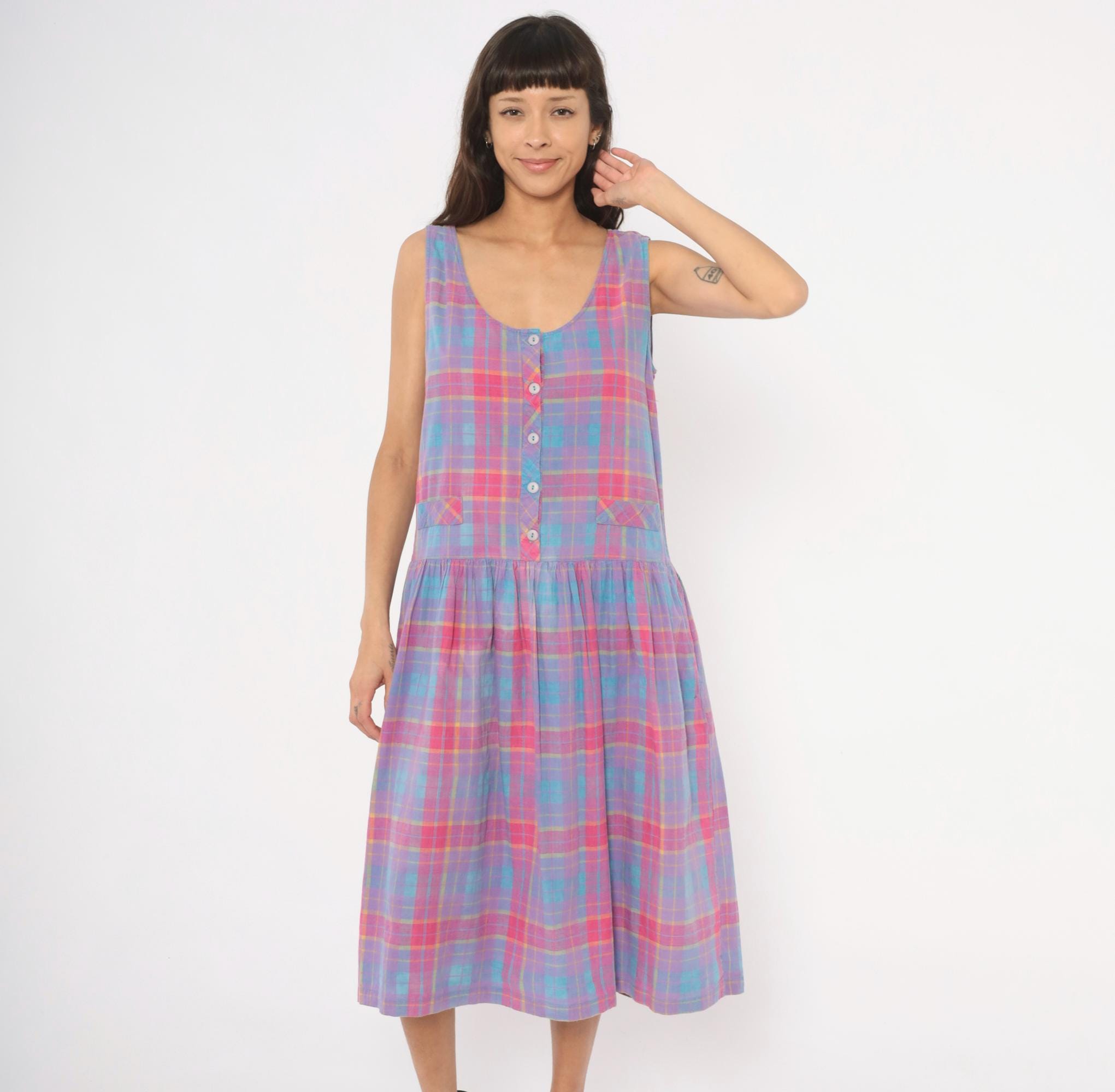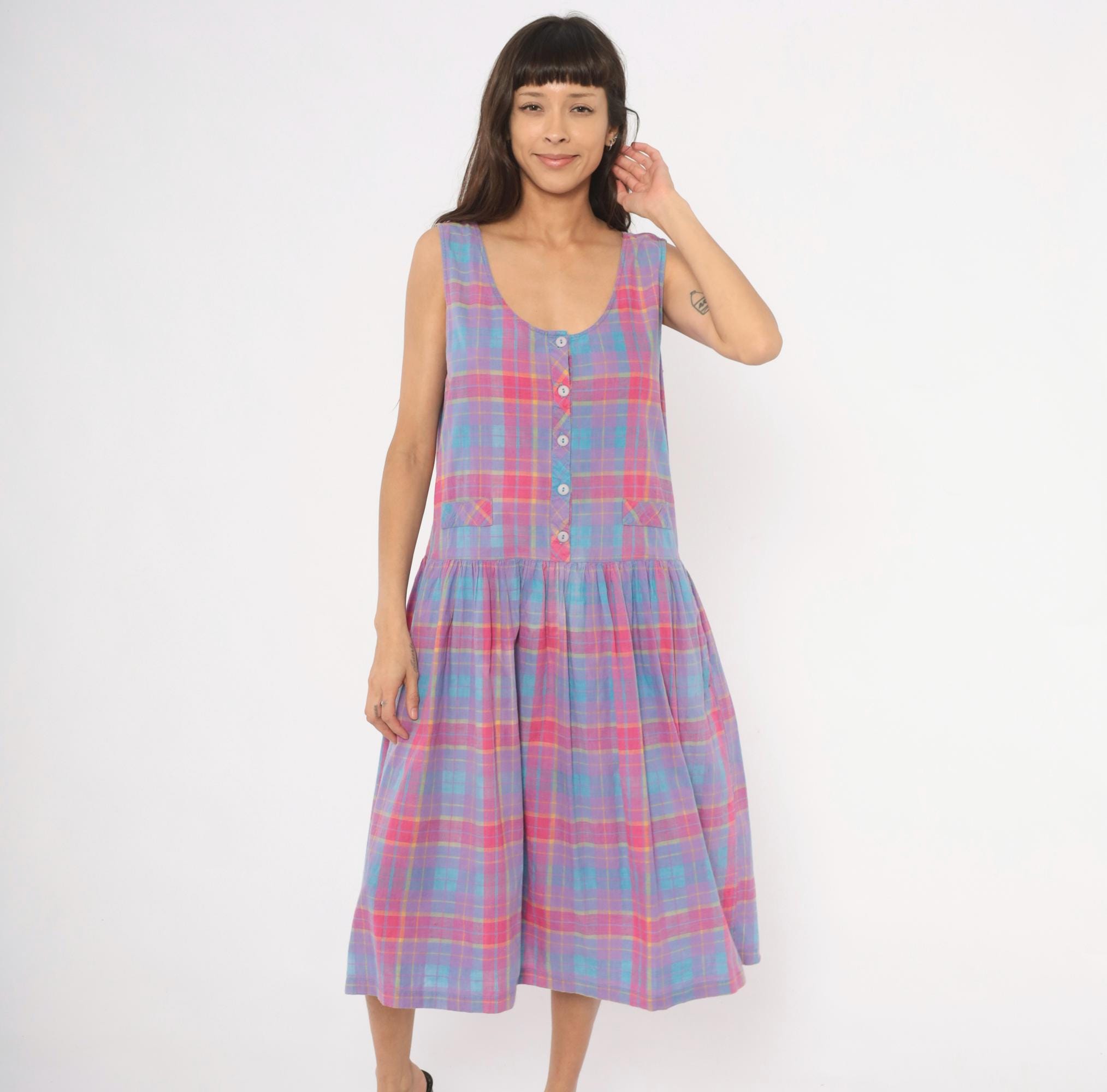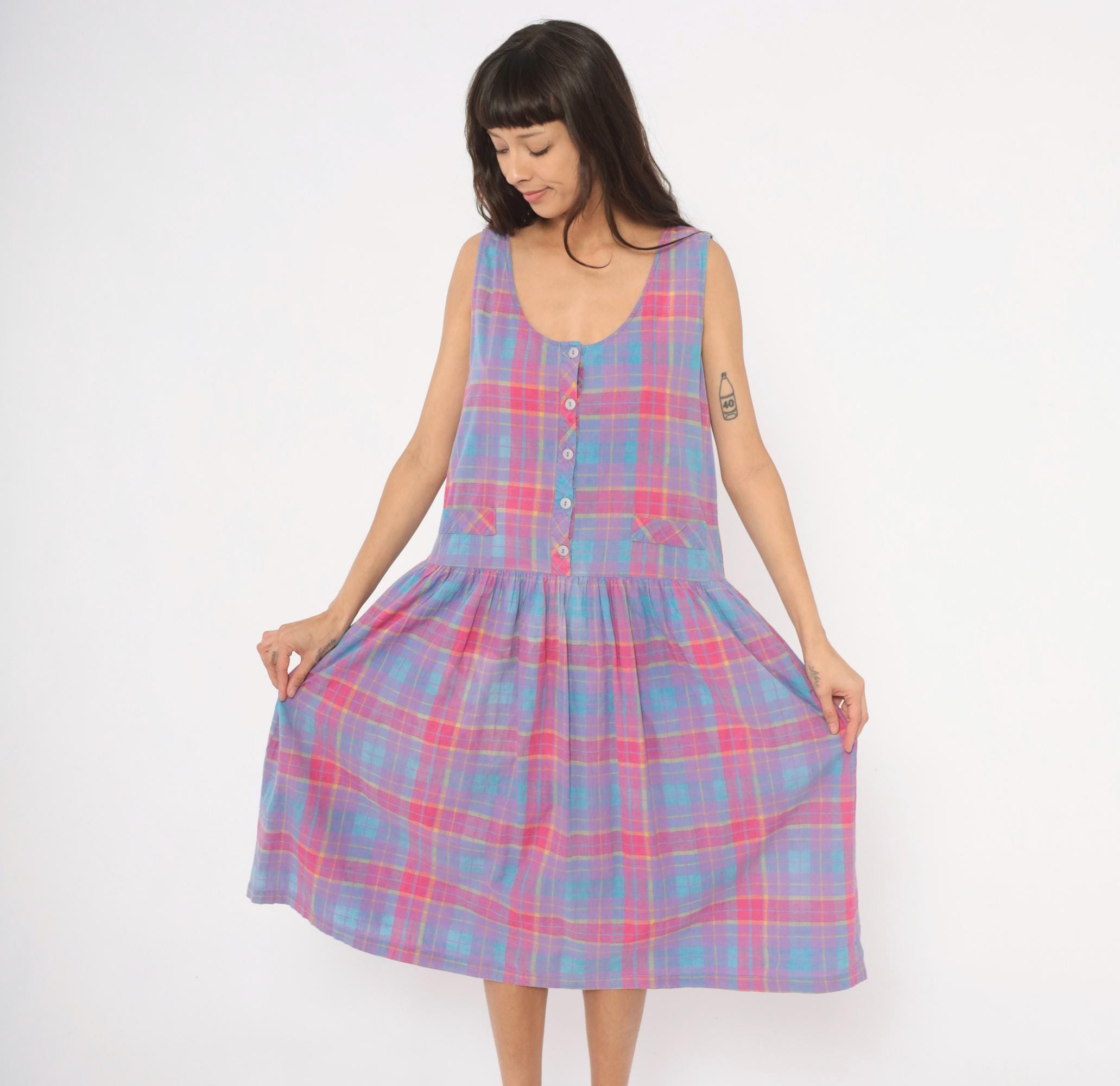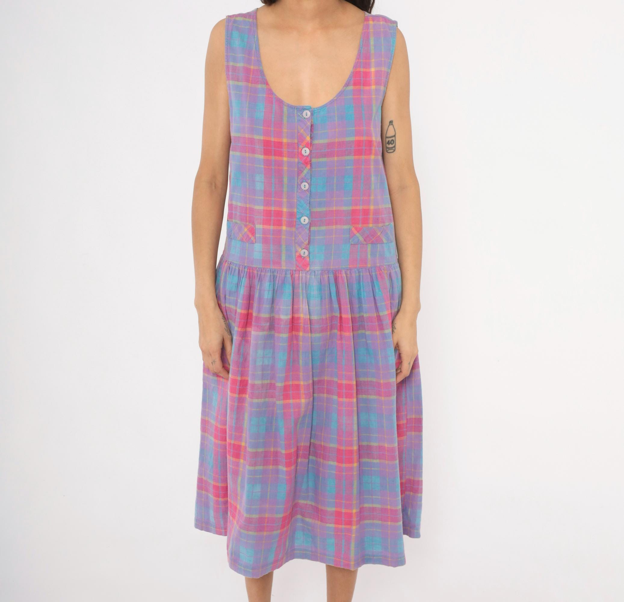 90s plaid sundress from Victoria in purple, pink, blue, and yellow madras check. Scoop neckline with button front closure on the bodice and button back closure along the gathered skirt, with a small cinch-back belt detail at the waist. Drop waist with two small patch pockets at the front, sleeveless construction, and a full gathered midi-length skirt.