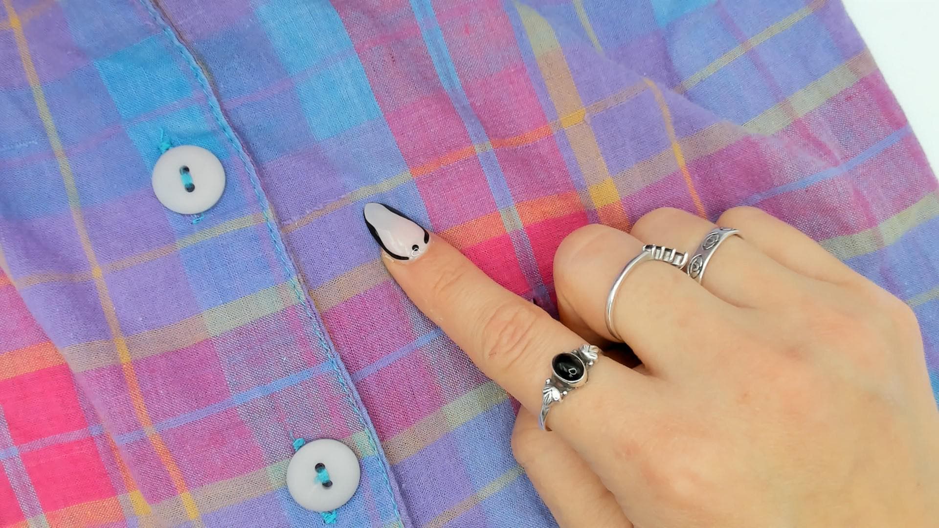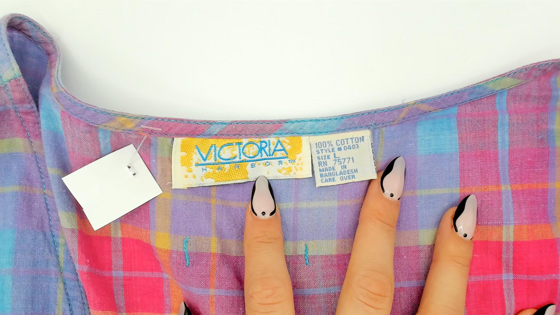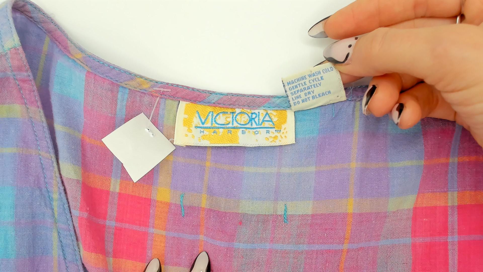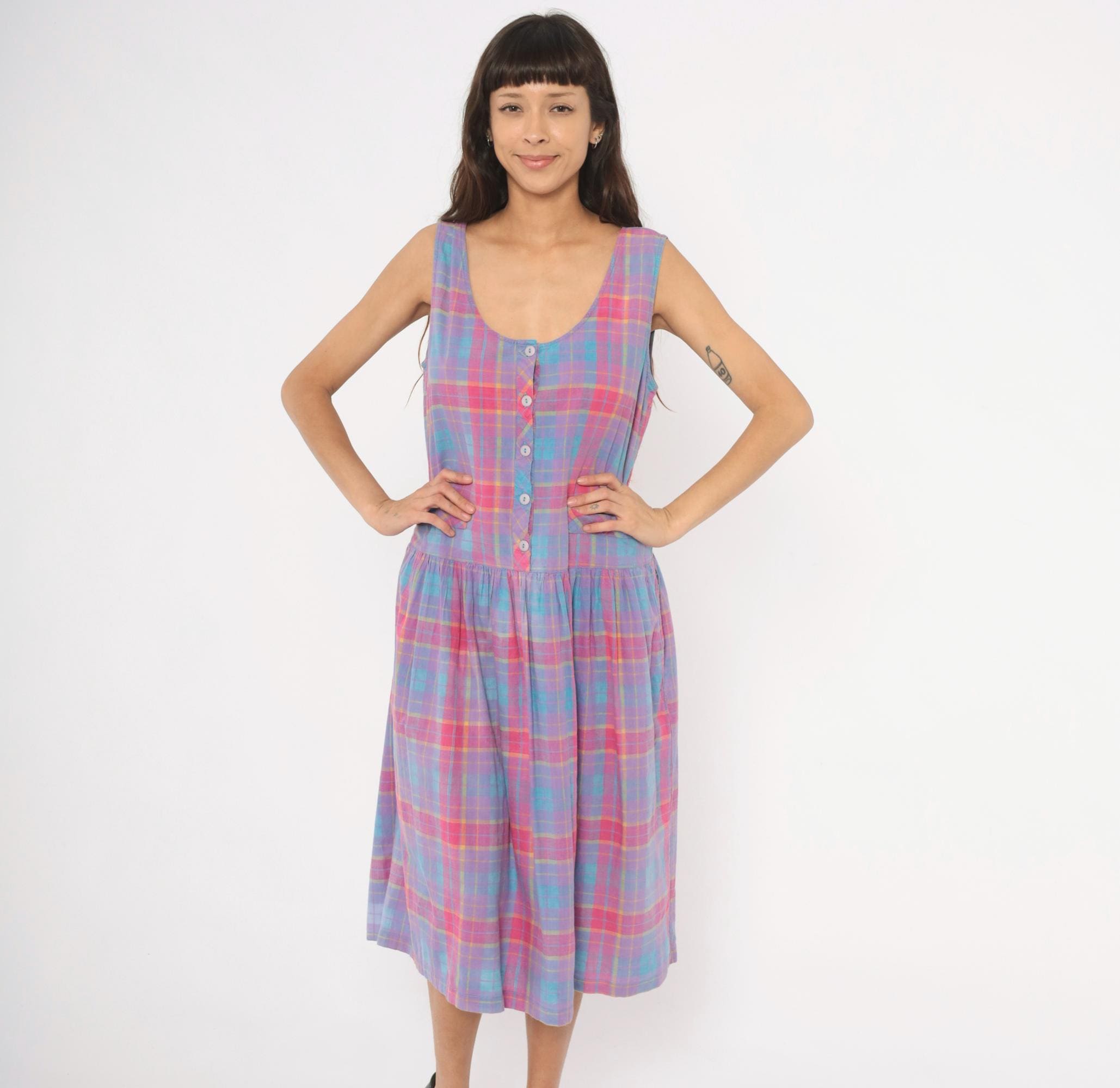 90s plaid sundress from Victoria in purple, pink, blue, and yellow madras check. Scoop neckline with button front closure on the bodice and button back closure along the gathered skirt, with a small cinch-back belt detail at the waist. Drop waist with two small patch pockets at the front, sleeveless construction, and a full gathered midi-length skirt.