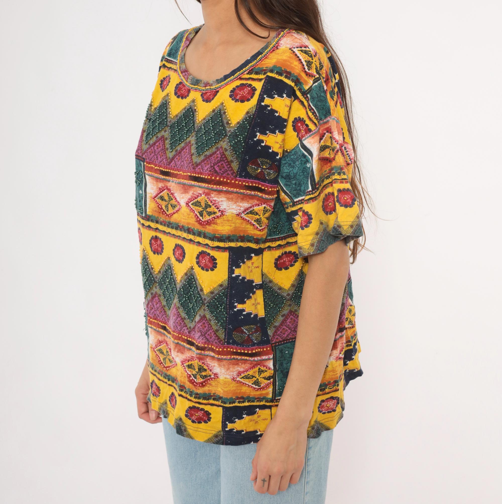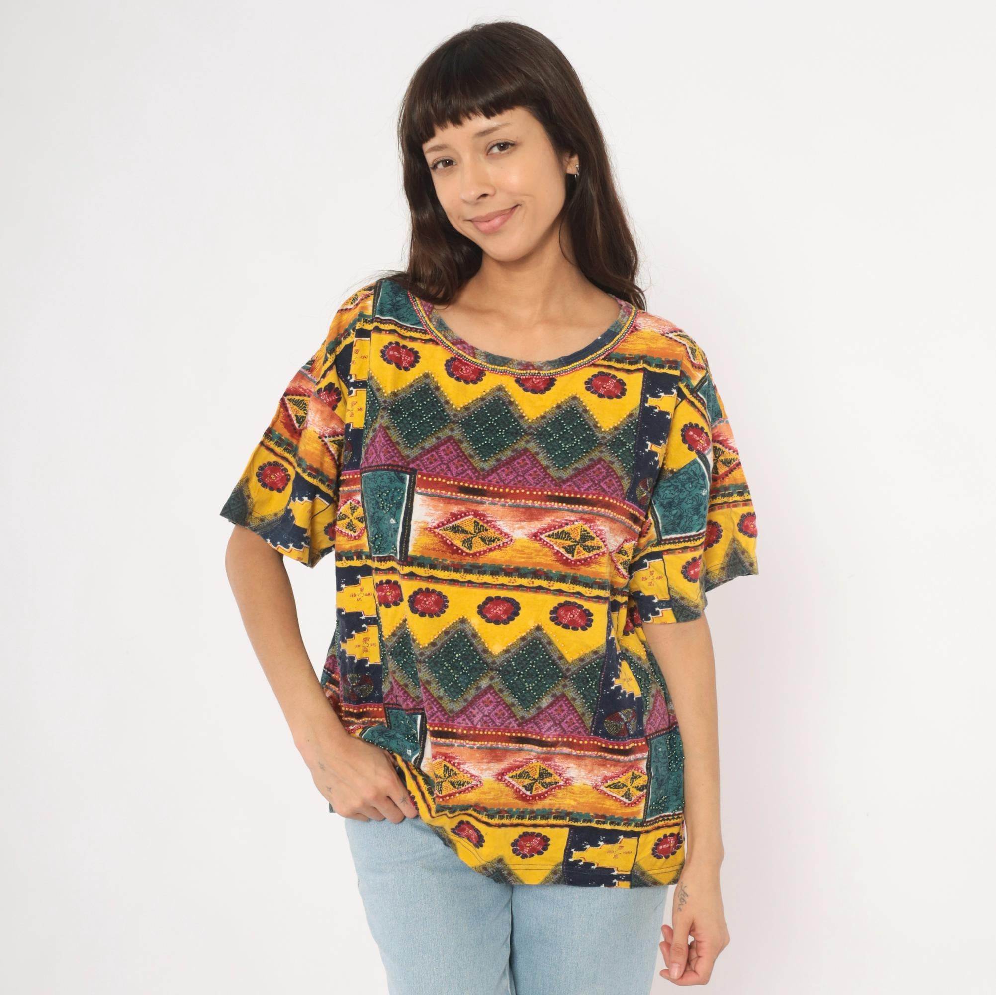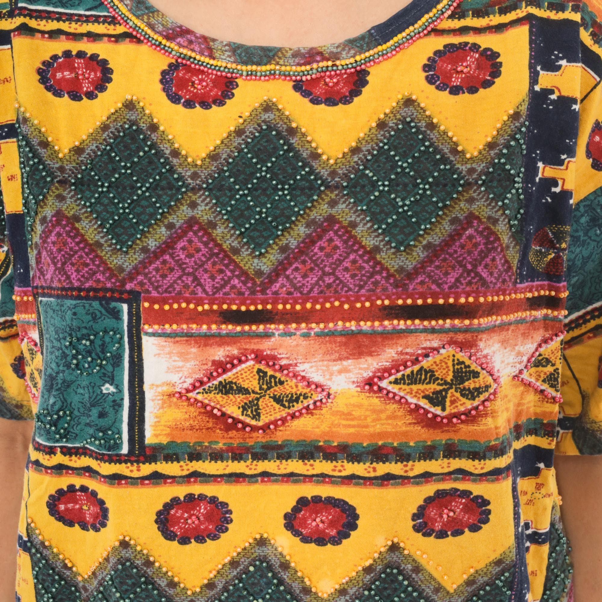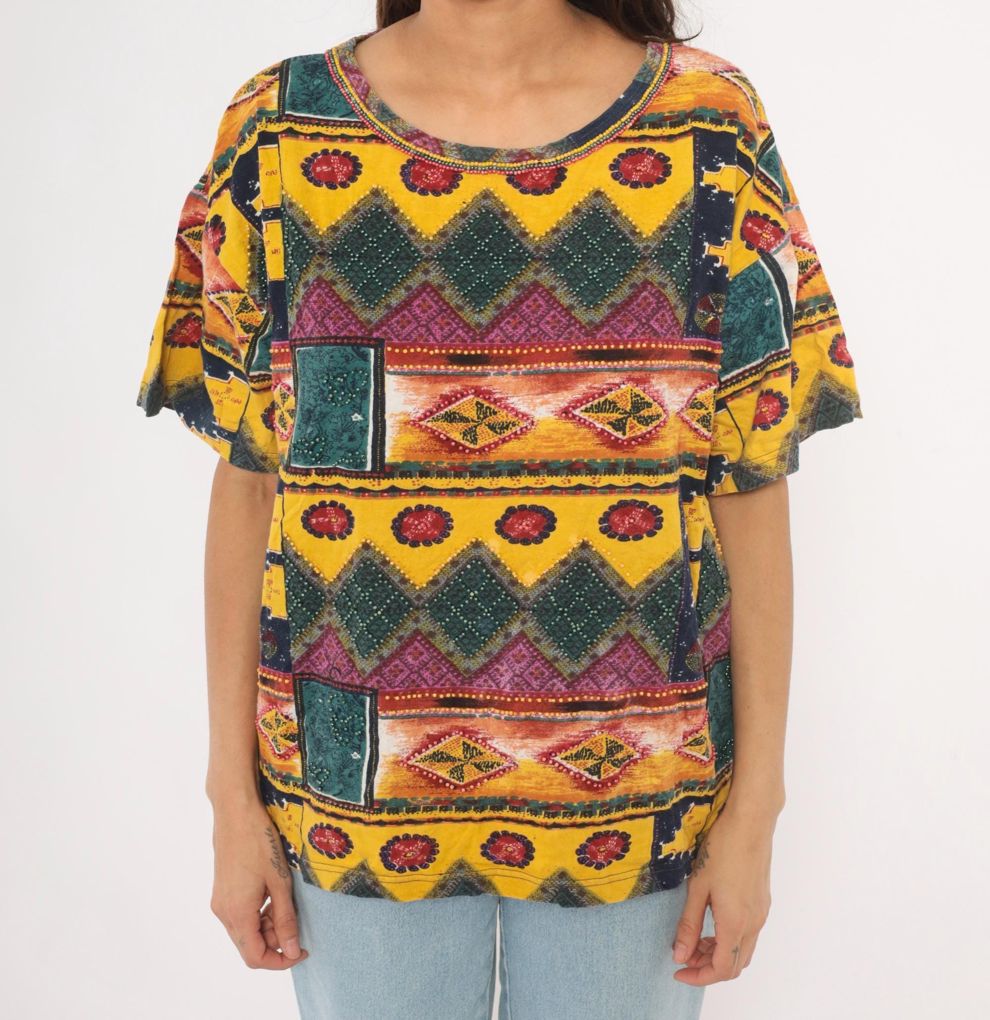90s all-over printed cotton tee from Gee J with horizontal bands of Southwestern-inspired geometric motifs, zigzag patterns, diamond shapes, and floral medallions in mustard yellow, teal green, magenta, red, navy, and orange. Relaxed boxy silhouette with a scoop neckline trimmed in multicolor beaded detailing, short sleeves, and pullover construction. Patchwork-style layout with scattered rectangular panels and layered tribal-inspired patterns across the front and back.