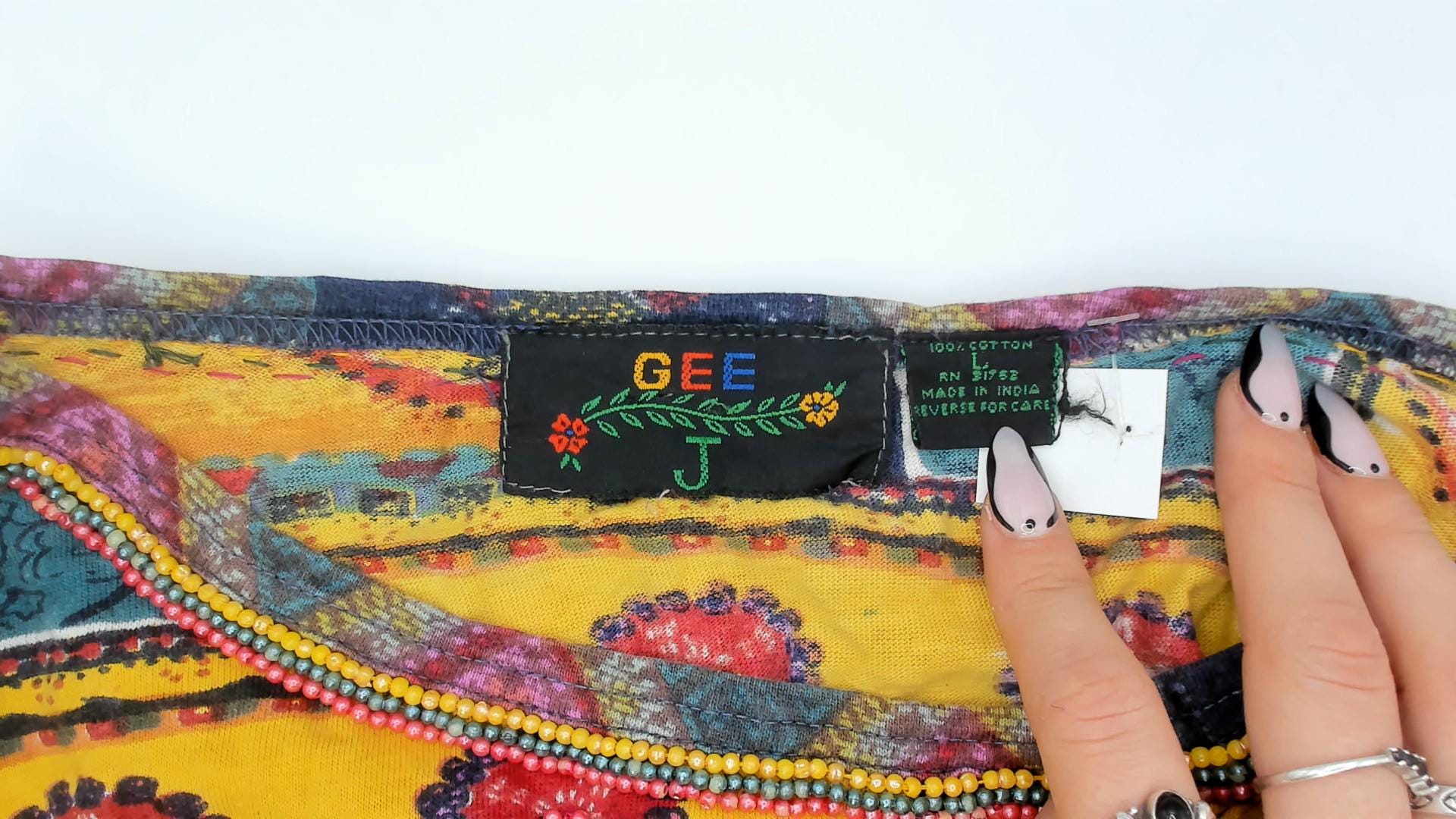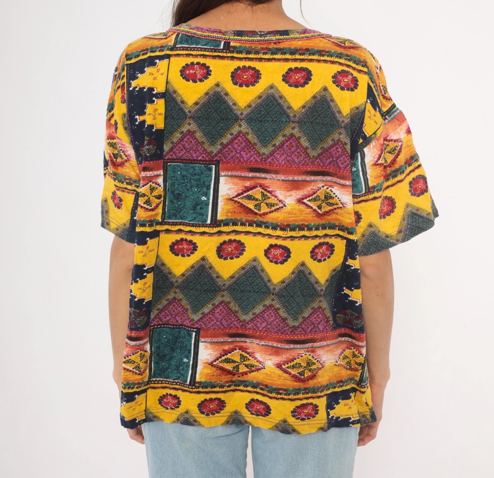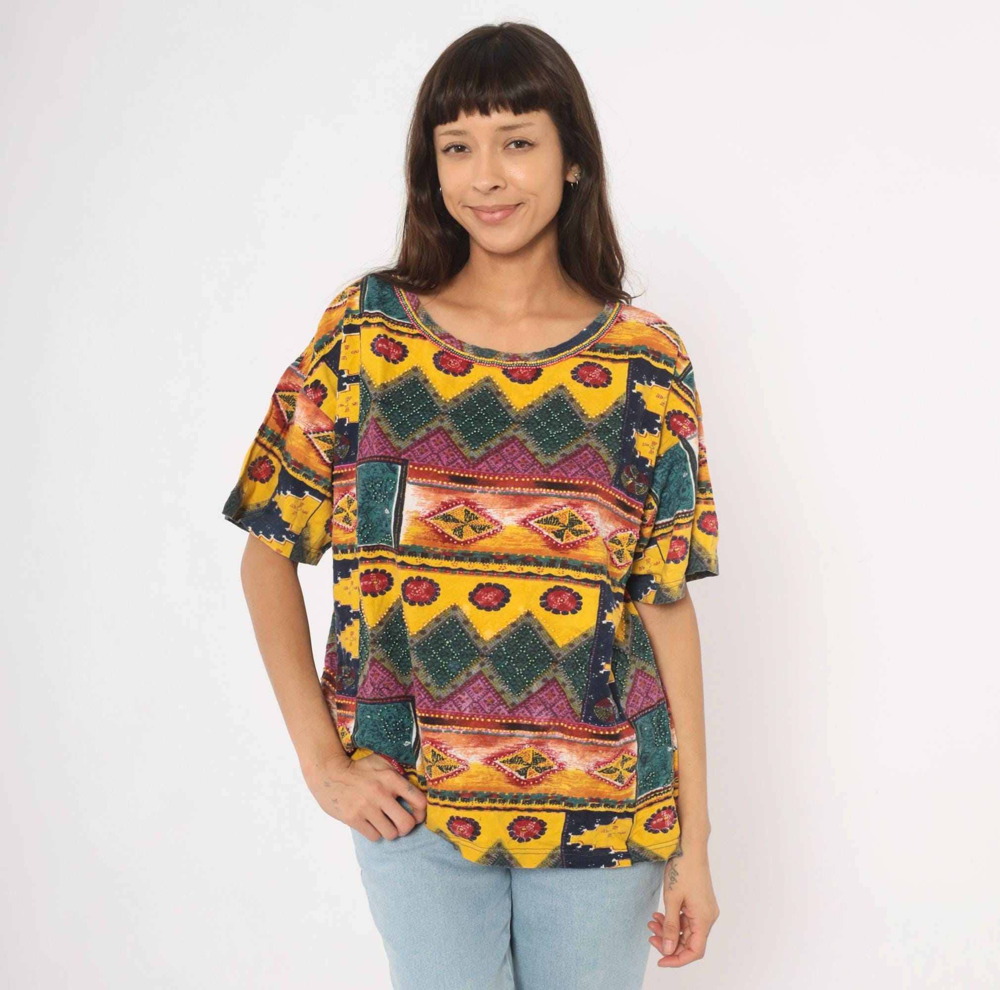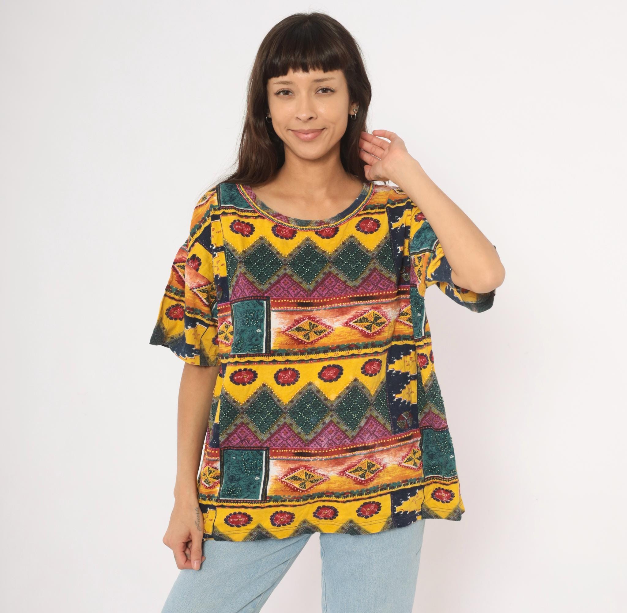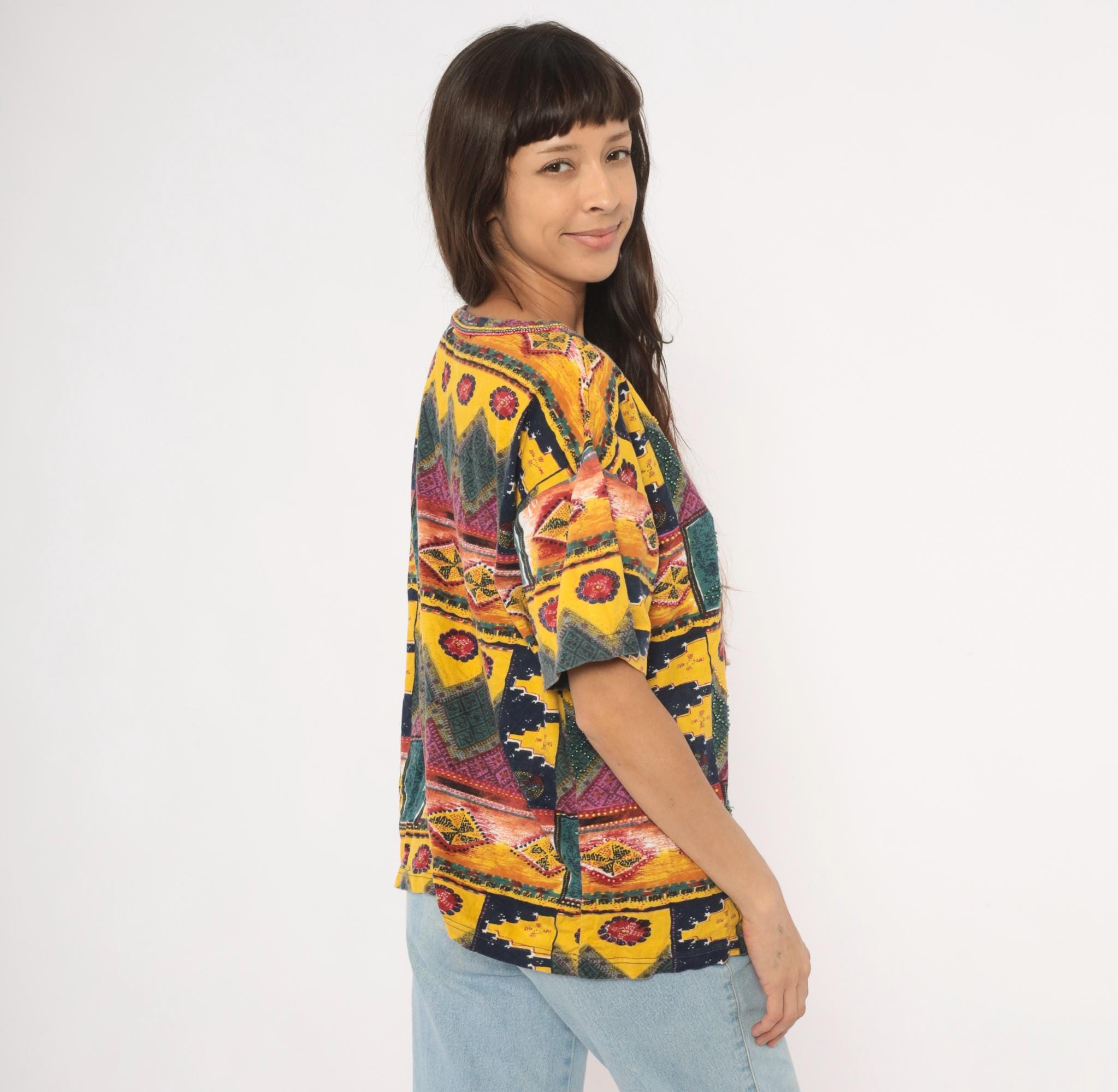 90s all-over printed cotton tee from Gee J with horizontal bands of Southwestern-inspired geometric motifs, zigzag patterns, diamond shapes, and floral medallions in mustard yellow, teal green, magenta, red, navy, and orange. Relaxed boxy silhouette with a scoop neckline trimmed in multicolor beaded detailing, short sleeves, and pullover construction. Patchwork-style layout with scattered rectangular panels and layered tribal-inspired patterns across the front and back.