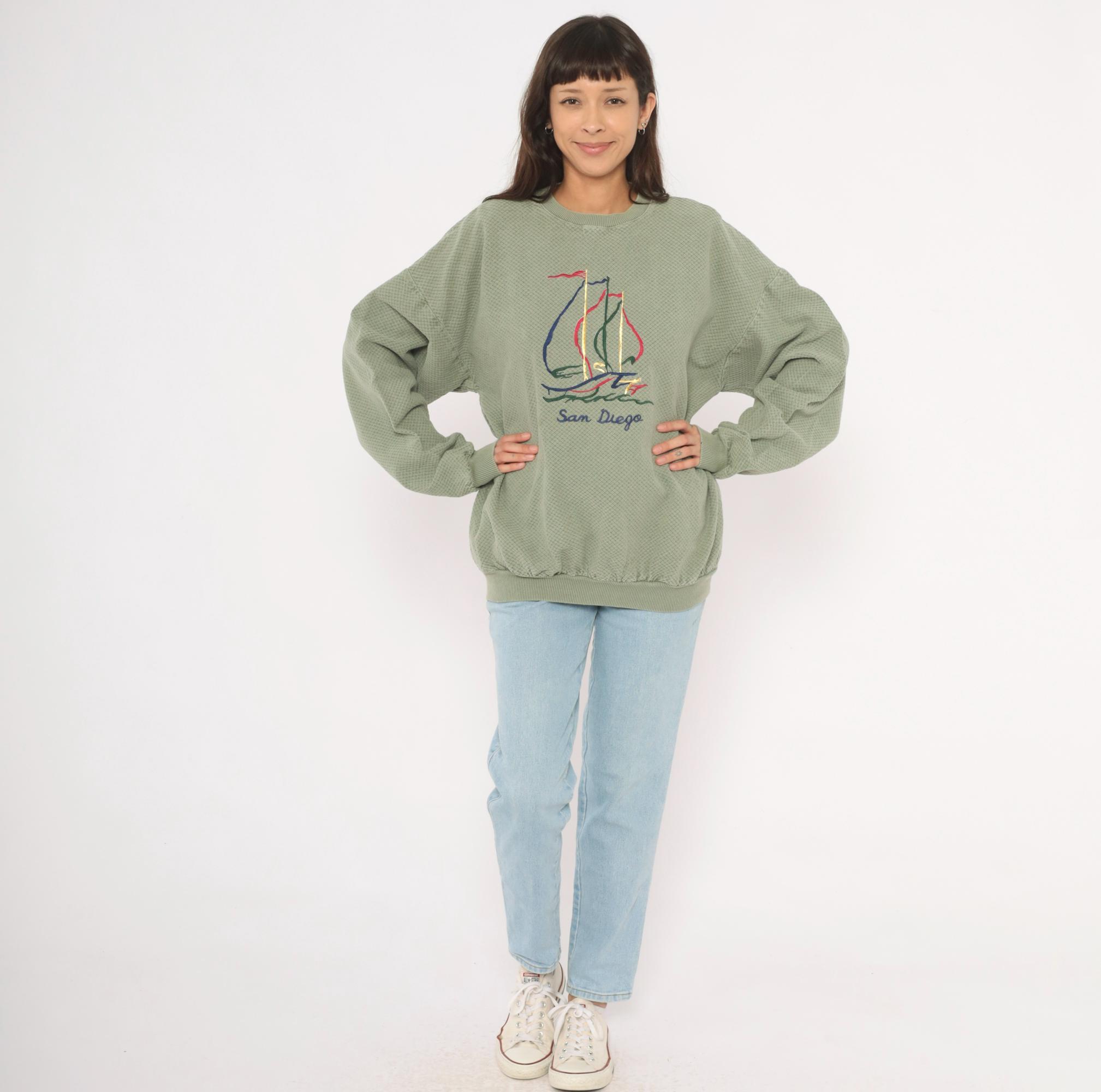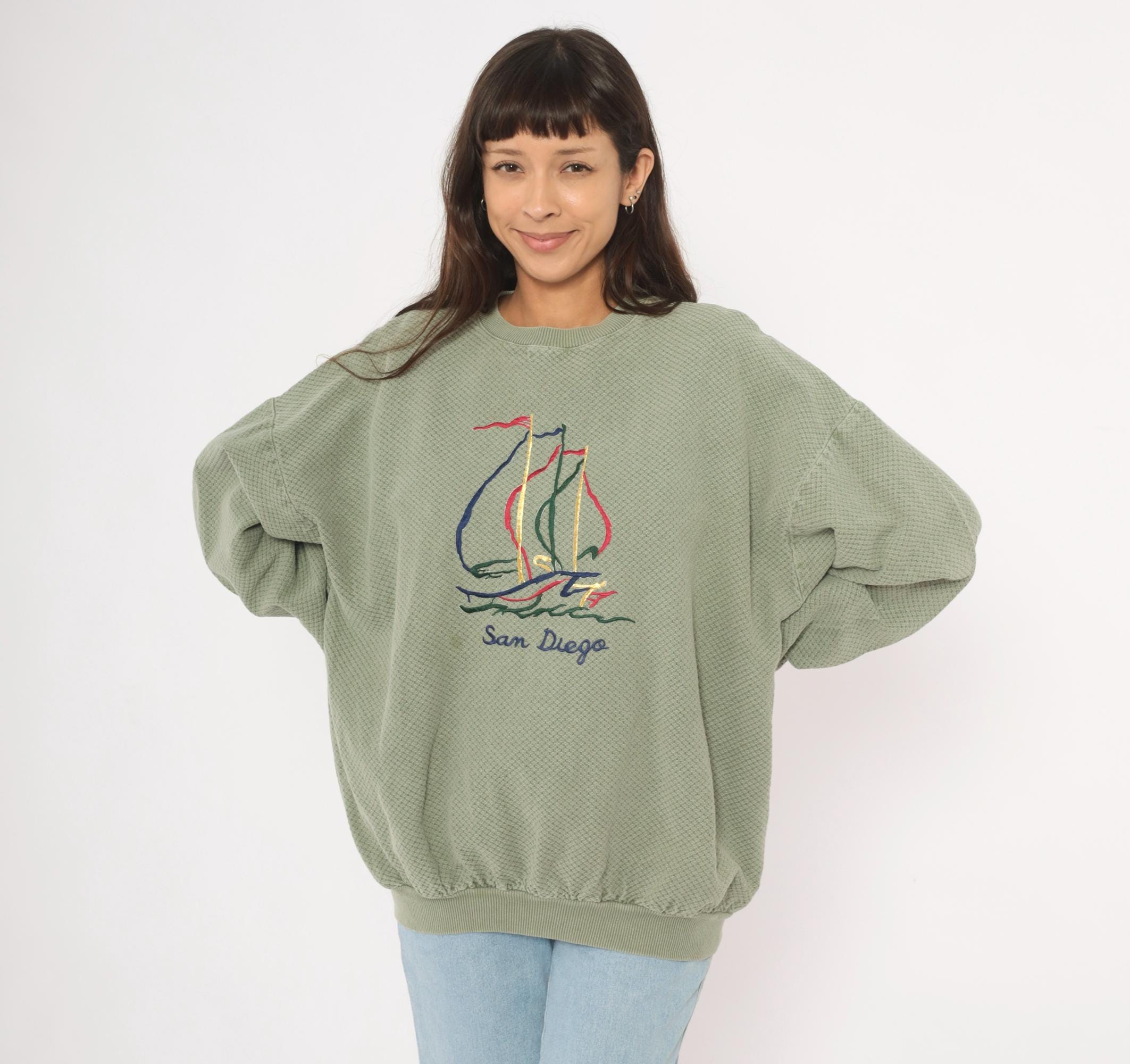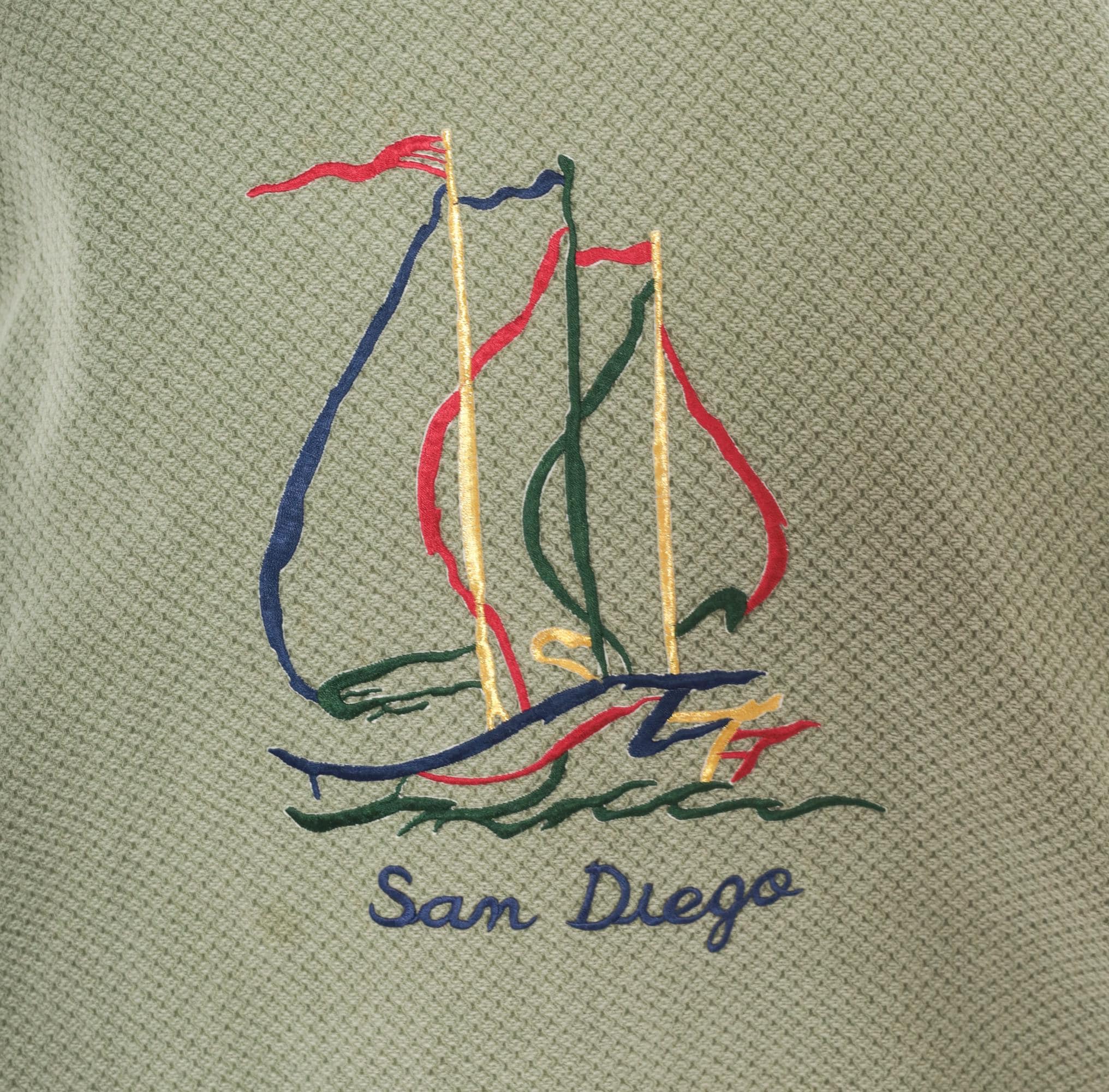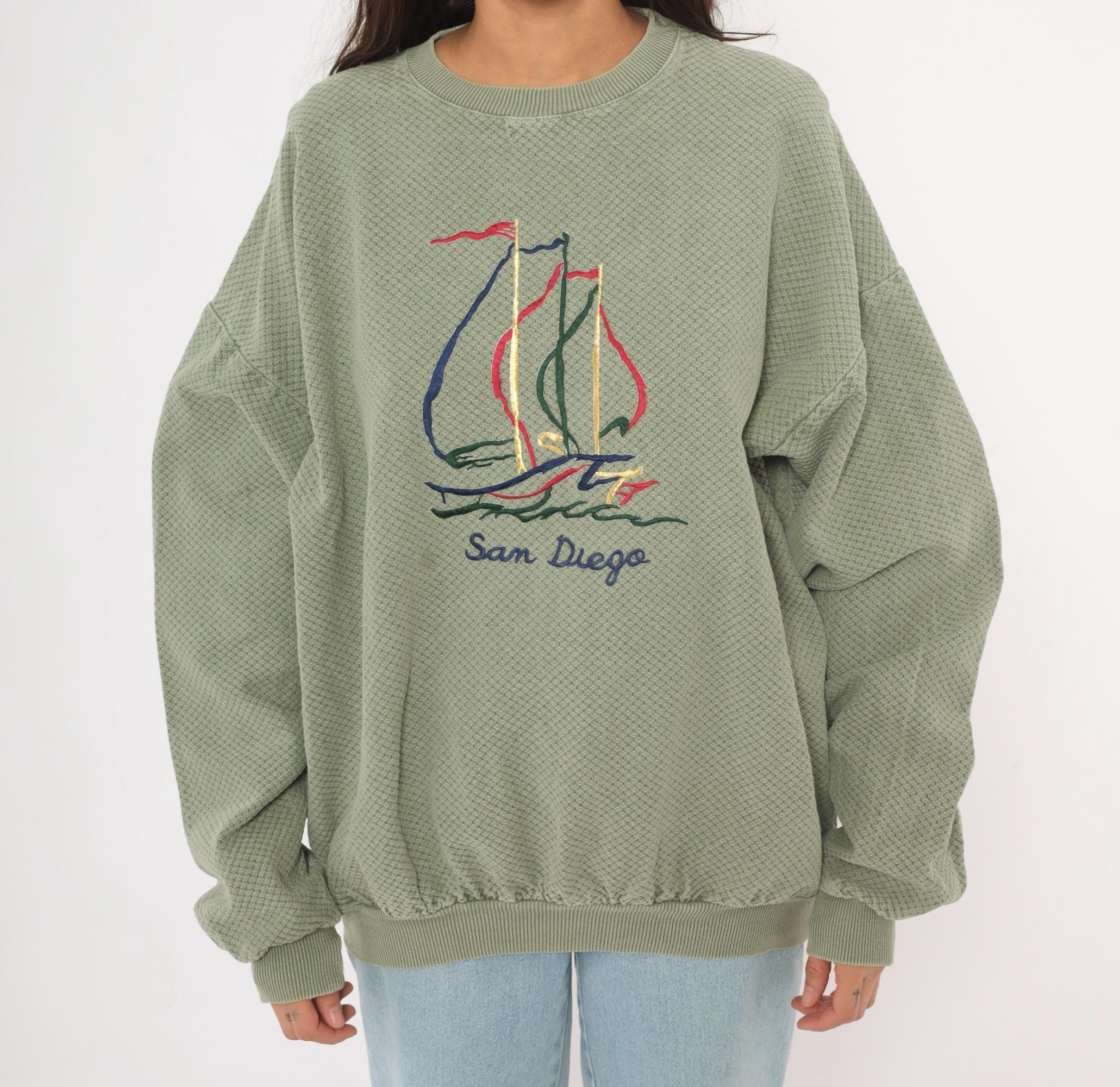 90s olive green waffle-knit crewneck sweatshirt with multicolor embroidered sailboat graphic and "San Diego" script across the chest. Navy, red, forest green, and gold metallic thread form an abstract sailing scene with waves beneath. Ribbed crew neckline, ribbed cuffs, and ribbed banded hem with a relaxed, boxy silhouette throughout the body and sleeves.