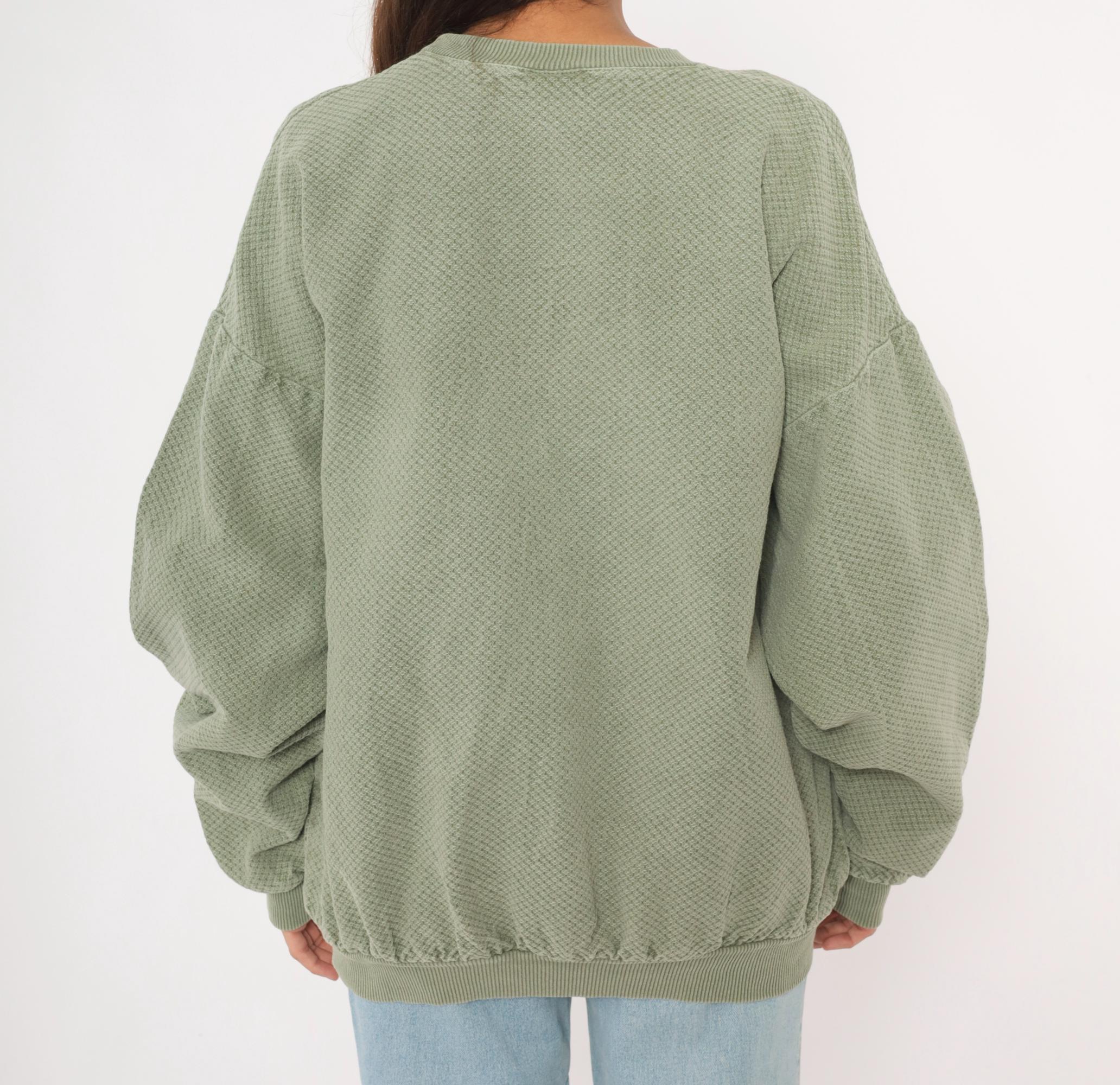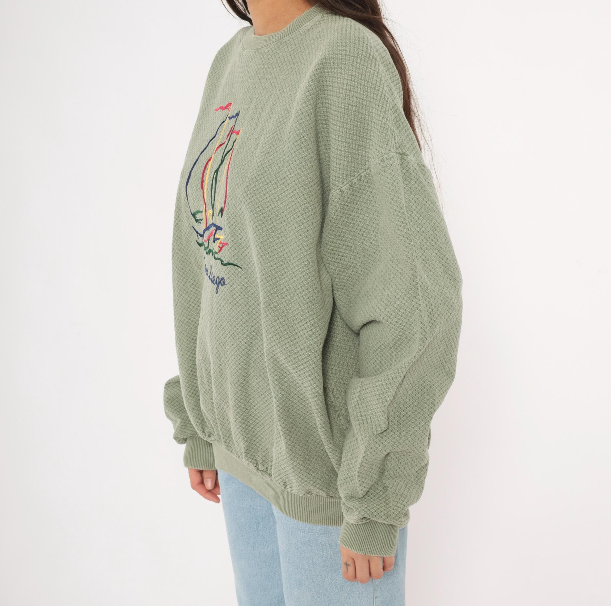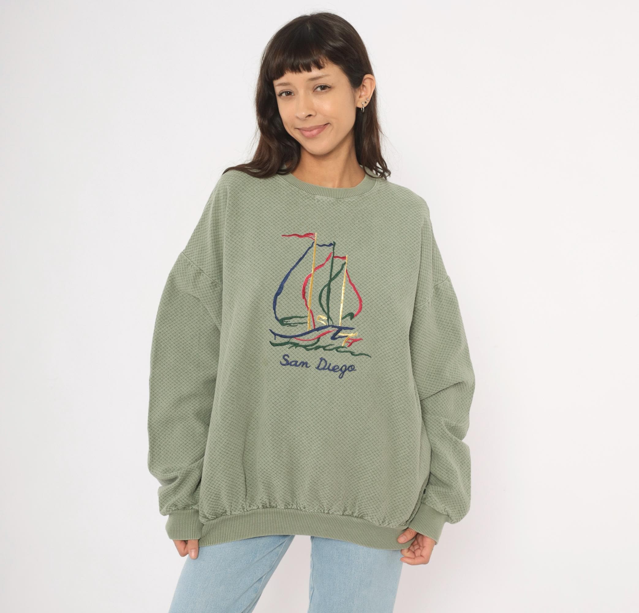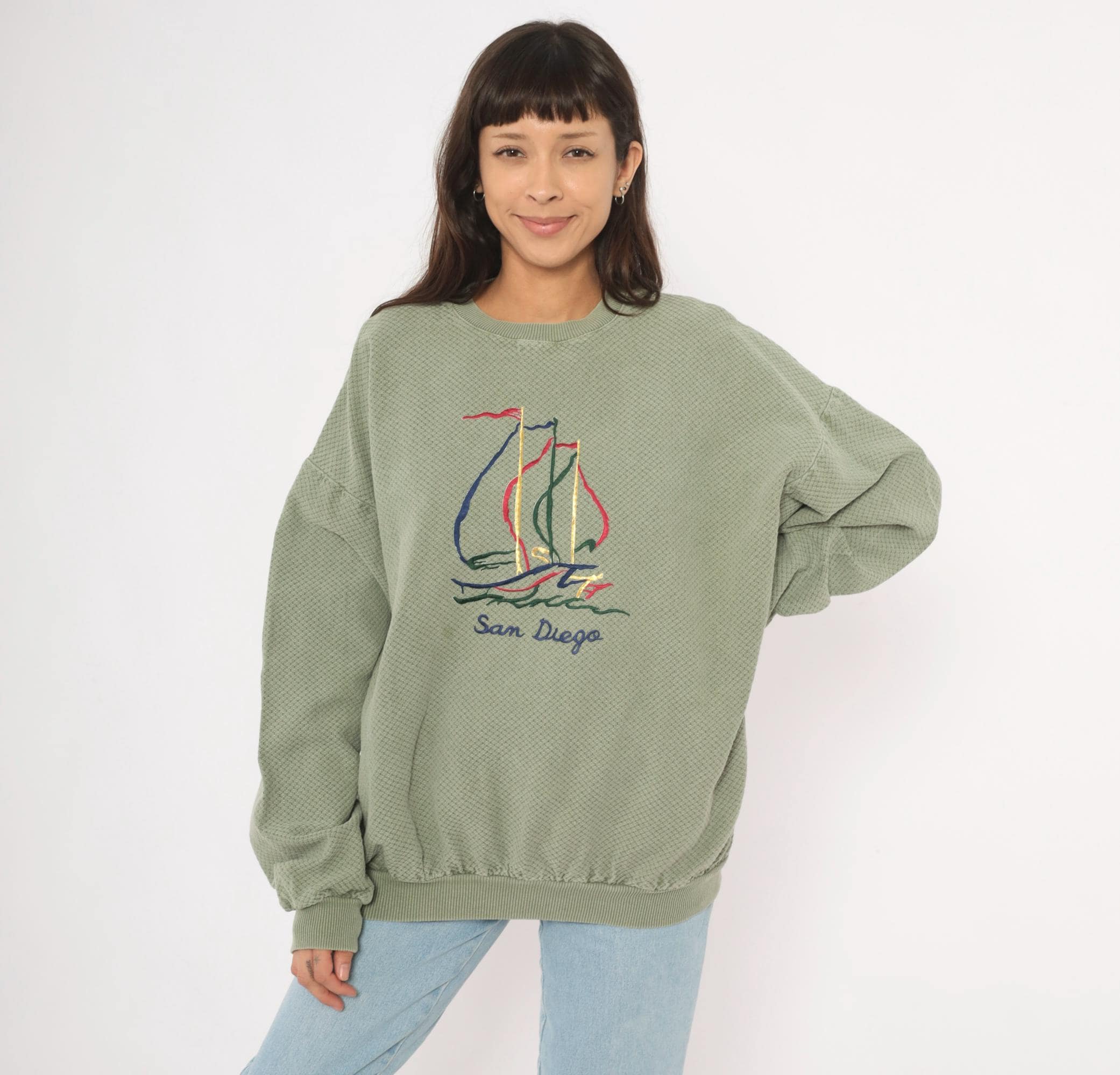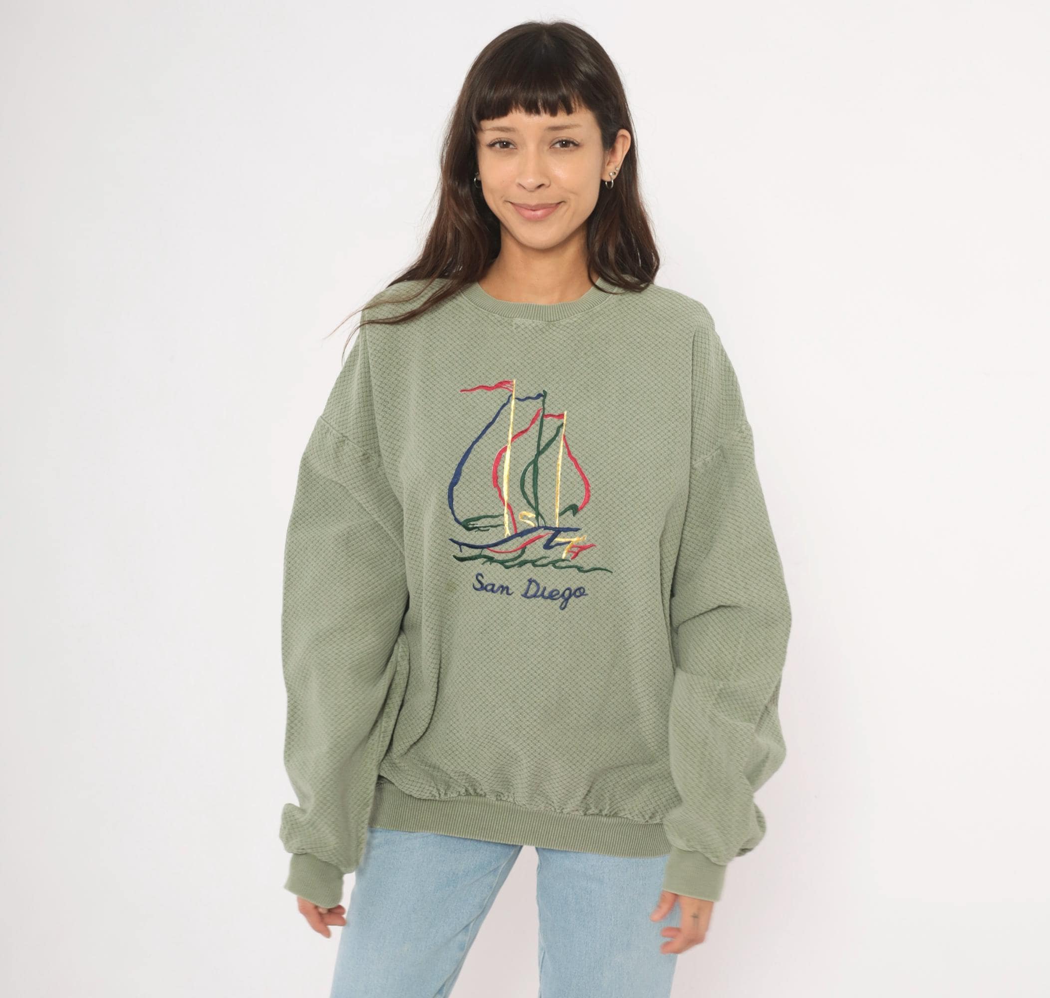 90s olive green waffle-knit crewneck sweatshirt with multicolor embroidered sailboat graphic and "San Diego" script across the chest. Navy, red, forest green, and gold metallic thread form an abstract sailing scene with waves beneath. Ribbed crew neckline, ribbed cuffs, and ribbed banded hem with a relaxed, boxy silhouette throughout the body and sleeves.