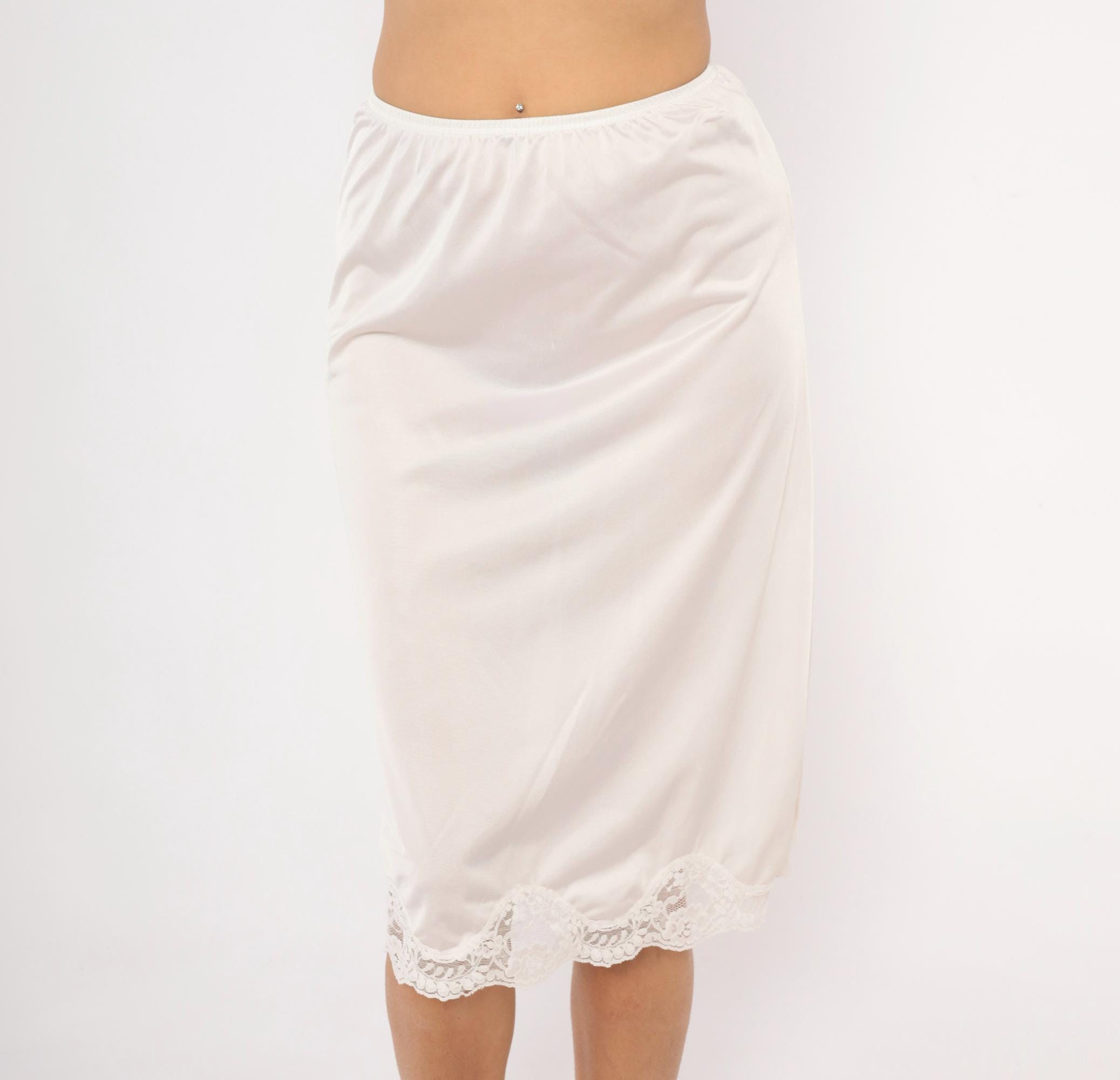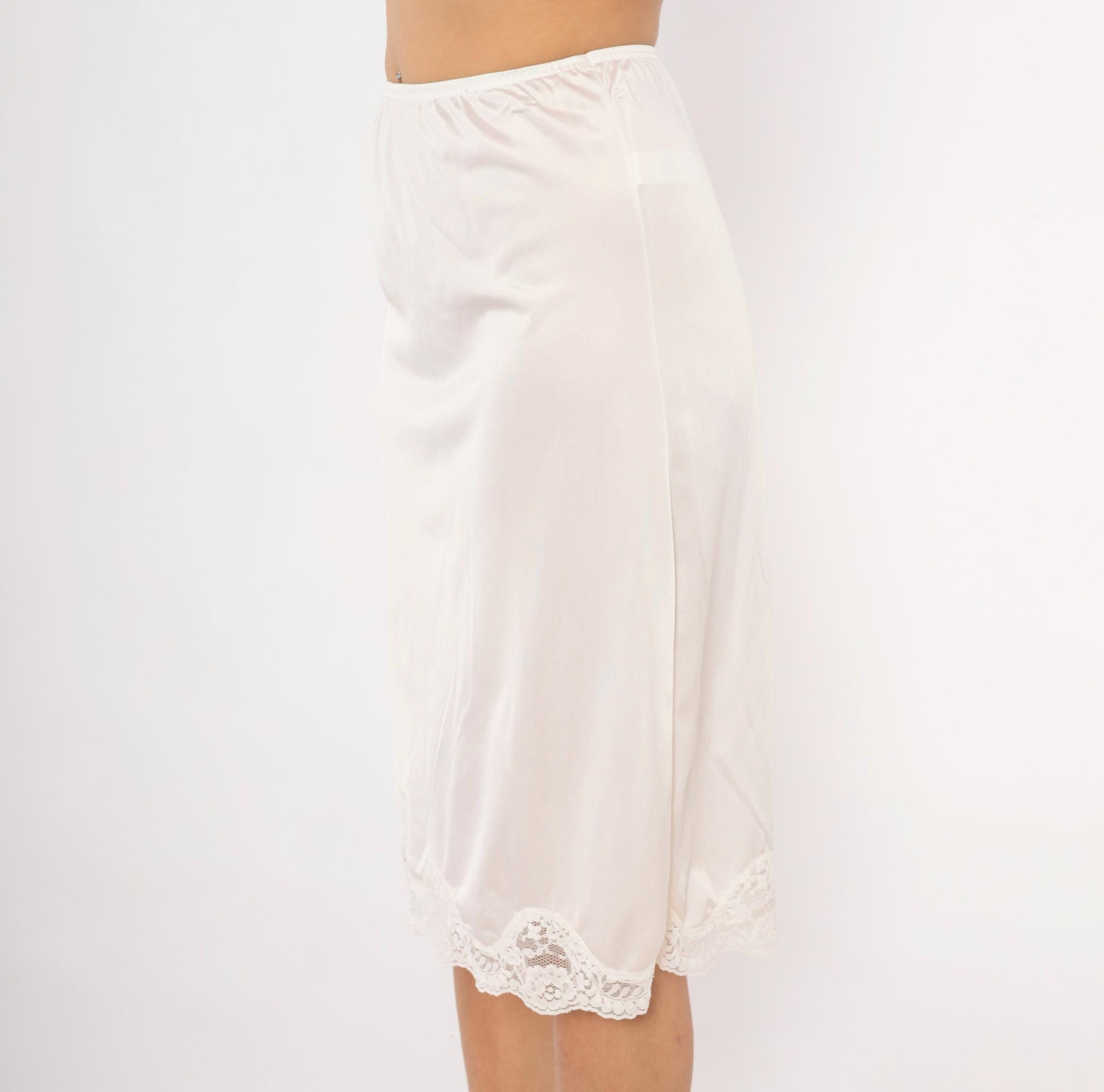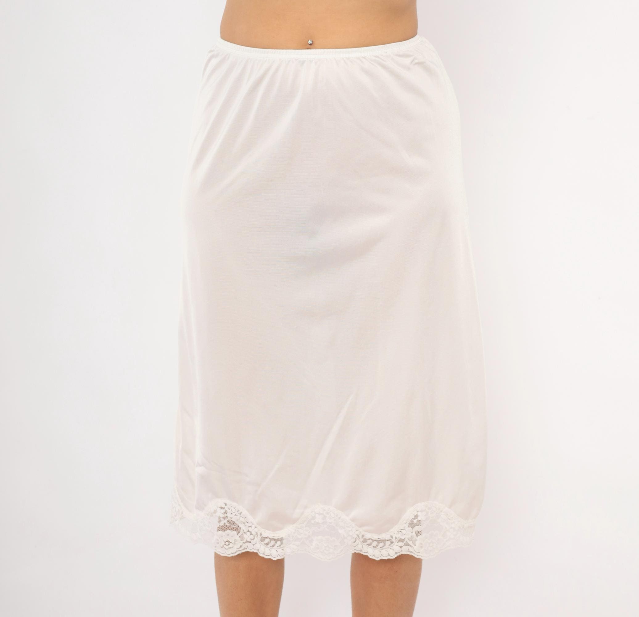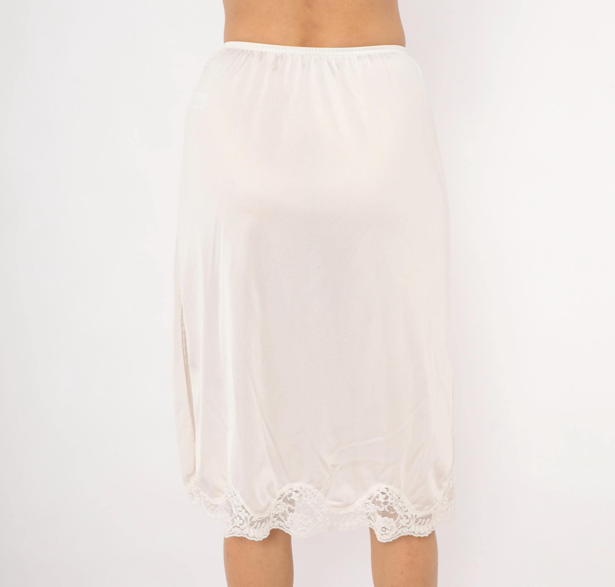 80s white half slip from Adonna with an elastic waist and knee-length silhouette. Scalloped floral lace trim along the entire hemline with a delicate scalloped edge. Straight, slightly A-line cut in ivory with a side slit for ease of movement.