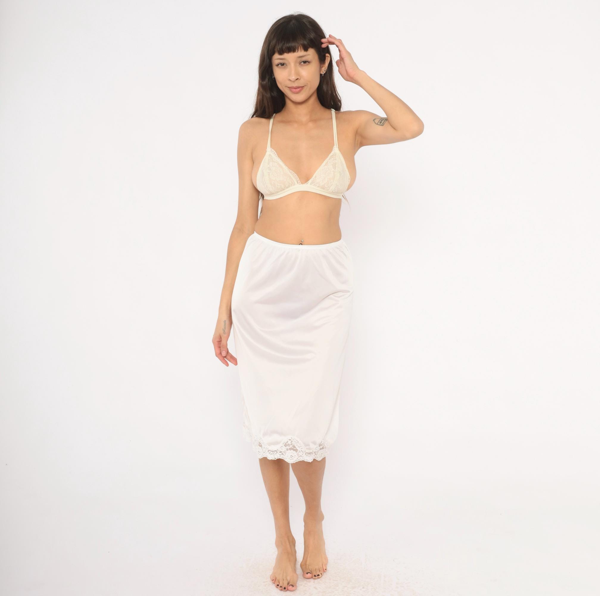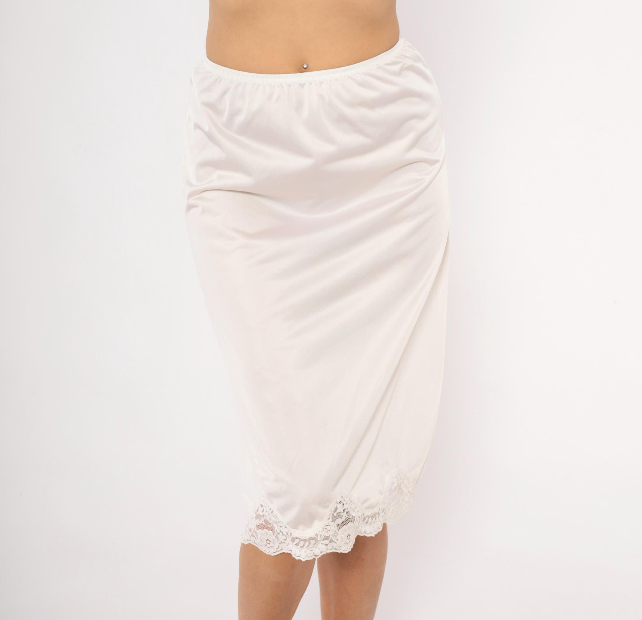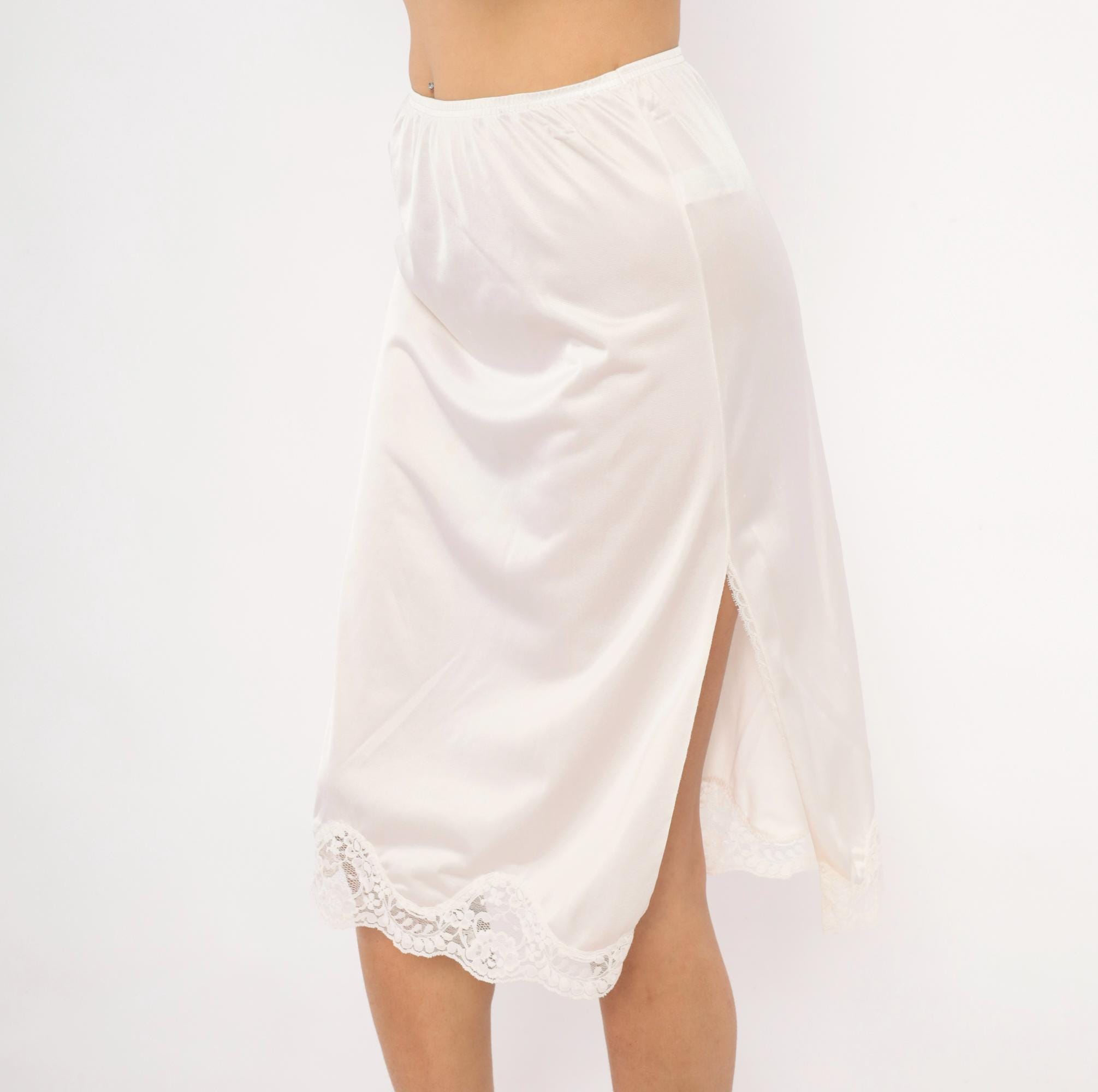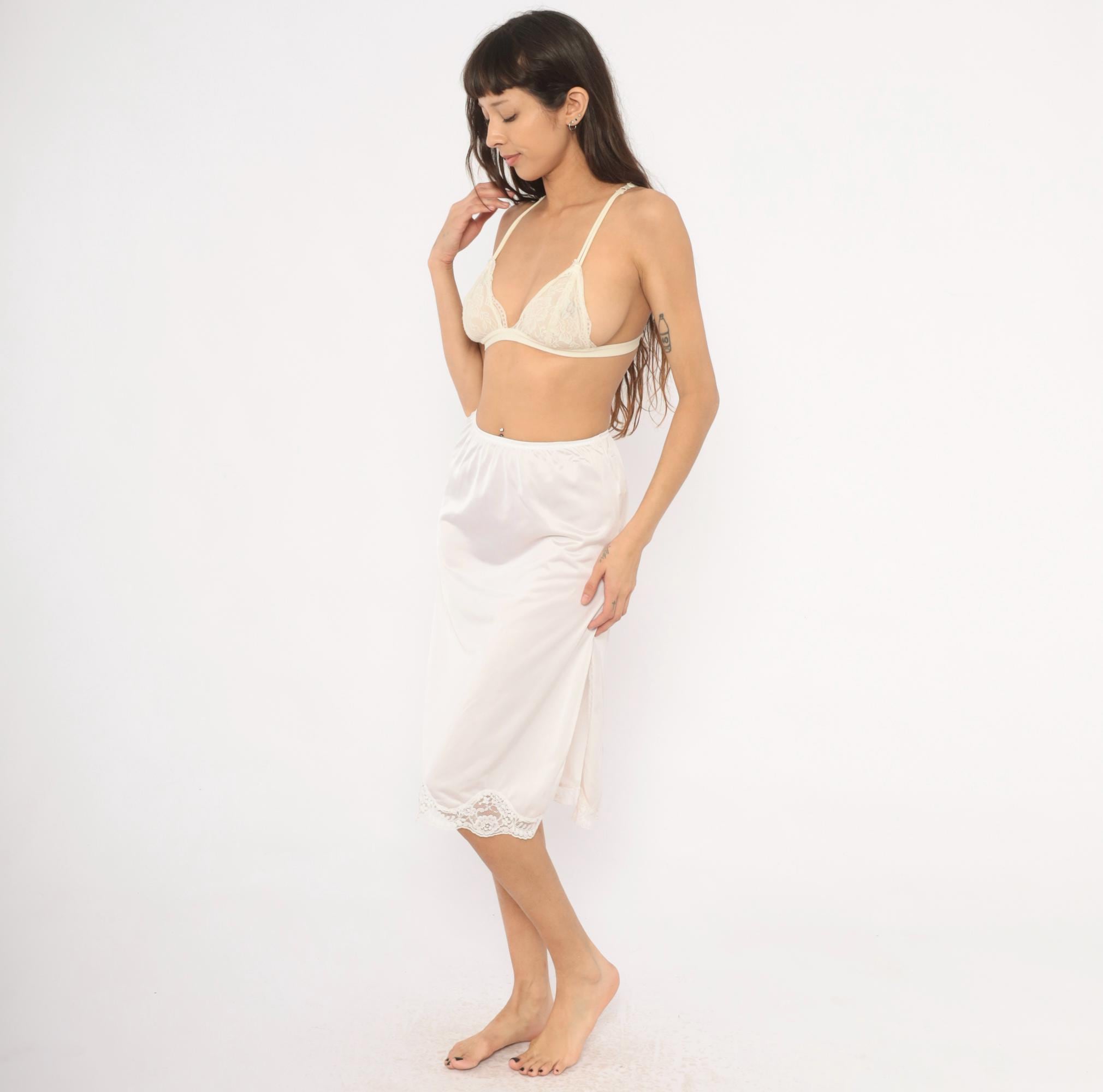 80s white half slip from Adonna with an elastic waist and knee-length silhouette. Scalloped floral lace trim along the entire hemline with a delicate scalloped edge. Straight, slightly A-line cut in ivory with a side slit for ease of movement.