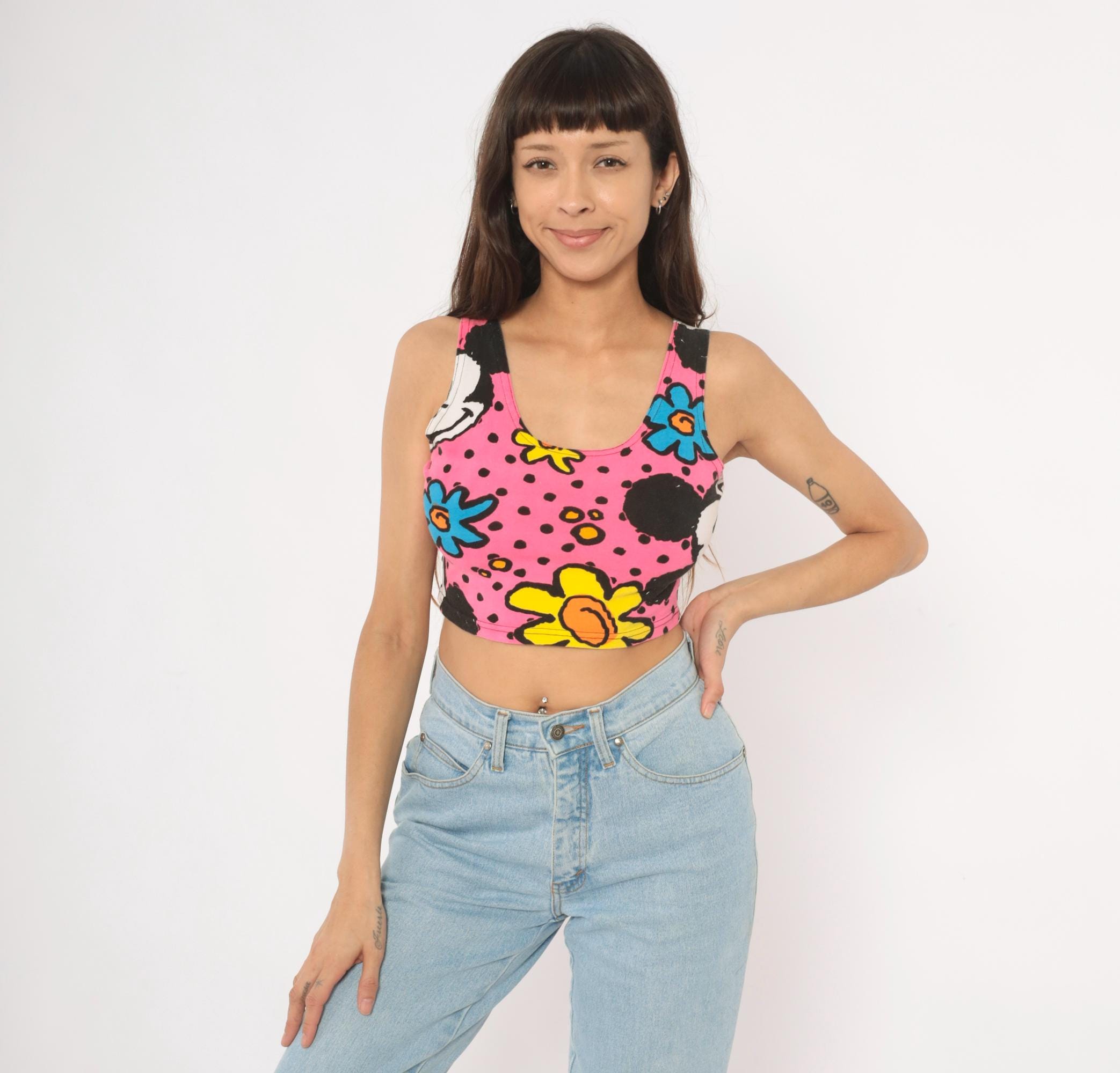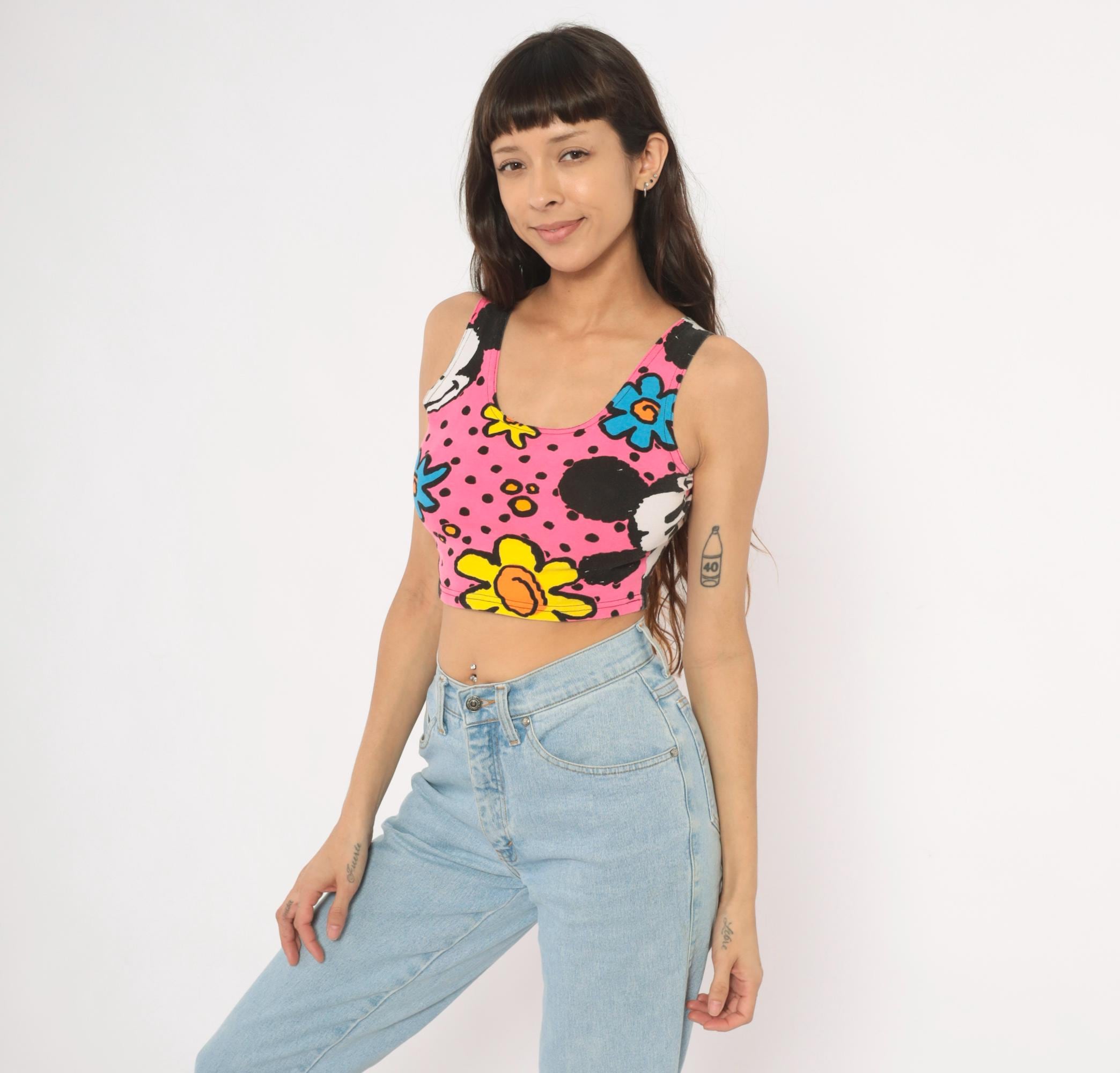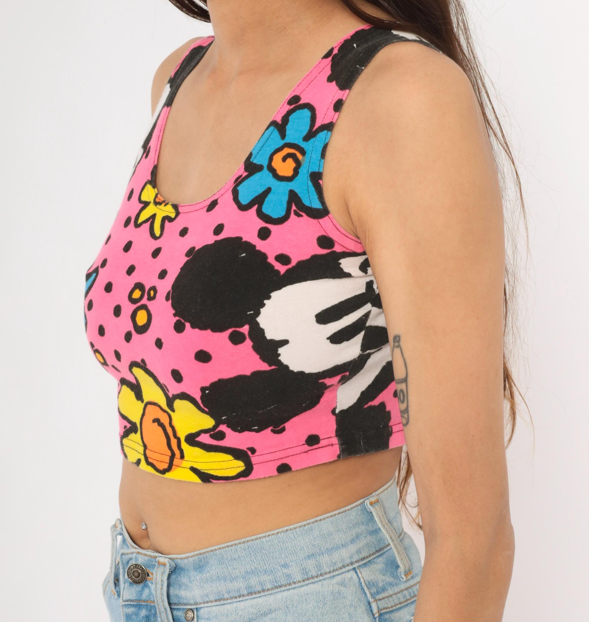 90s crop tank top from Mickey & Co with an allover print of Mickey Mouse, colorful flowers in blue, yellow, green, and orange on a hot pink background with black polka dots. Scoop neckline on both front and back, wide shoulder straps, and a fitted silhouette that hits at the natural waist. Pullover style with no closures or pockets.