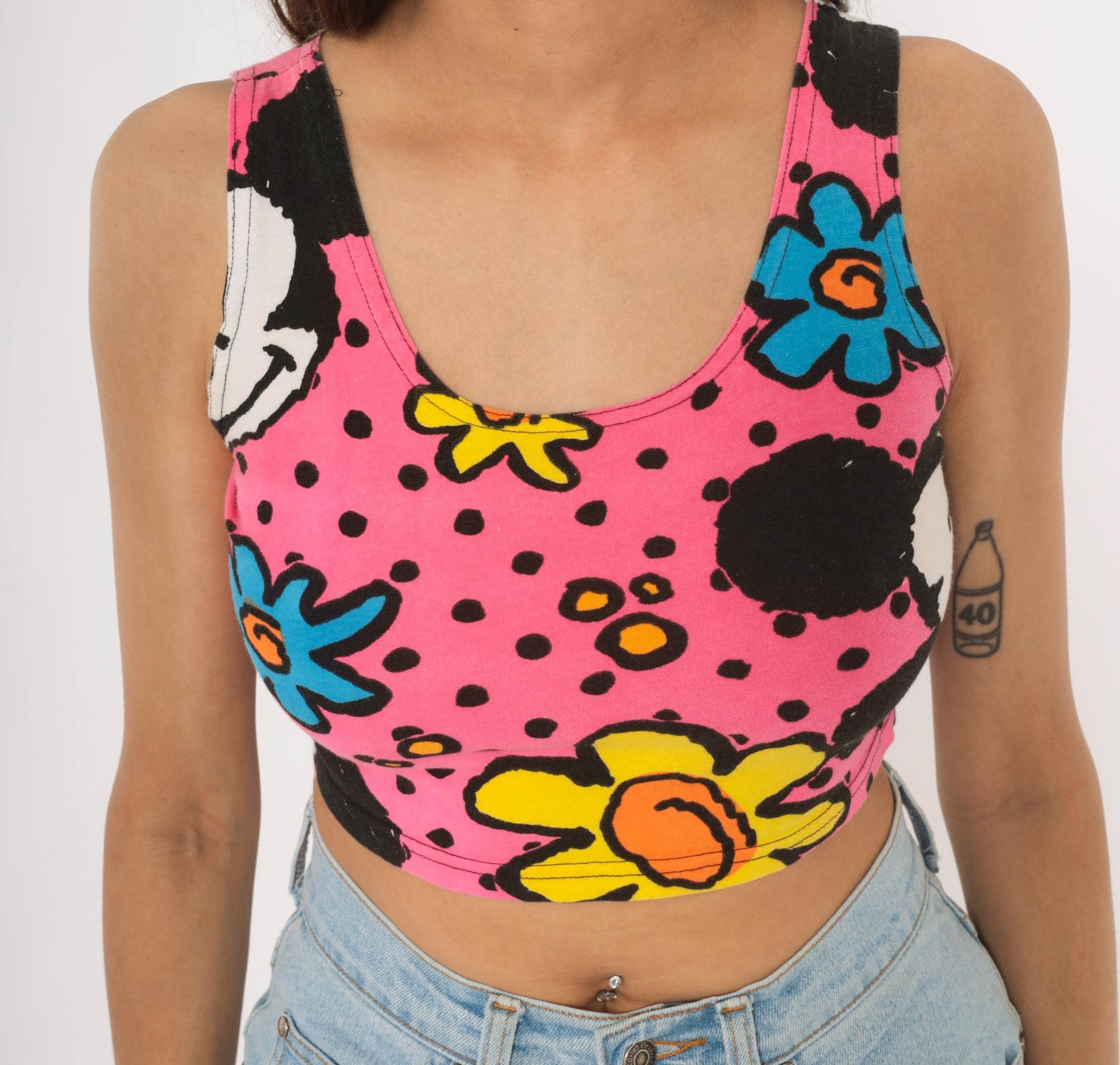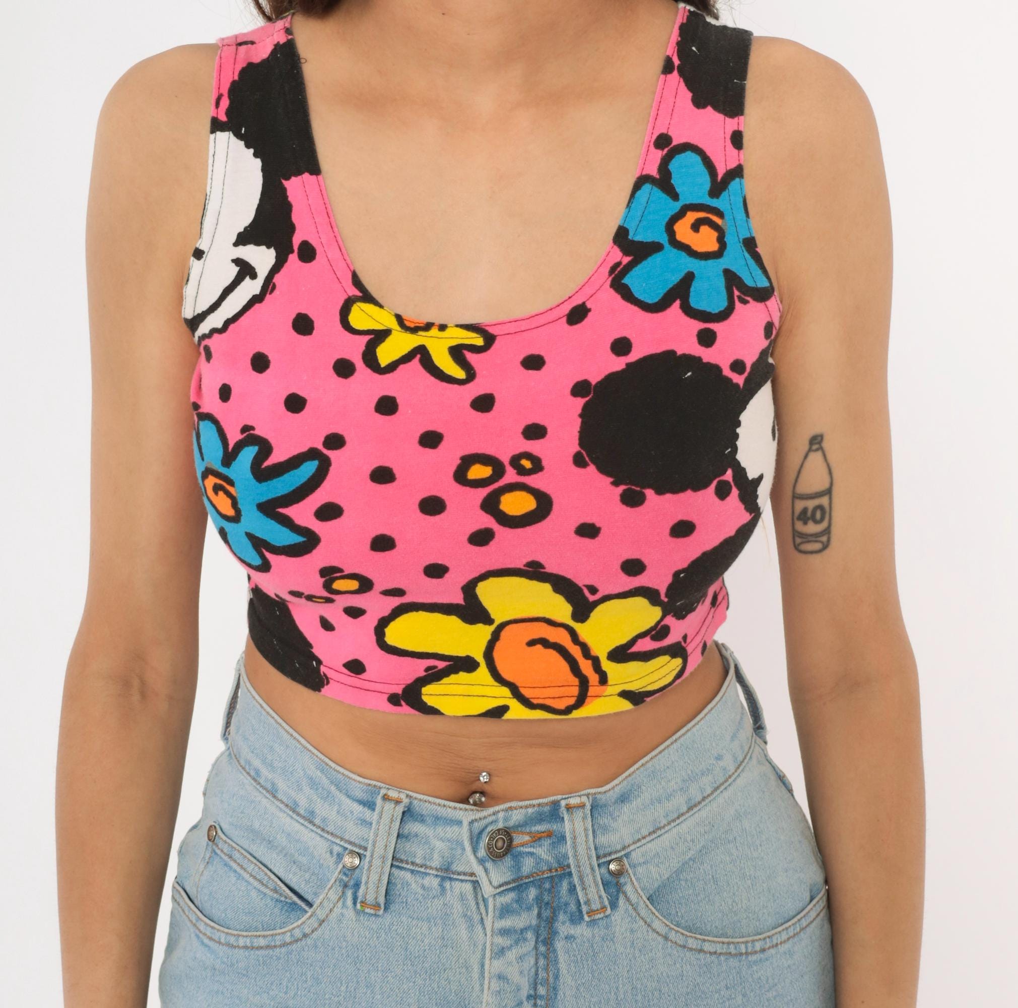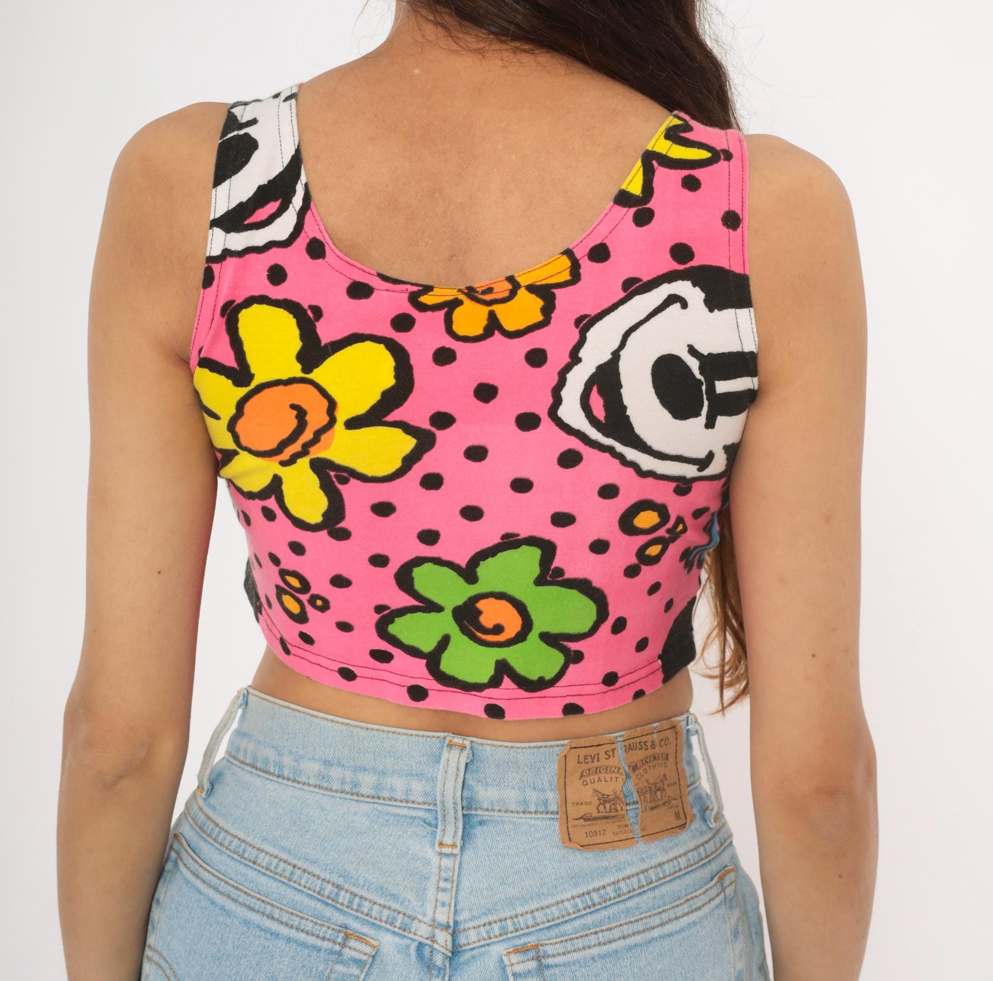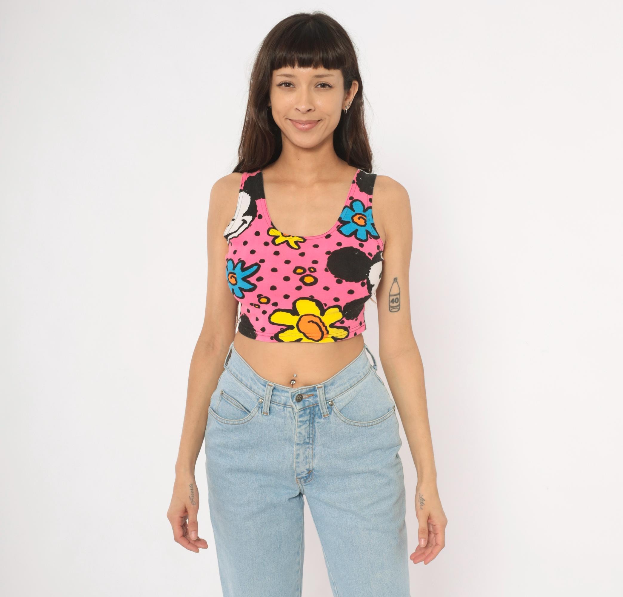 90s crop tank top from Mickey & Co with an allover print of Mickey Mouse, colorful flowers in blue, yellow, green, and orange on a hot pink background with black polka dots. Scoop neckline on both front and back, wide shoulder straps, and a fitted silhouette that hits at the natural waist. Pullover style with no closures or pockets.