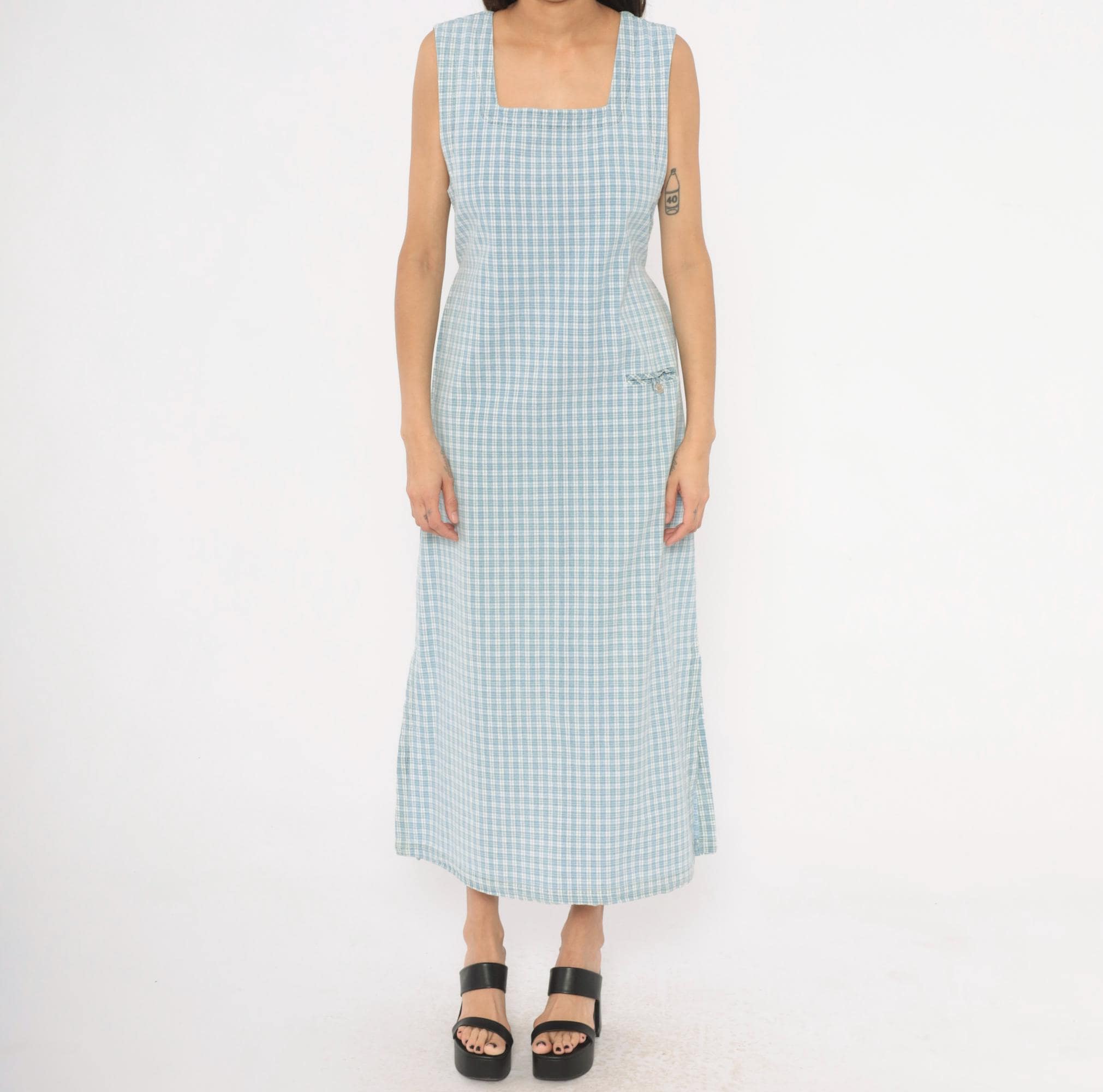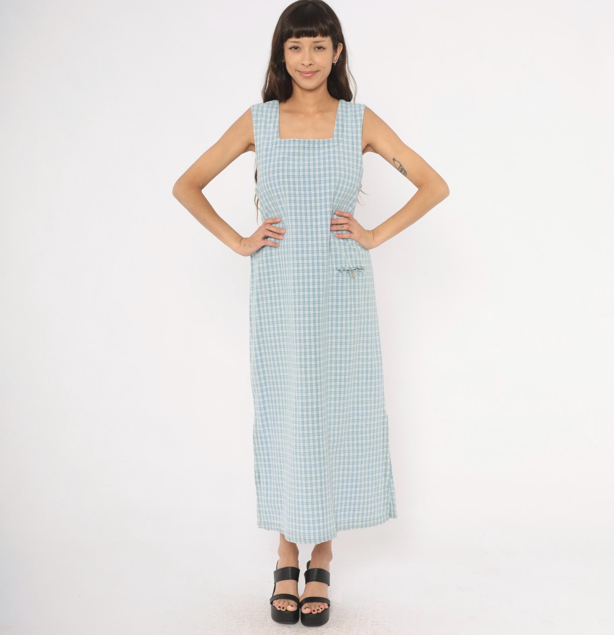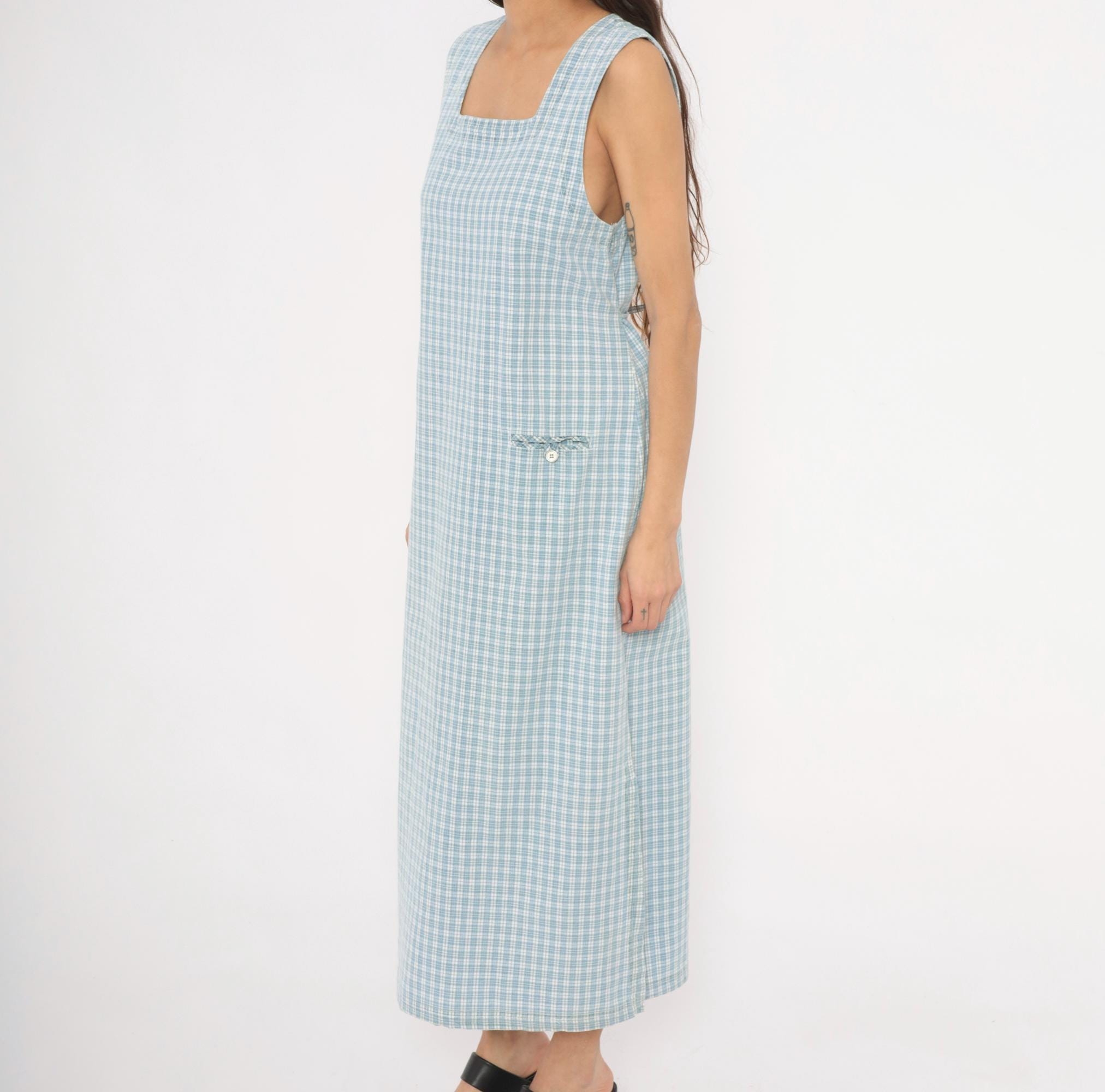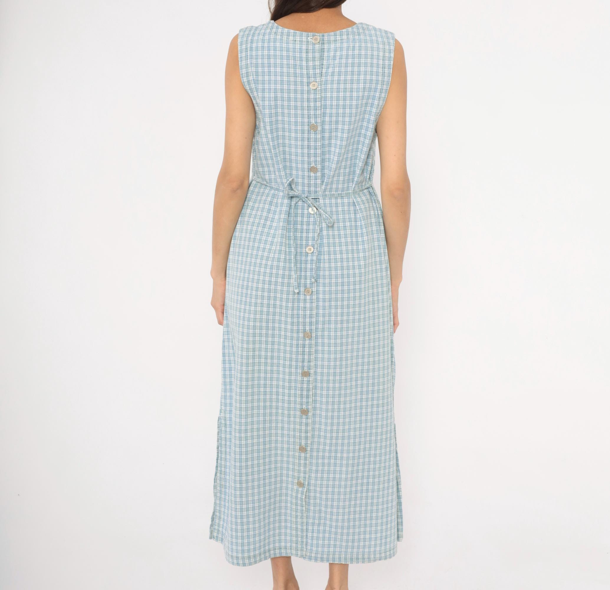 90s blue and white plaid maxi dress from Faded Glory with a square neckline and wide shoulder straps. Back button closure running the full length with a tie belt at the waist. Front patch pocket with a small fabric bow and button detail at the hip. Sleeveless, straight silhouette with a subtle A-line shape through the skirt.