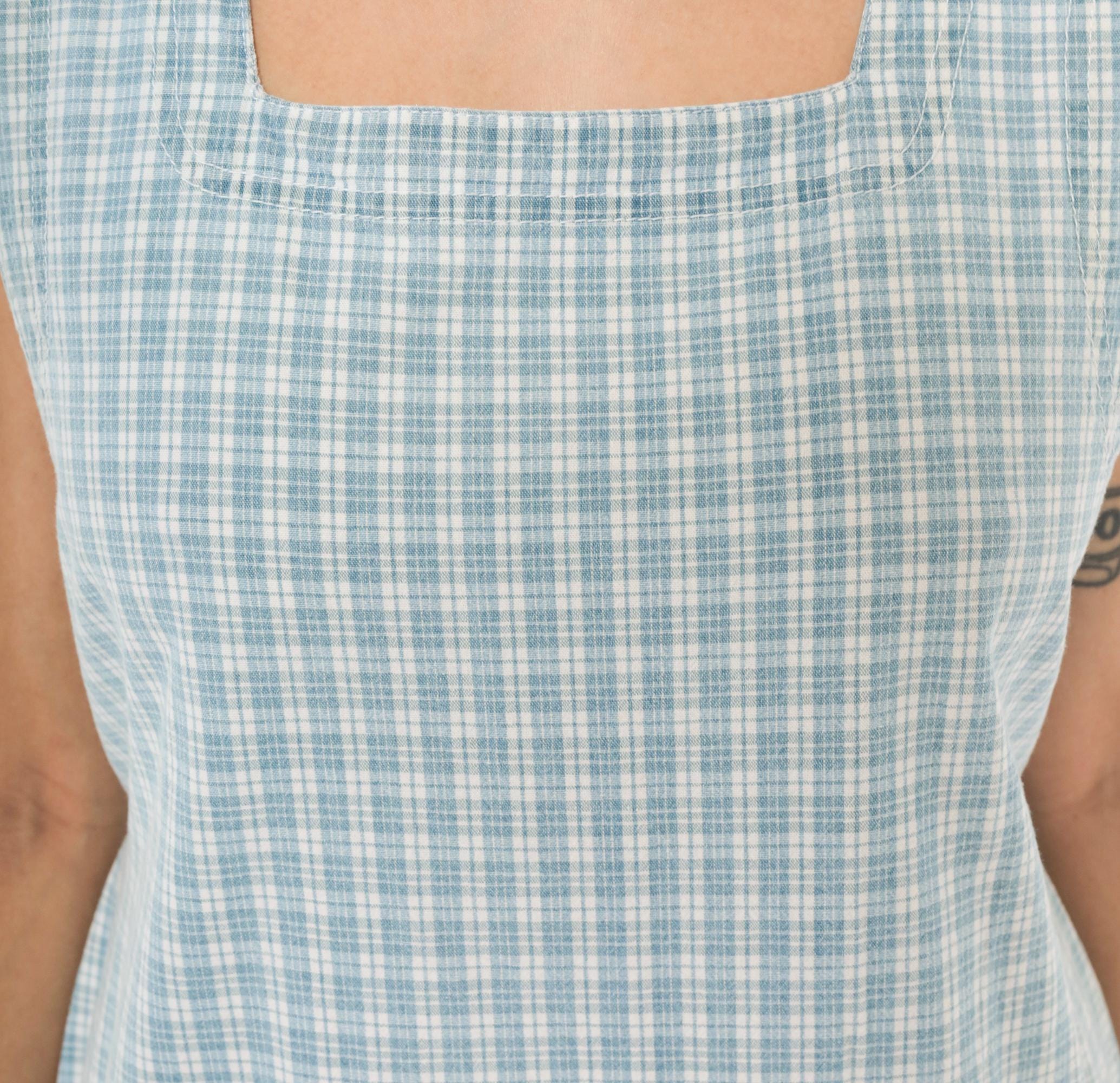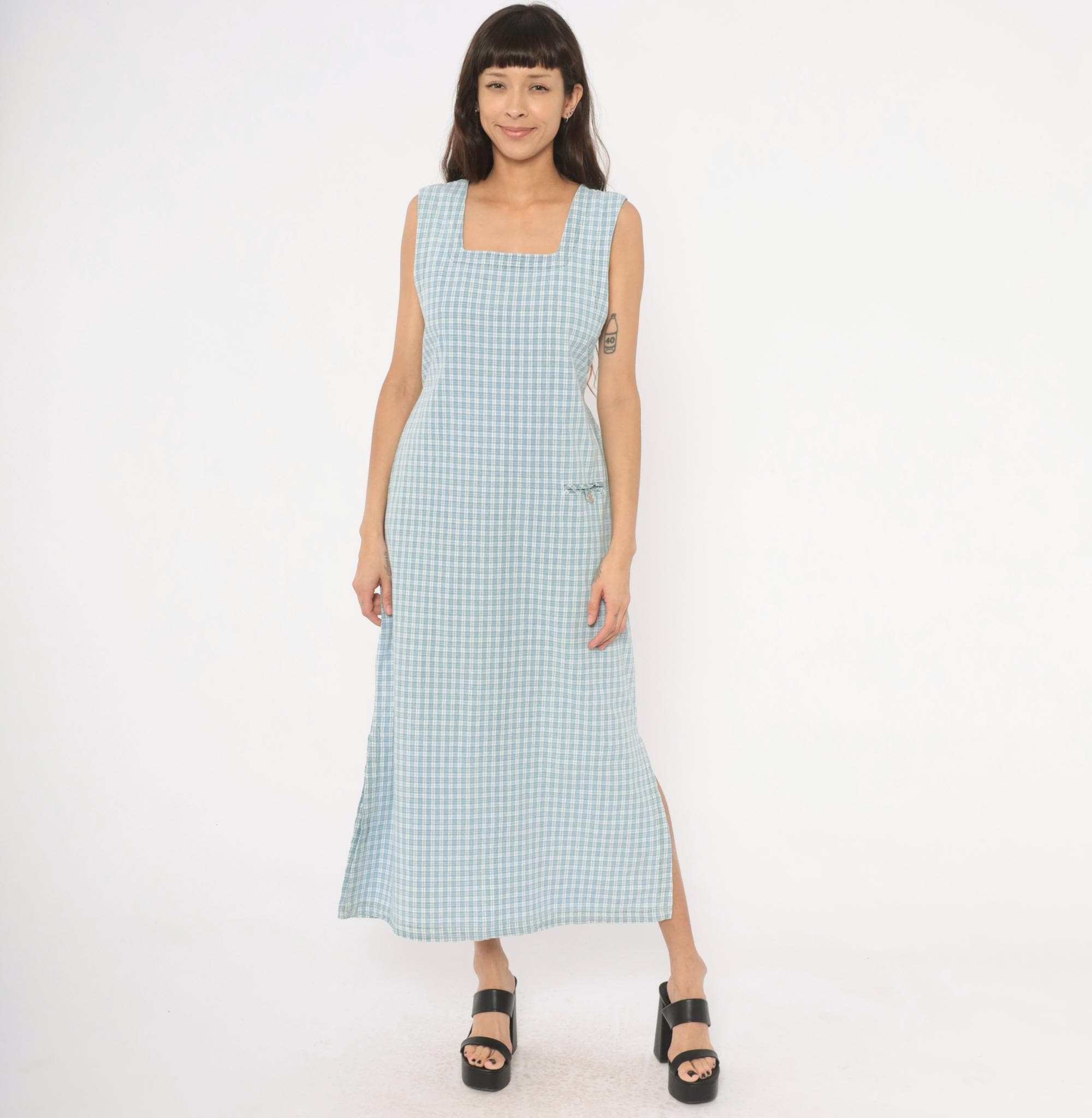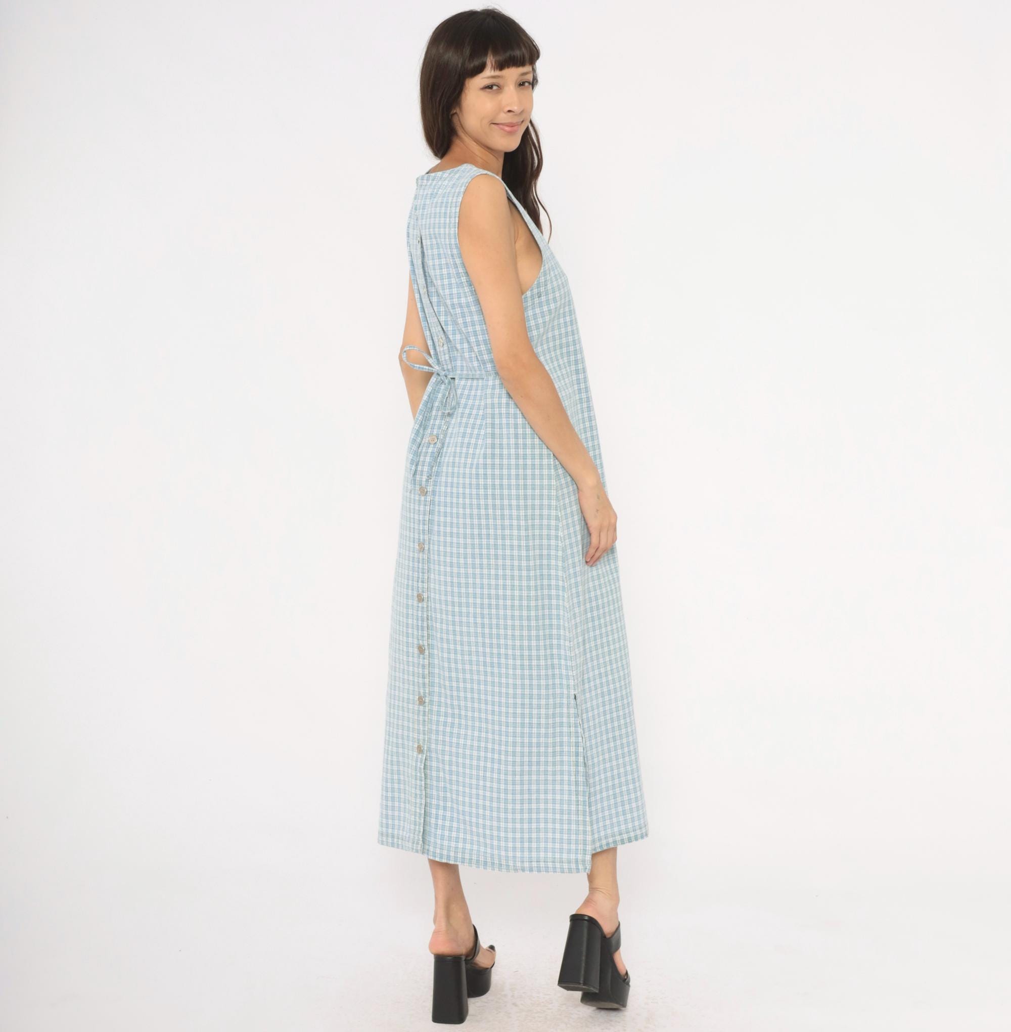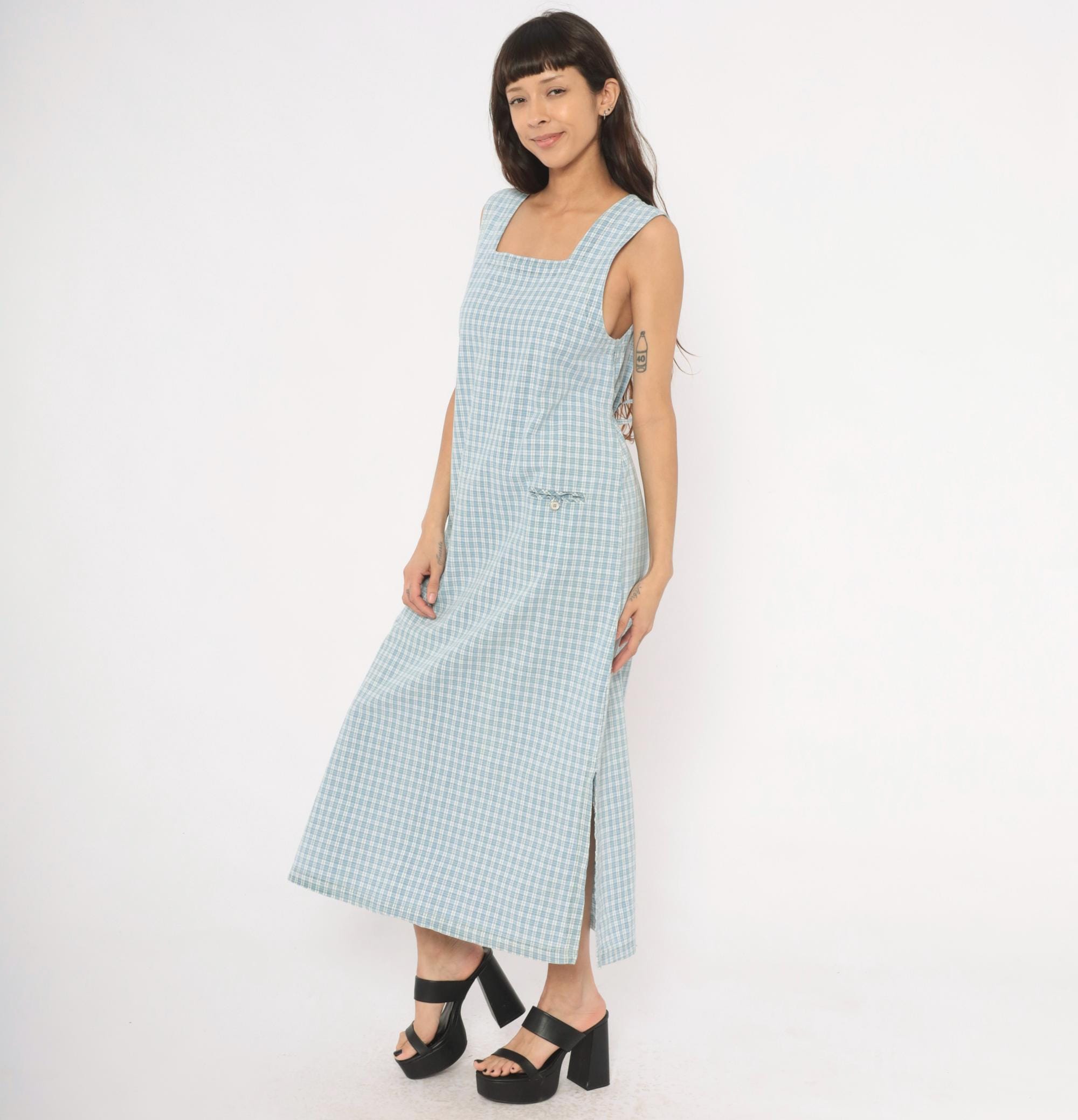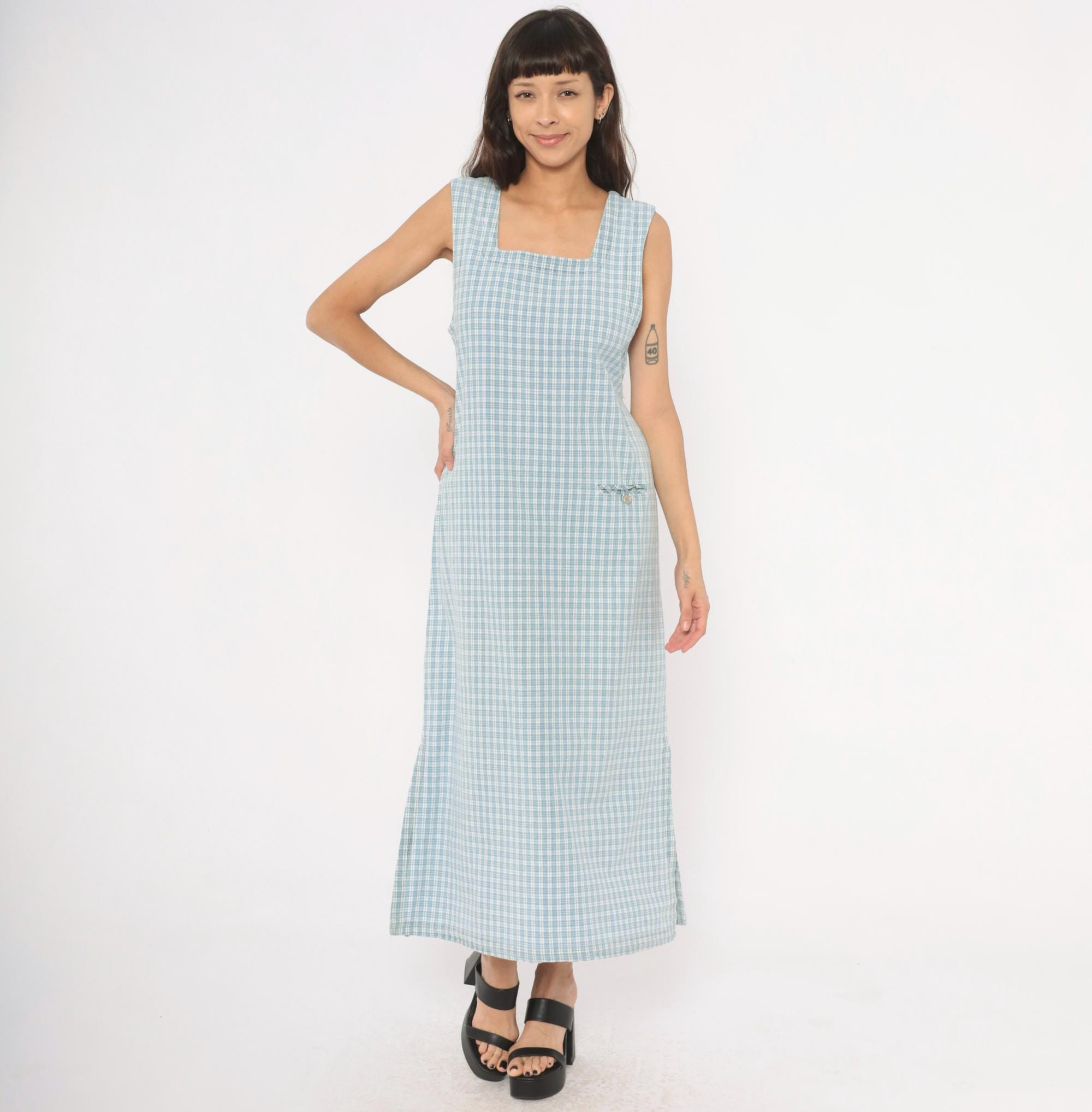 90s blue and white plaid maxi dress from Faded Glory with a square neckline and wide shoulder straps. Back button closure running the full length with a tie belt at the waist. Front patch pocket with a small fabric bow and button detail at the hip. Sleeveless, straight silhouette with a subtle A-line shape through the skirt.