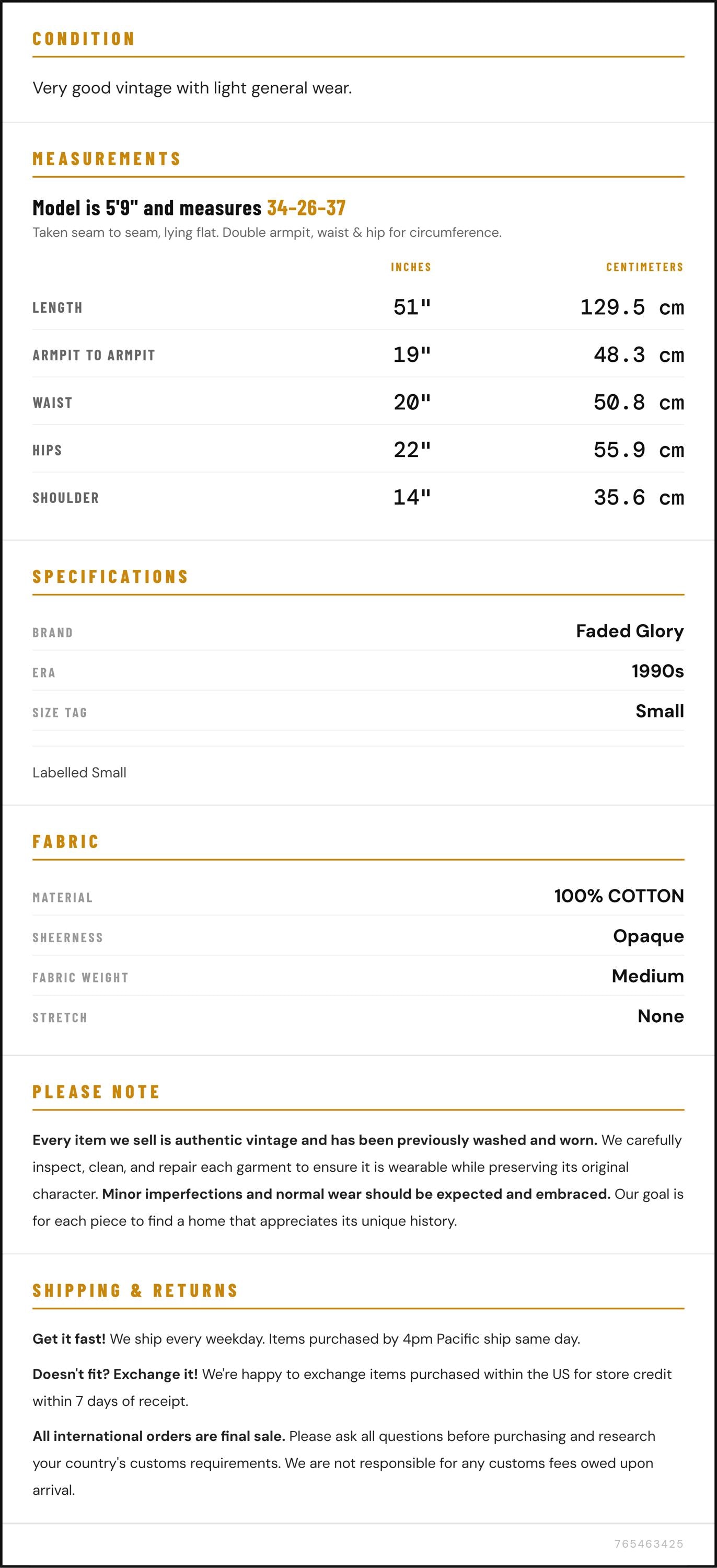 Vintage denim was usually made without any stretch, unlike modern jeans. Check the measurements to ensure proper fit, and remember to give yourself a little wiggle room in the waist and hips, depending on your preferred fit.