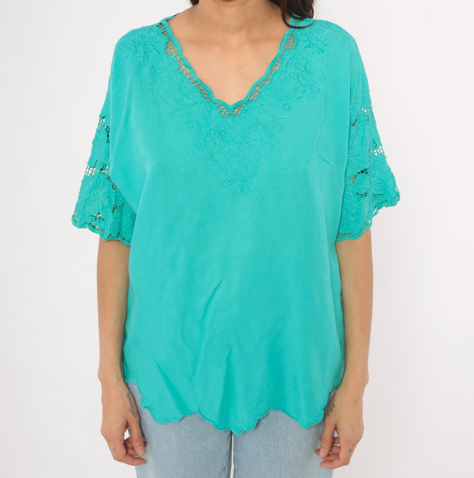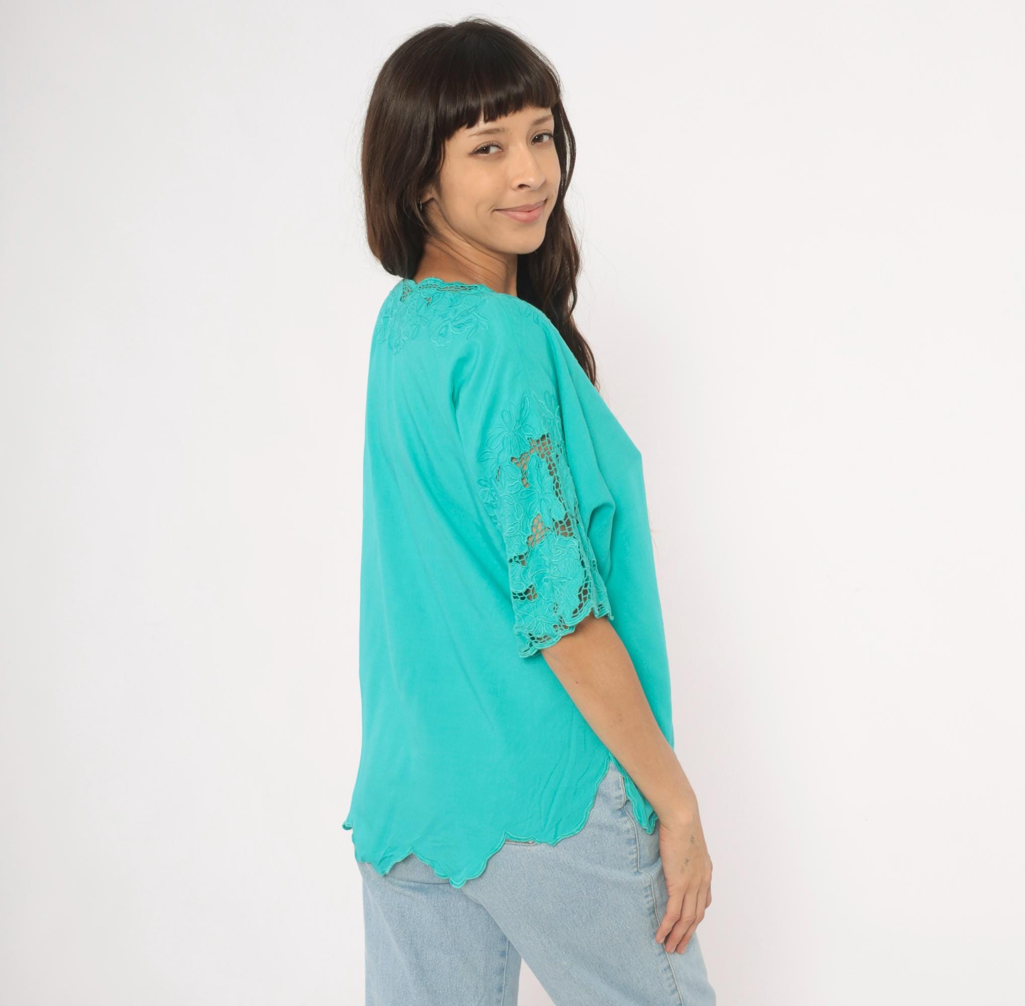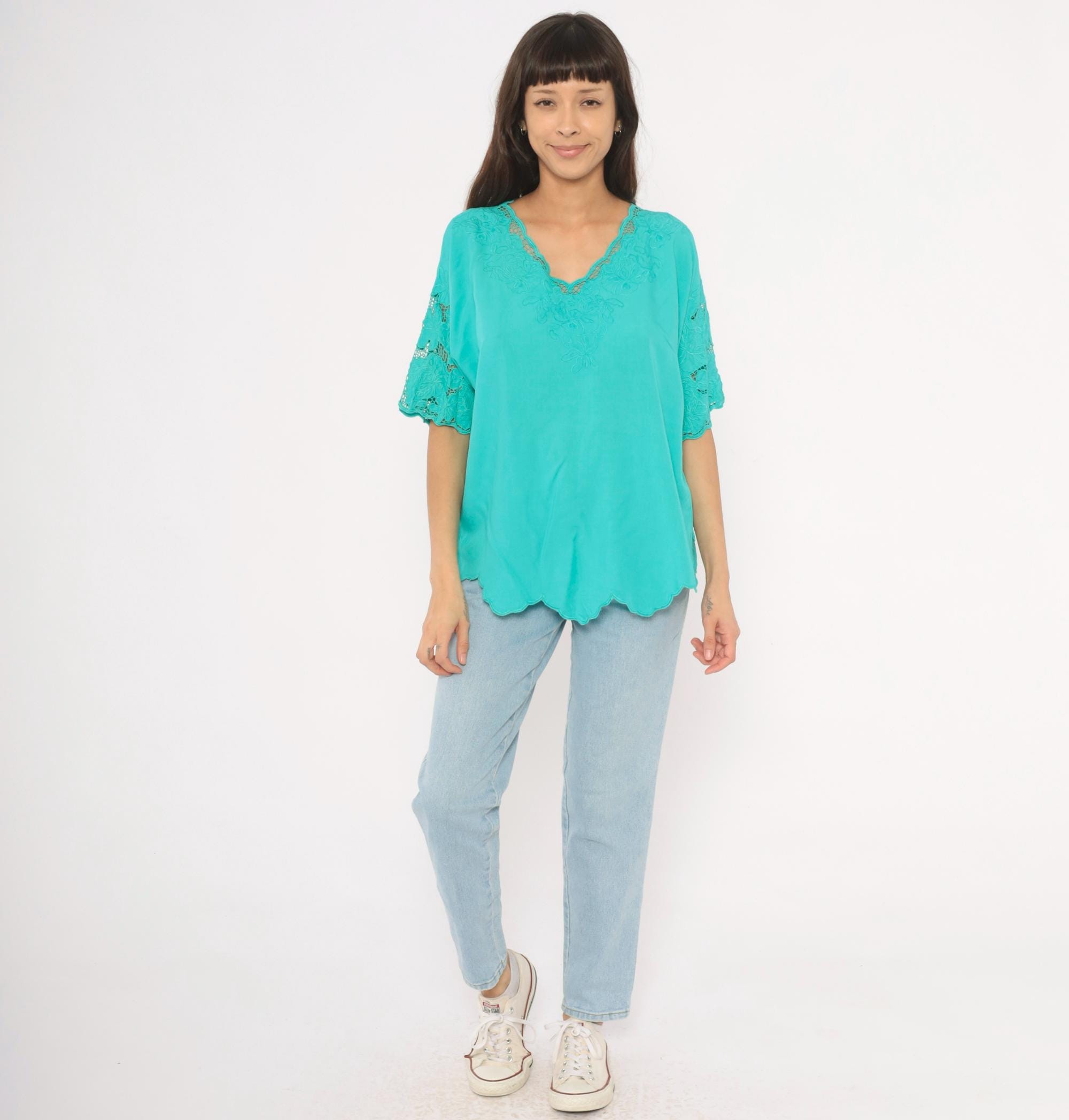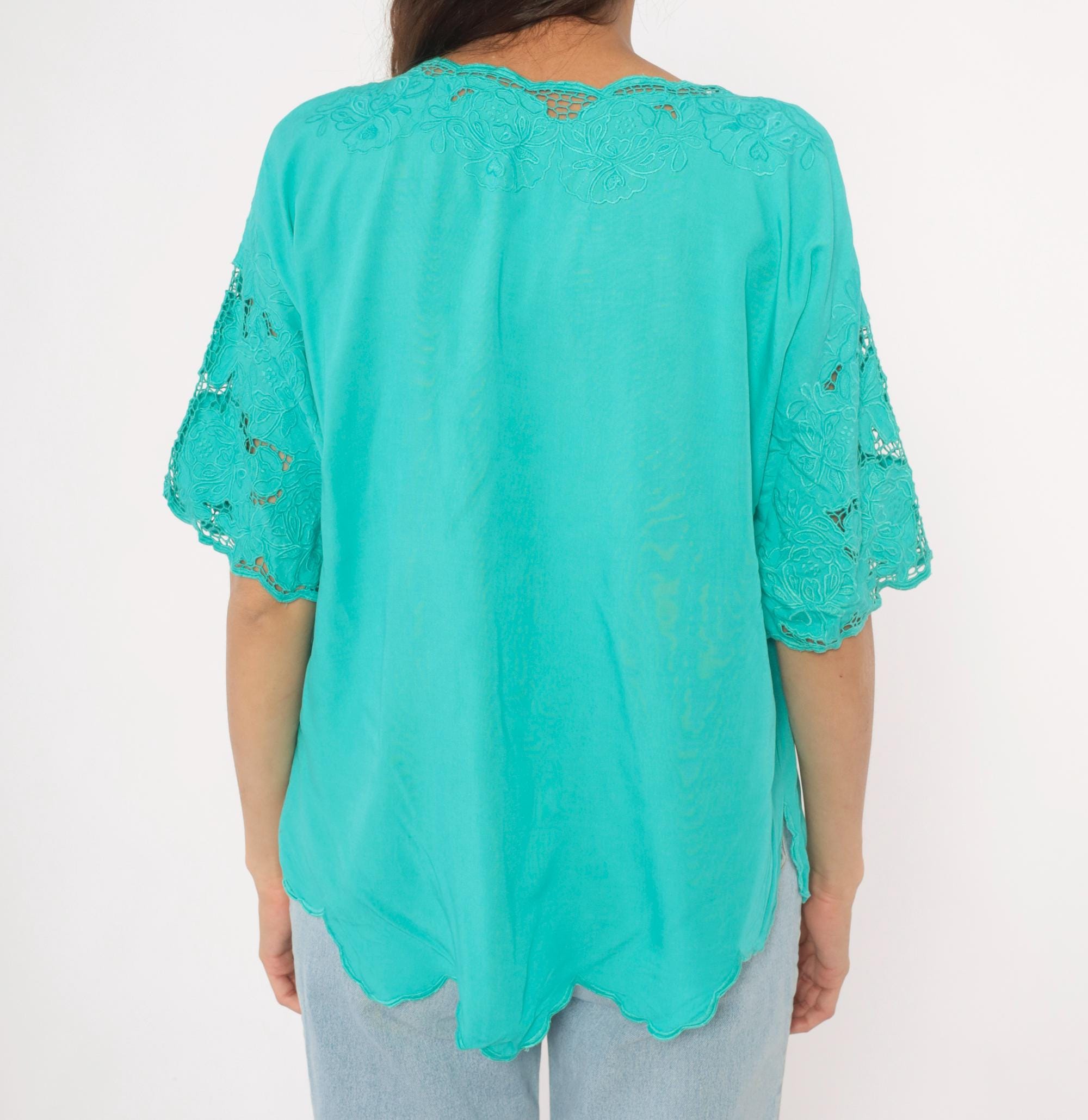 80s teal pullover blouse from Bali Emerald with cutwork lace embroidery in a floral pattern across the neckline, chest, and sleeves. V-neckline with scalloped lace trim, short sleeves entirely constructed of cutwork floral lace with scalloped edges. Scalloped hemline with a relaxed, boxy silhouette and side slits at the hip.