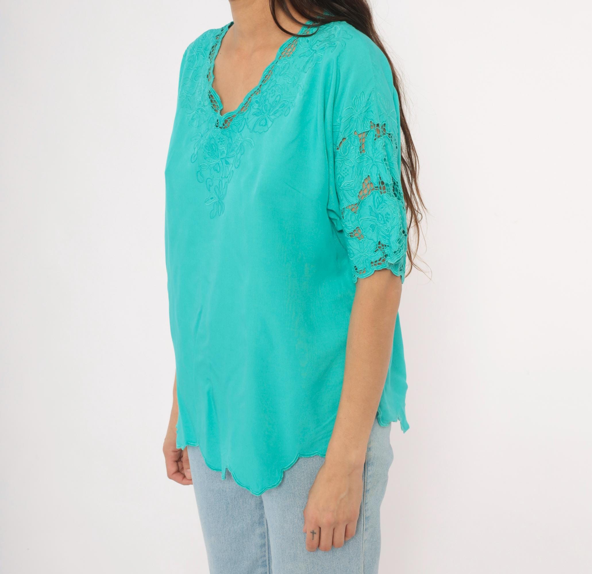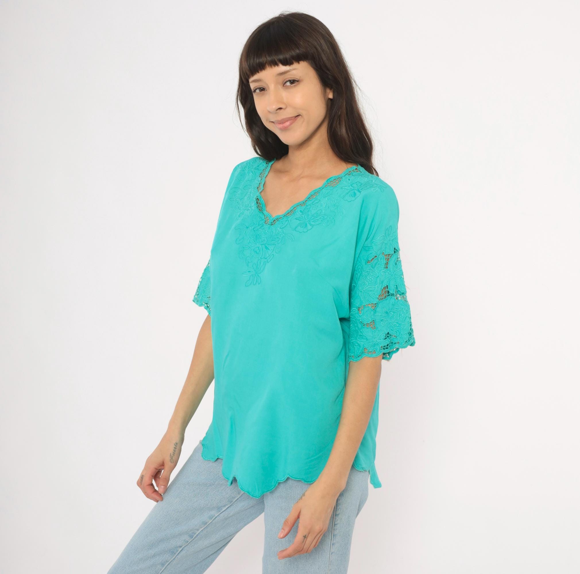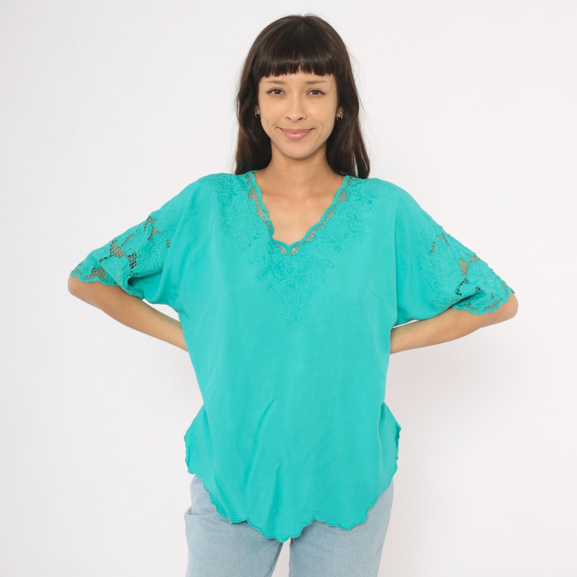 80s teal pullover blouse from Bali Emerald with cutwork lace embroidery in a floral pattern across the neckline, chest, and sleeves. V-neckline with scalloped lace trim, short sleeves entirely constructed of cutwork floral lace with scalloped edges. Scalloped hemline with a relaxed, boxy silhouette and side slits at the hip.