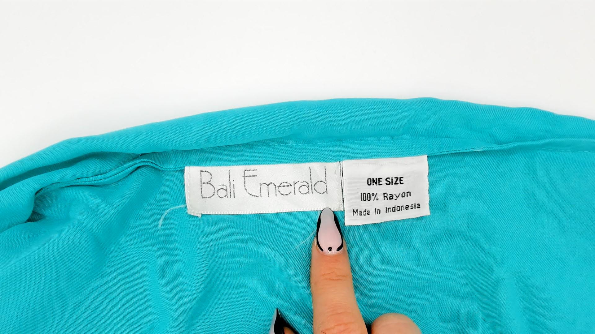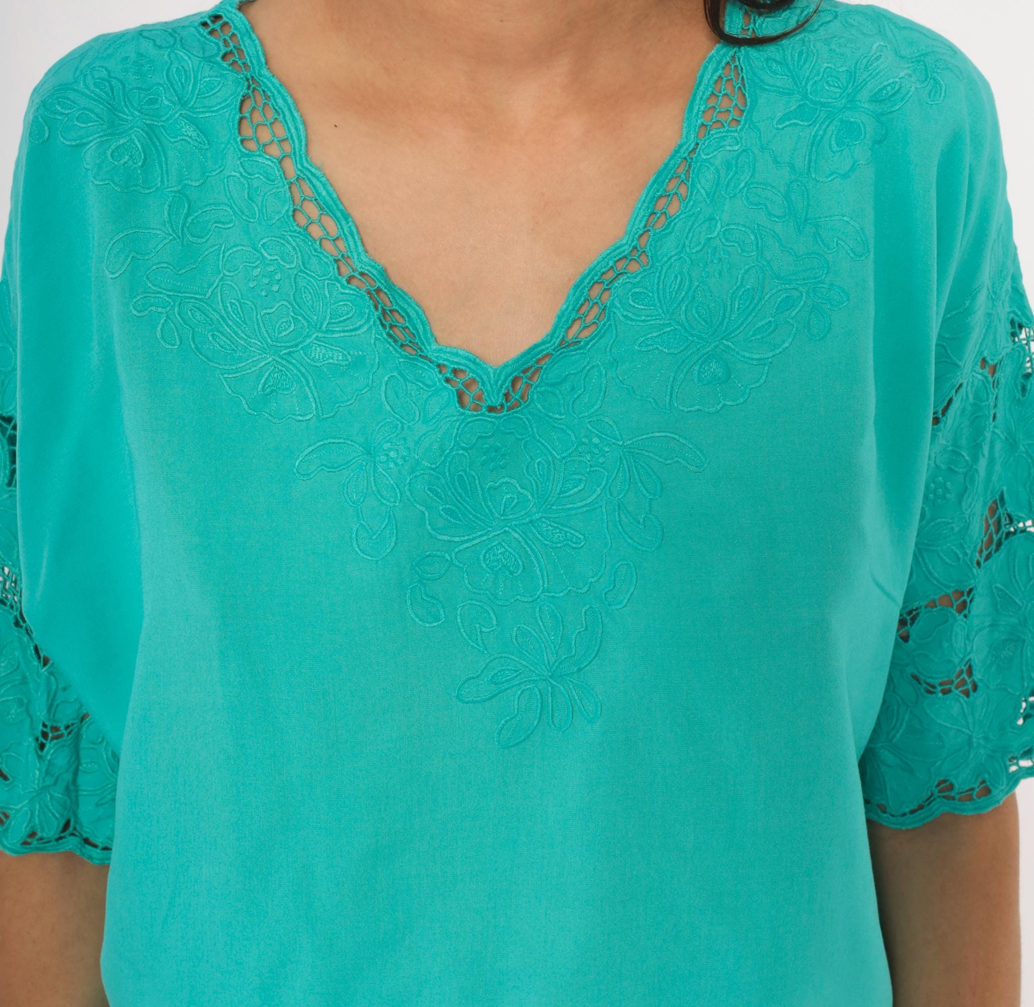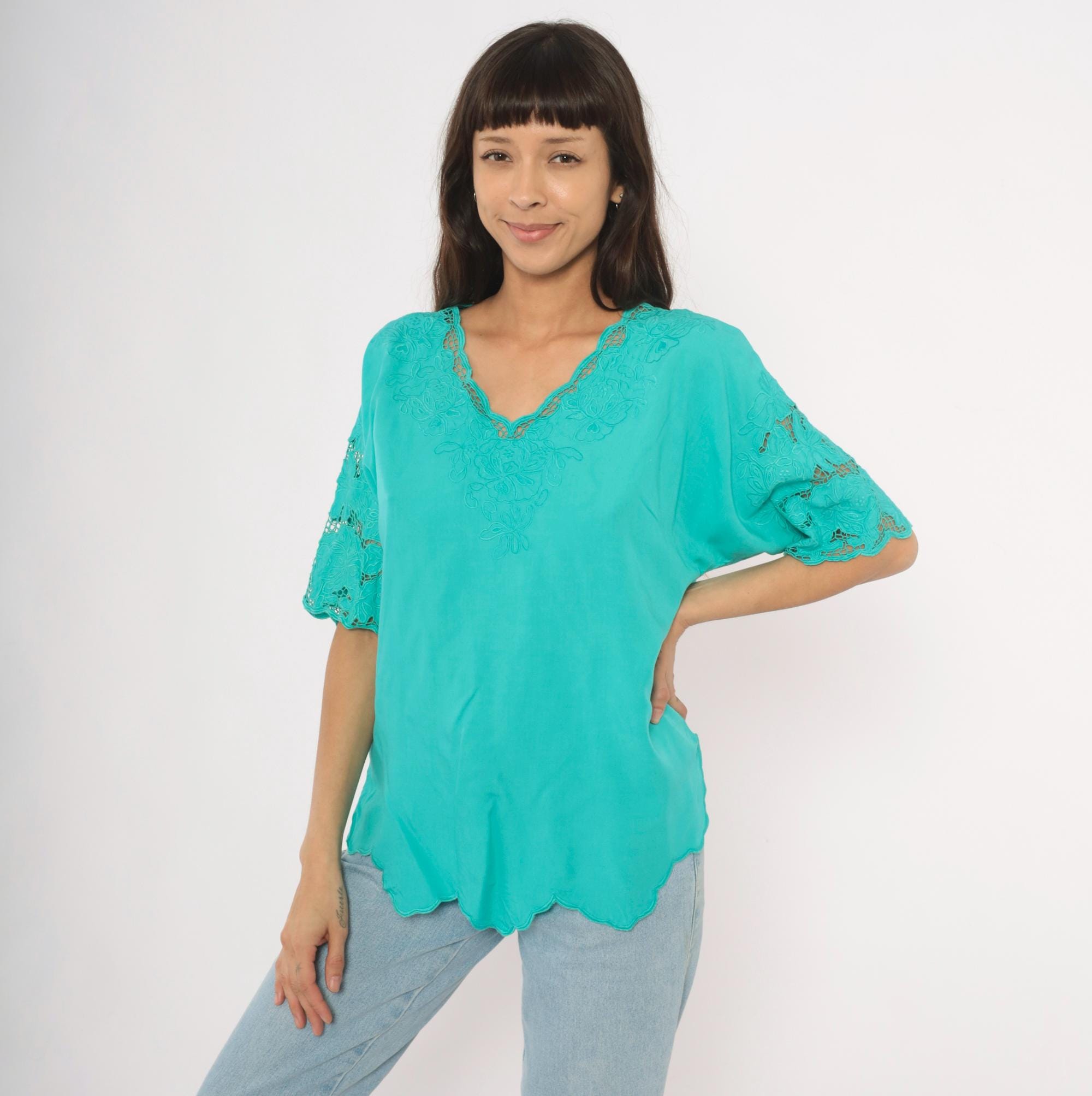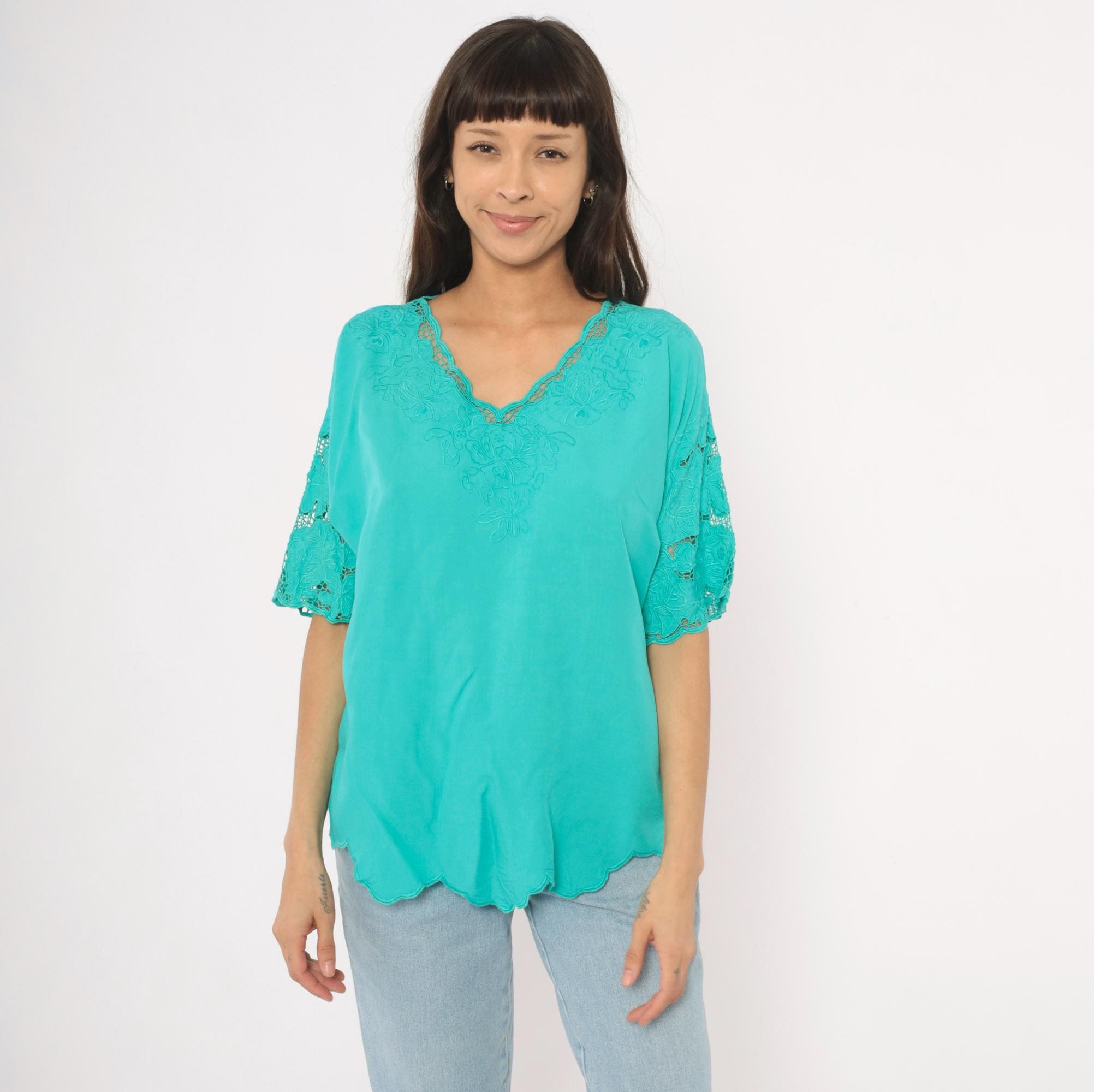 80s teal pullover blouse from Bali Emerald with cutwork lace embroidery in a floral pattern across the neckline, chest, and sleeves. V-neckline with scalloped lace trim, short sleeves entirely constructed of cutwork floral lace with scalloped edges. Scalloped hemline with a relaxed, boxy silhouette and side slits at the hip.
