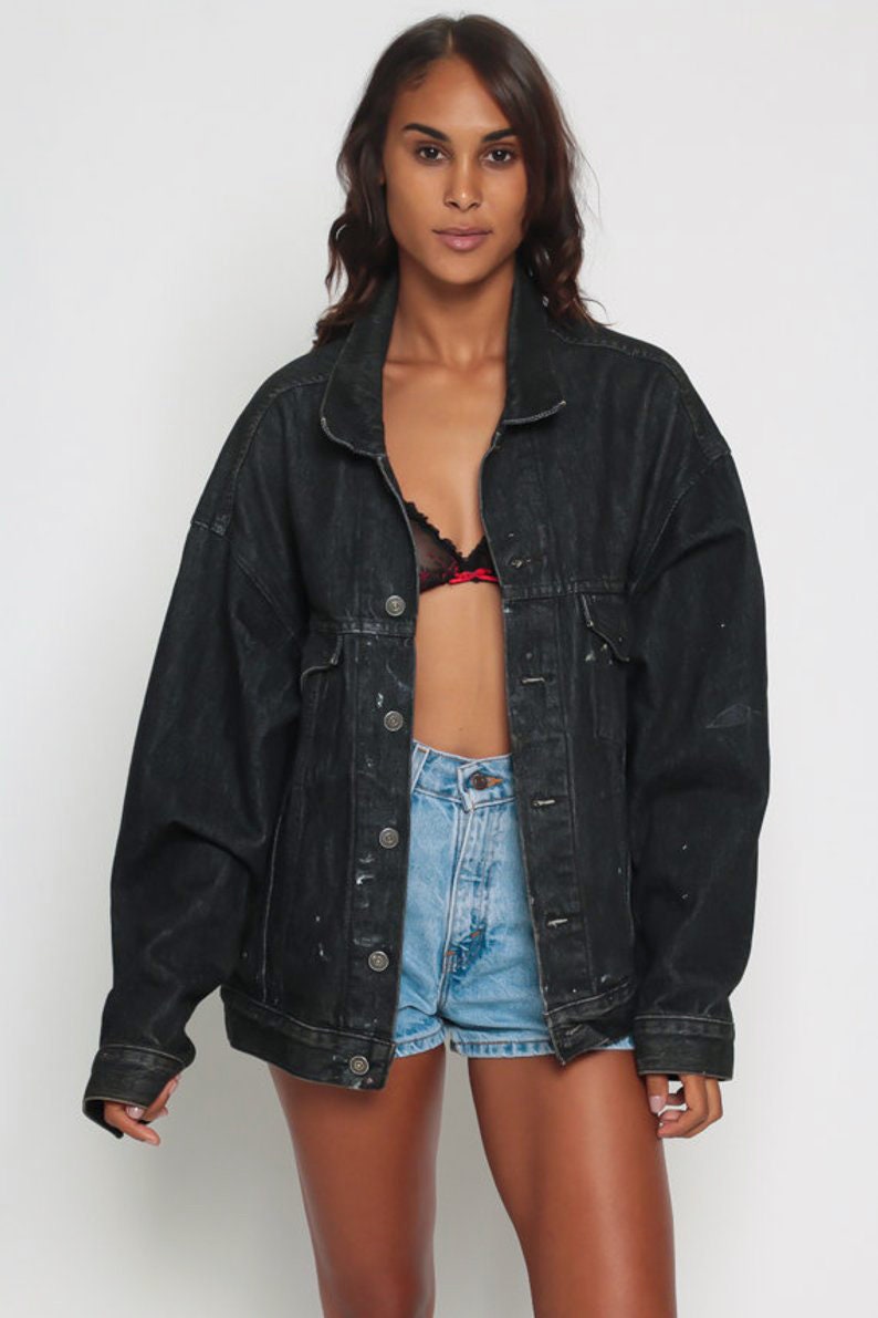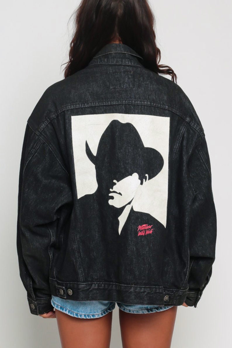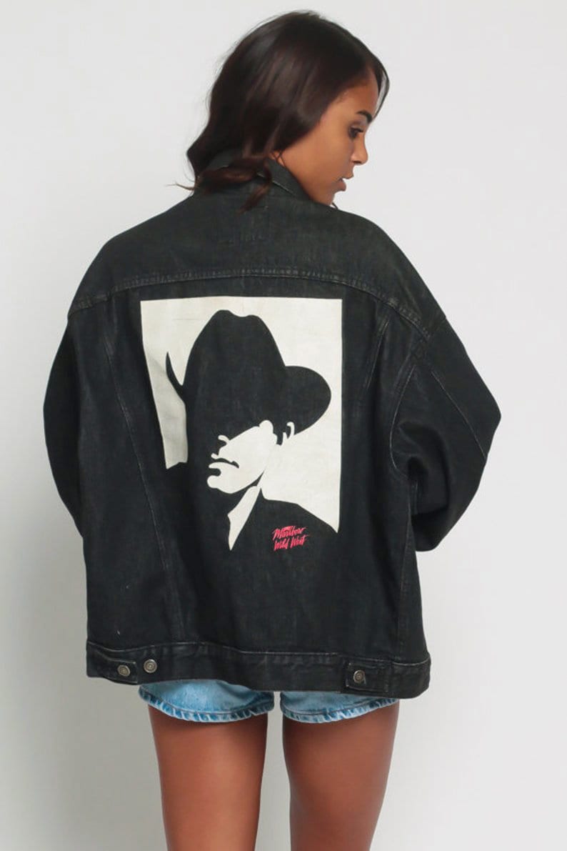 Vintage 80s jean jacket by Marlboro in black denim with the Marlboro man on the back. Oversized. Unisex.