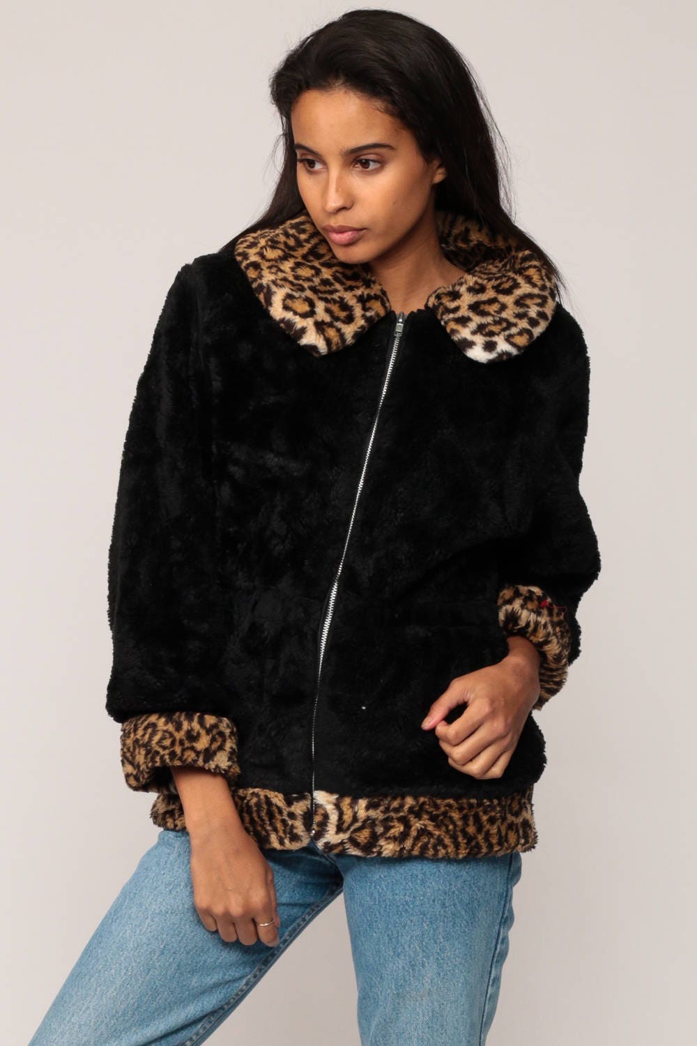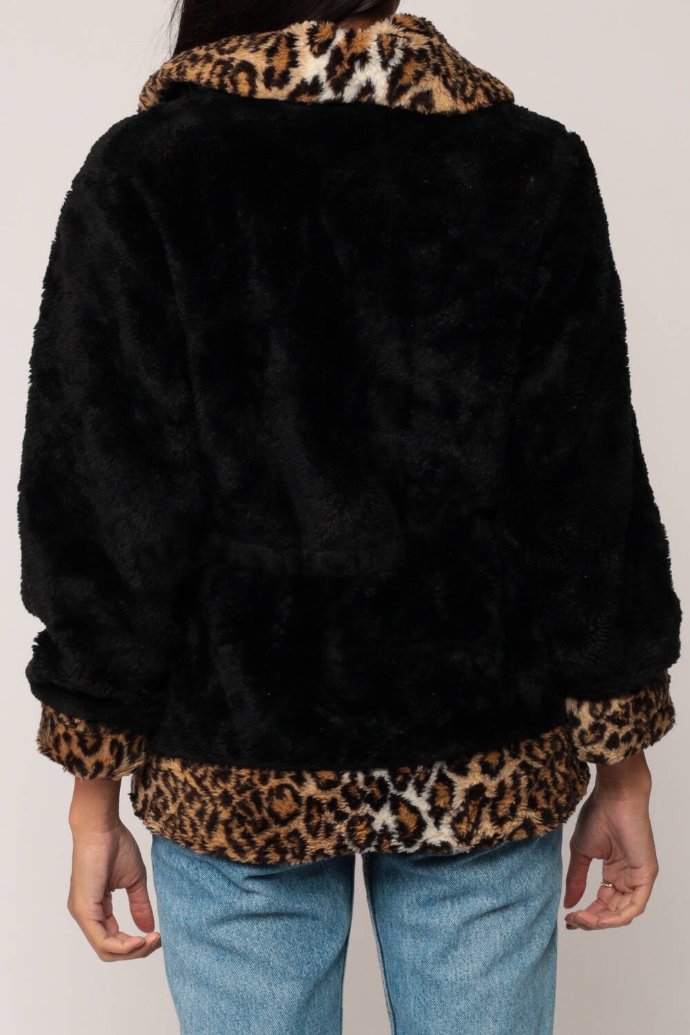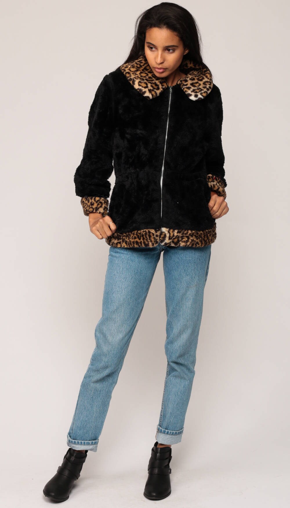 Vintage 90s coat in black faux fur with leopard print trim. Zips up.