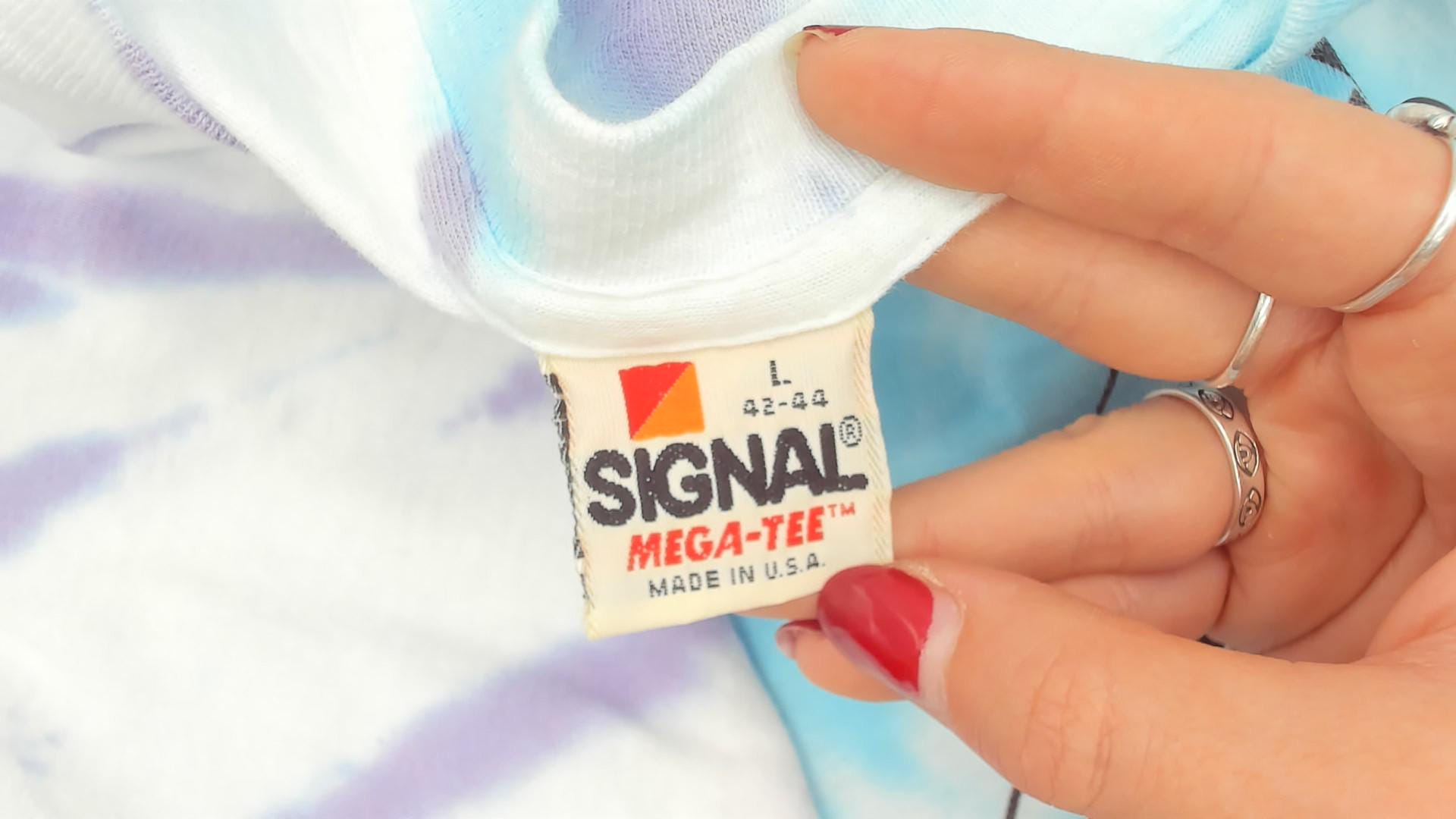 Vintage 80s Neil Young shirt in tie dye from his 1988 Sponsored by Nobody tour with The Bluenotes.