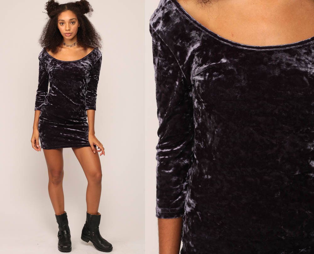 Vintage 90s dress in purple crushed velvet. Sleeveless with a tight bodycon fit and long sleeves. Mini length.