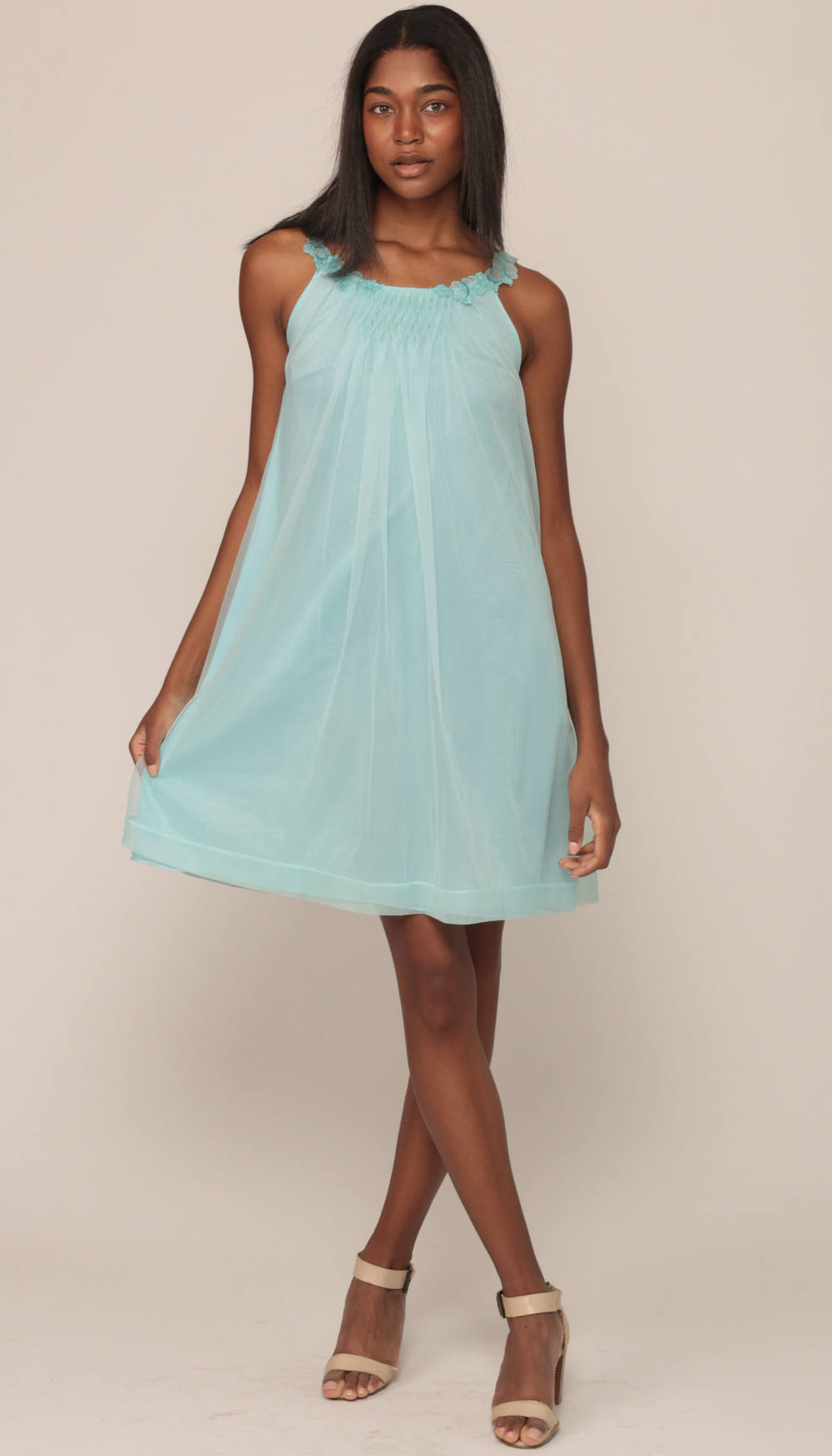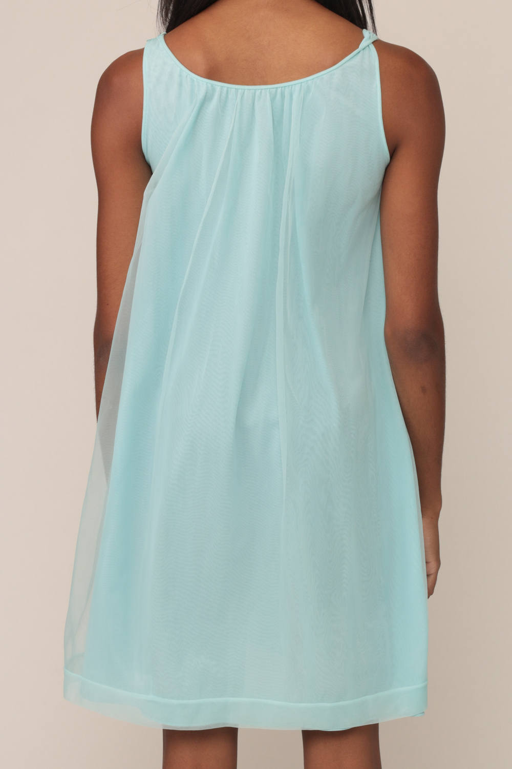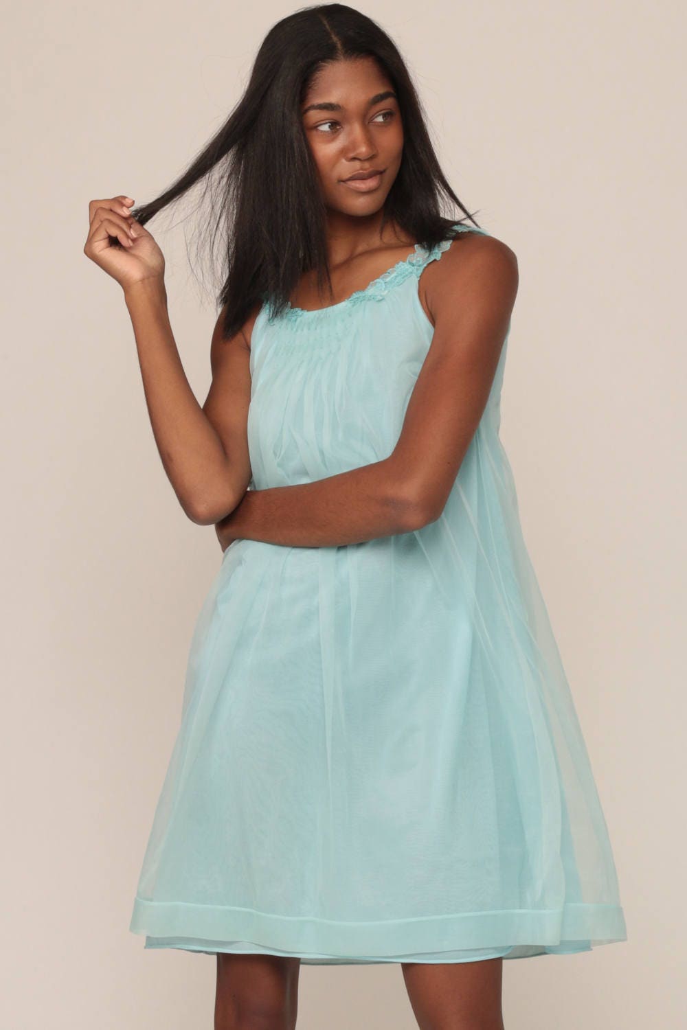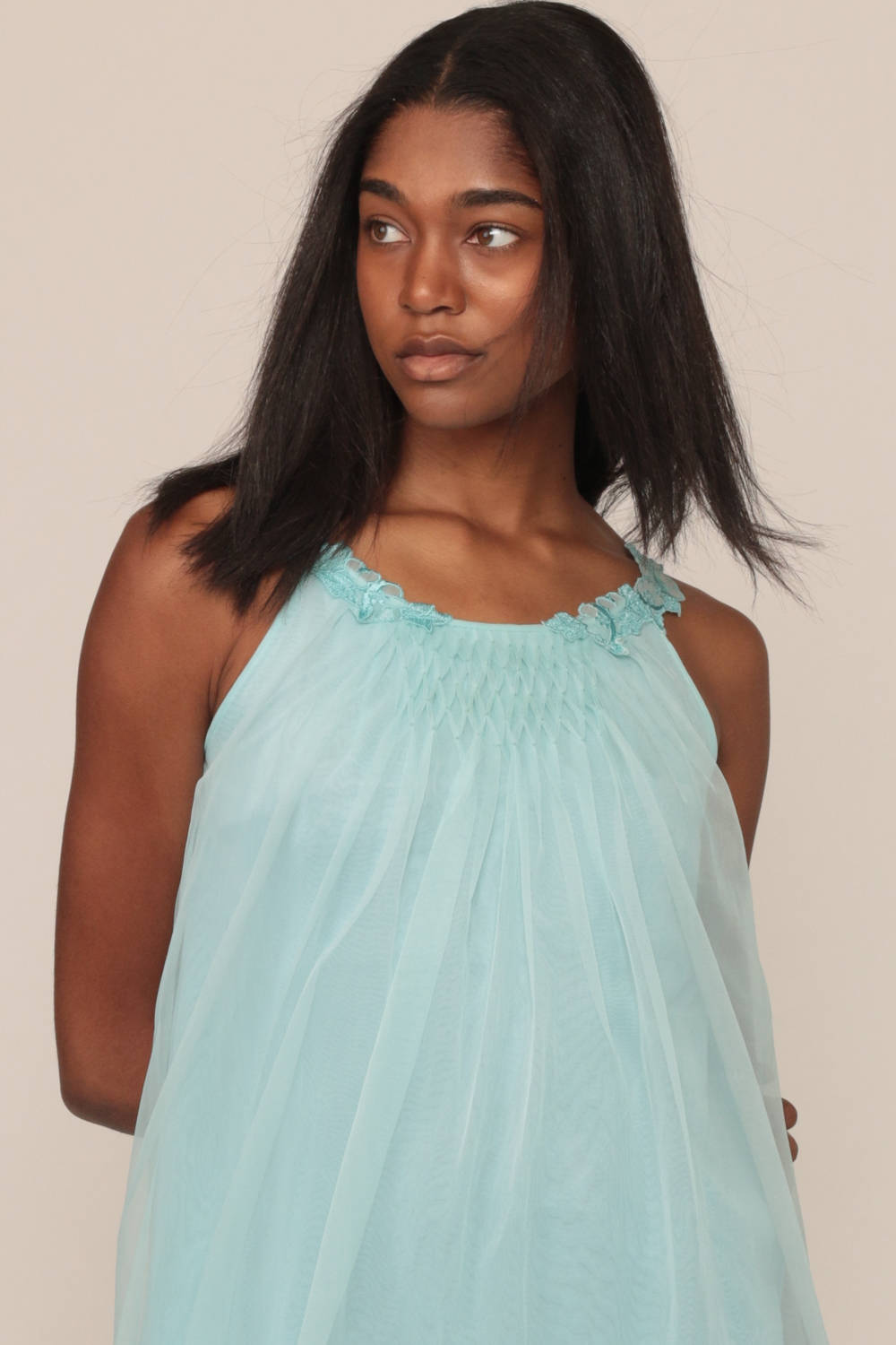 Vintage 60s 70s nightgown in layered baby blue with a babydoll cut, floral trim and pintucking on the chest. Mini length.