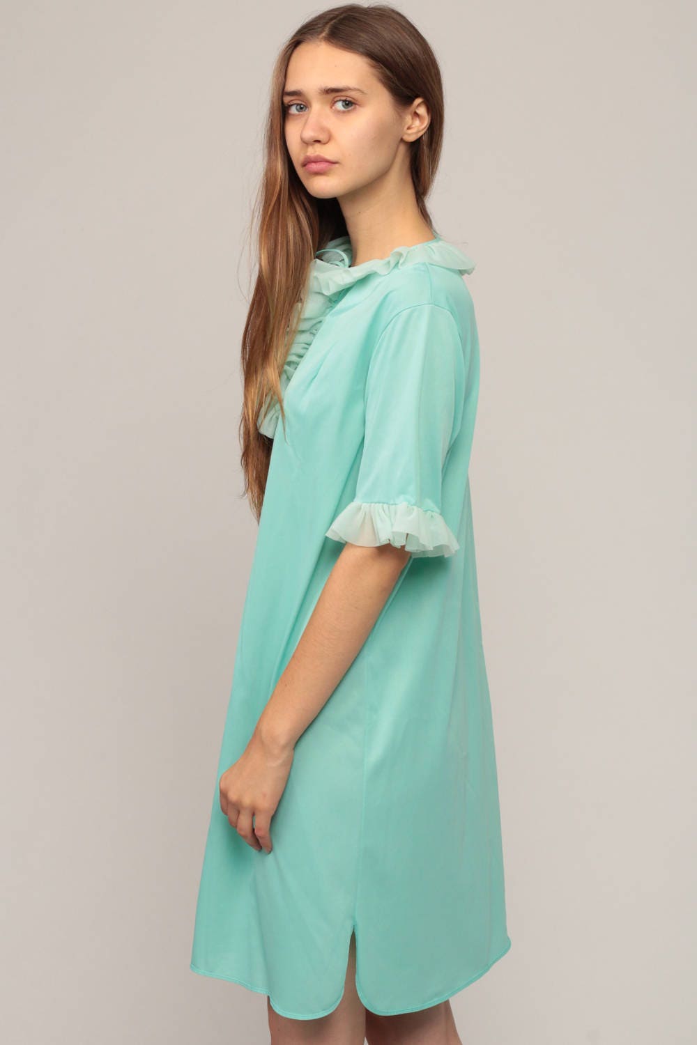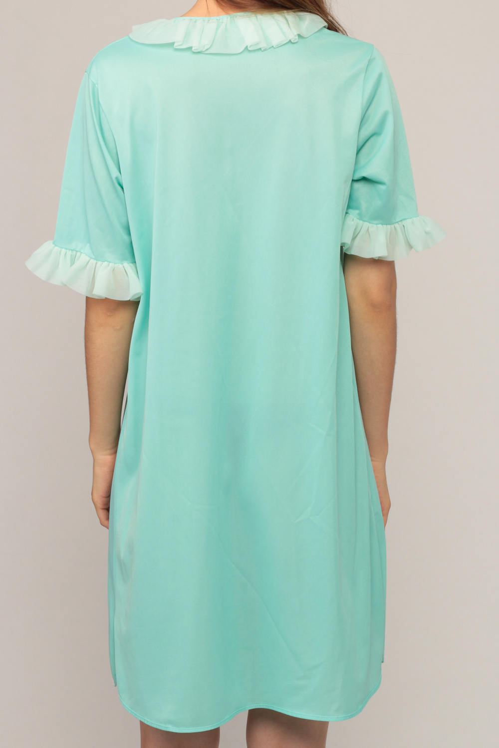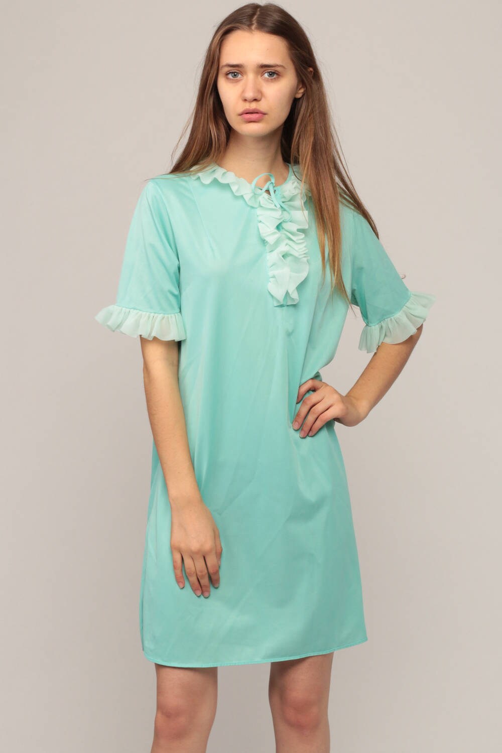 Vintage 60s 70s nightgown in seafoam blue with a babydoll cut and ruffle trim. Mini length.
