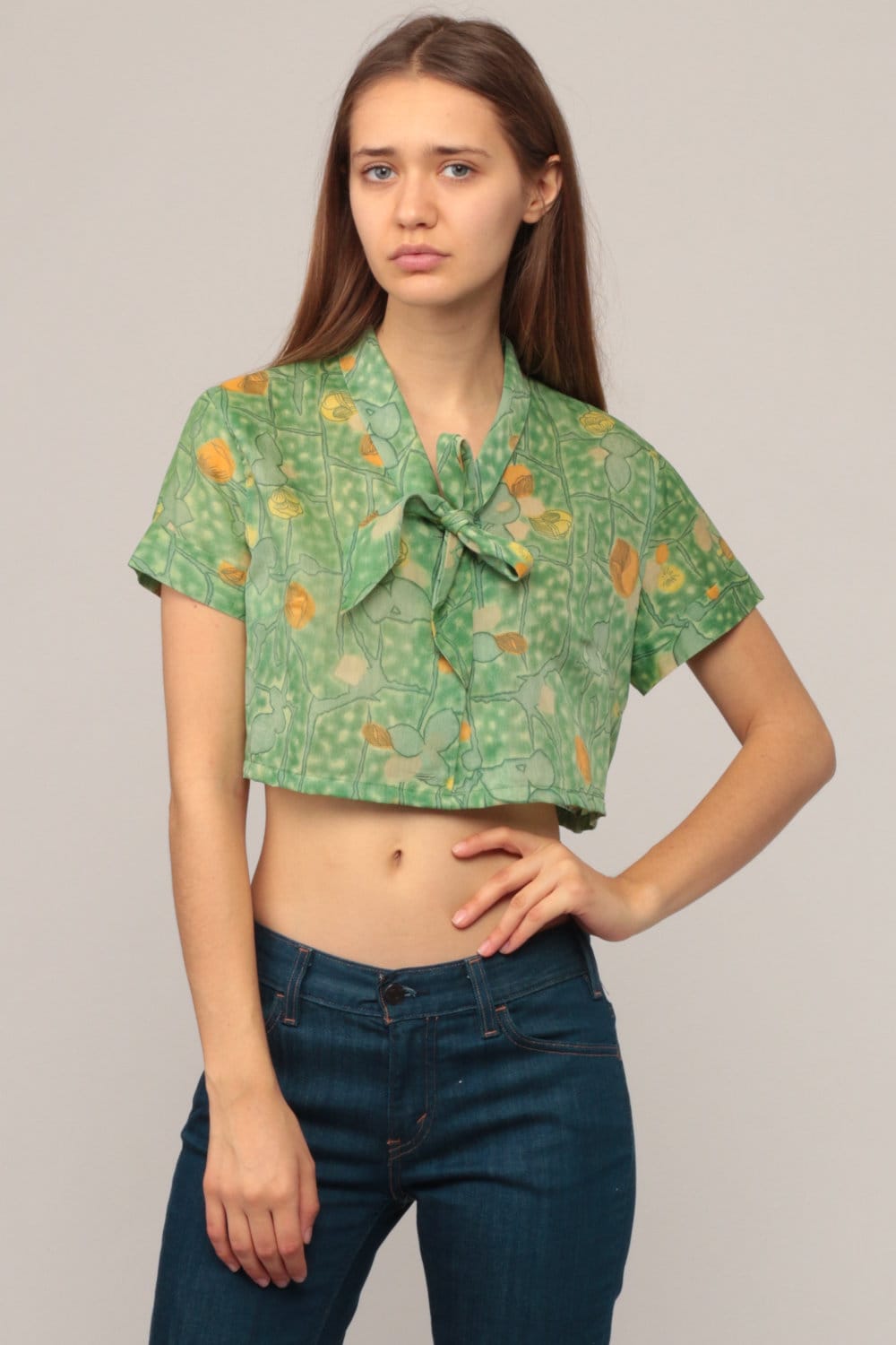 Vintage 70s shirt in a floral print with an ascot at the neck. Short sleeves, cropped hem.
