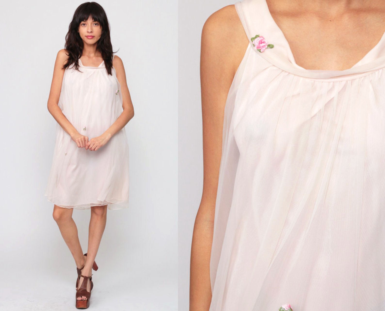 Vintage 70s nightgown and matching robe in beige nylon with a babydoll cut and floral appliques. Mini length.