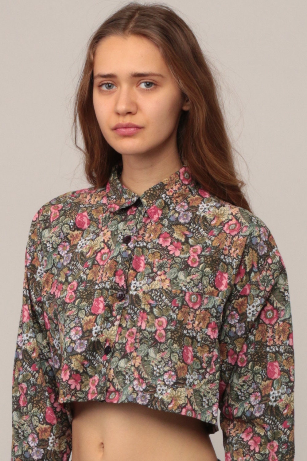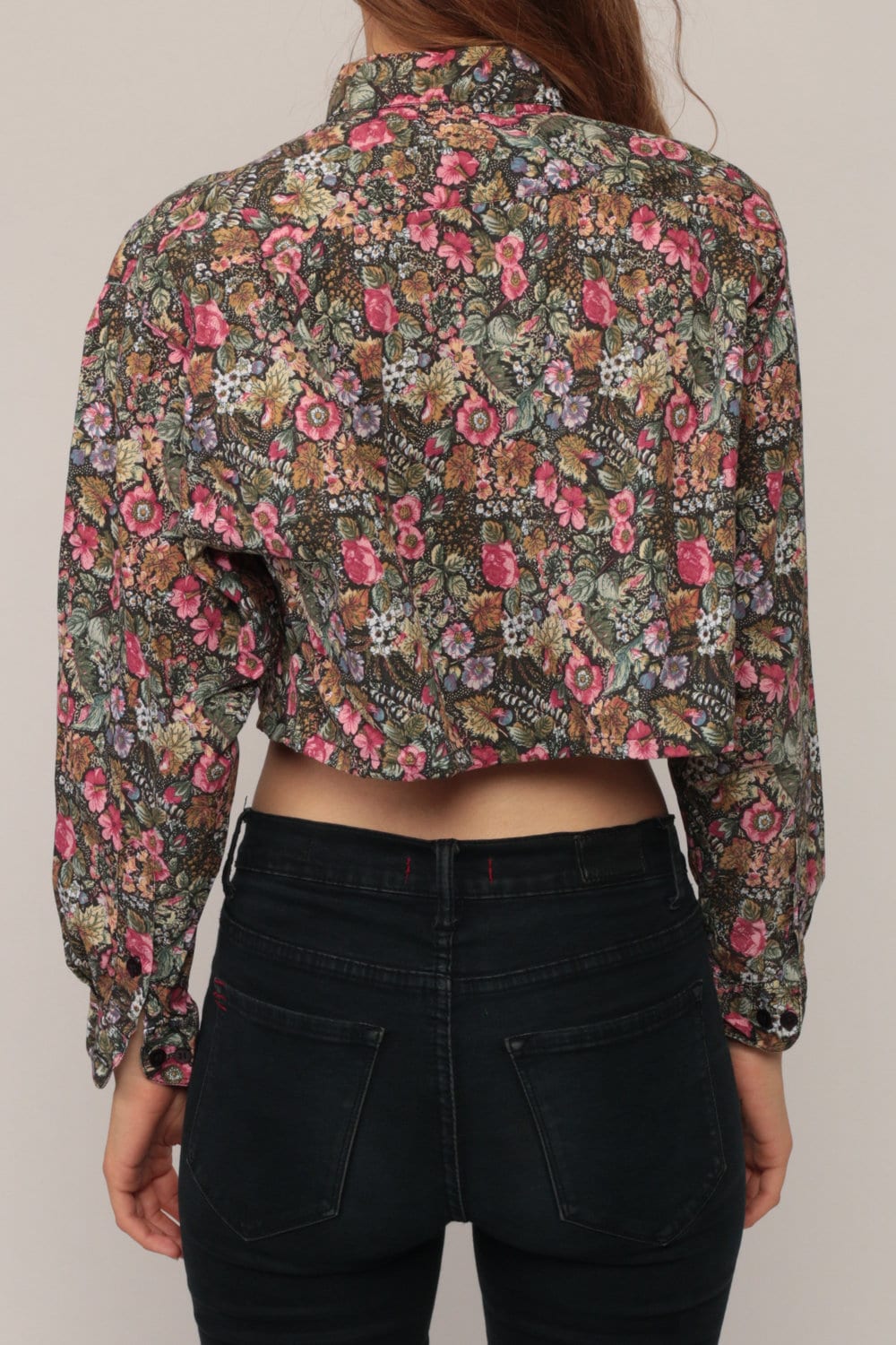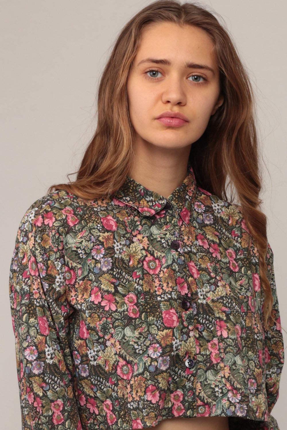 Vintage 80s 90s shirt with a floral print. Cropped fit with buttons up the front and long sleeves.
