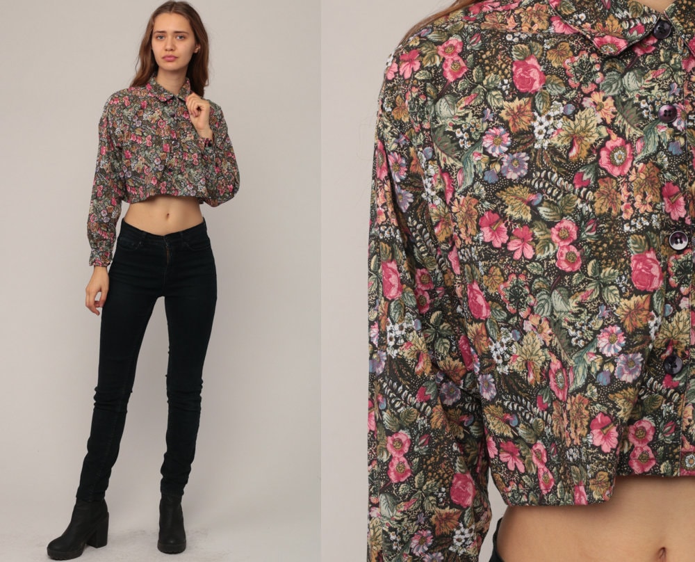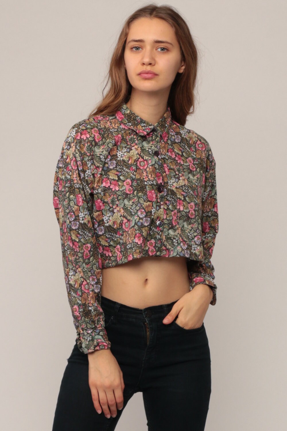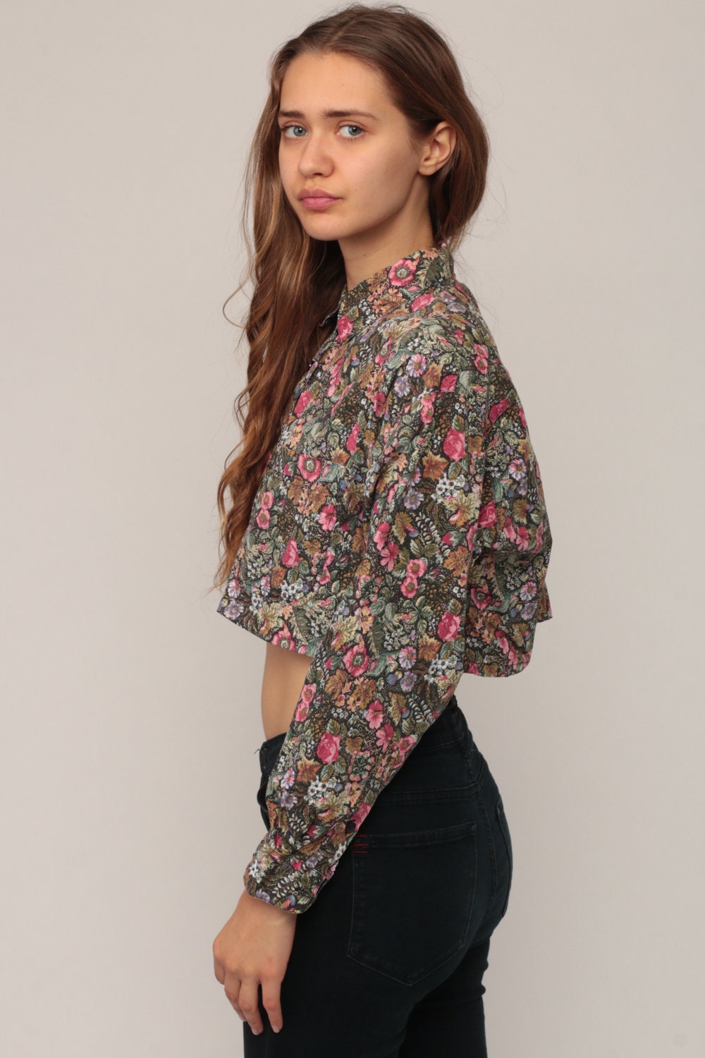 Vintage 80s 90s shirt with a floral print. Cropped fit with buttons up the front and long sleeves.