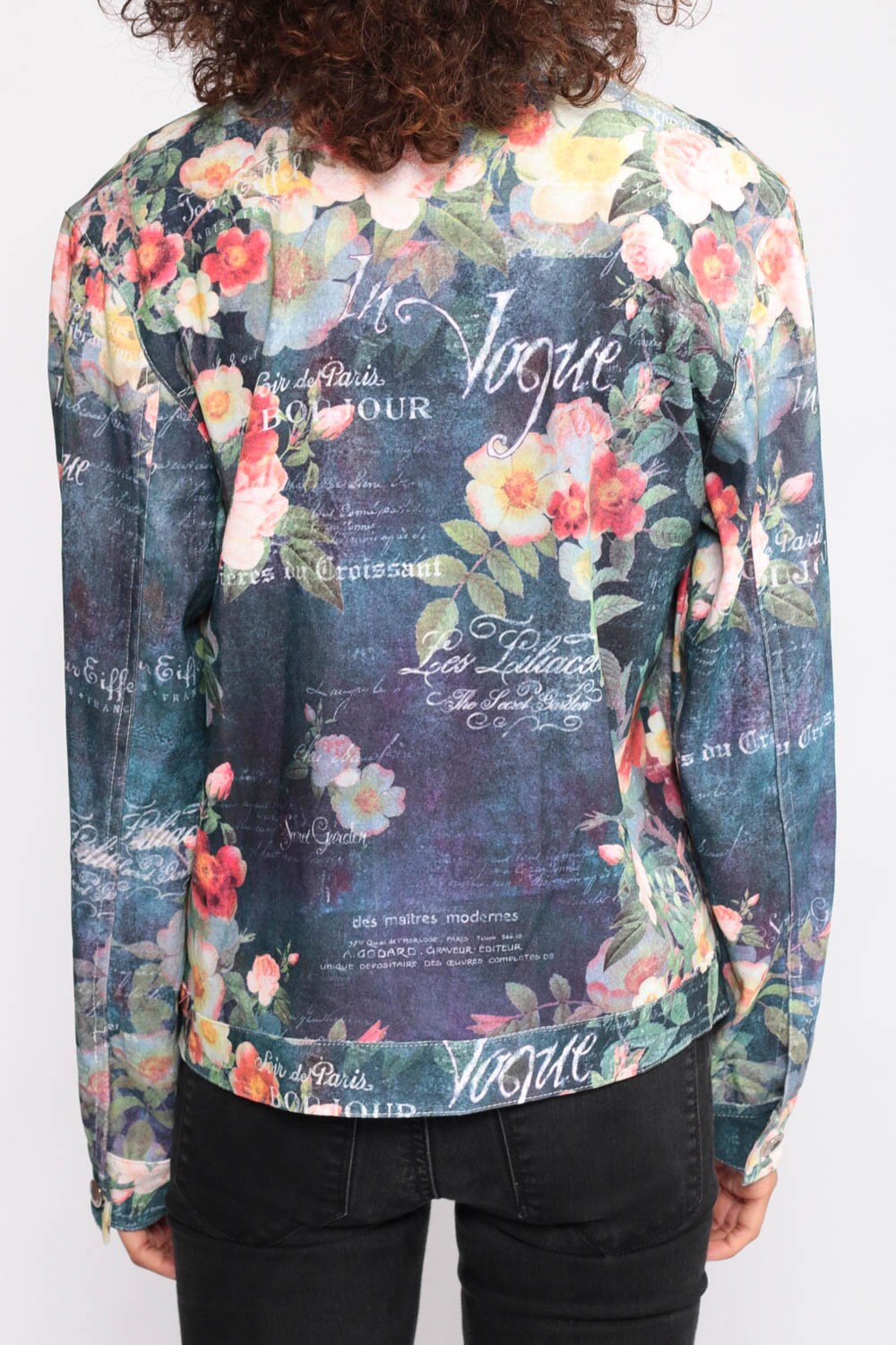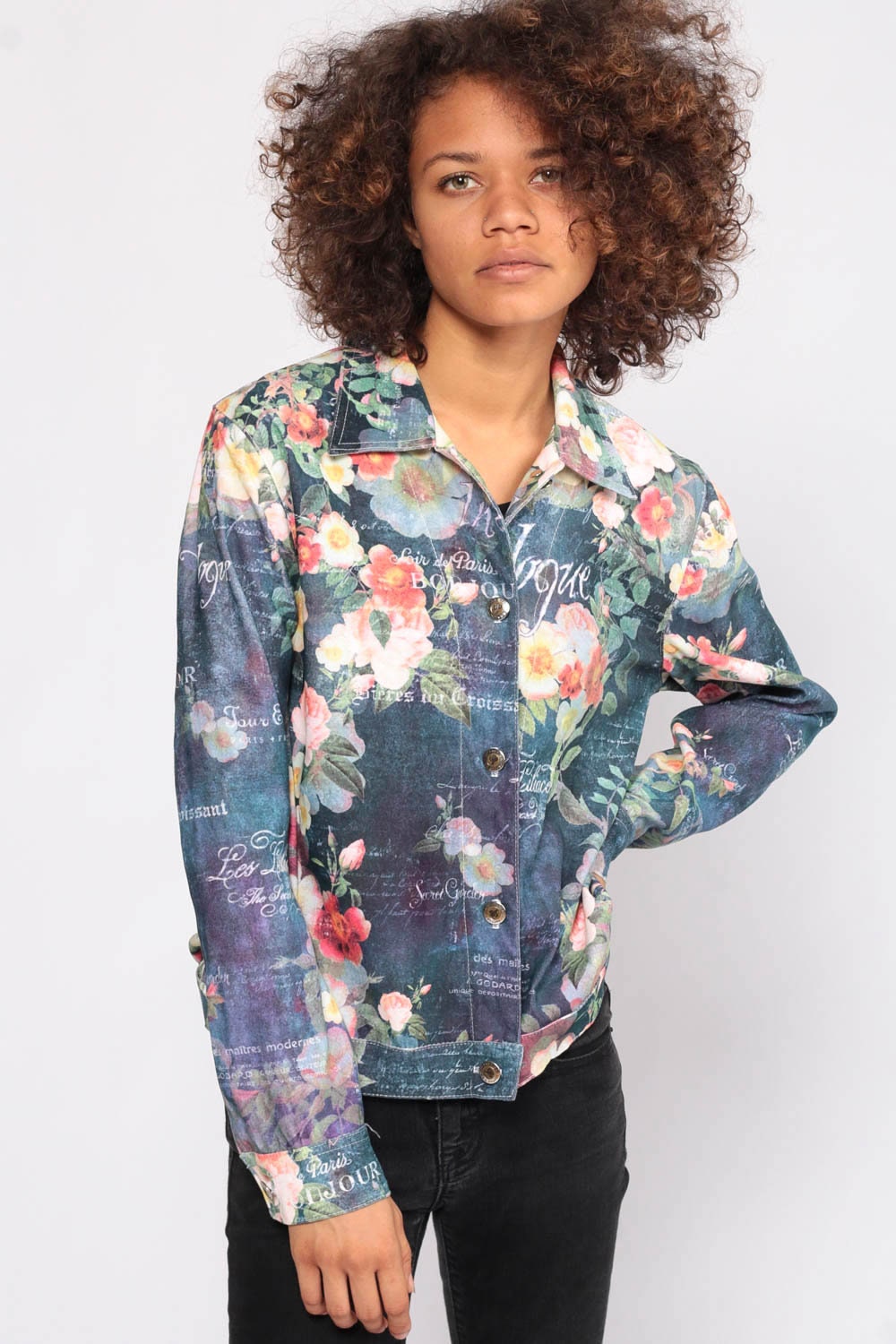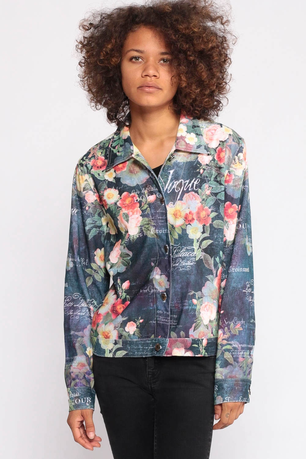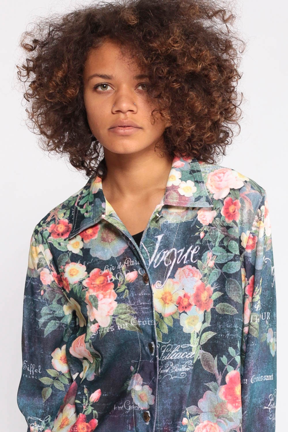 Vintage 90s shirt or light jacket in a floral print that says 'Vogue'. Long sleeves, buttons up the front.
