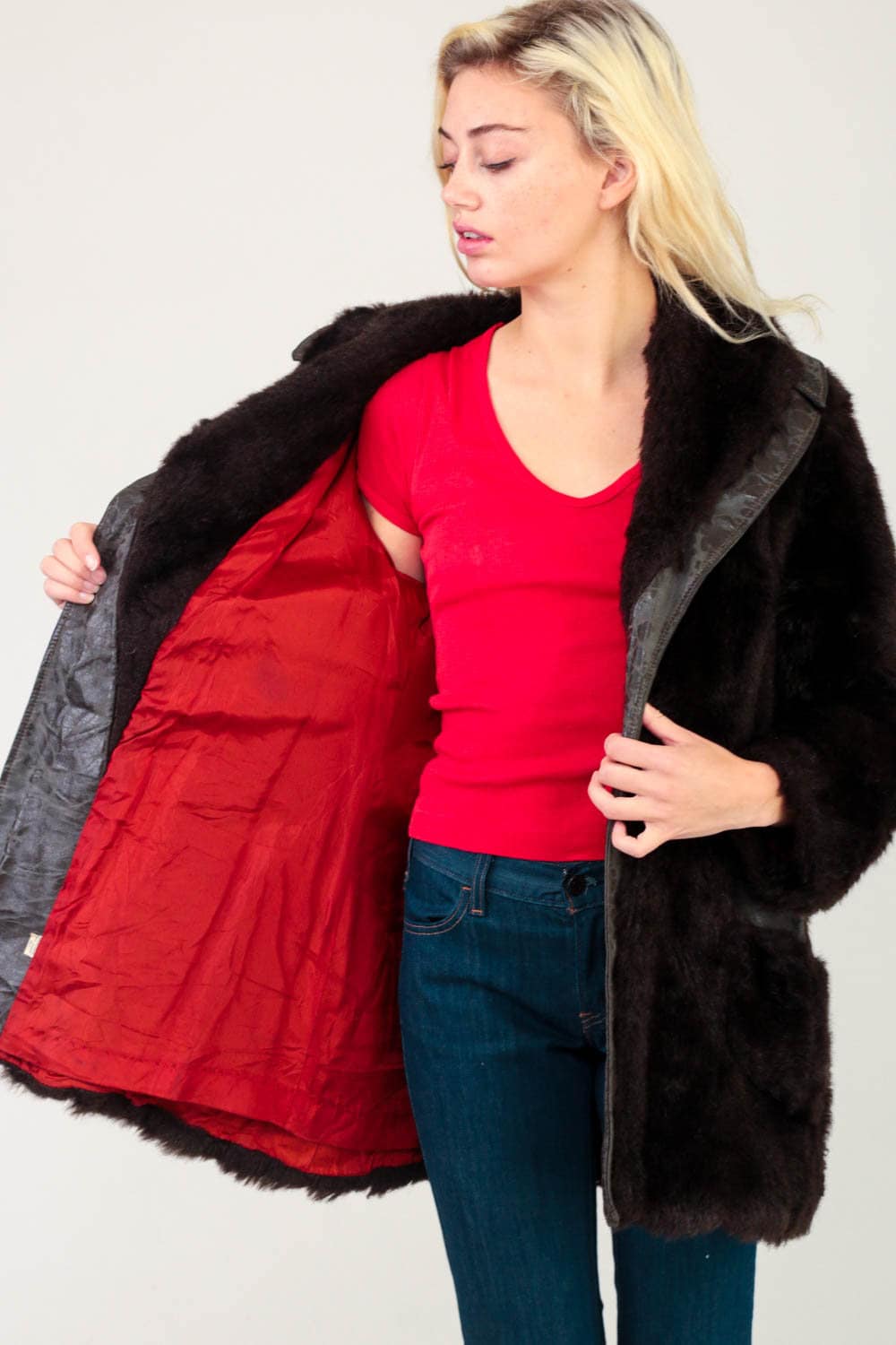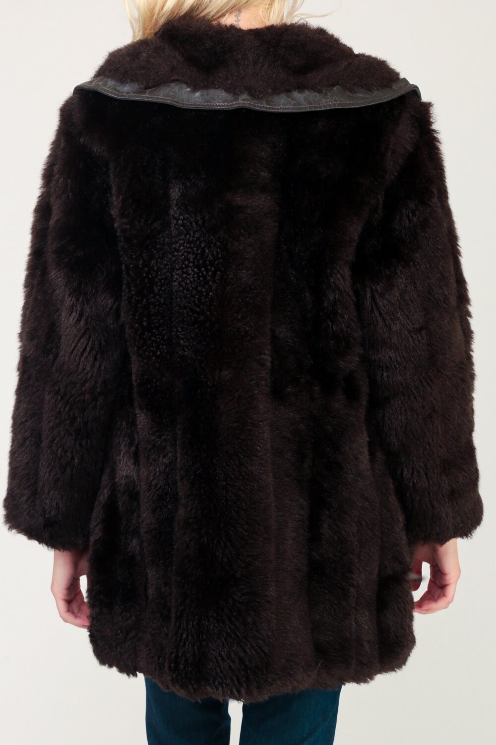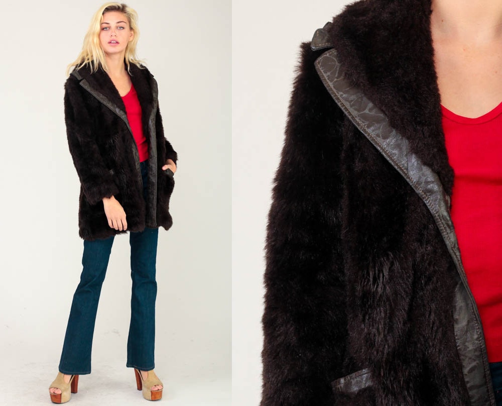 Vintage 70s jacket in brown faux fur with leather trim. Distressed.