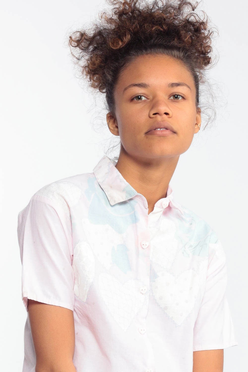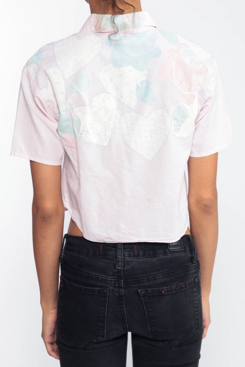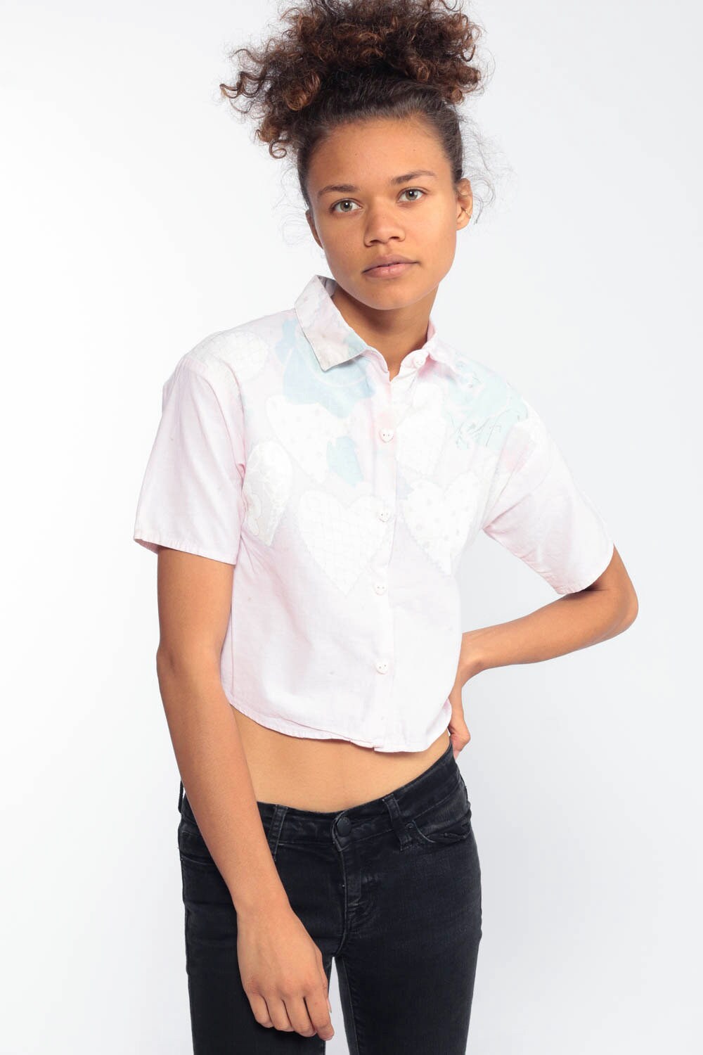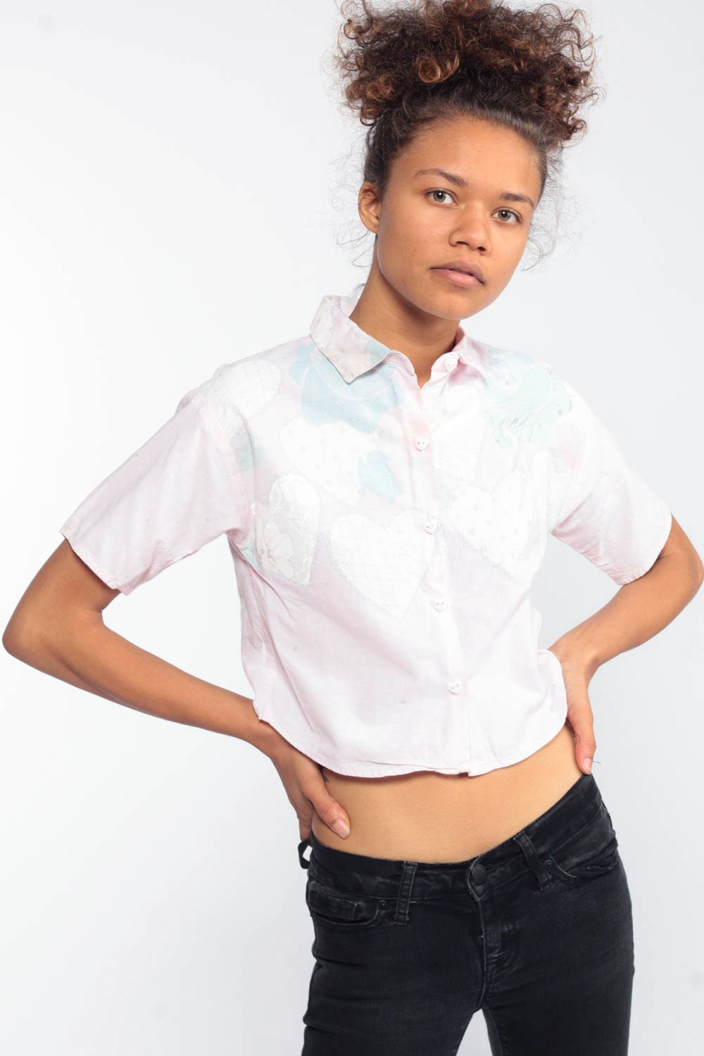 Vintage 80s blouse with a heart and floral print. Has heart buttons up the neck. Originally for youth.