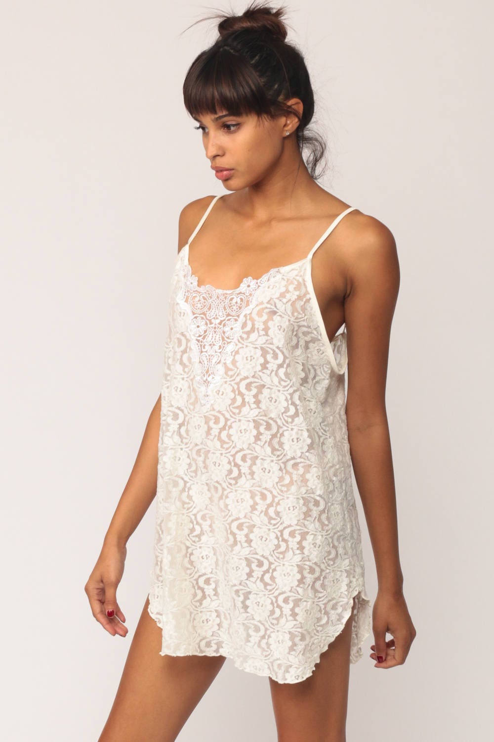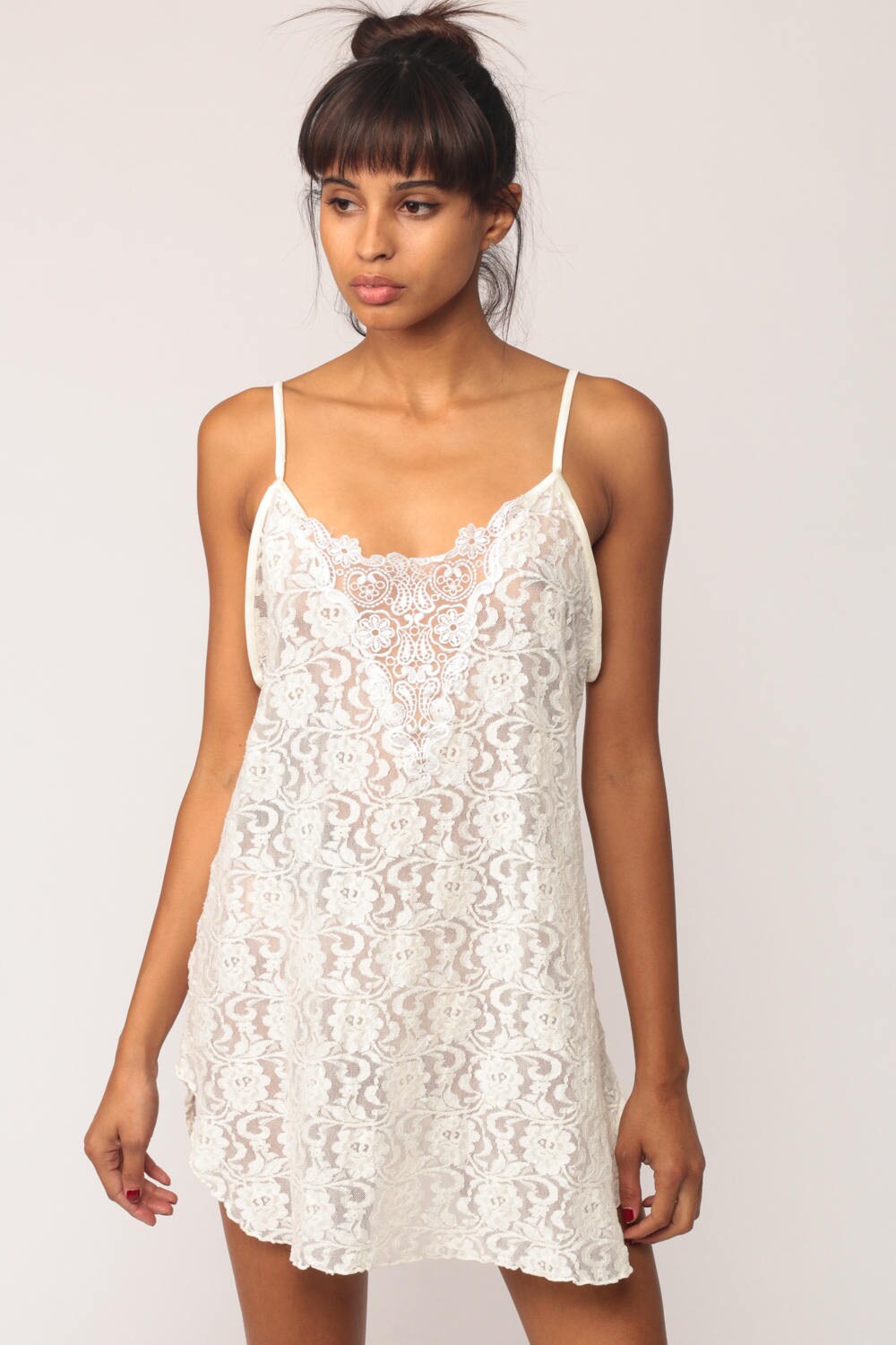 Vintage 90s slip dress in sheer white lace with a loose fit and spaghetti straps. Micro mini length.