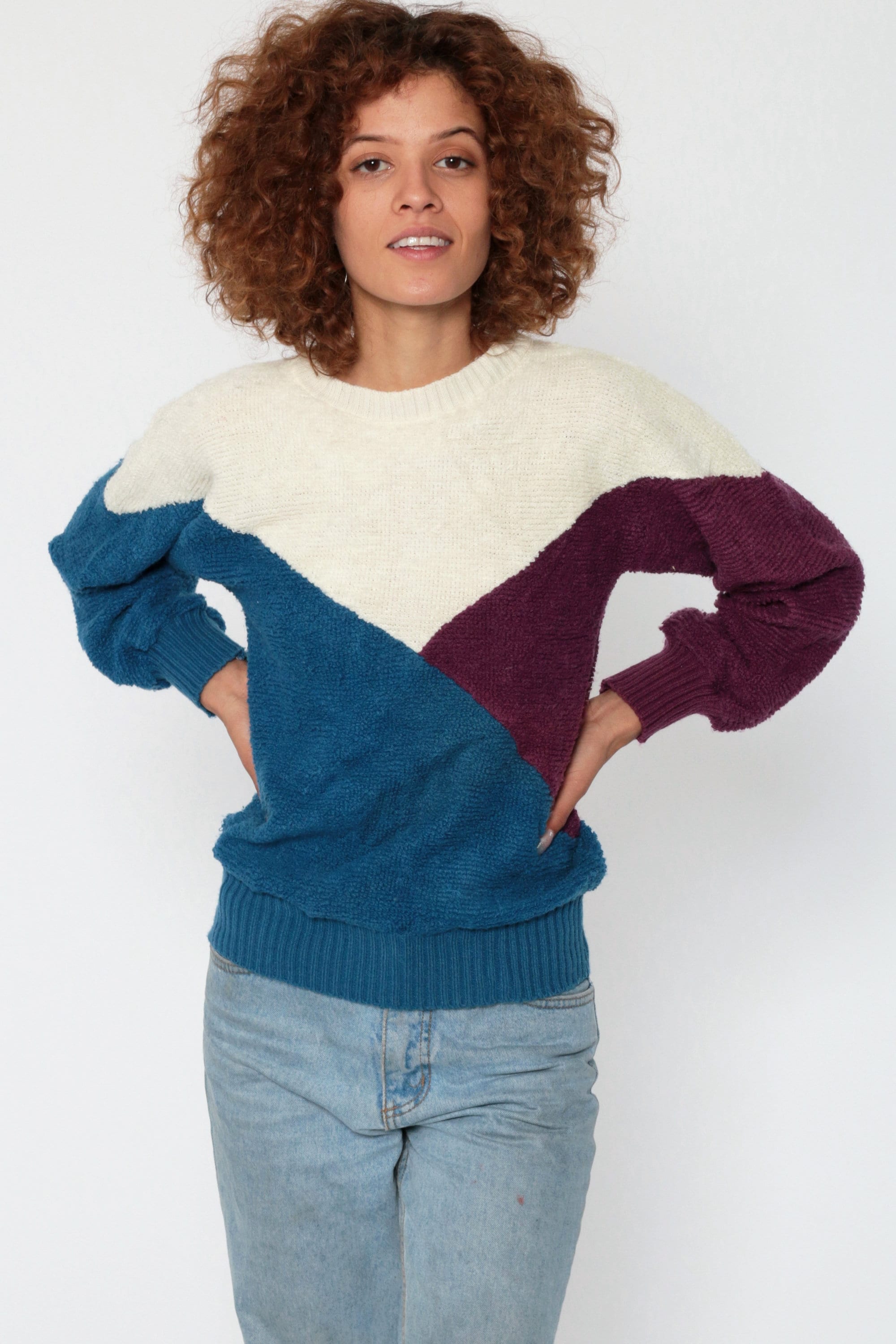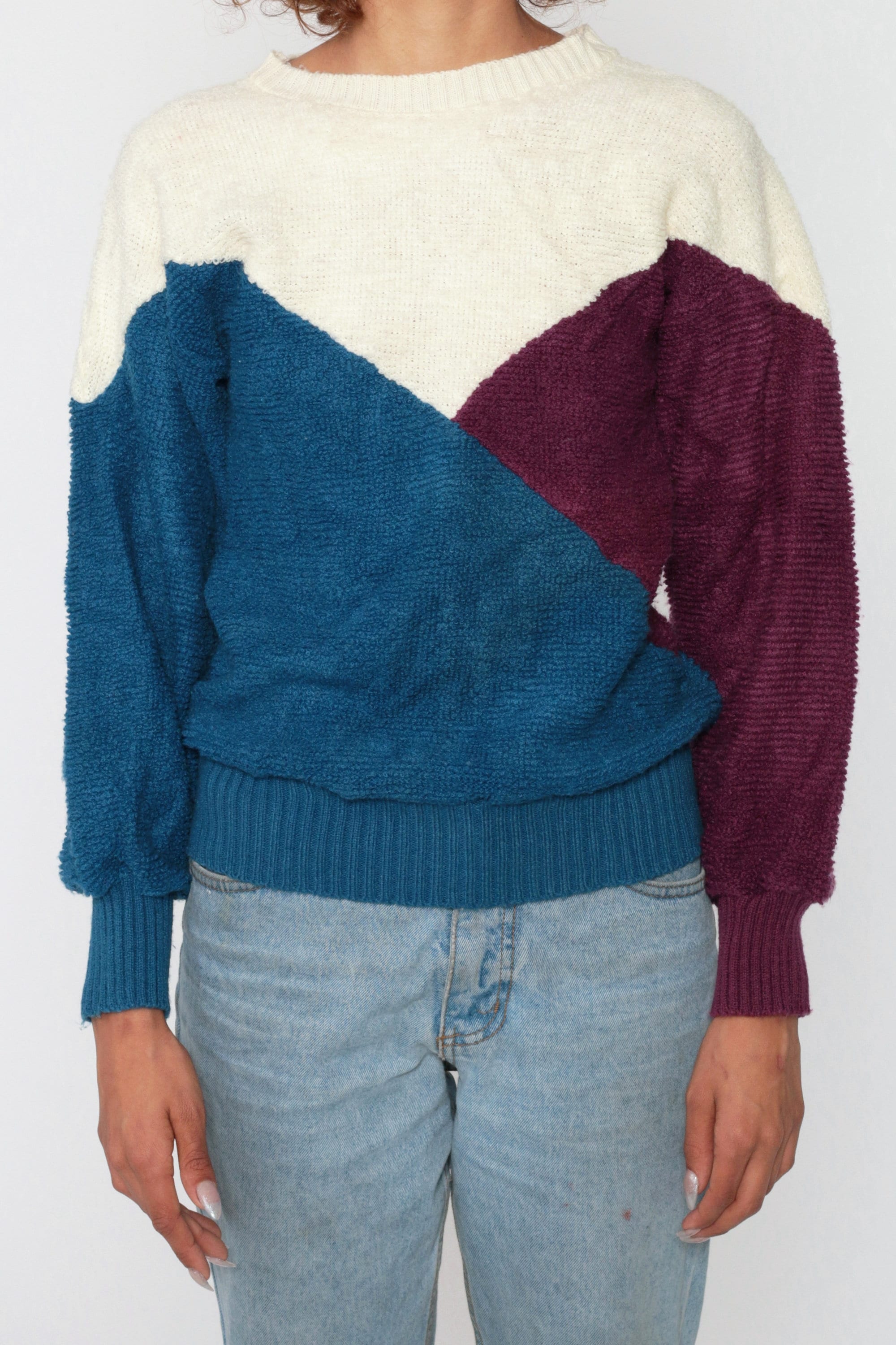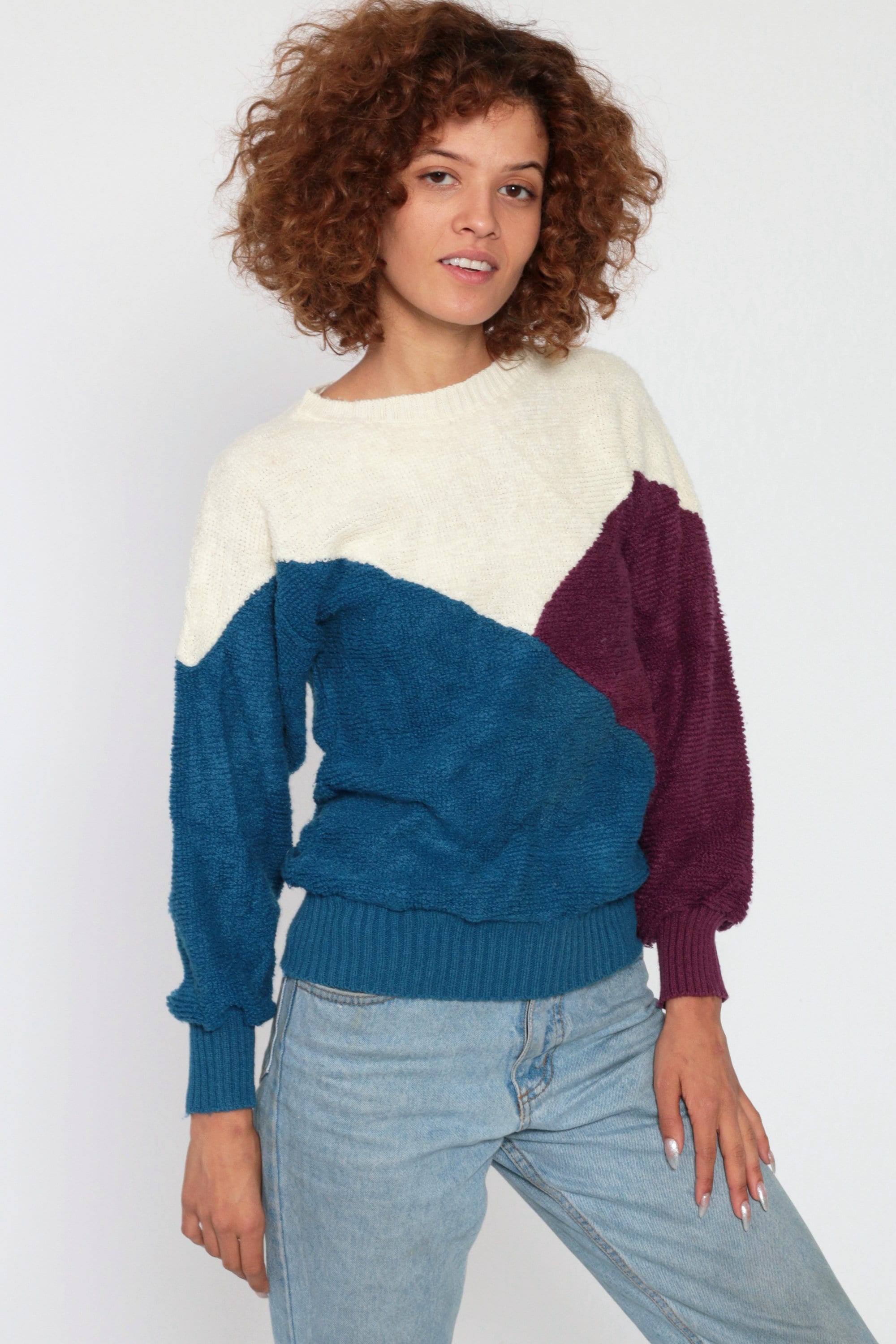 Vintage 80s sweater in ivory, purple and blue colour blocking.