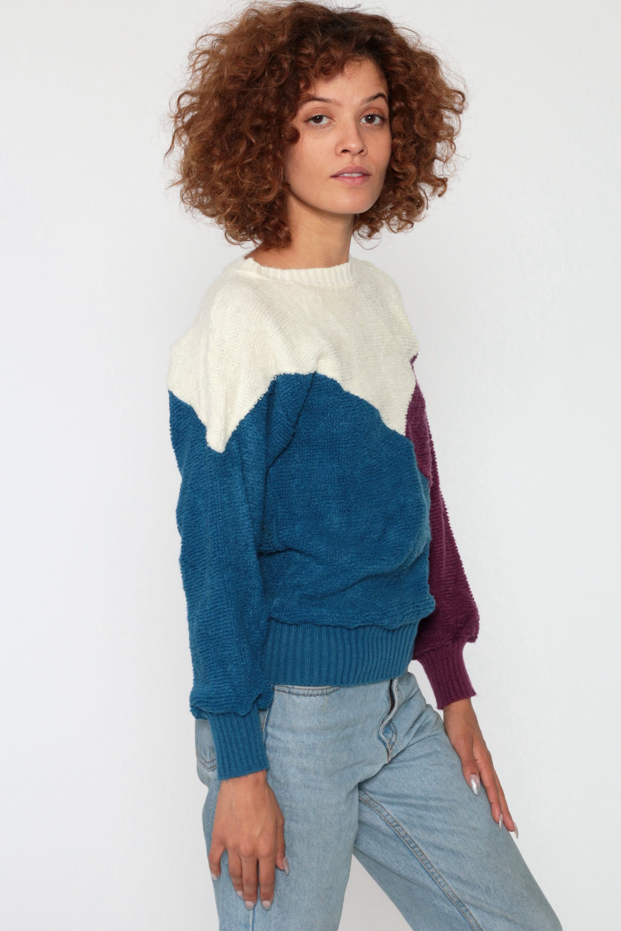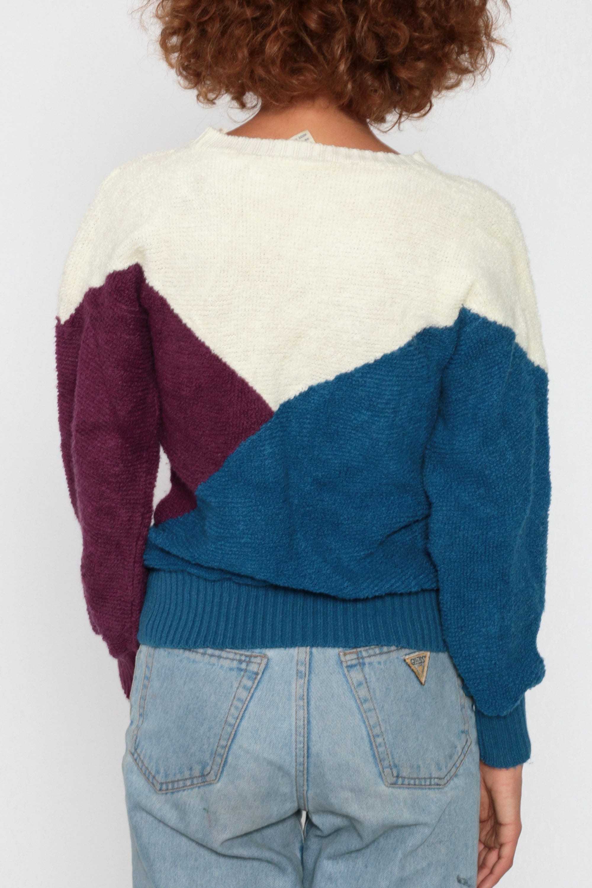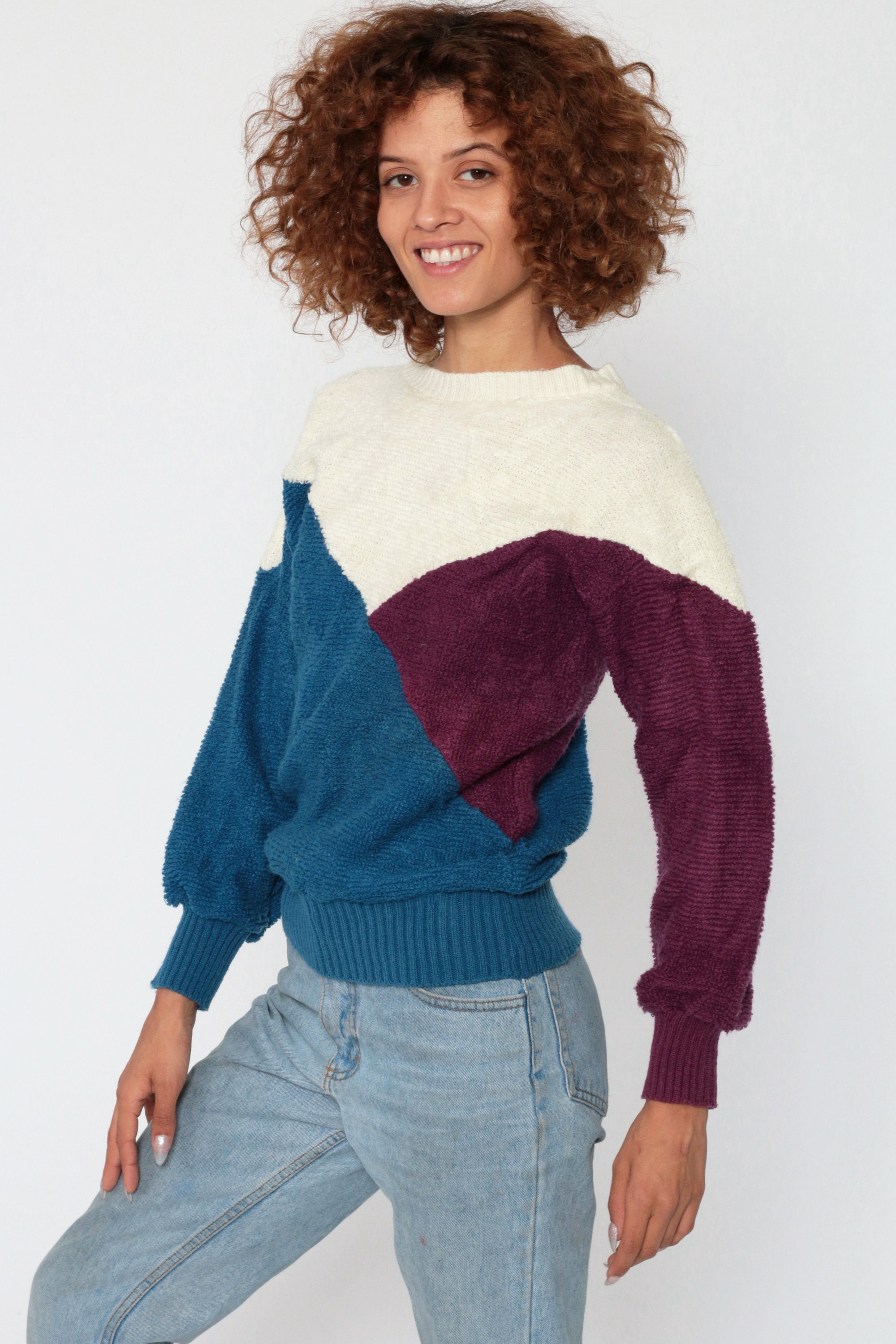 Vintage 80s sweater in ivory, purple and blue colour blocking.