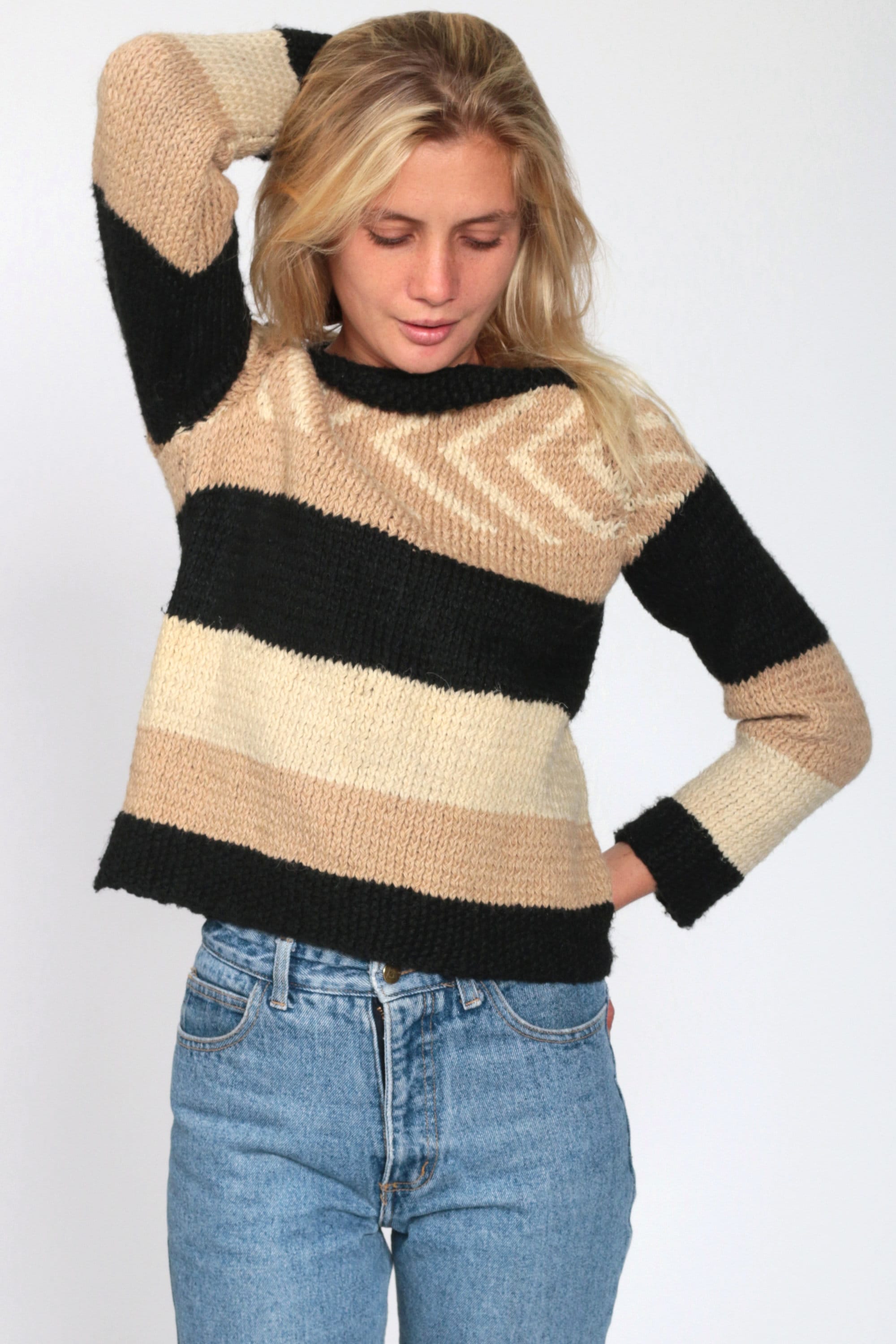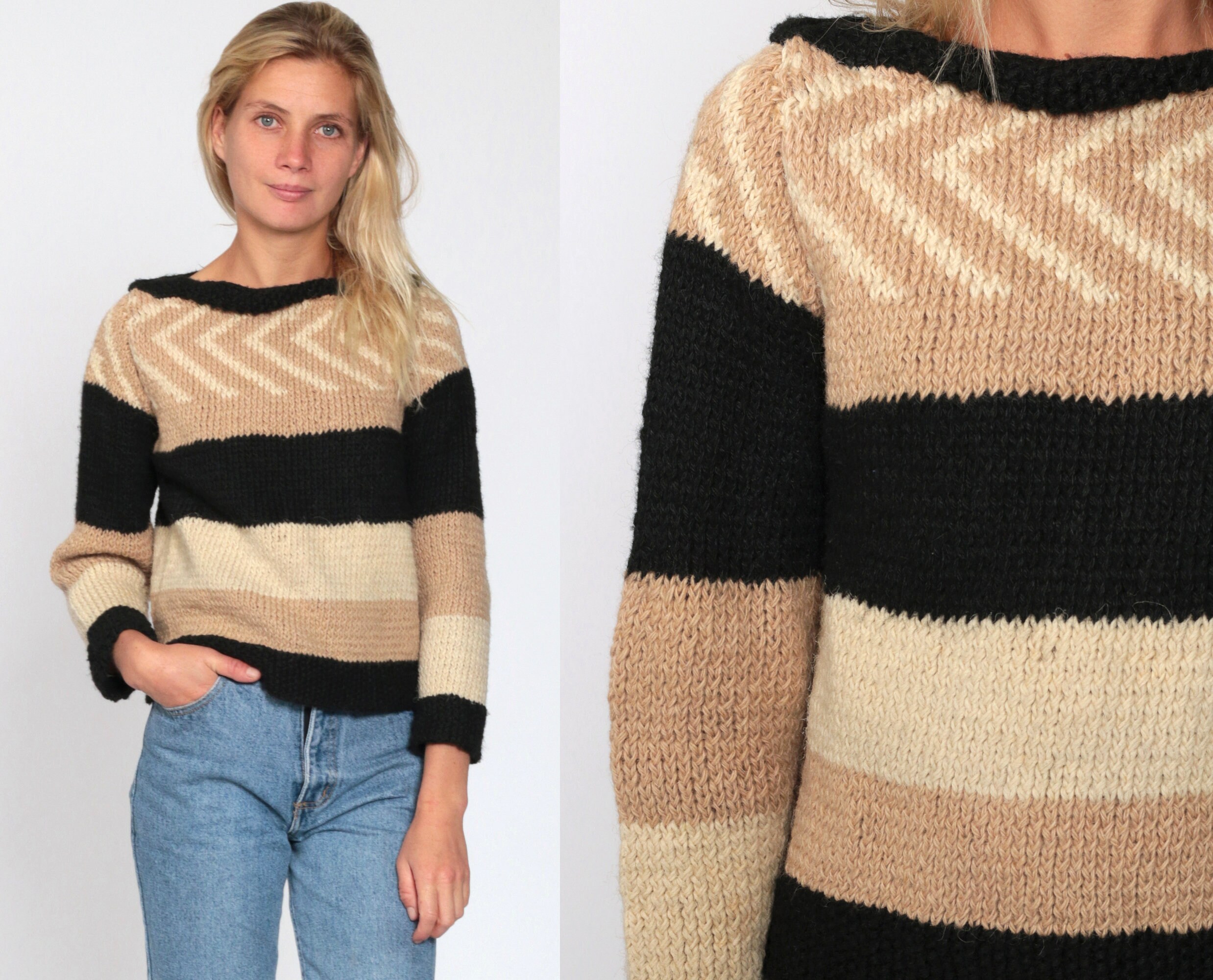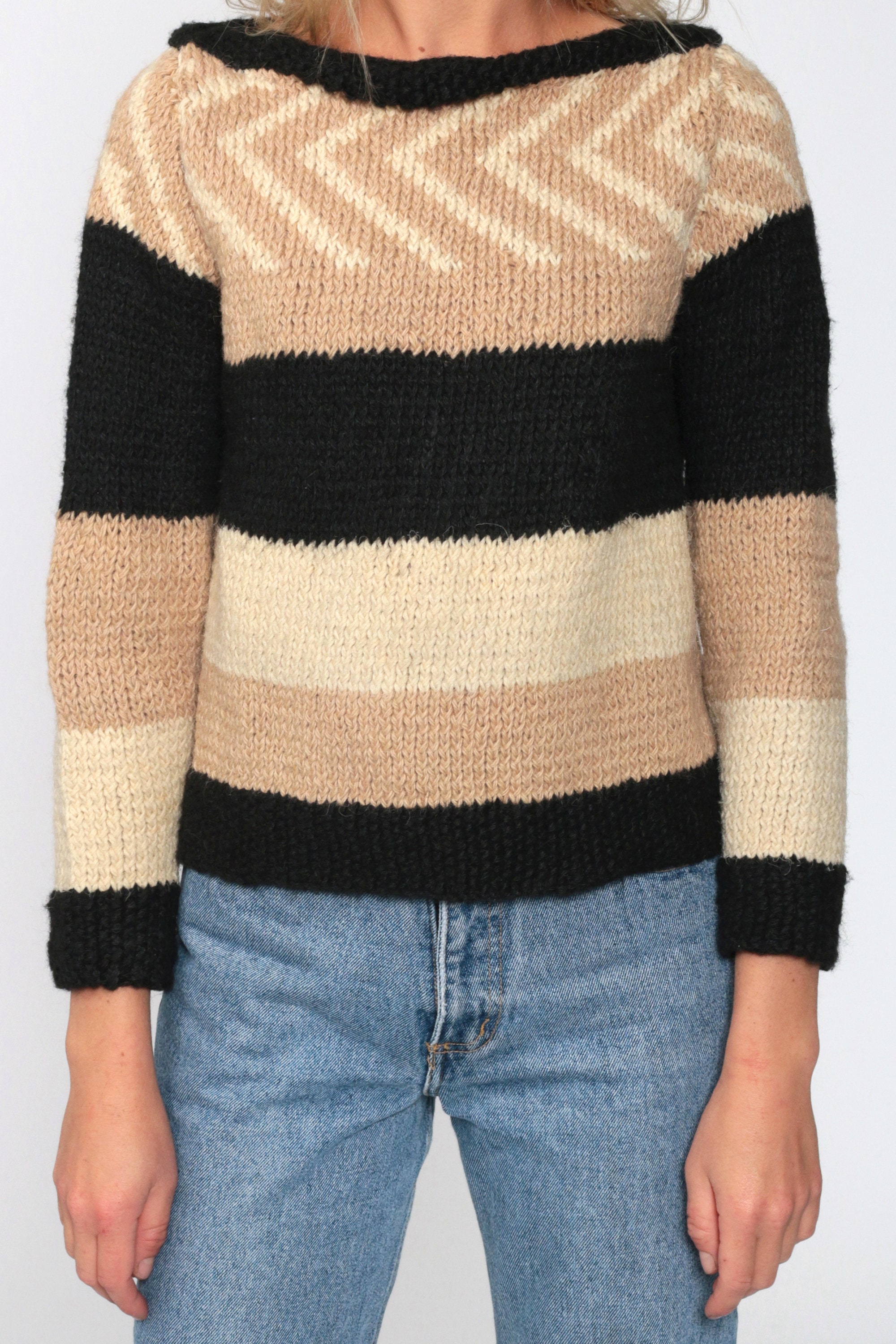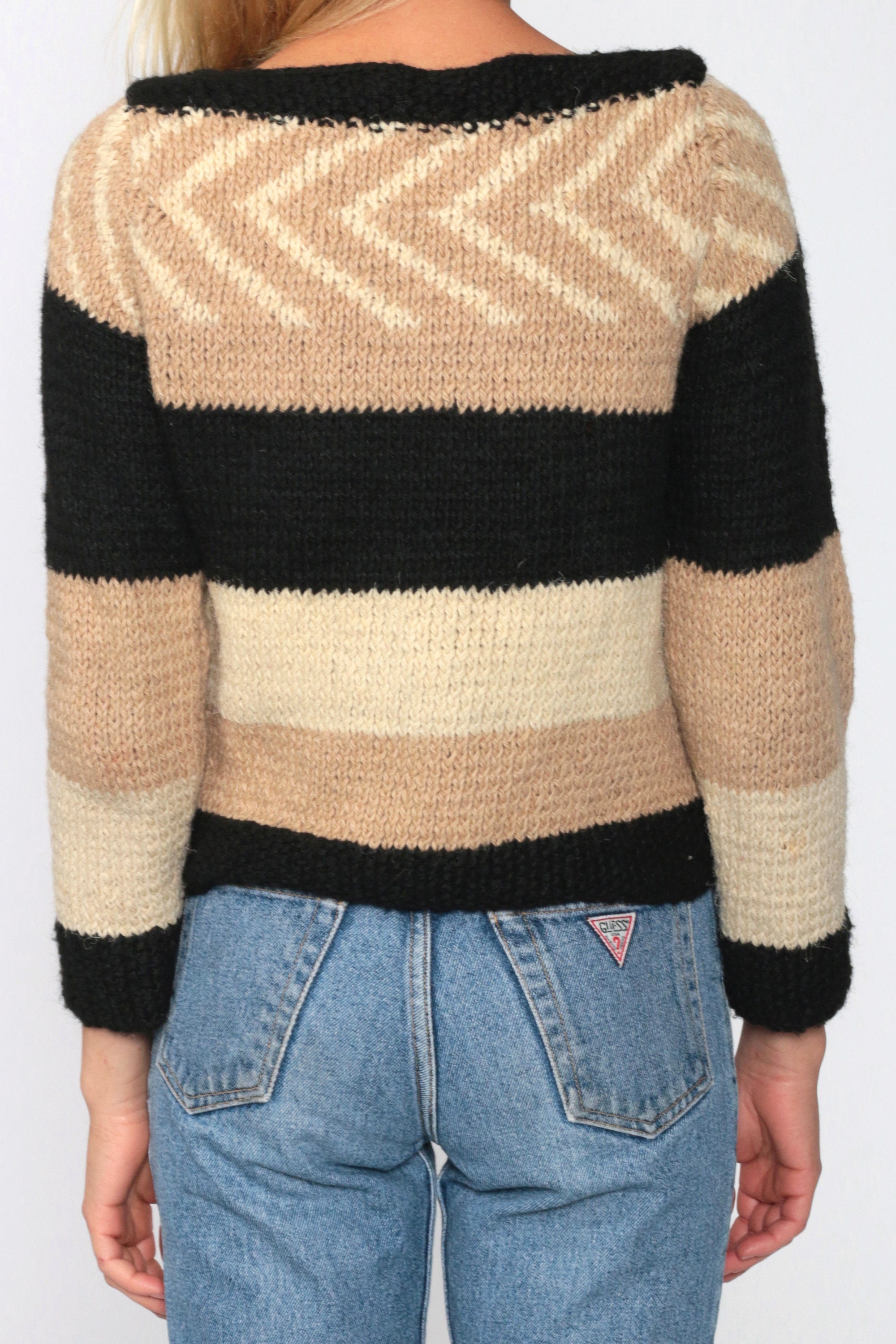 Vintage 70s 80s sweater in a wool knit with stripes and a boat neck. Short fit.